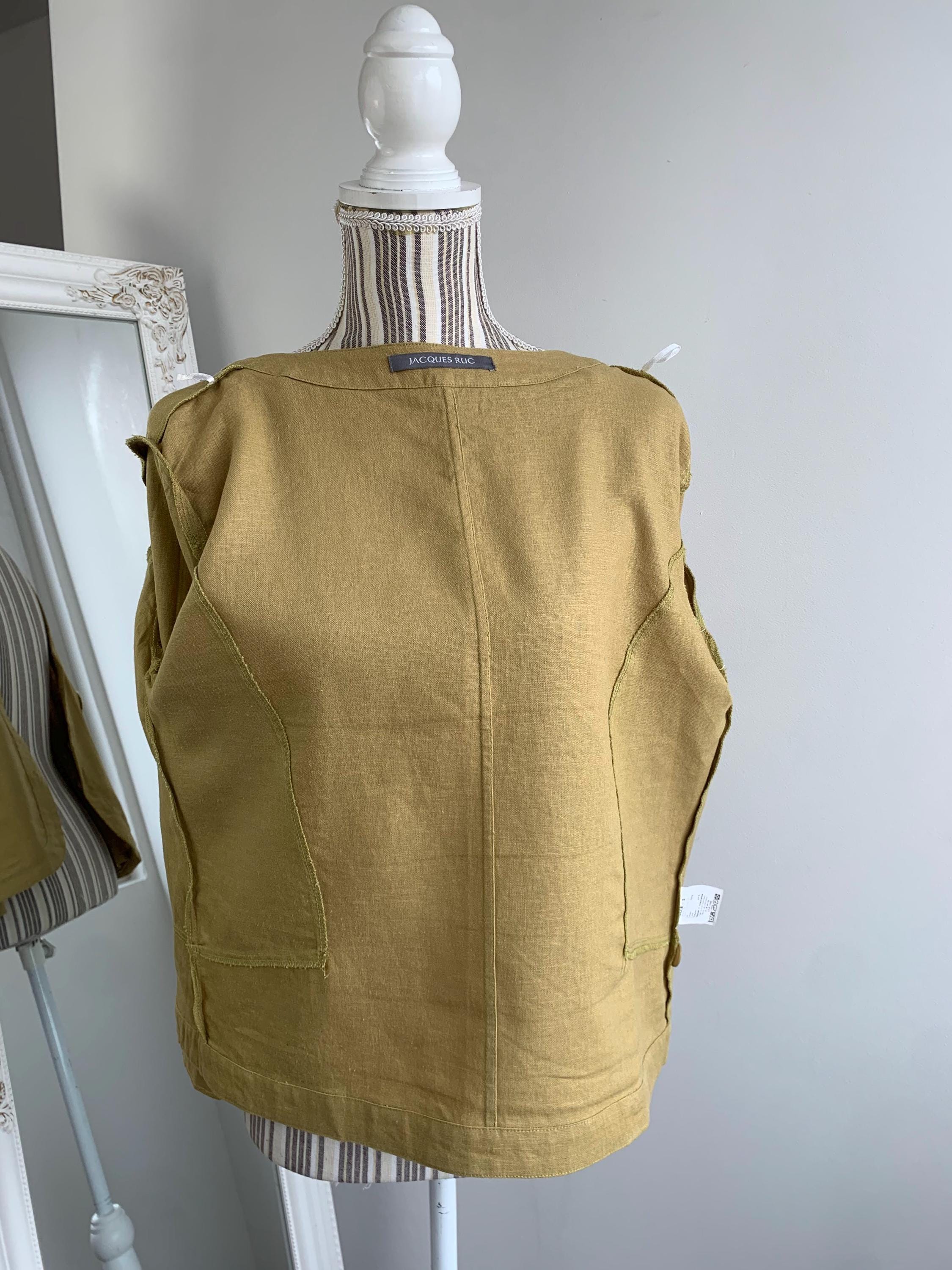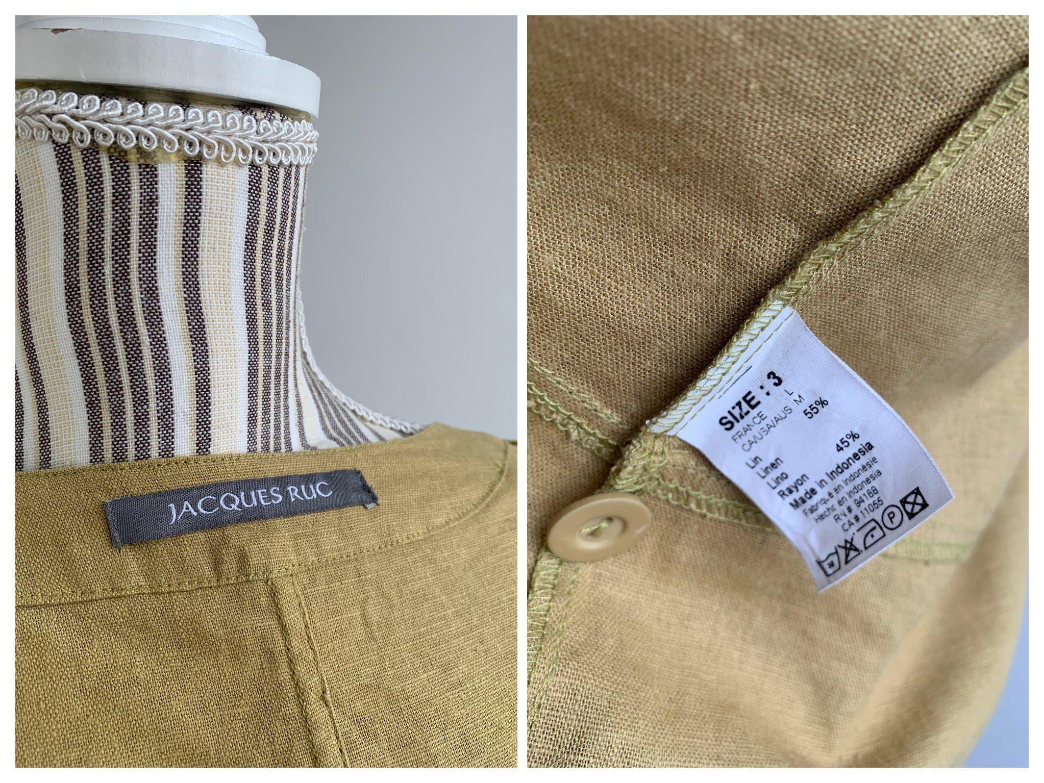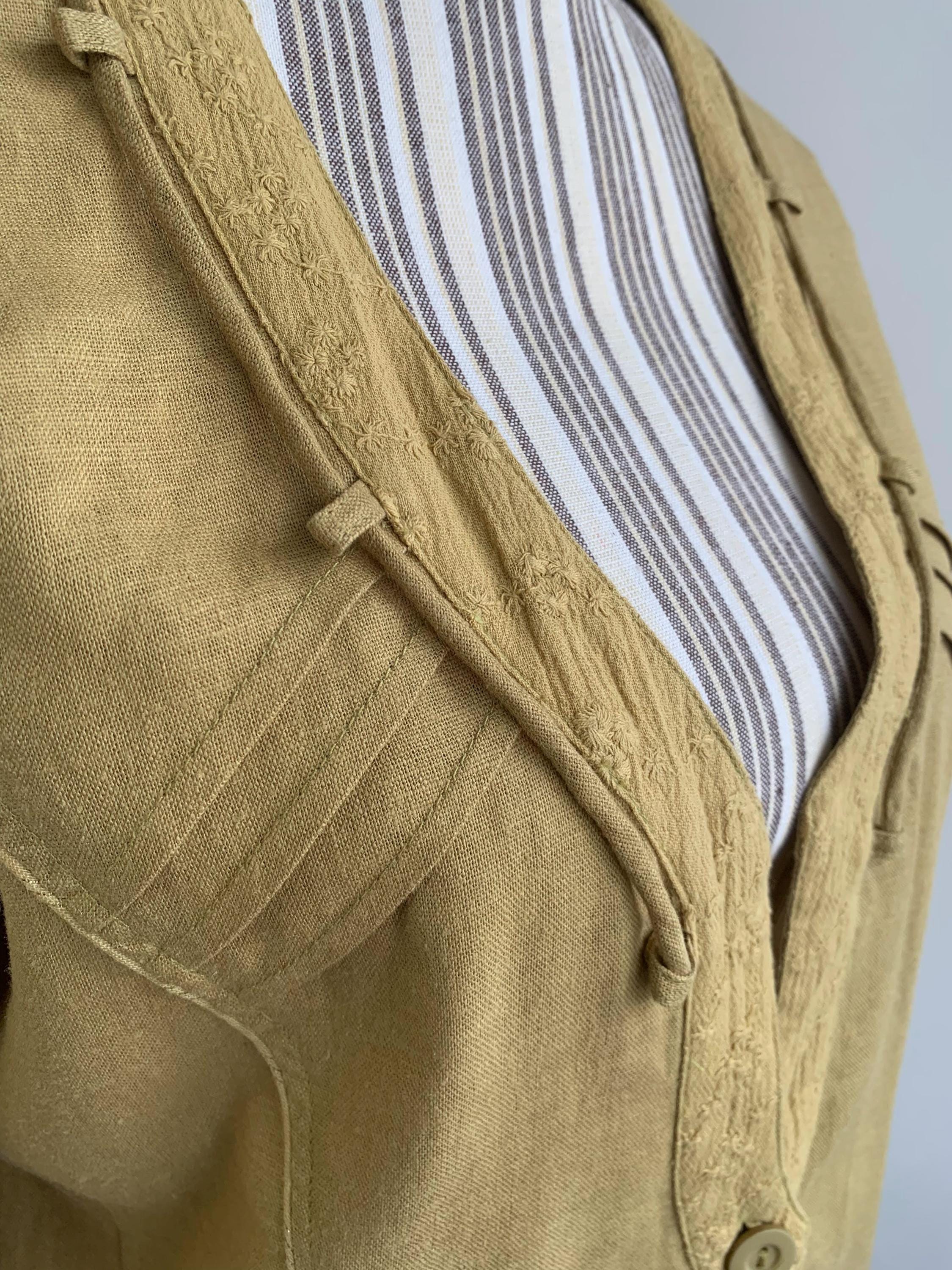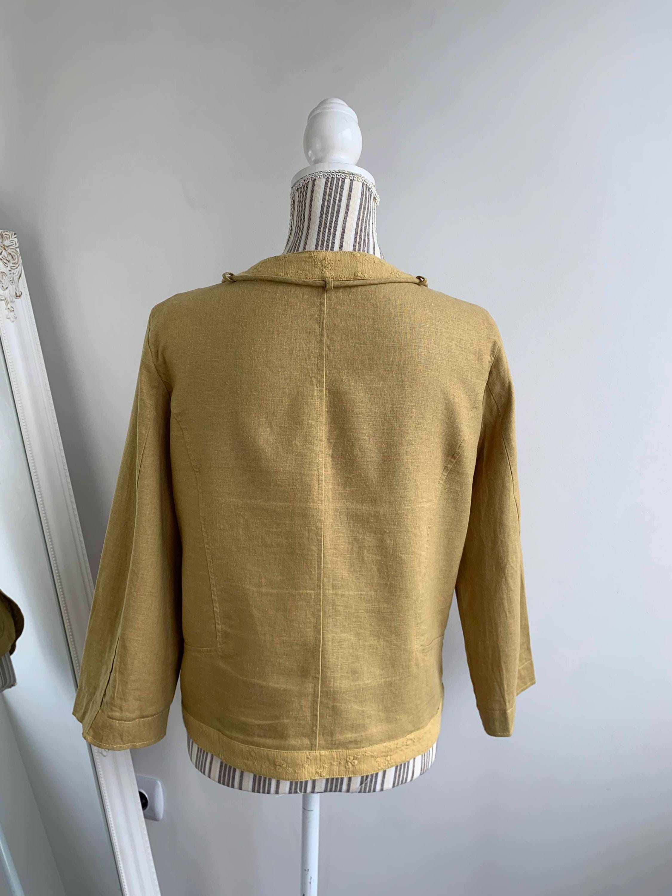 This is a beautiful vintage rayon linen blazer for women with 3/4 sleeves for women. This light unlined short linen coat is made of 55% linen and 45% rayon fabric in mustard green color. It has embroidery trim. This linen cropped blazer has button up closure. The linen fabric has some texture but still in great condition. Sustainable piece of linen clothing that you can enjoy. The size marked is France L, US/CA/ AUS M, it fits like size L. Please check the measurements below