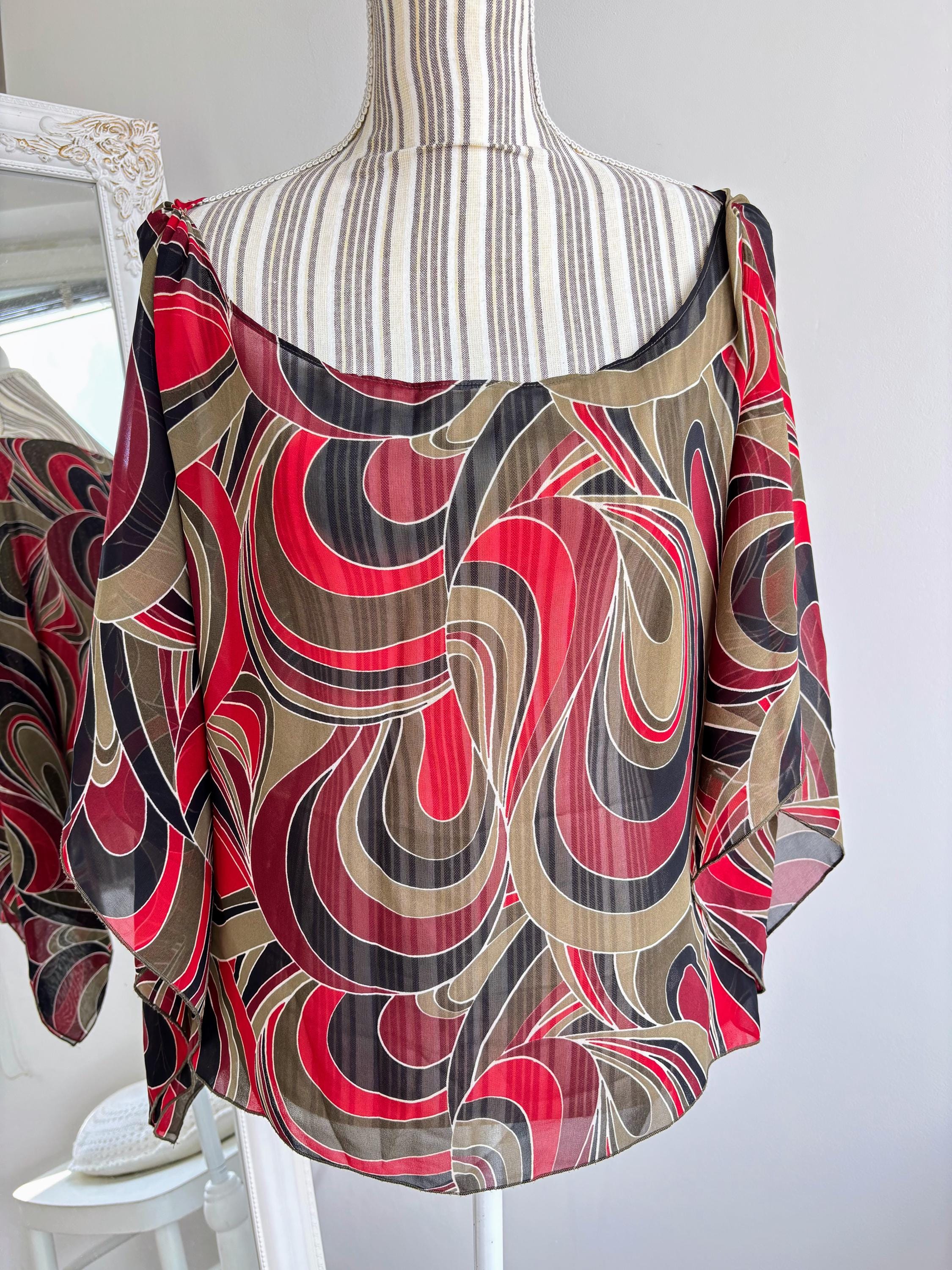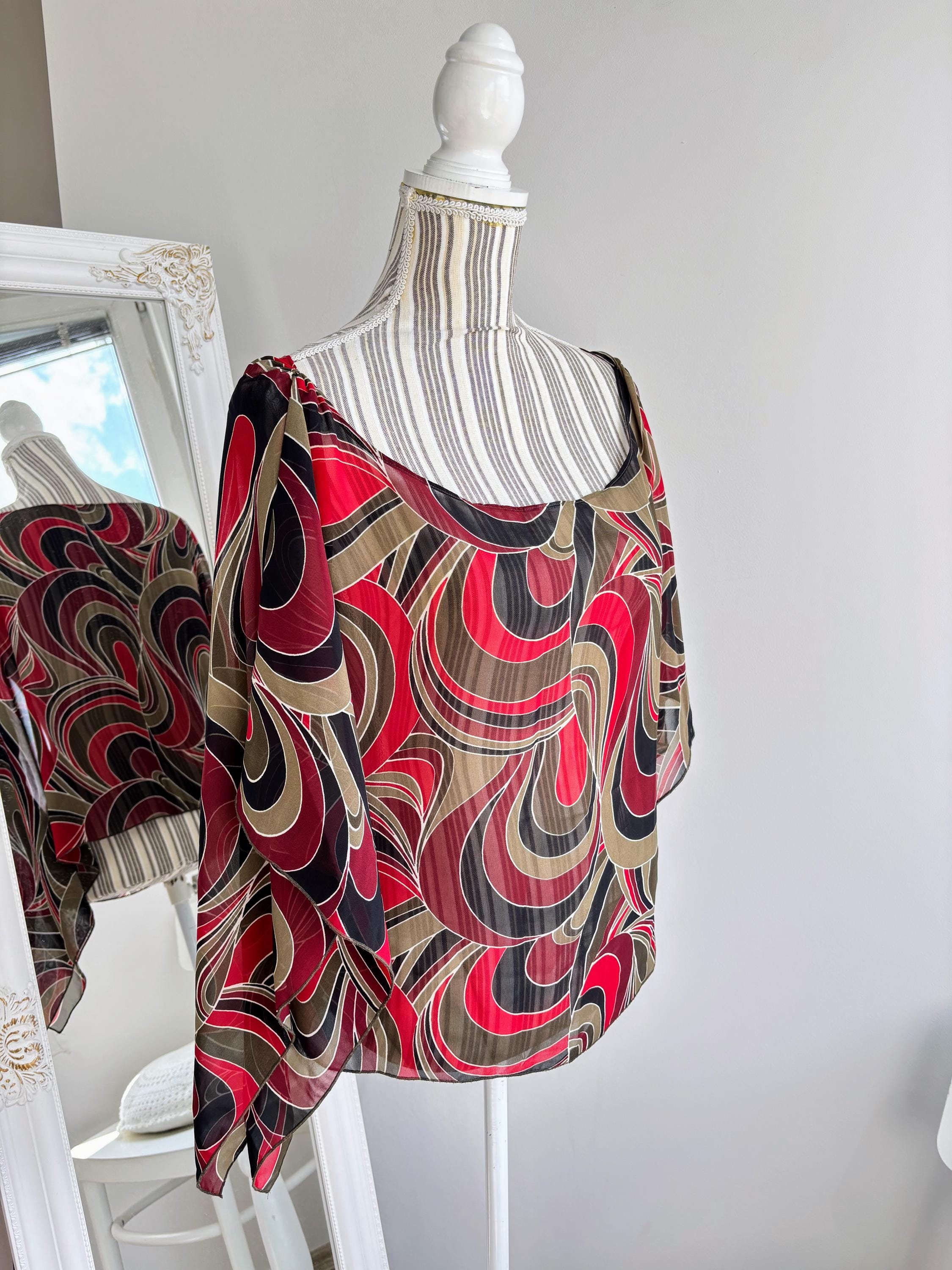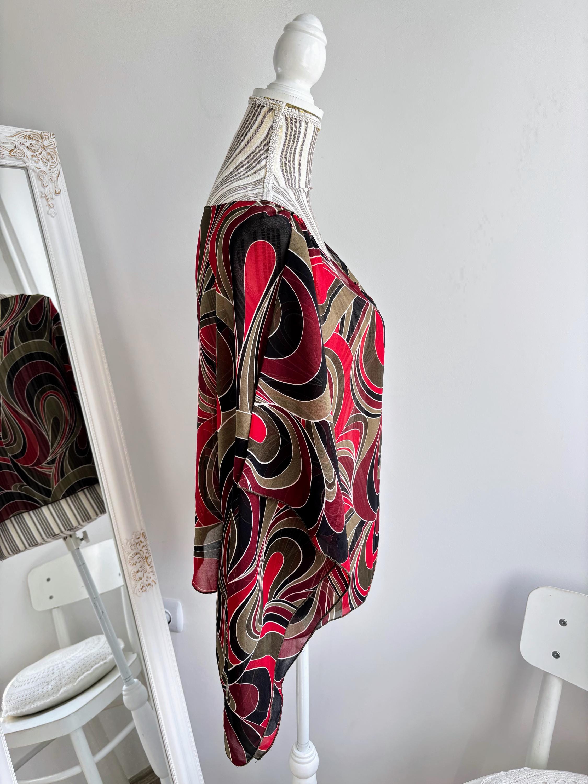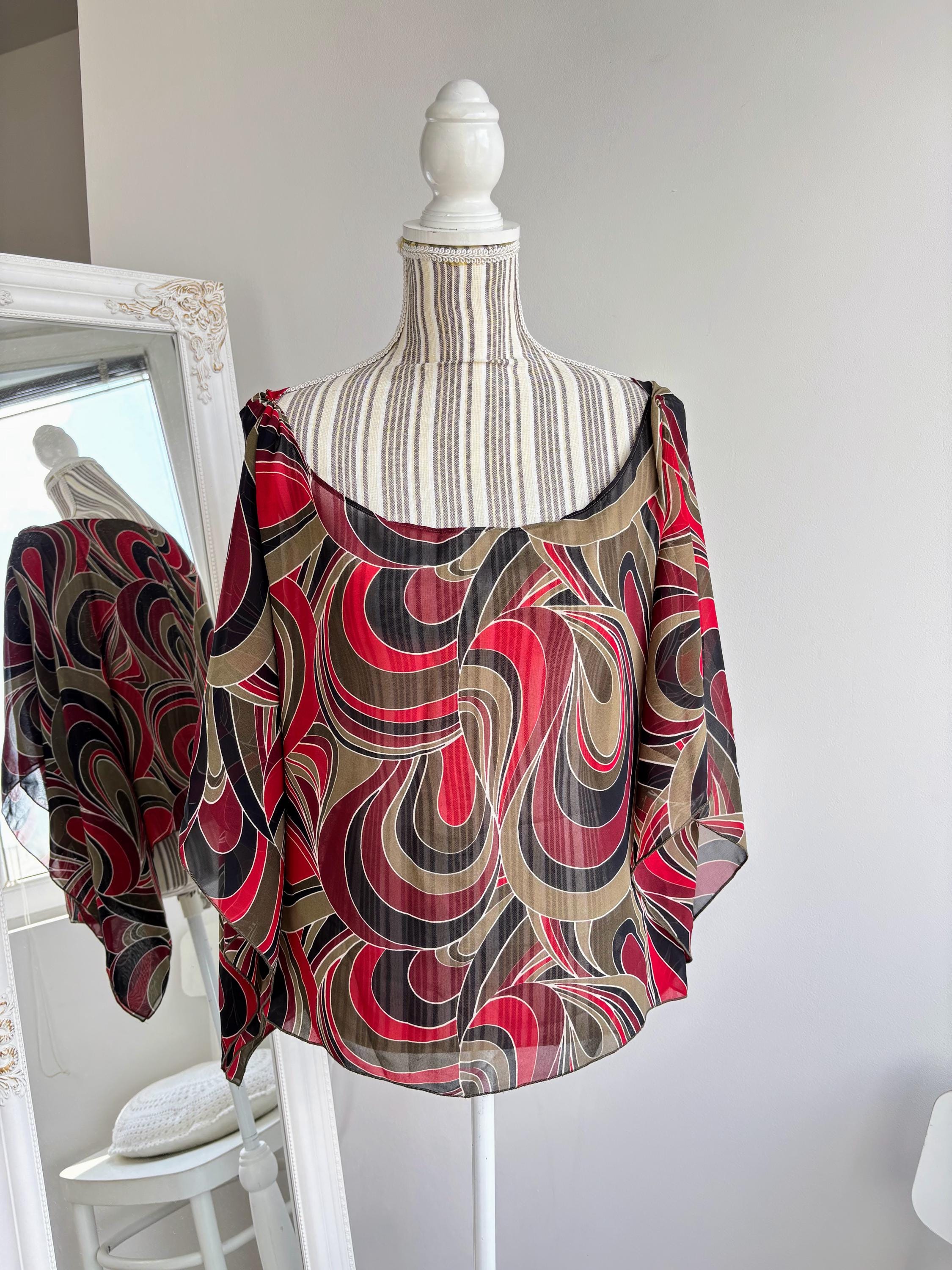 This is a lovely vintage 90s sheer overlay top for women in shades of khaki green, burgundy red and black. This overlay blouse is made of lightweight polyester fabric with kimono wing sleeves. This transparent top can be worn as a beach cover up or as a sexy boho shirt with wide leg jeans or maxi skirt for a 70s vibe. This see through top has scooped neckline. This grunge sheer blouse has no tag or label. It is suited for sizes S, M or L. Please check the measurements below.