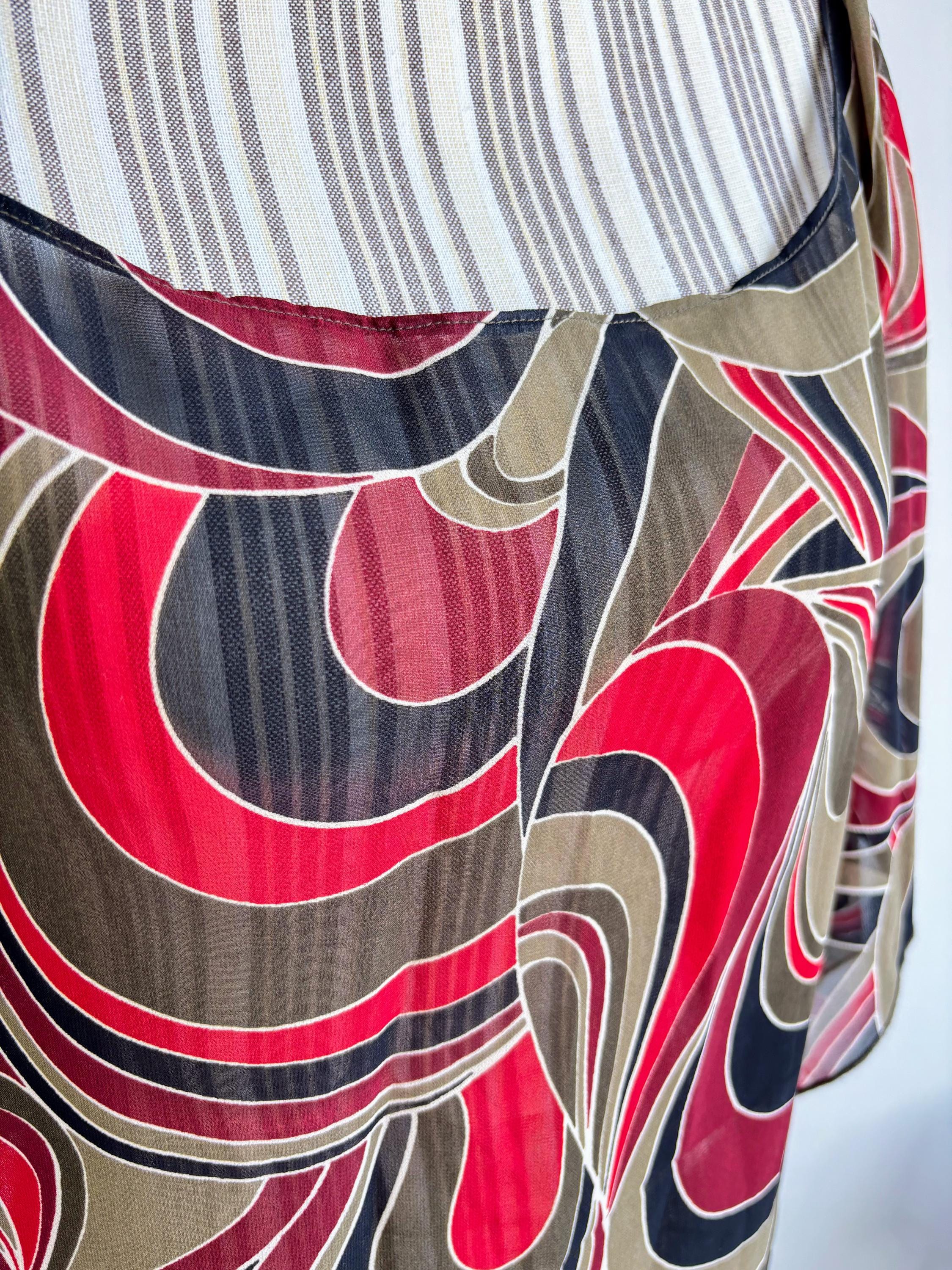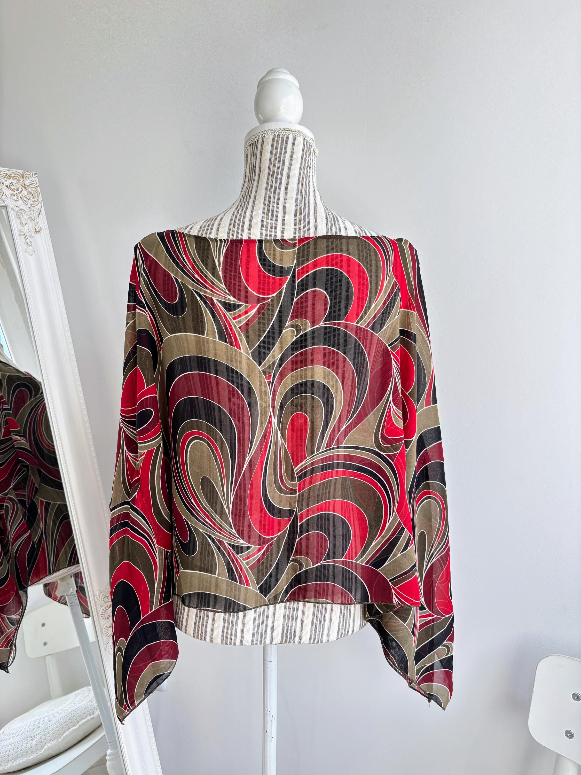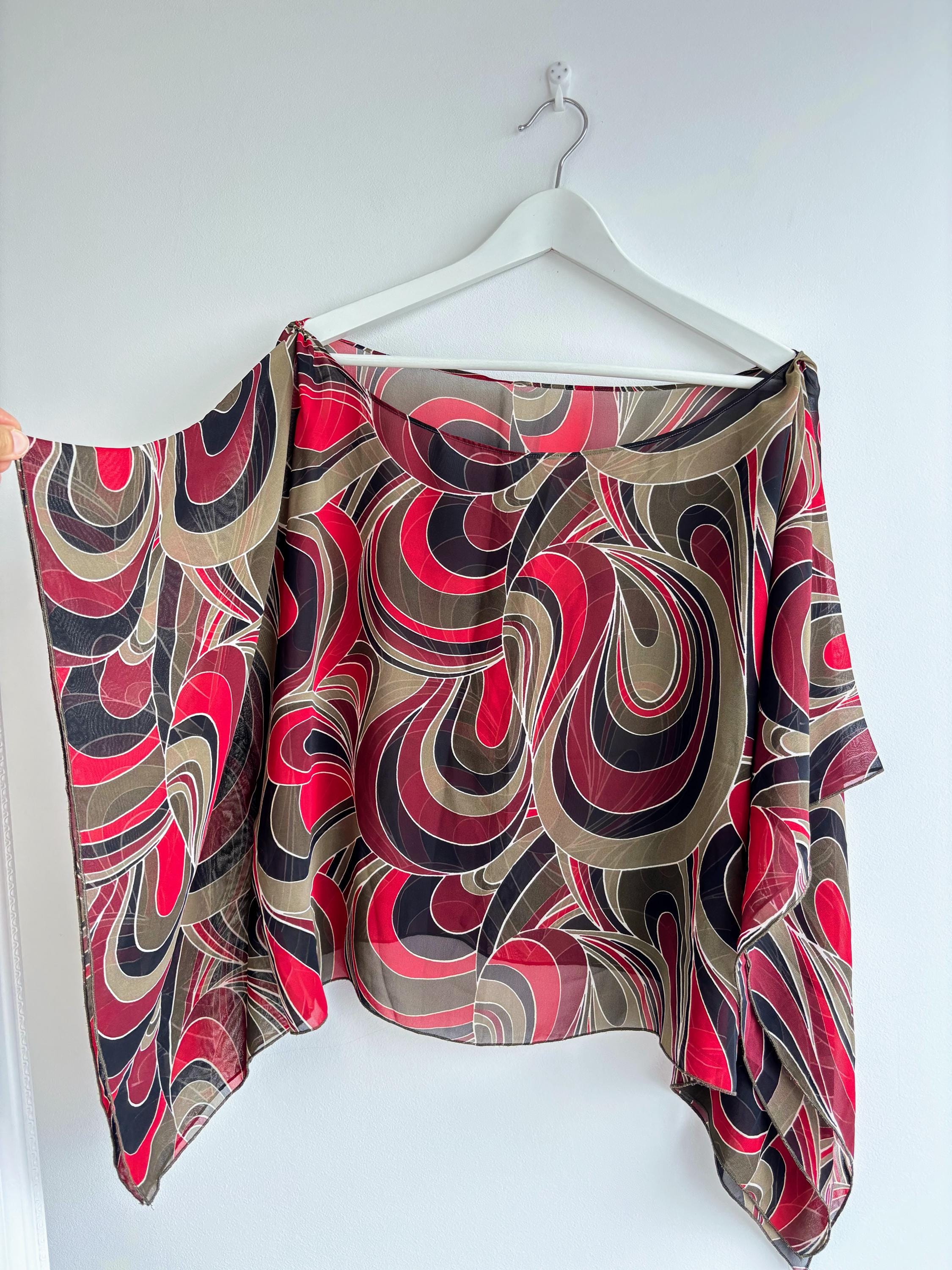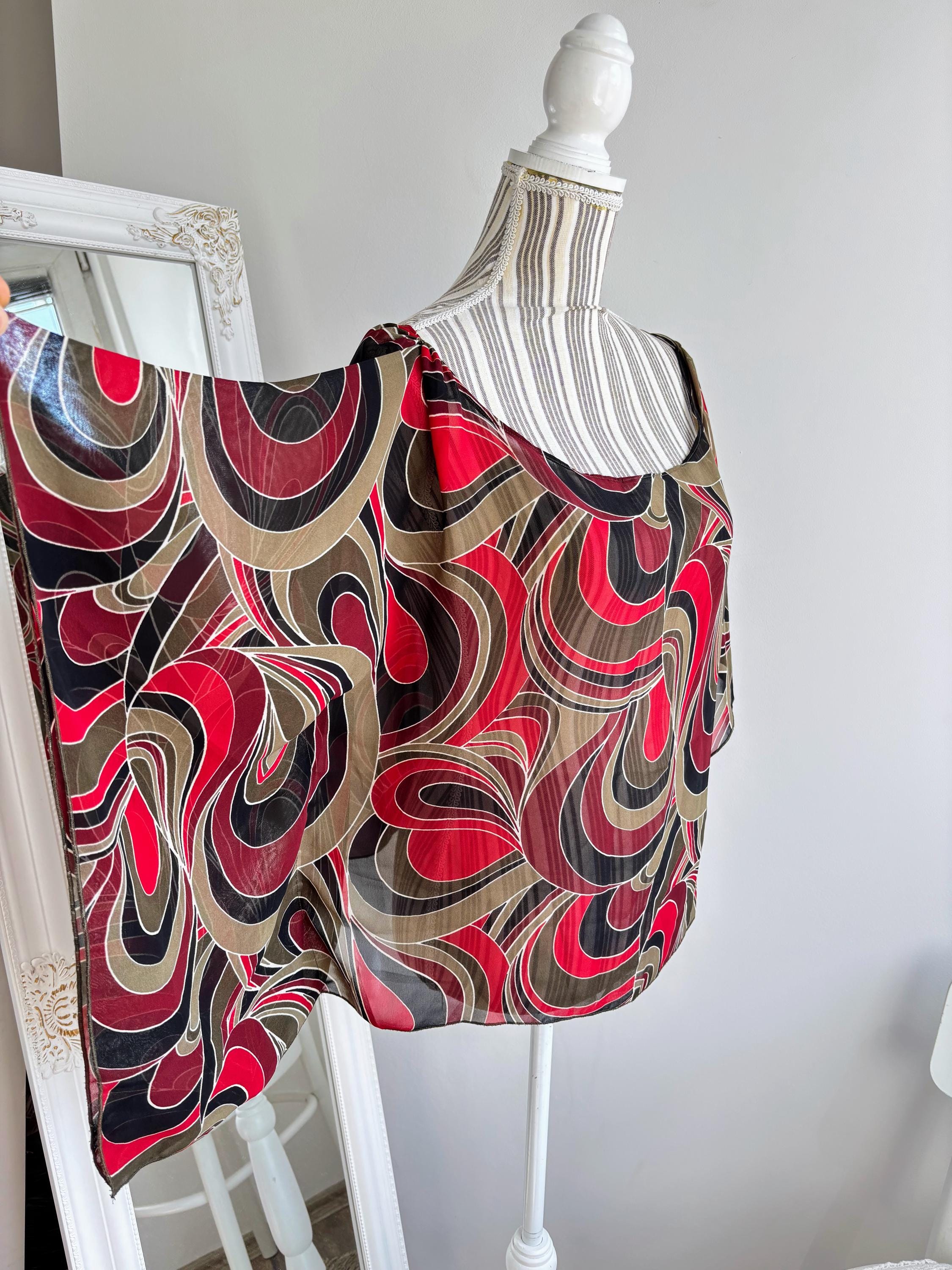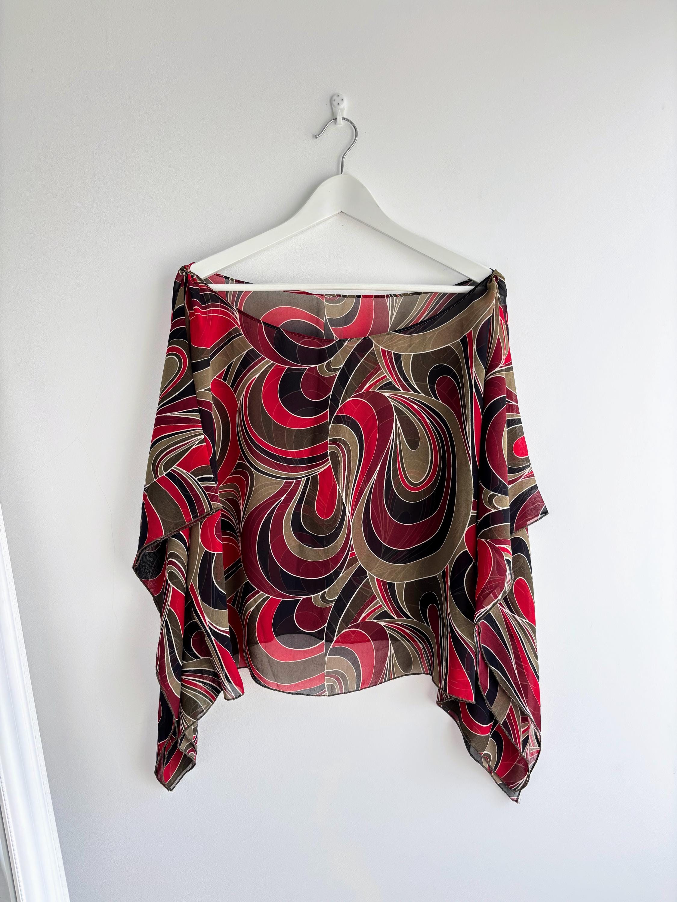 This is a lovely vintage 90s sheer overlay top for women in shades of khaki green, burgundy red and black. This overlay blouse is made of lightweight polyester fabric with kimono wing sleeves. This transparent top can be worn as a beach cover up or as a sexy boho shirt with wide leg jeans or maxi skirt for a 70s vibe. This see through top has scooped neckline. This grunge sheer blouse has no tag or label. It is suited for sizes S, M or L. Please check the measurements below.