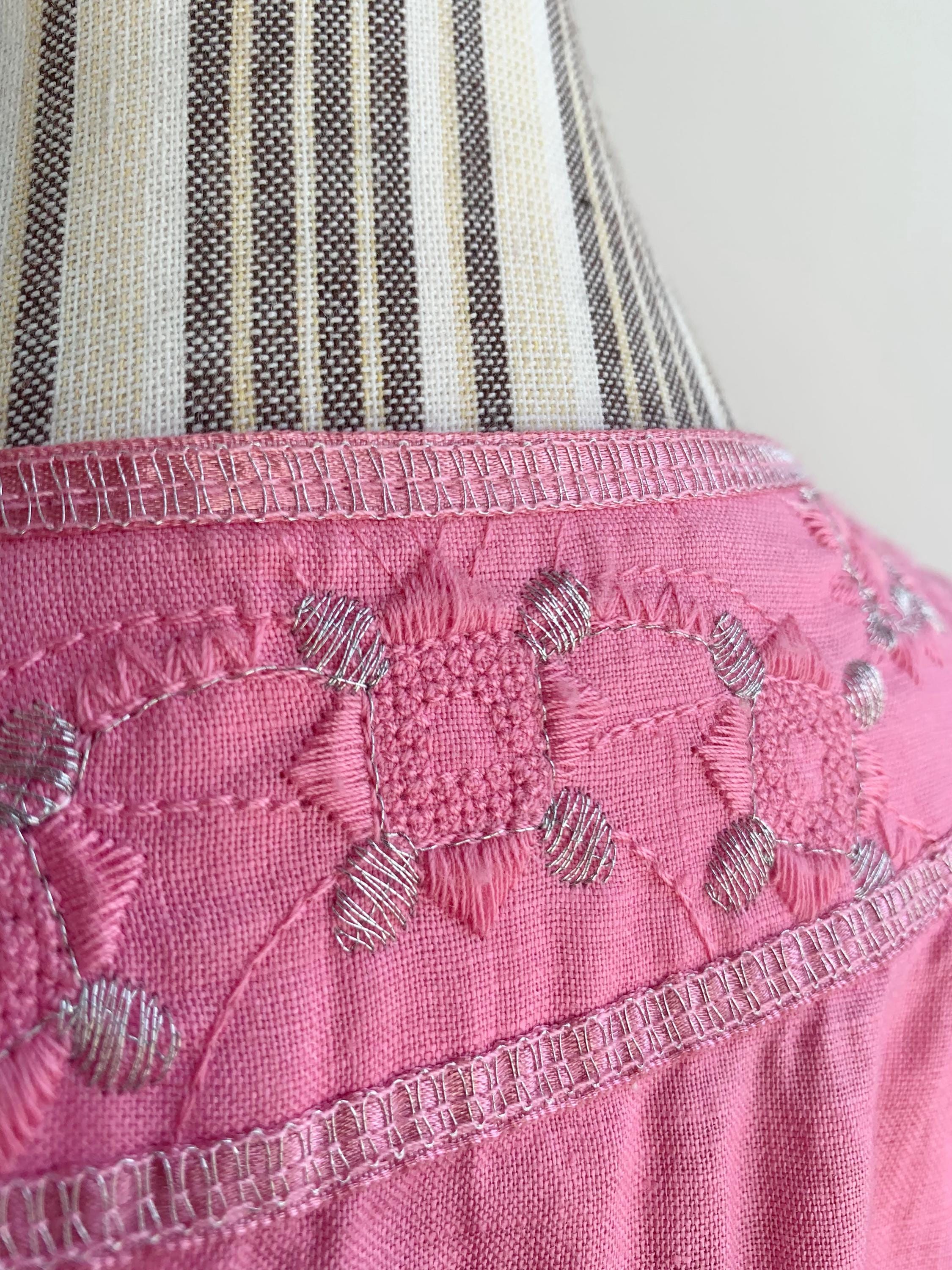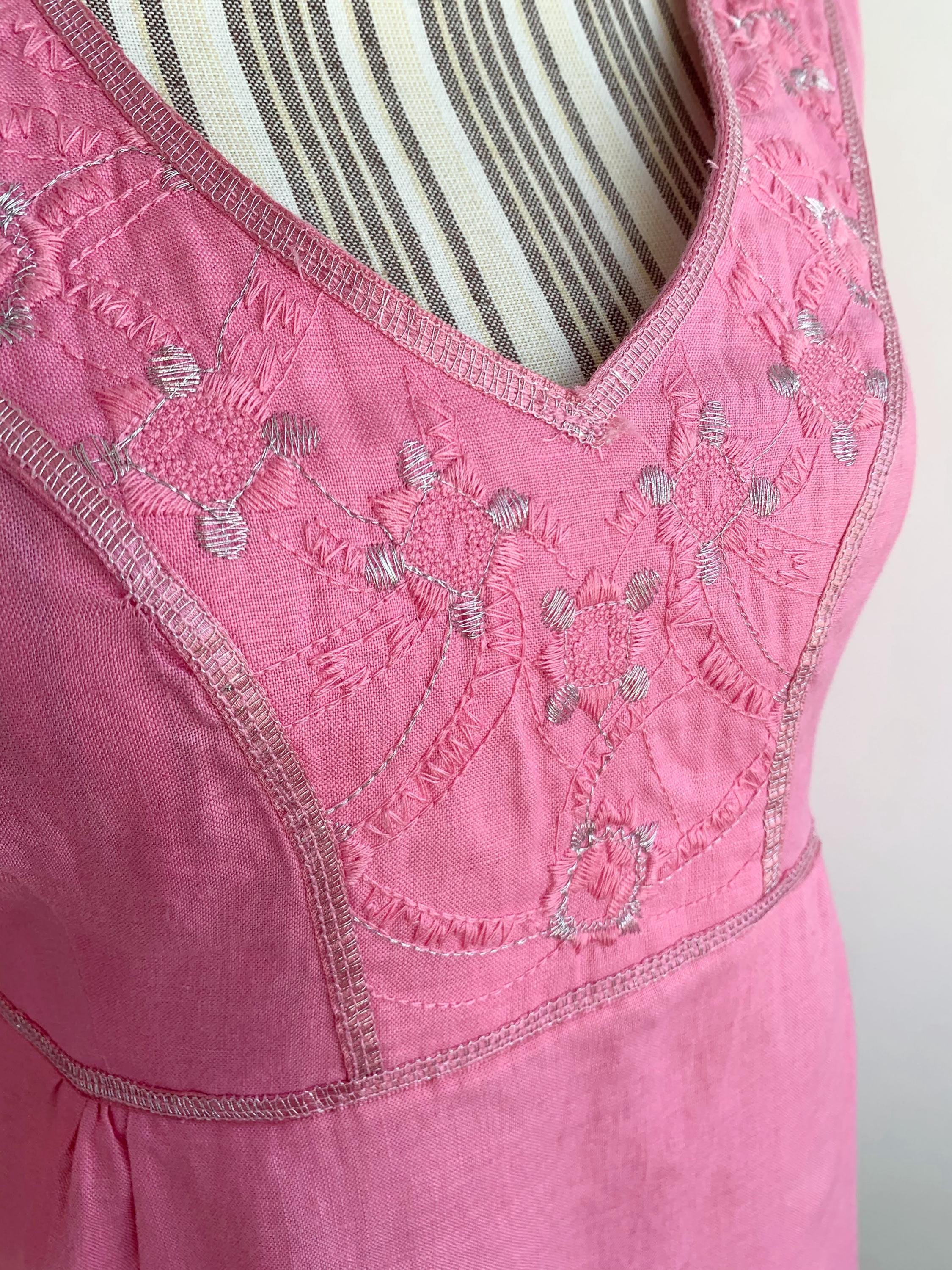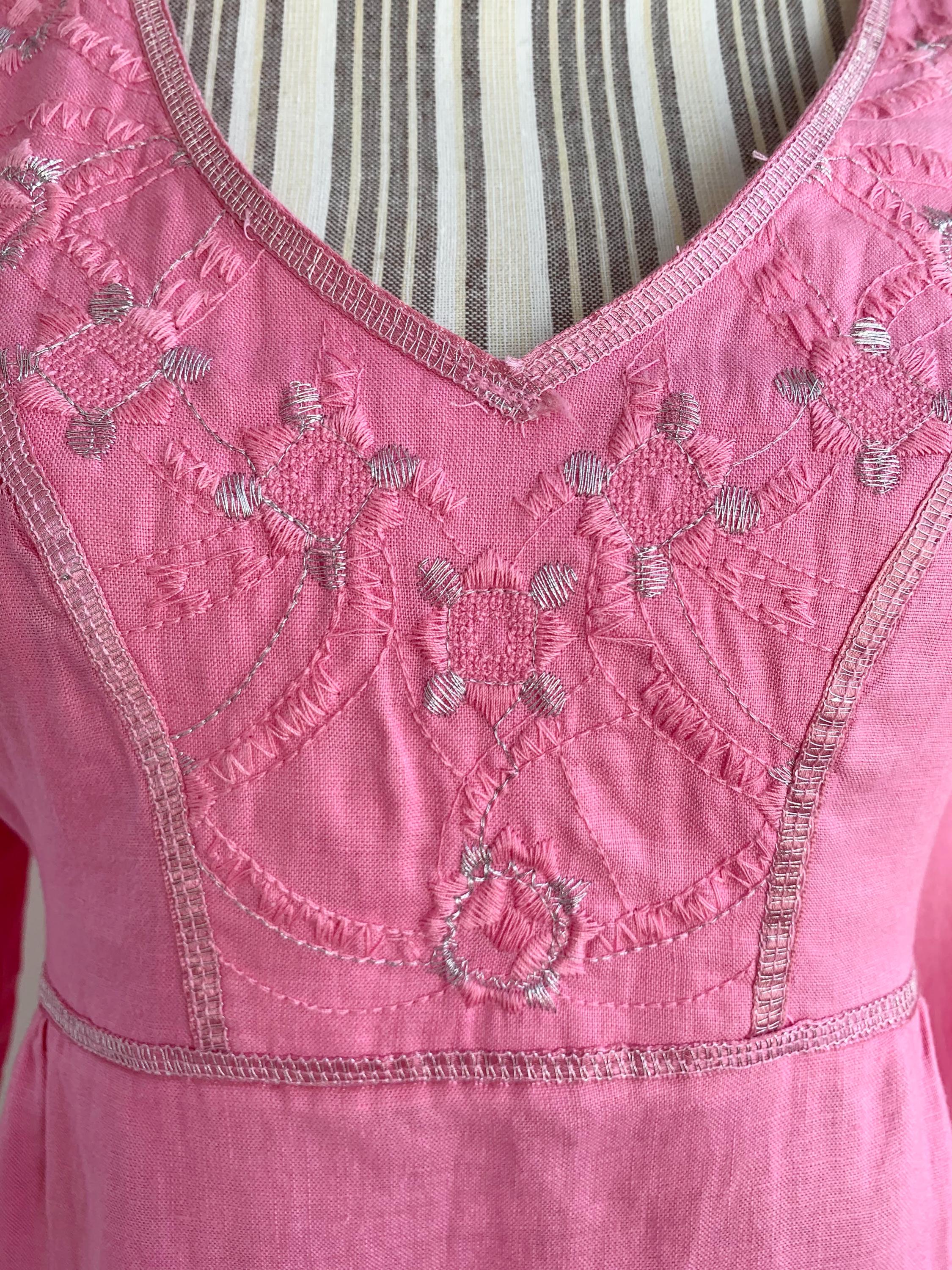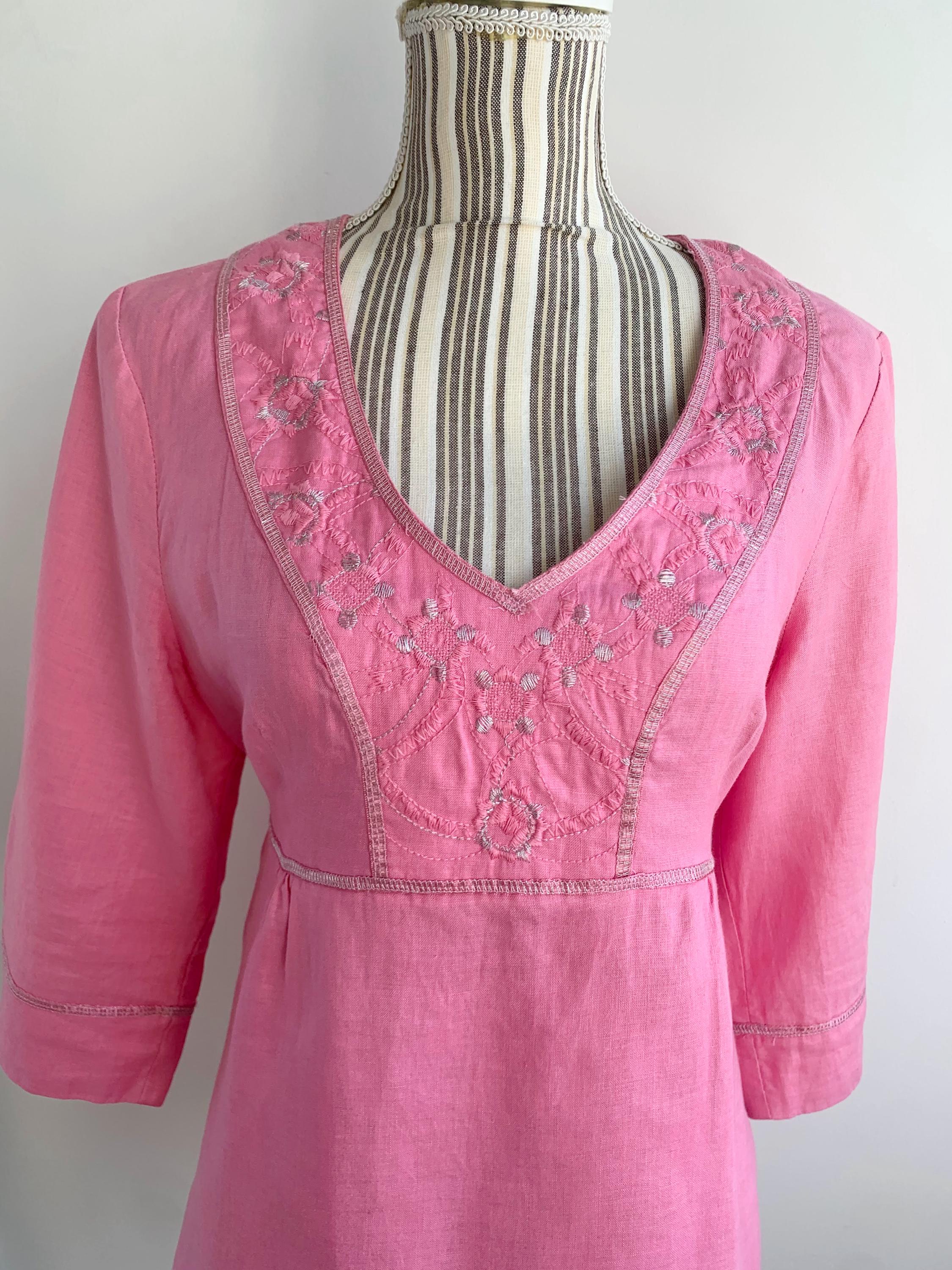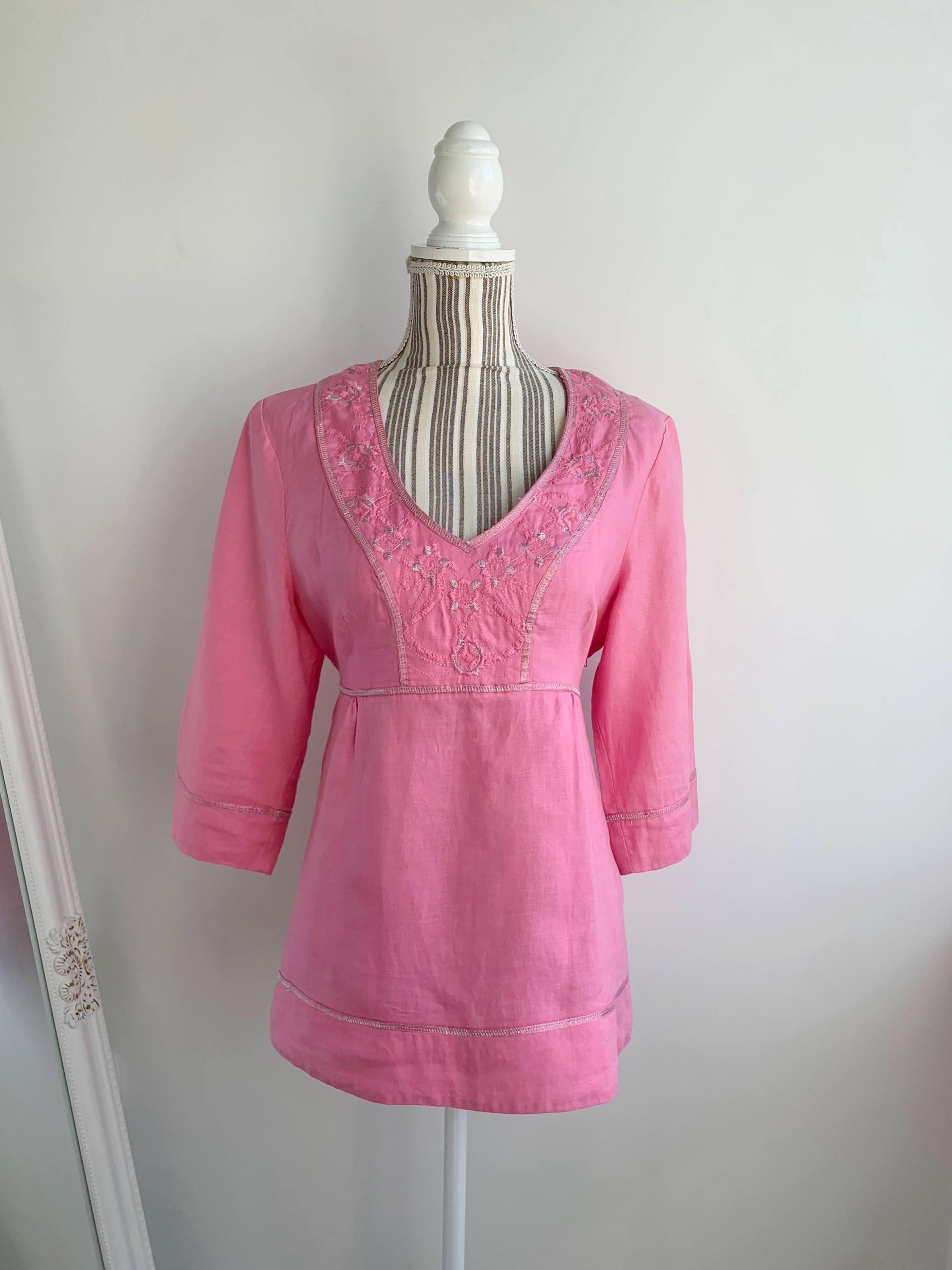 Vintage Y2K pink embroidery pure linen blouse with stylised floral embroidery size 38 M. This peasant blouse is made of natural eco friendly 100% linen fabric with A line relaxed silhouette and half sleeves. This high waisted linen top has tie back detailing. Perfect breathable clothing for the summer.