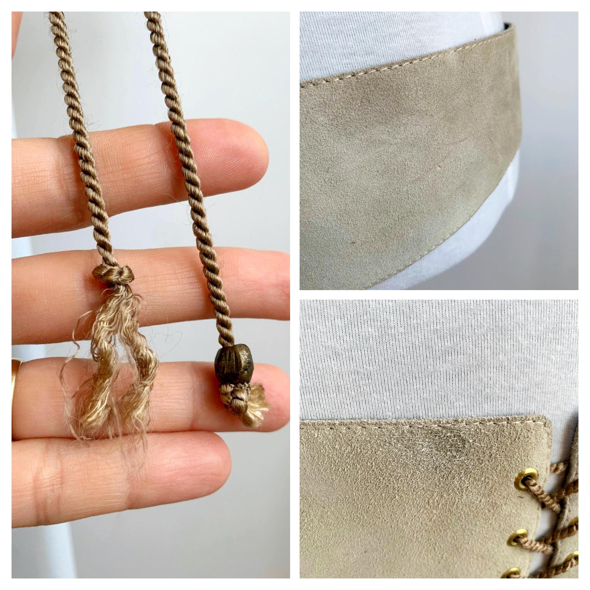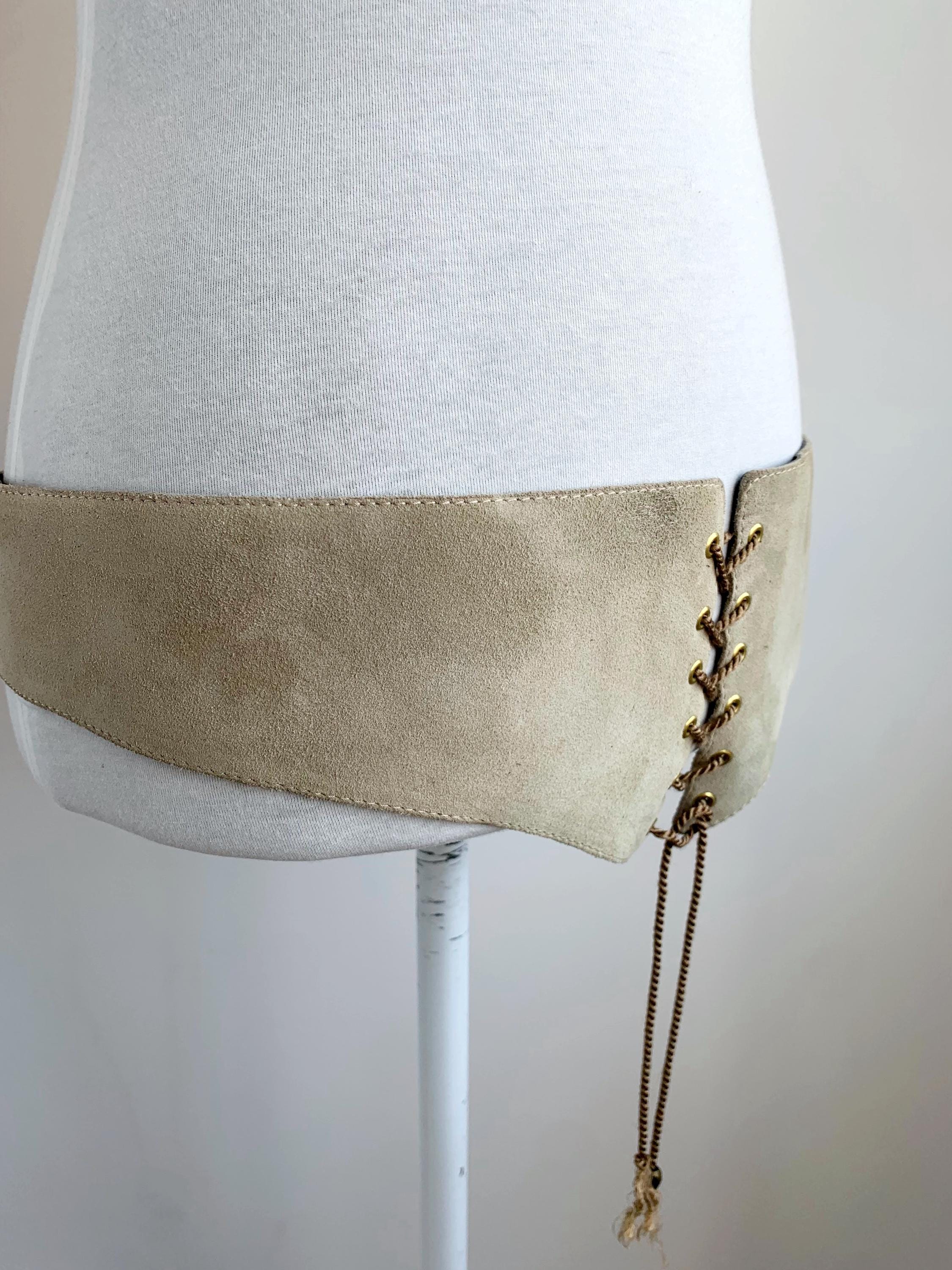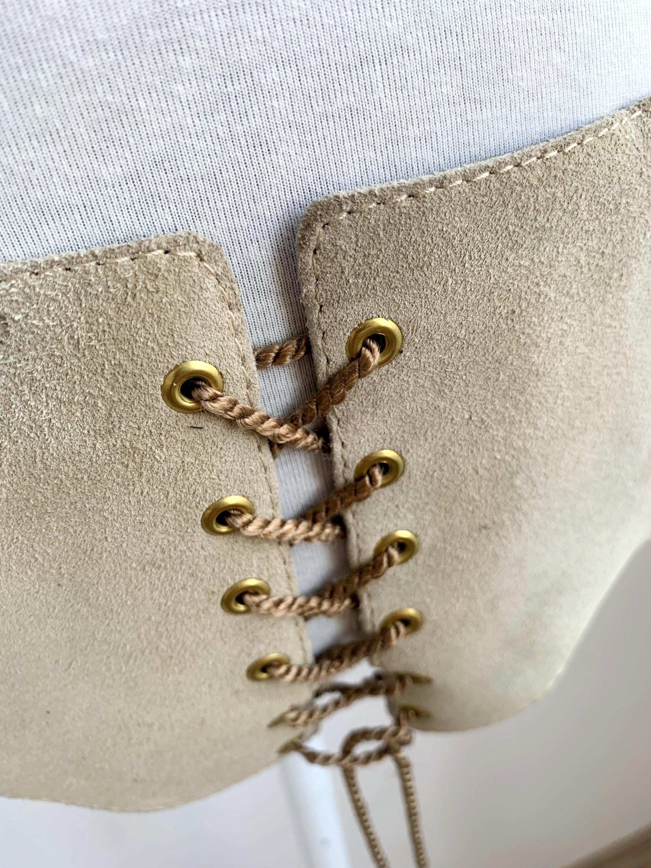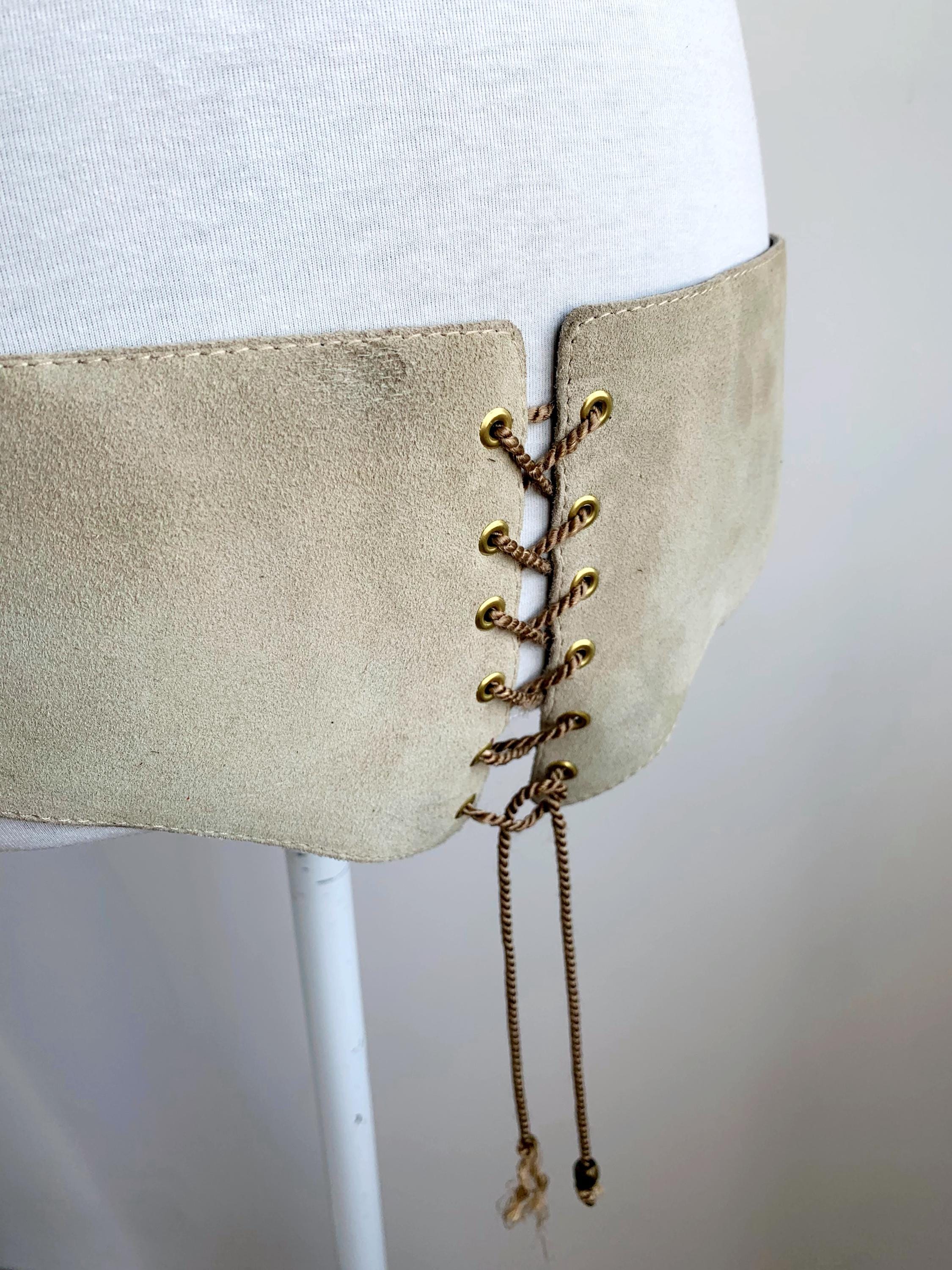 Condition: vintage, thrifted. This vintage leather waist cincher is in pre-loved vintage condition and shows some signs of wear - there are some marks and scratched on the suede leather and some unraveling at the laces.