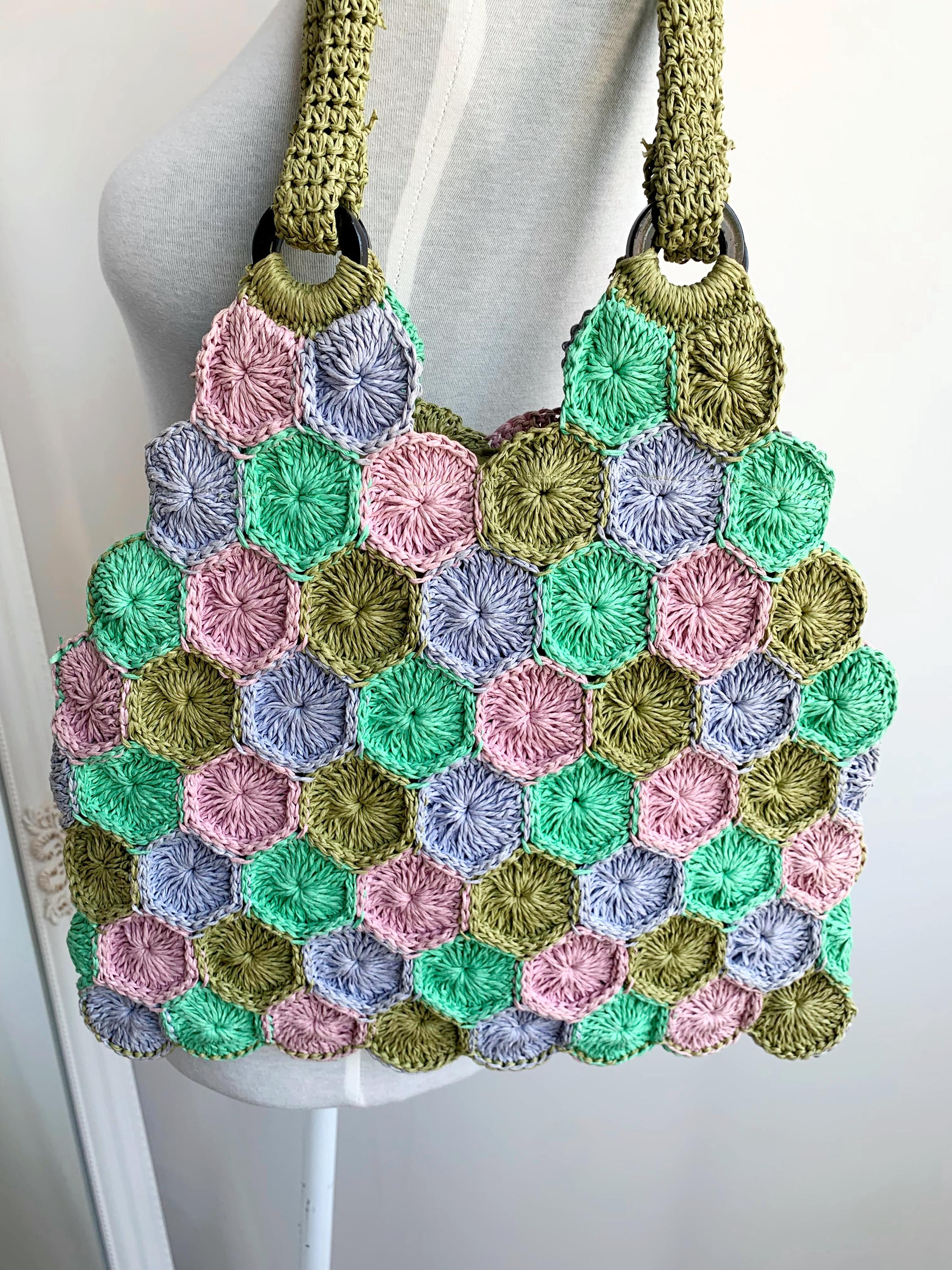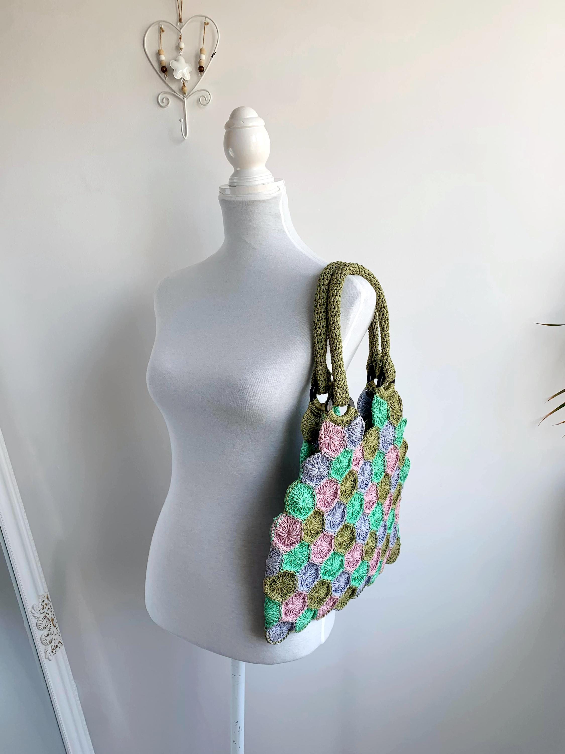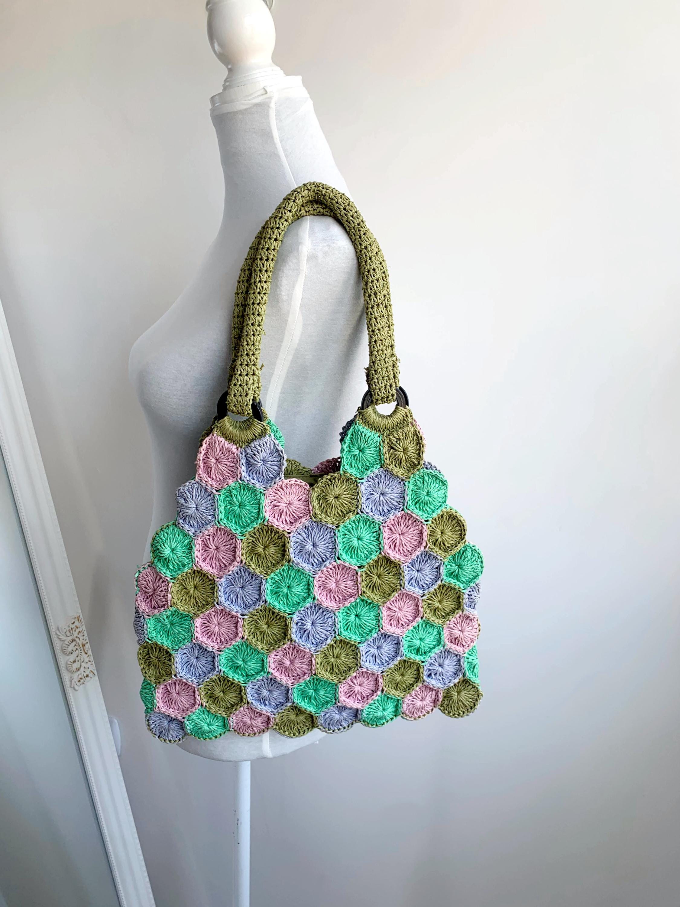 This is a bright colorful beach tote bag made of paper. This boho summer basket shines in sage green, pink, lavender and turquoise. It has a geometric hexagon pattern. You can wear this boho shoulder bag at the beach or at school, as it is just big enough to fit in a few regular size books. This hippie crochet tote will add some pop of color to your summer outfits. It is by the brand Rebecca Molenaar. This boho chic bag is hand crochet - the beautiful colorful pattern is formed by crochet circles in green, teal, lavender and pink. This paper tote bag has two sturdy crochet straps, which allow you to comfortably wear this bag as a handbag to a tote over your shoulder.