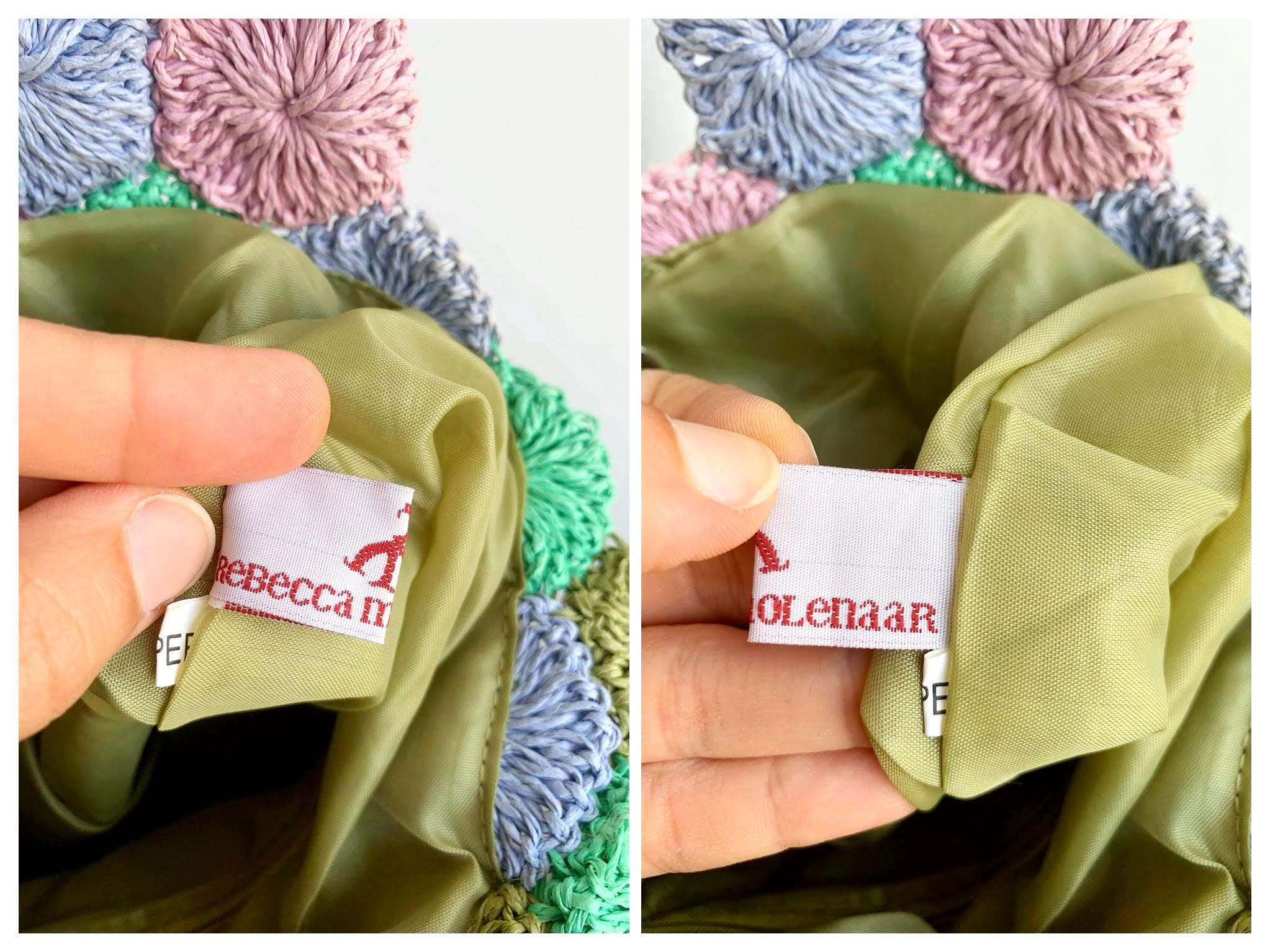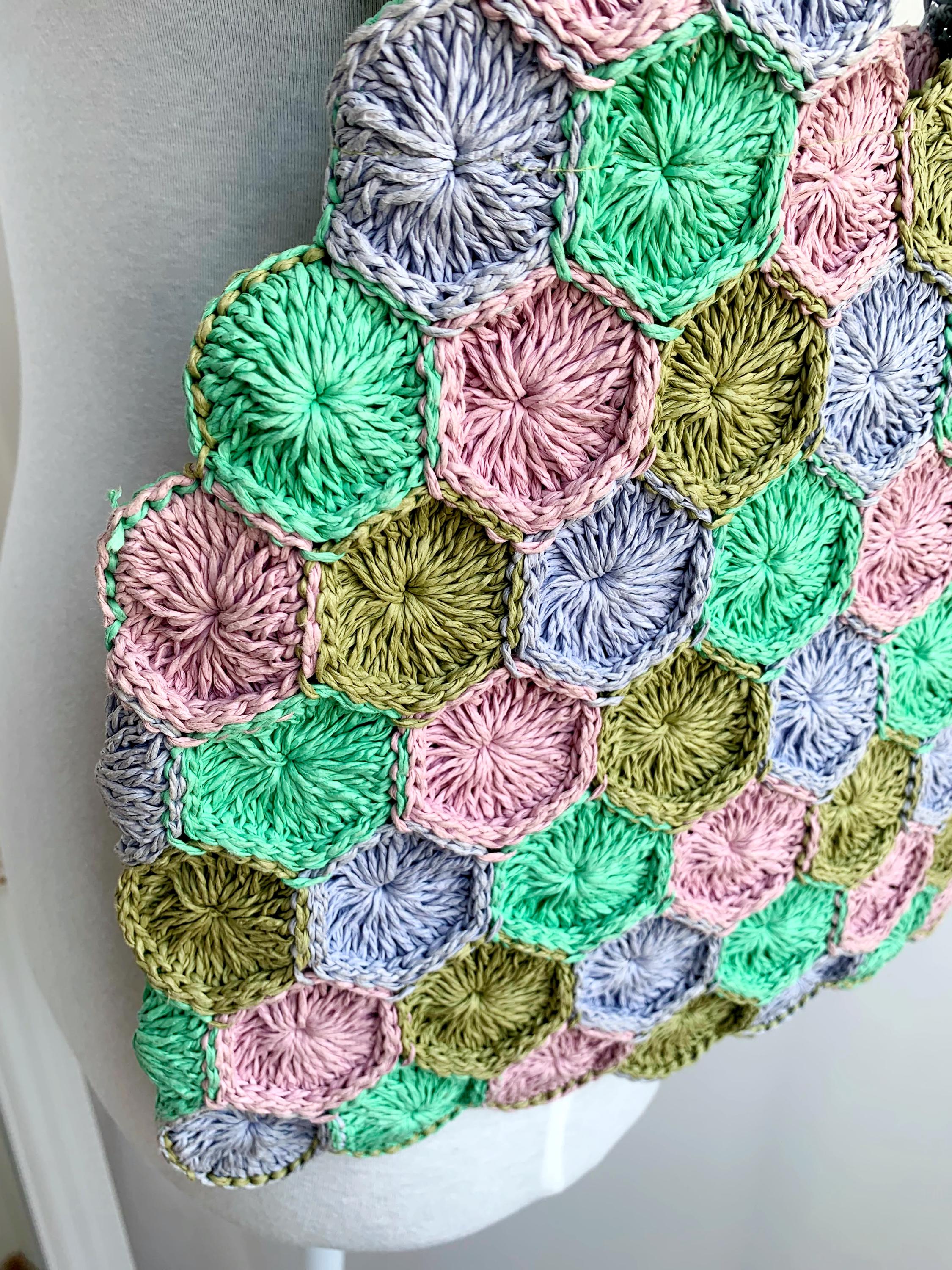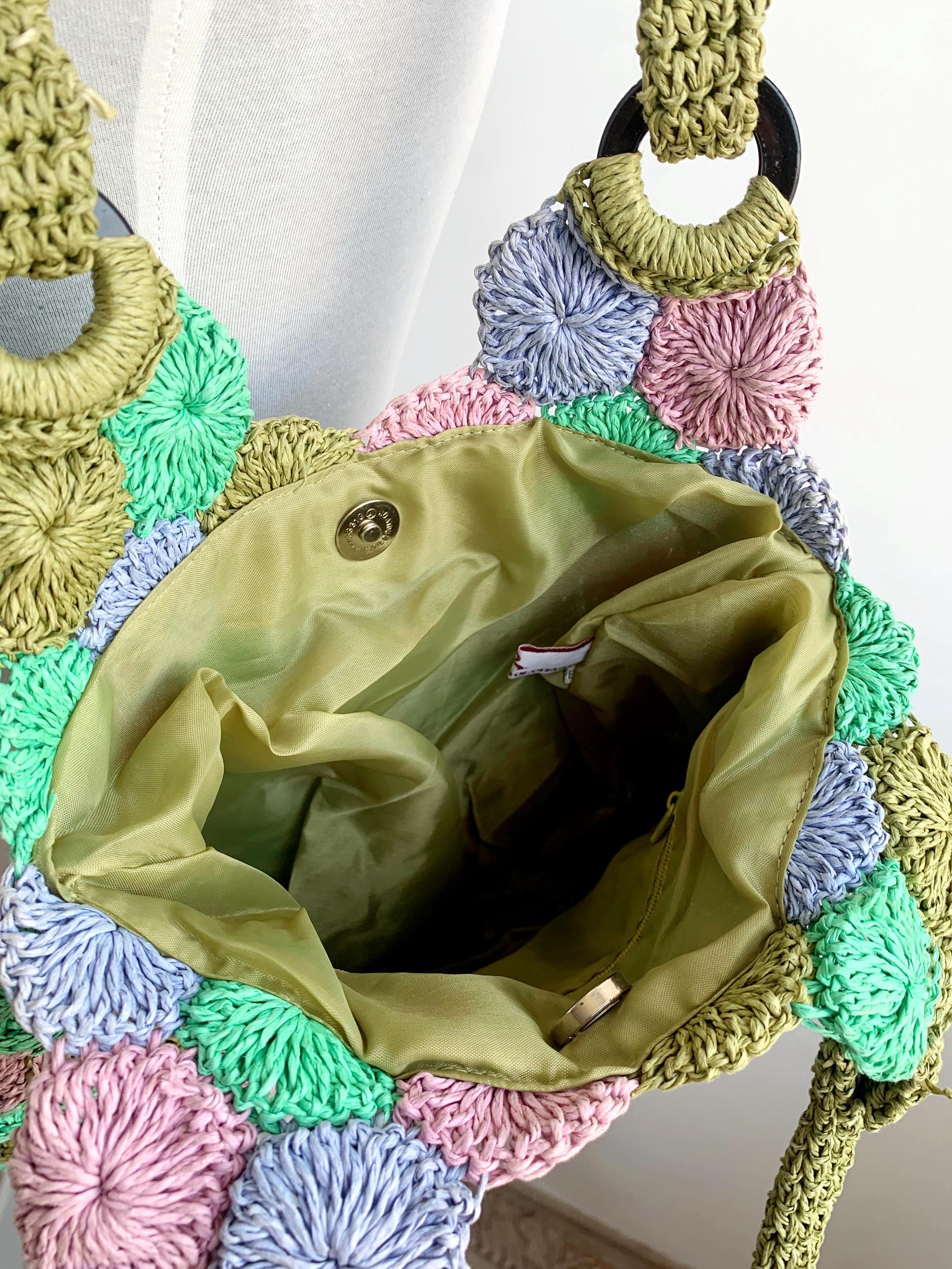 This is a bright colorful beach tote bag made of paper. This boho summer basket shines in sage green, pink, lavender and turquoise. It has a geometric hexagon pattern. You can wear this boho shoulder bag at the beach or at school, as it is just big enough to fit in a few regular size books. This hippie crochet tote will add some pop of color to your summer outfits. It is by the brand Rebecca Molenaar. This boho chic bag is hand crochet - the beautiful colorful pattern is formed by crochet circles in green, teal, lavender and pink. This paper tote bag has two sturdy crochet straps, which allow you to comfortably wear this bag as a handbag to a tote over your shoulder.