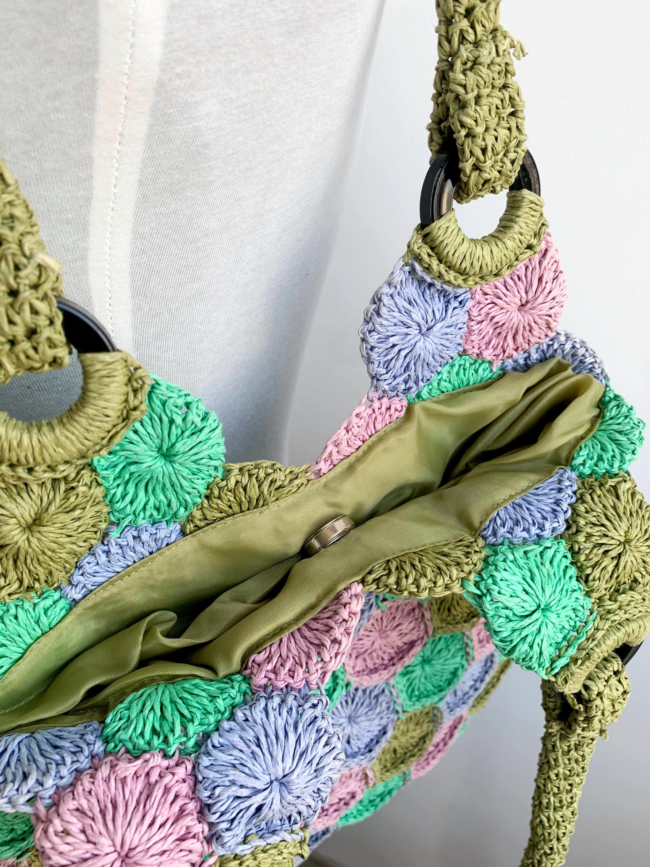 Conditions: vintage, thrifted. This colorful crochet purse is in great vintage condition and shows no visible signs of wear. It is beautifully preserved. The colors are amazing. The straps are sturdy. The interior is nice and clean, as if this purse has never been worn.