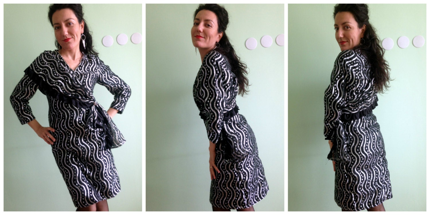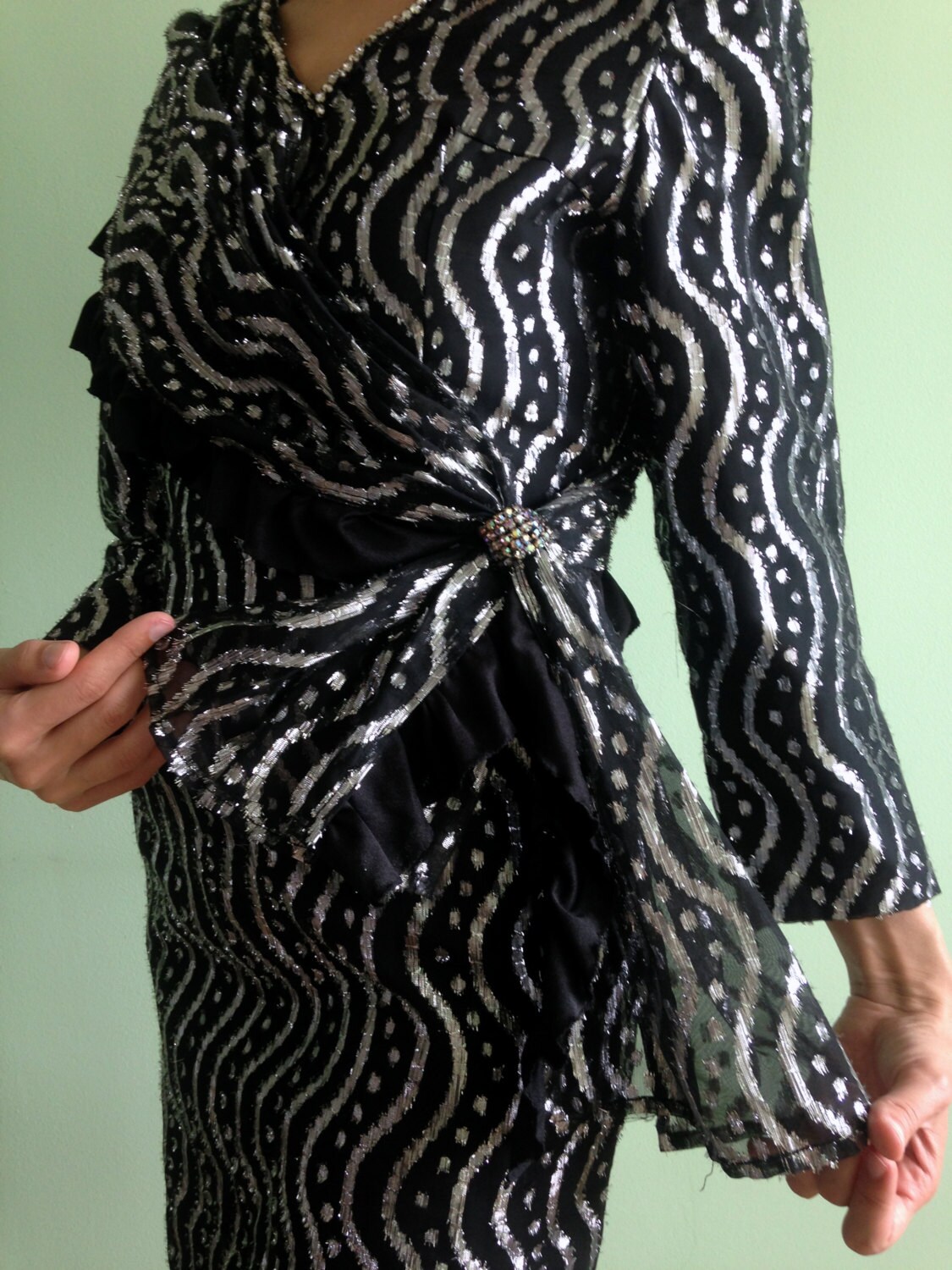 This is a beautiful glittery black and silver prom dress in size small. This black long sleeve dress is made of polyester fabric with silver tone lame, which sparkles beautifully. This dress has a size zipper. There is also a rhinestone neckline which will shimmer lovely under the spot lights. It is in size 4 to 6 US or XS to S.