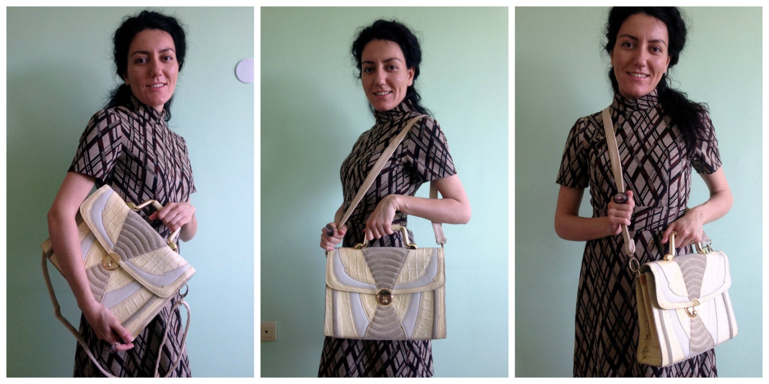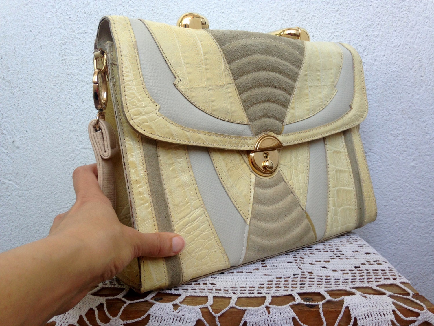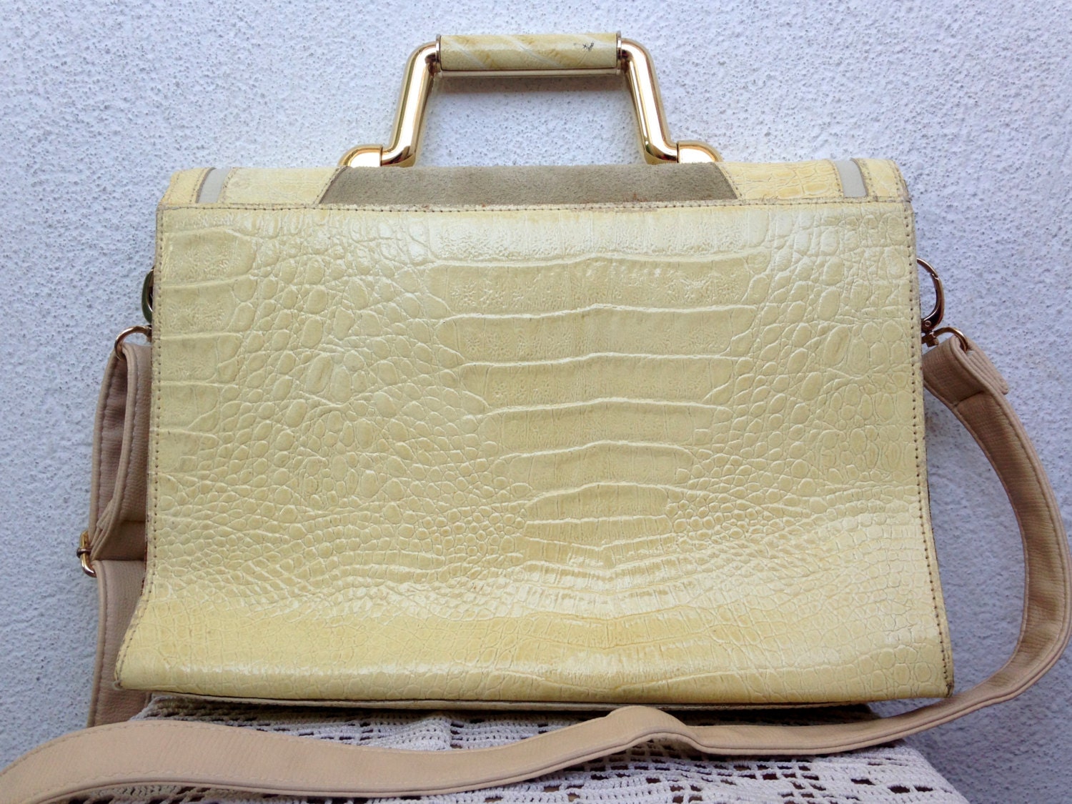 This is an off white ladies satchel which dates back to the 80s. It is made of genuine leather with a few different textures - suede, lizard and crock embossed. The geometric pattern catches the eye and makes this classic ladies briefcase stand out. There is a gold tone closure. The sturdy metal handle looks polished and glamorous. With this amazing satchel you can be chic at work, in the office, at school or in the mall. This Italian leather cross body bag is very sturdy and well made. It is structured and with a hard shape. Since this cream beige purse was left with no shoulder strap when I found it, I later on added another strap. It is not the original one but matches the color of the purse and has gold tone buckles as well, so they go pretty well together. The interior of this ladies shoulder purse is made of vinyl in mustard color. There are two large compartments, one large zip pocket and one small zip pocket. This one-of-a-kind women’s satchel purse will certainly get all eyes on you.