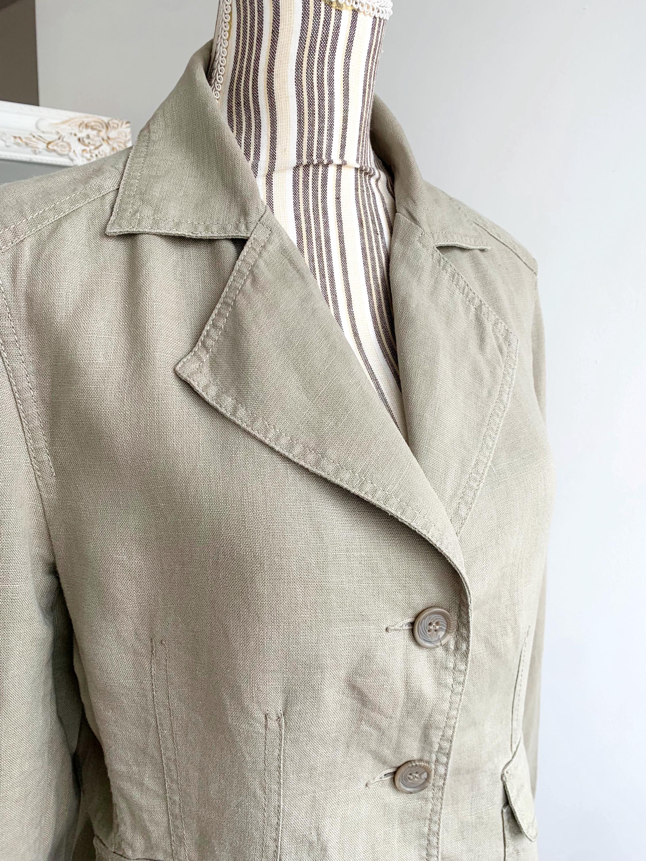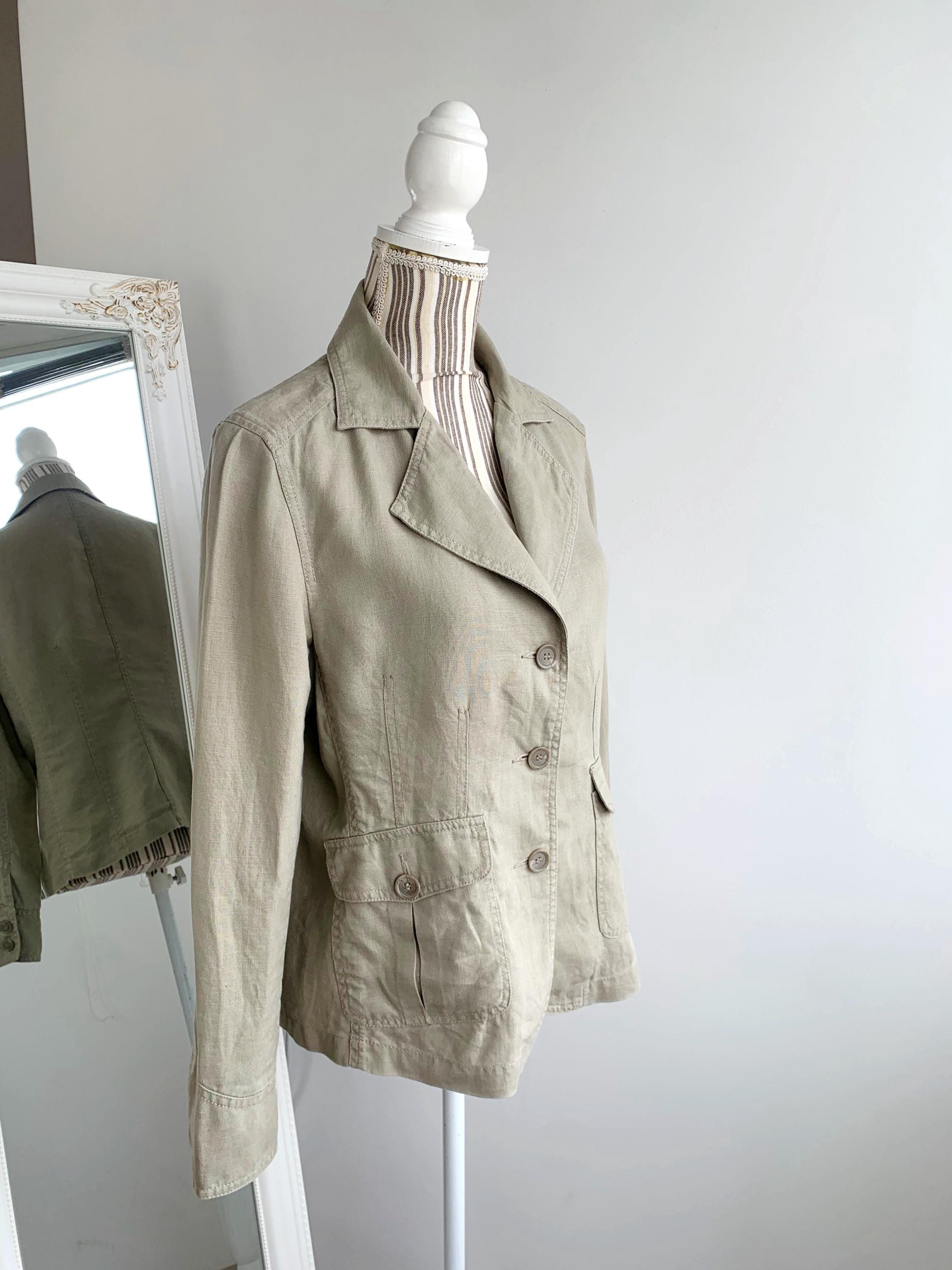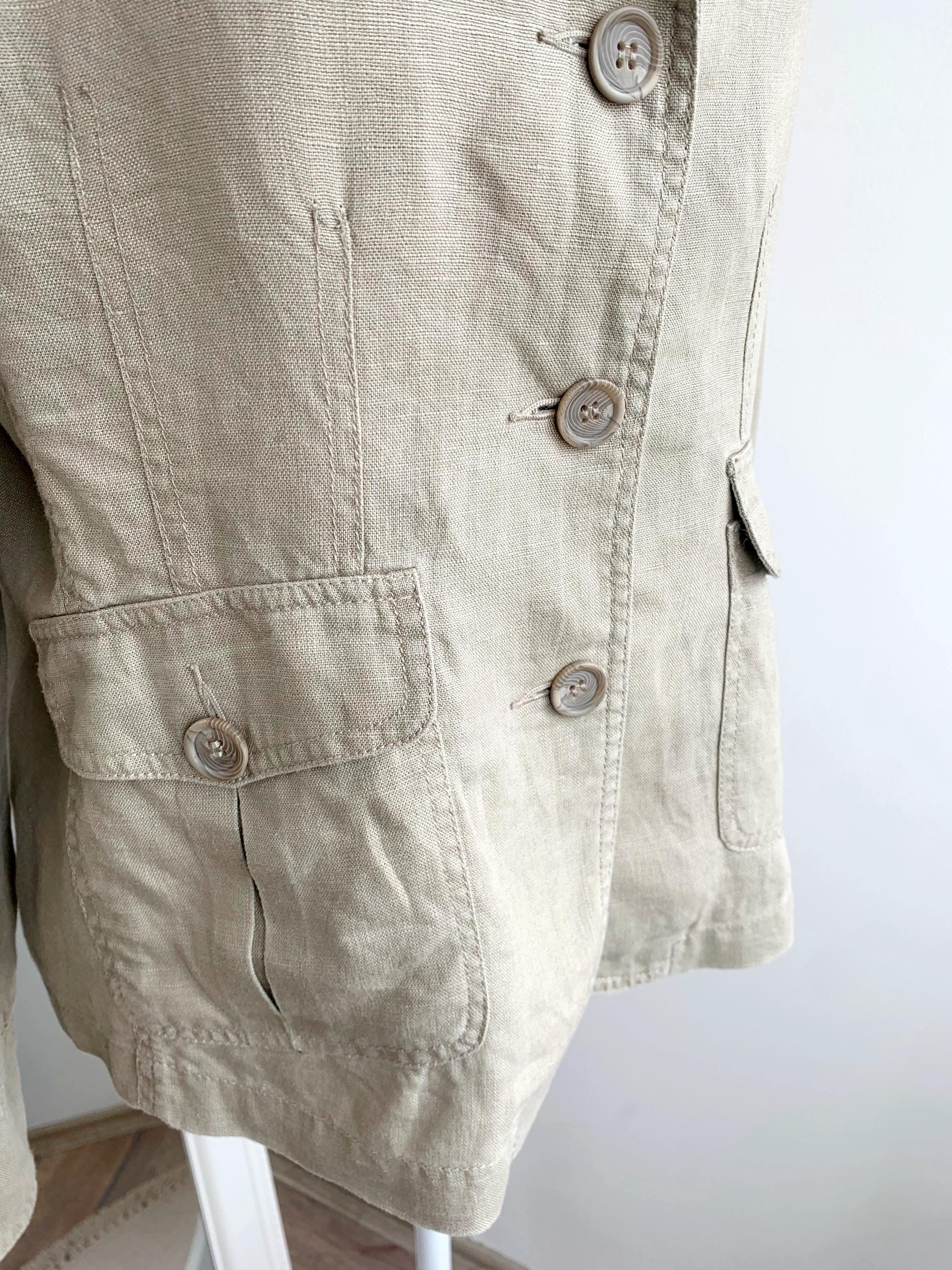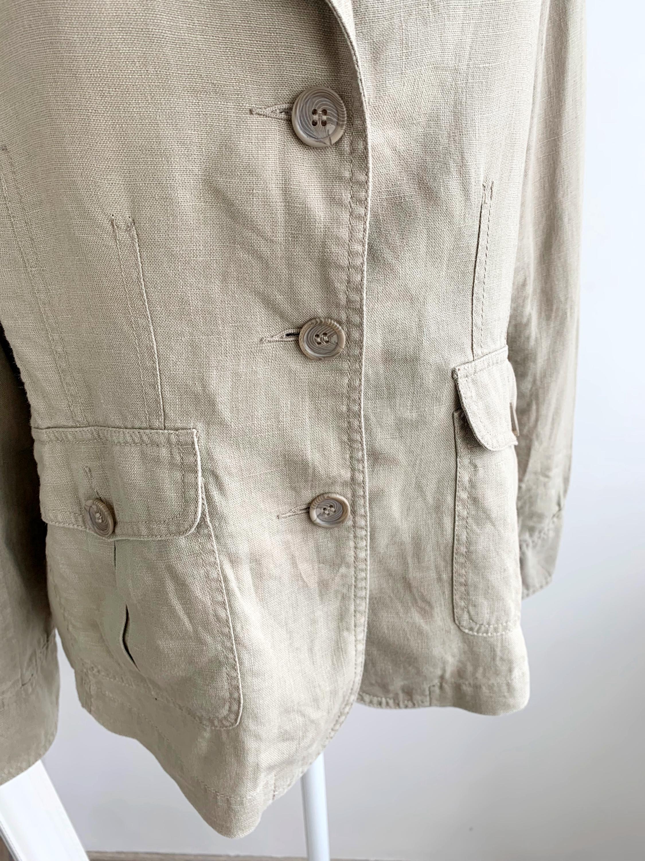 This is a beautiful vintage 90s linen blazer for women with long sleeves, three button closure with v neck and pockets. This preppy casual officewear linen coat is made of 100% linen fabric. This spring summer linen coat is lightweight and breathable with no lining underneath. This casual outerwear is in oatmeal beige color. It has two side pockets. Sustainable piece of linen clothing that you can enjoy. This linen blazer is by the brand Casa Blanca, the size marked is 40 which fits like size M/L. Please check the measurements below