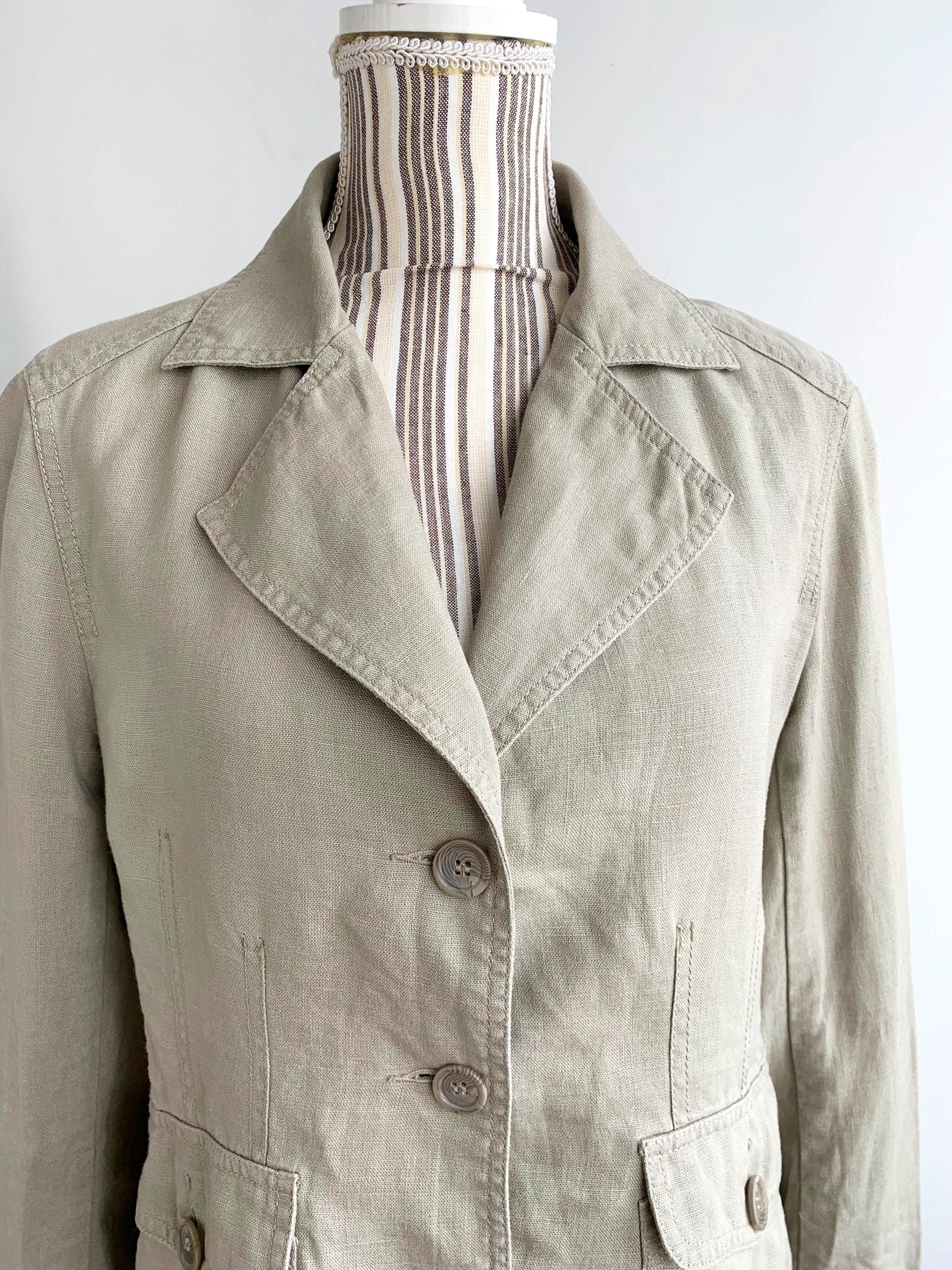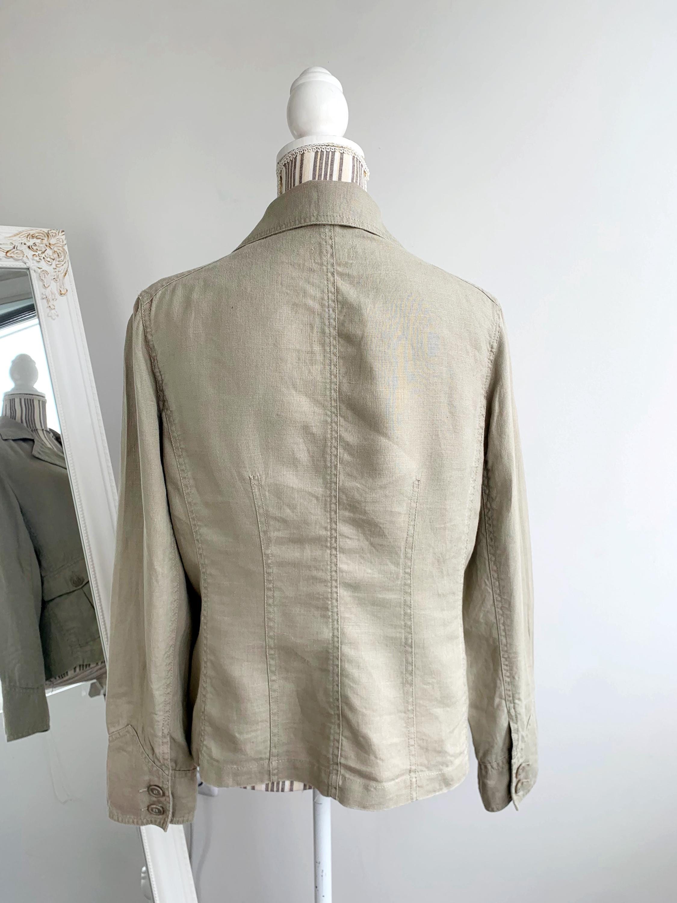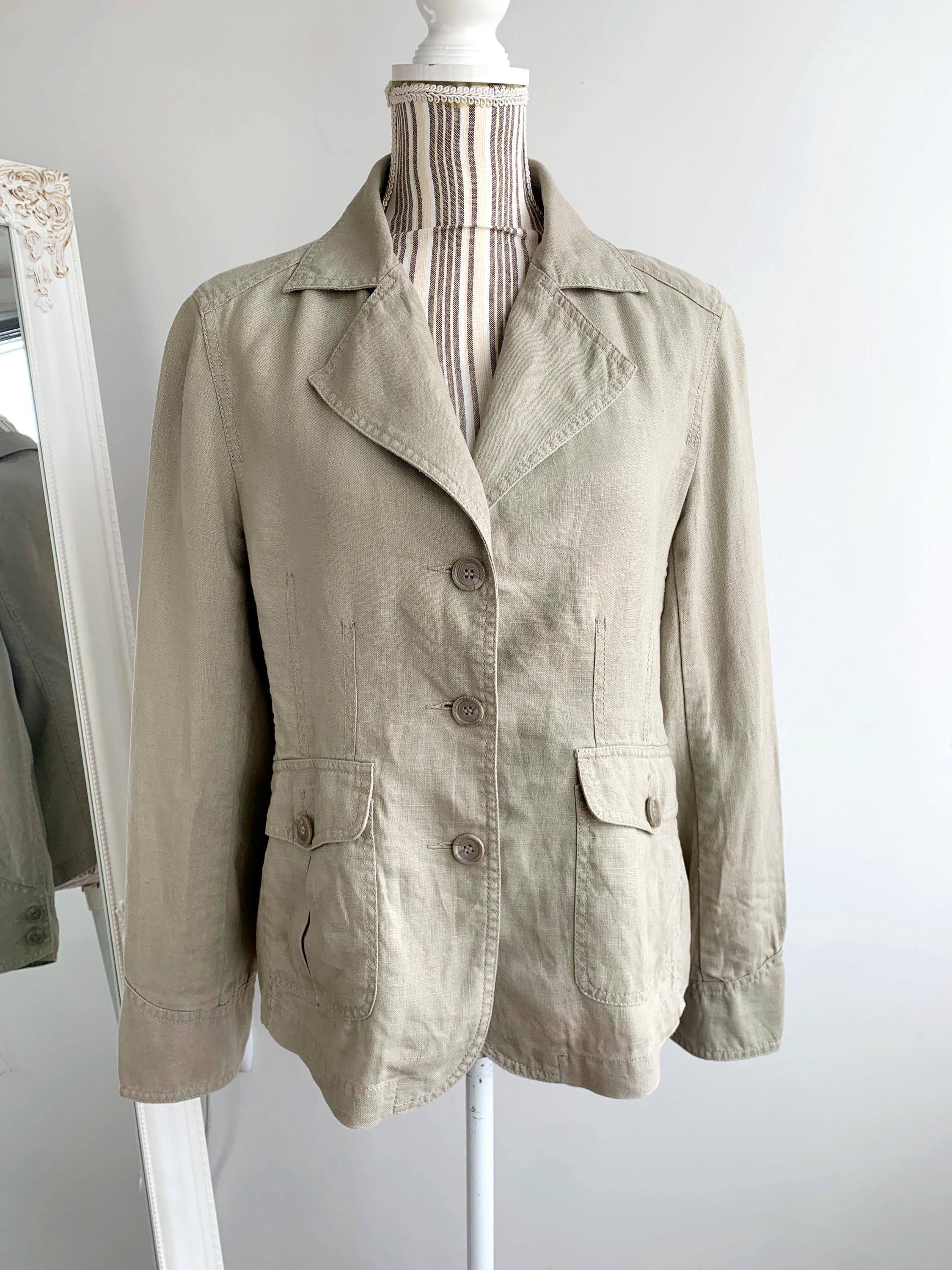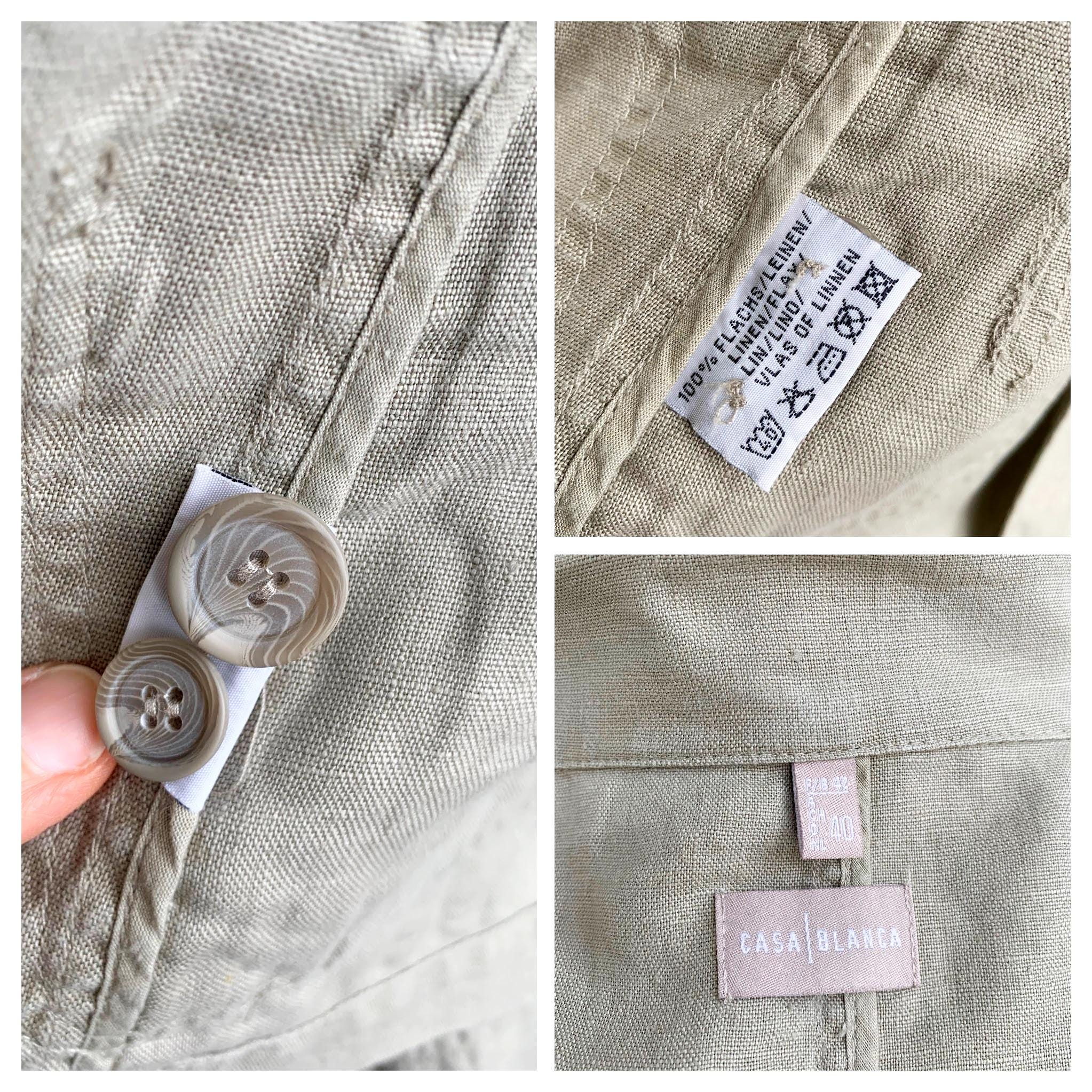 This is a beautiful vintage 90s linen blazer for women with long sleeves, three button closure with v neck and pockets. This preppy casual officewear linen coat is made of 100% linen fabric. This spring summer linen coat is lightweight and breathable with no lining underneath. This casual outerwear is in oatmeal beige color. It has two side pockets. Sustainable piece of linen clothing that you can enjoy. This linen blazer is by the brand Casa Blanca, the size marked is 40 which fits like size M/L. Please check the measurements below