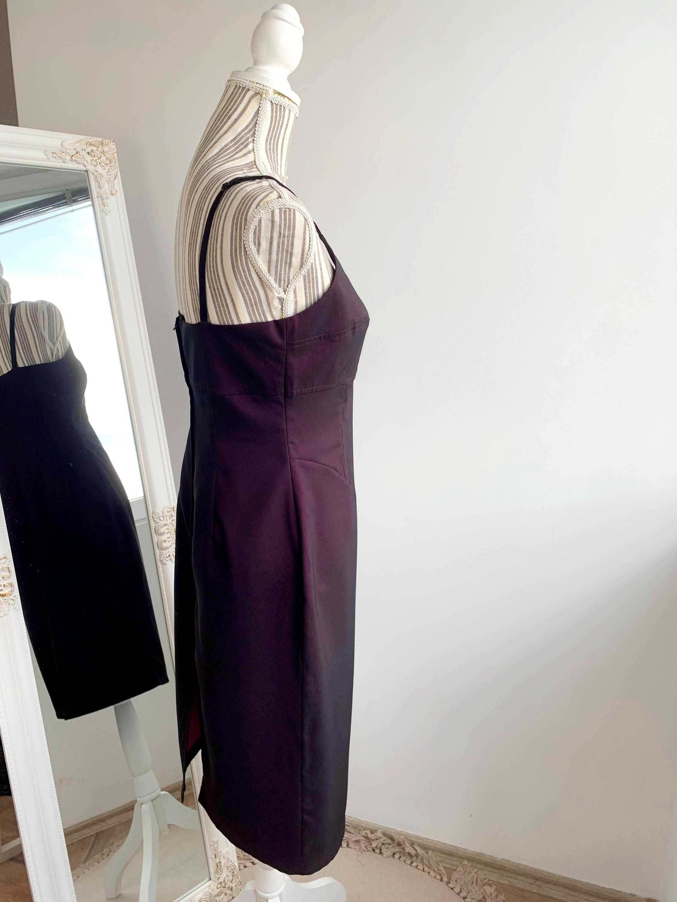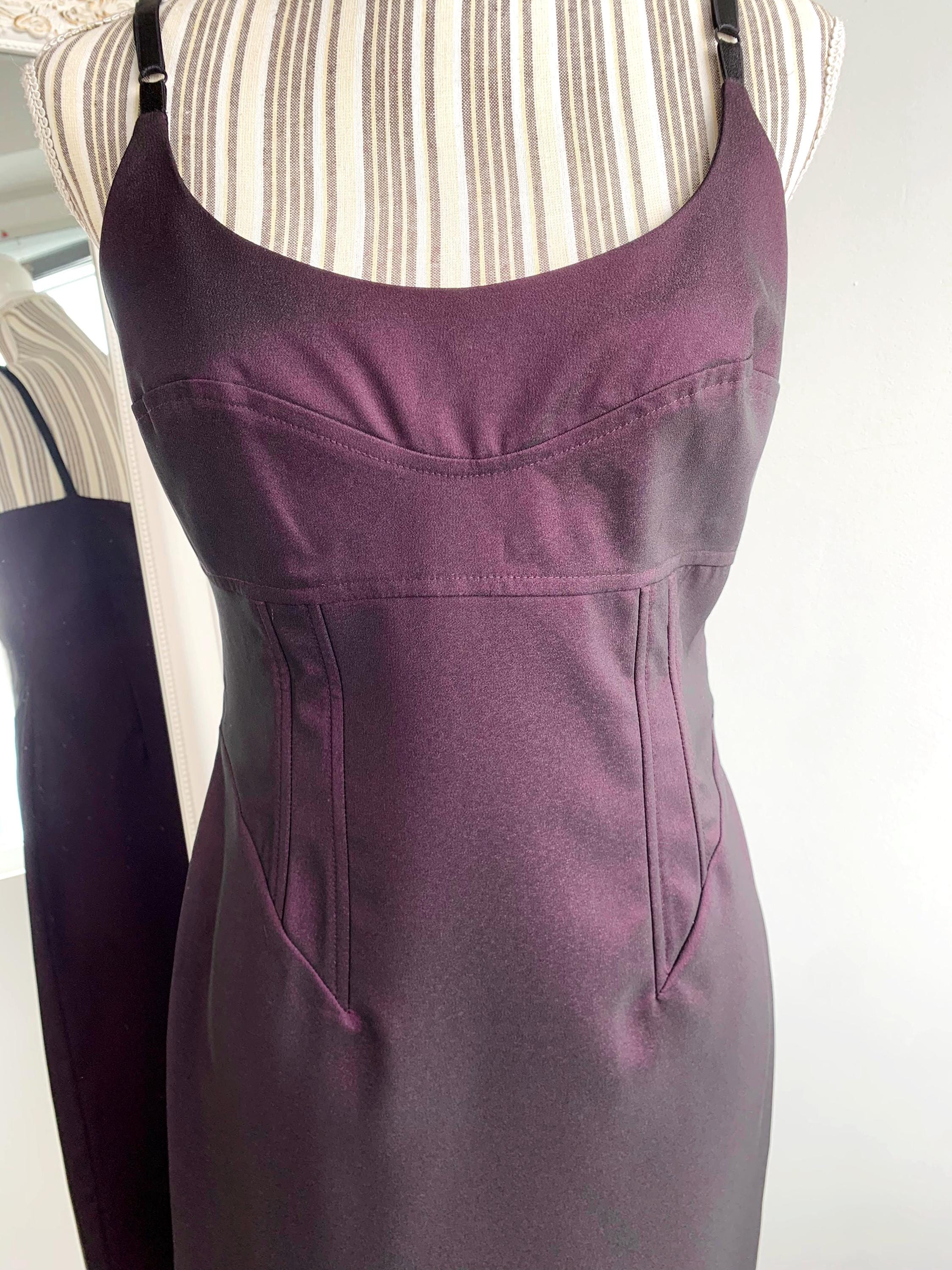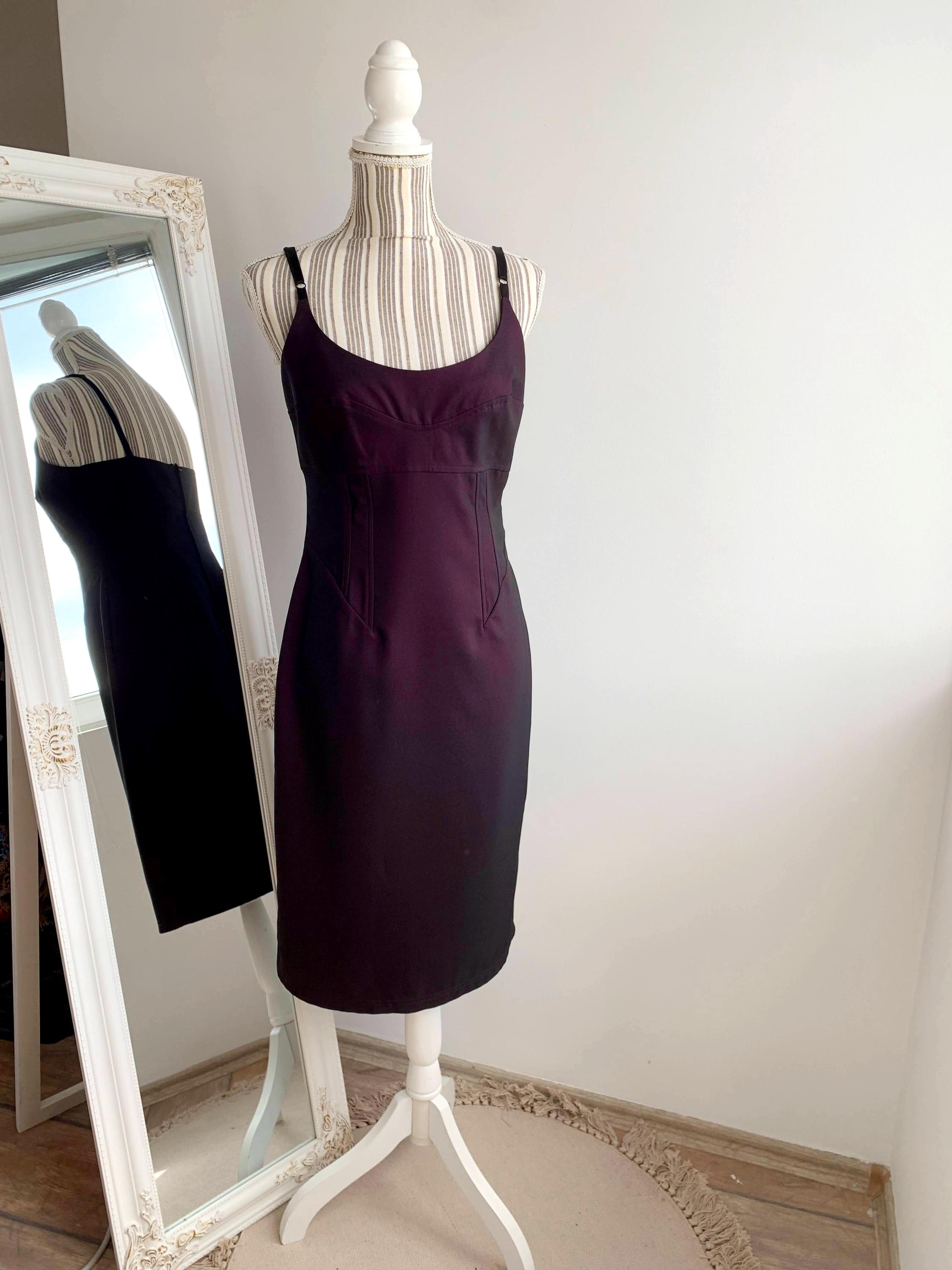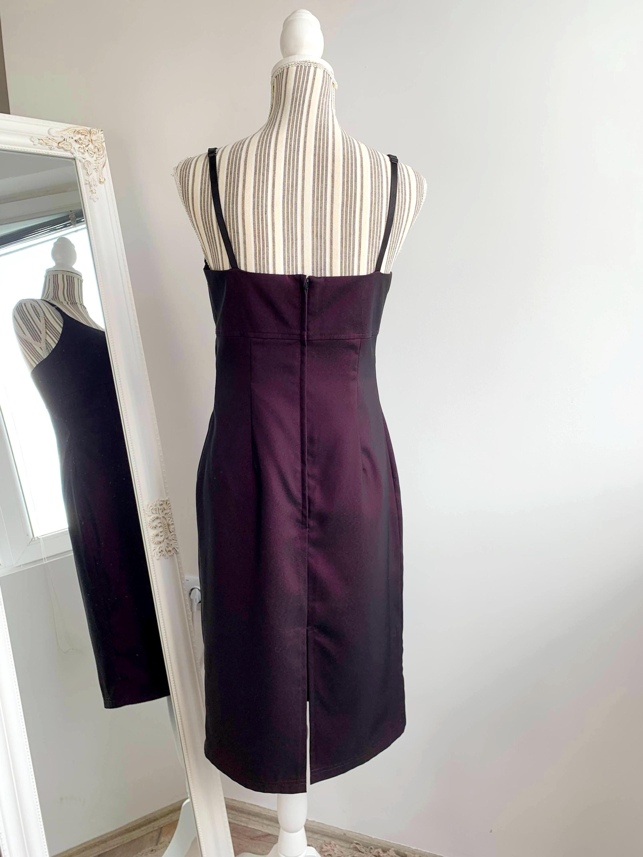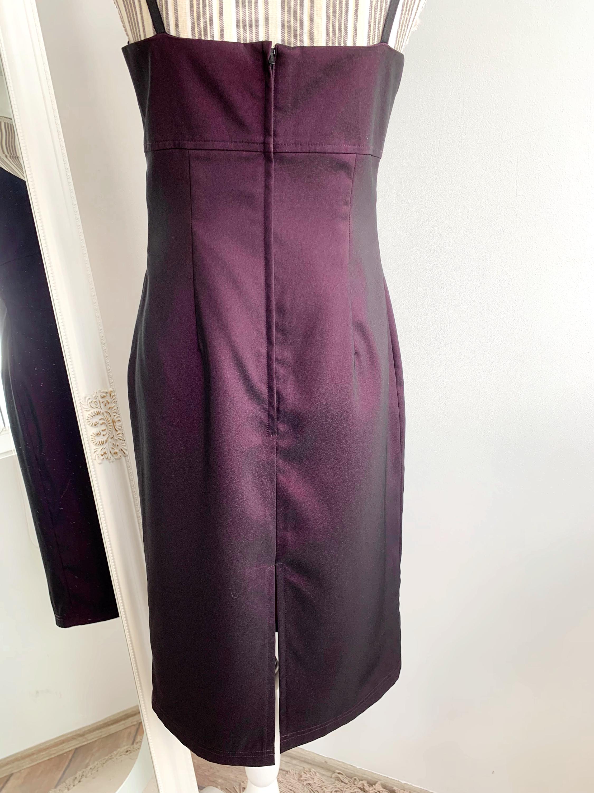 This is a beautiful vintage 90s Bla- Bla eggplant purple shiny stretchy bodycon dress with spaghetti straps, open back with zip closure and back slit. This classic elegant prom dress beautifully follows your curves. Perfect for formal events and cocktails, date nights and special ocasions. THe size marked is 2, fits like M.