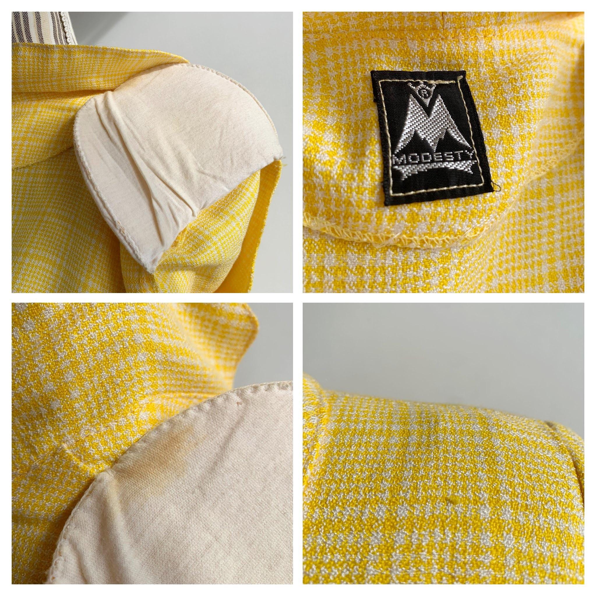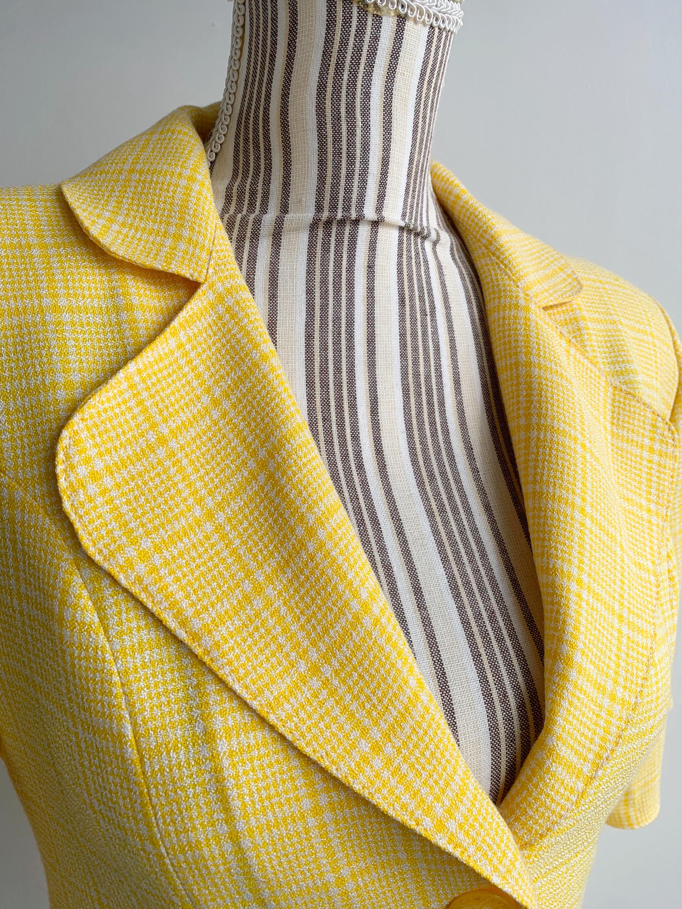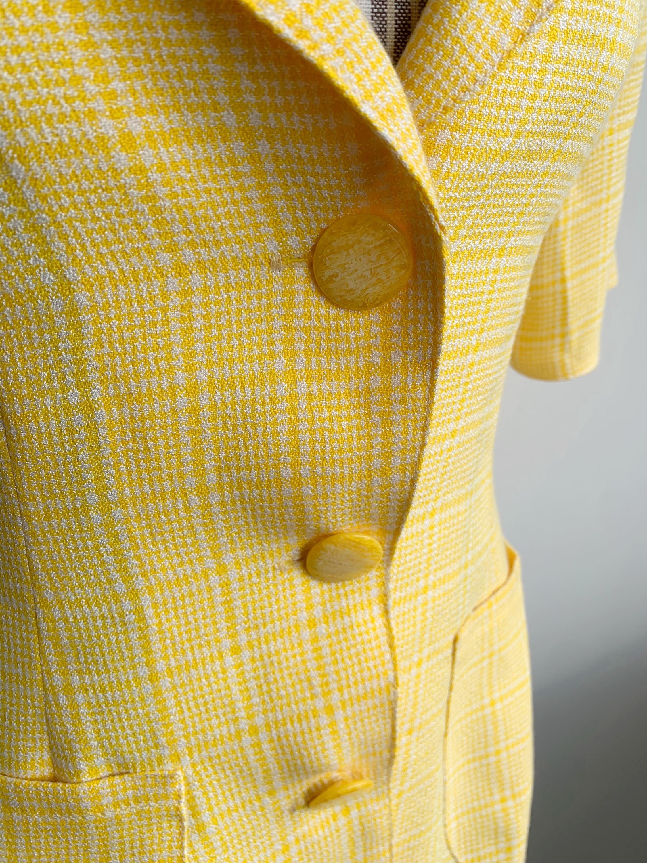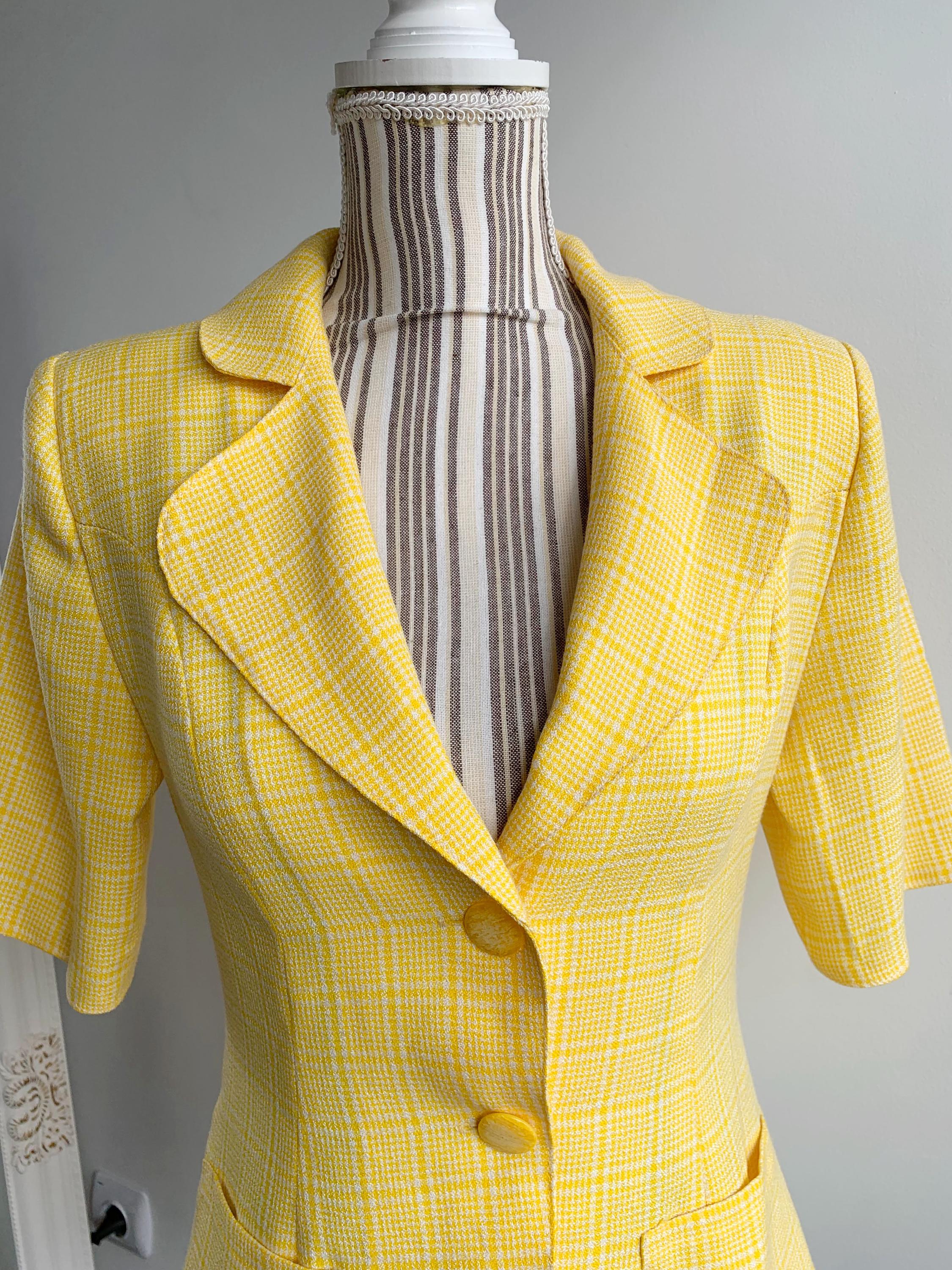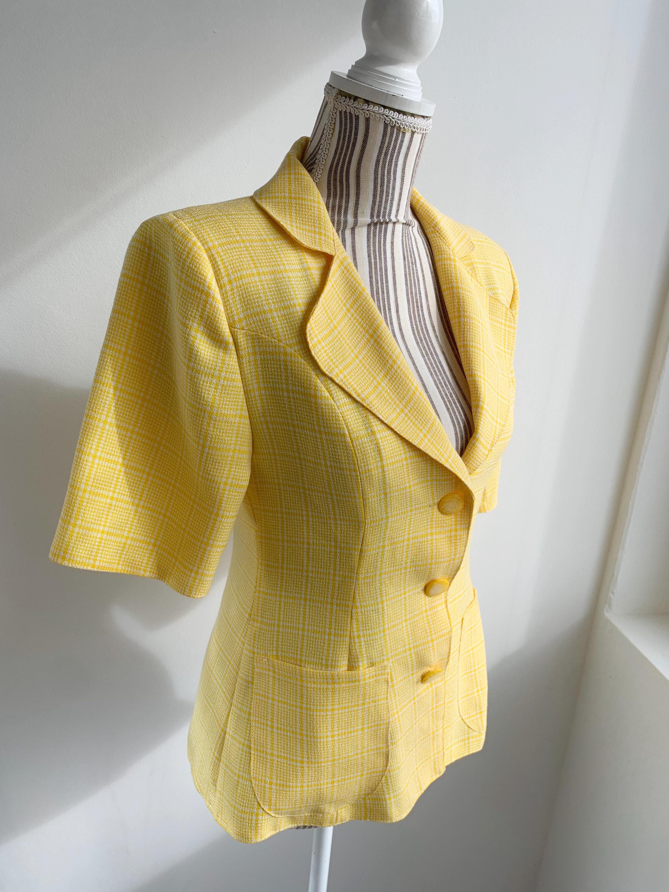 Vintage 90s checkered yellow white short sleeve button up blazer for women made of boucle fabric with button front closure and cute retro style collar. This vintage button up jacket has two pockets, it is perfect for the spring summer season. There is no lining underneath, it has shoulder pads. No size is marked fits like XS/ S.