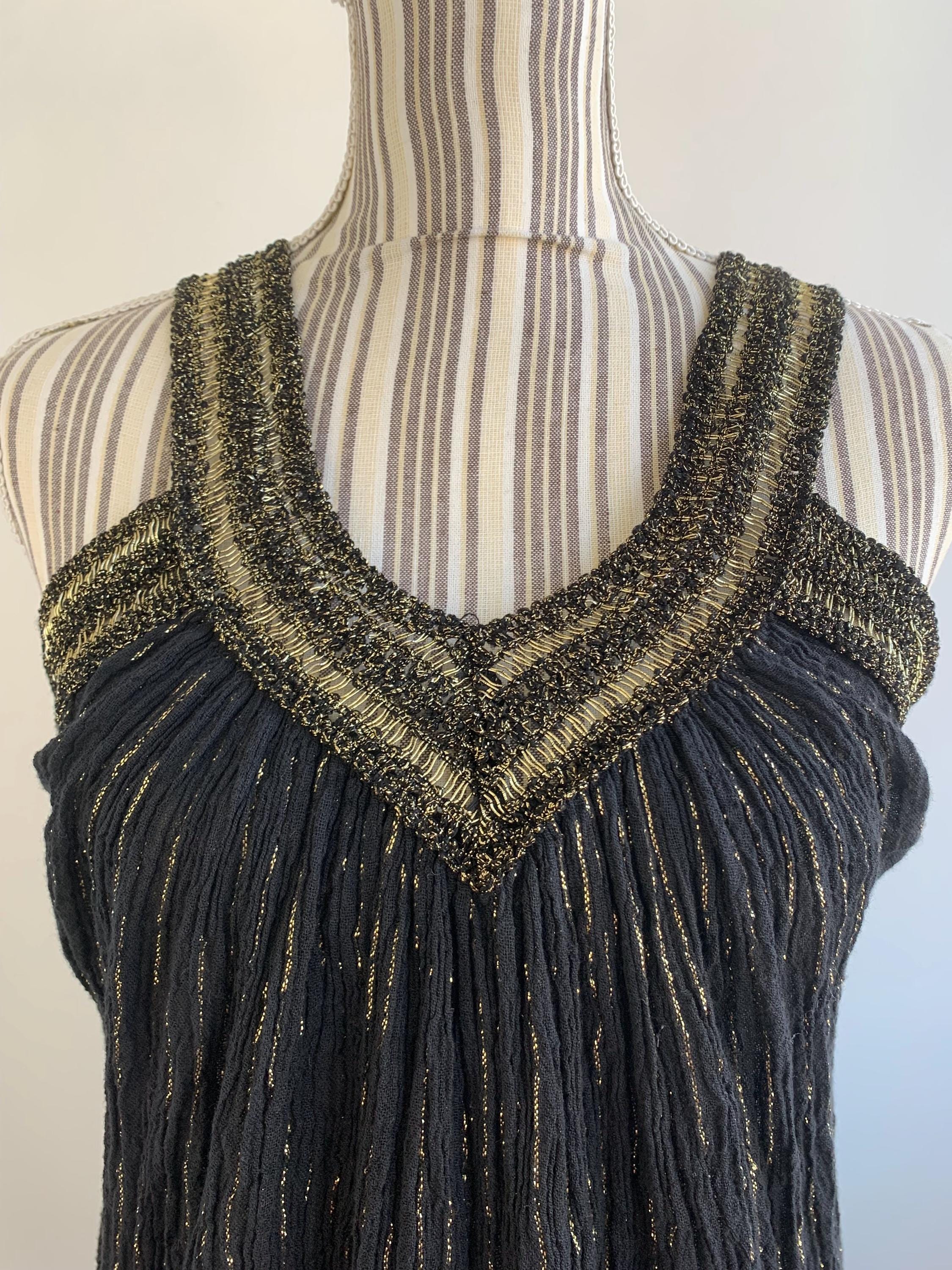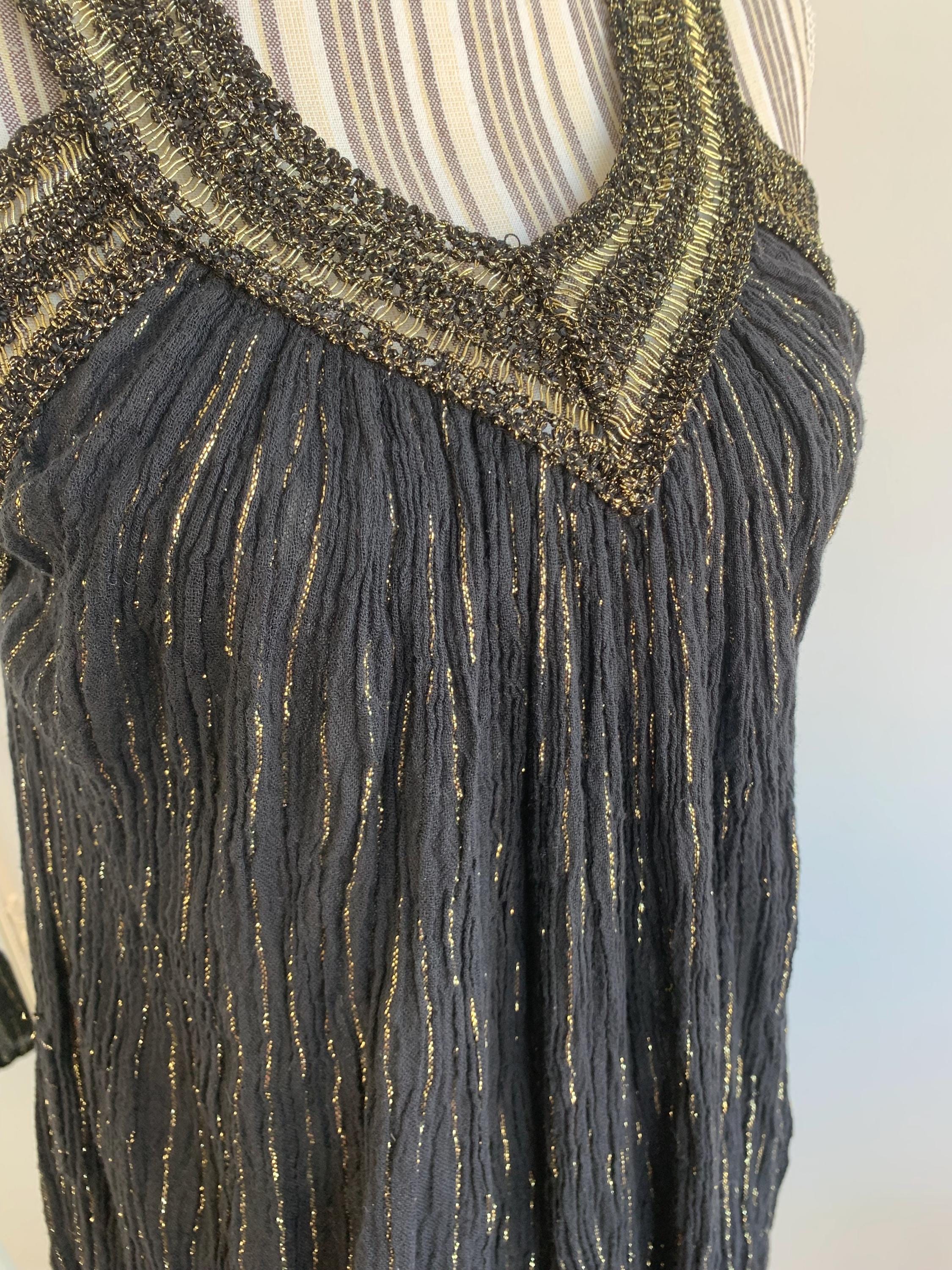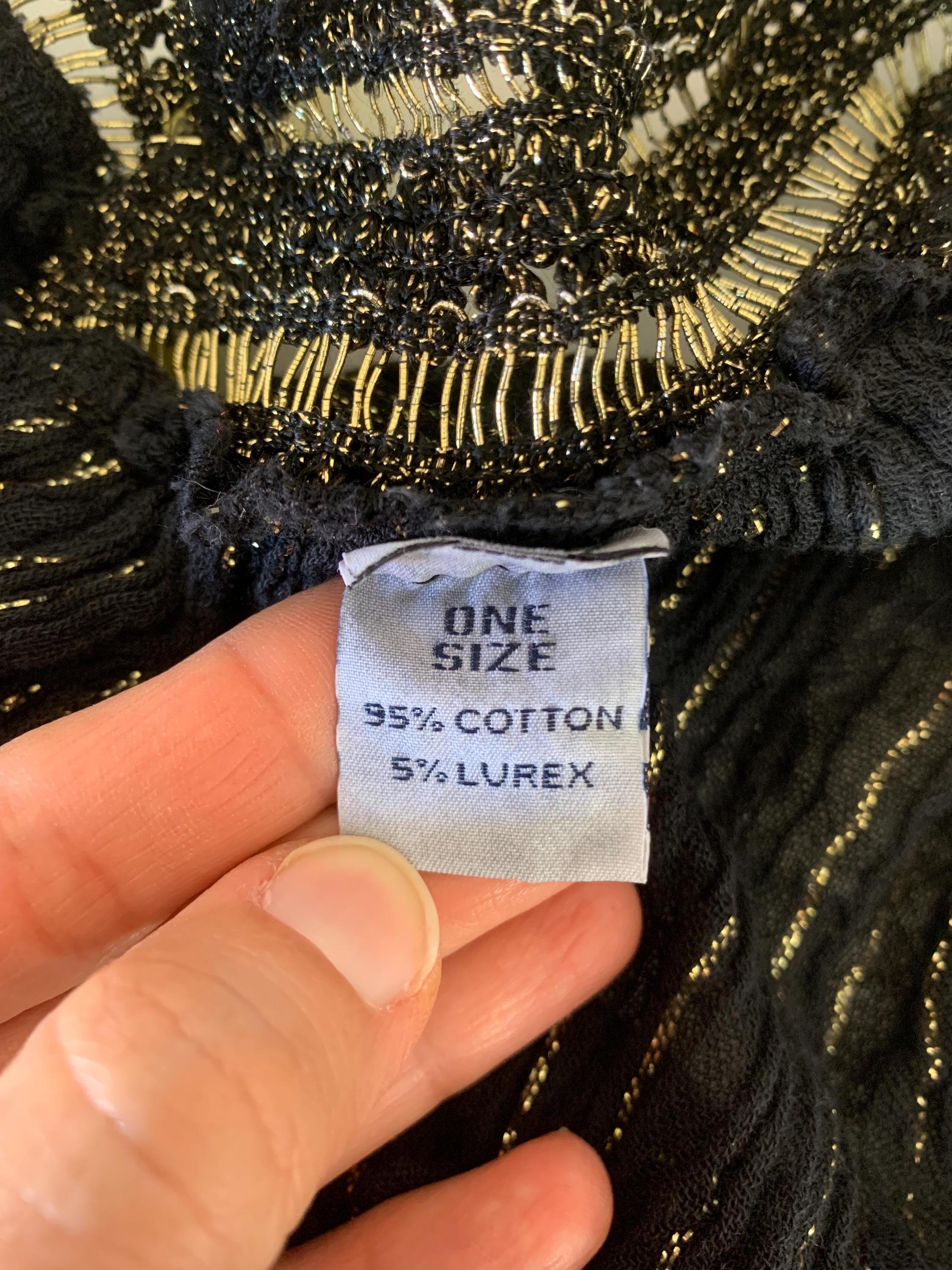 This is a beautiful black and gold cotton gauze dress with V neckline and lurex gold tone lame accents. This sleeves gauze dress dates back to the 90s. This relaxed summer muslin dress flared A line silhouette which is awesome for the summer. Amazing day to night sheer lightweight gauze dress perfect for the beach or summer cocktail parties. The size marked on the dress is ONE SIZE, please check the measurements below.