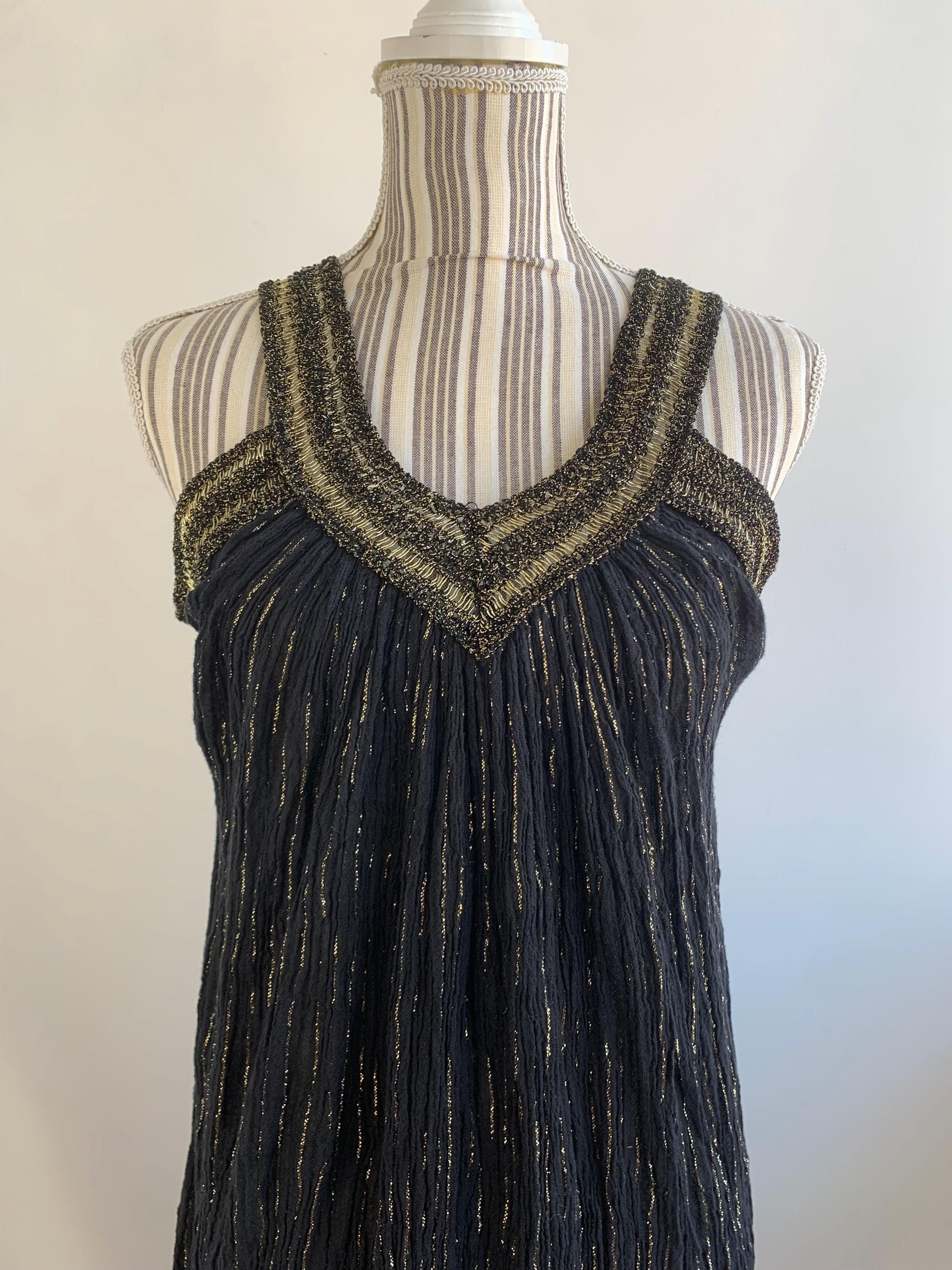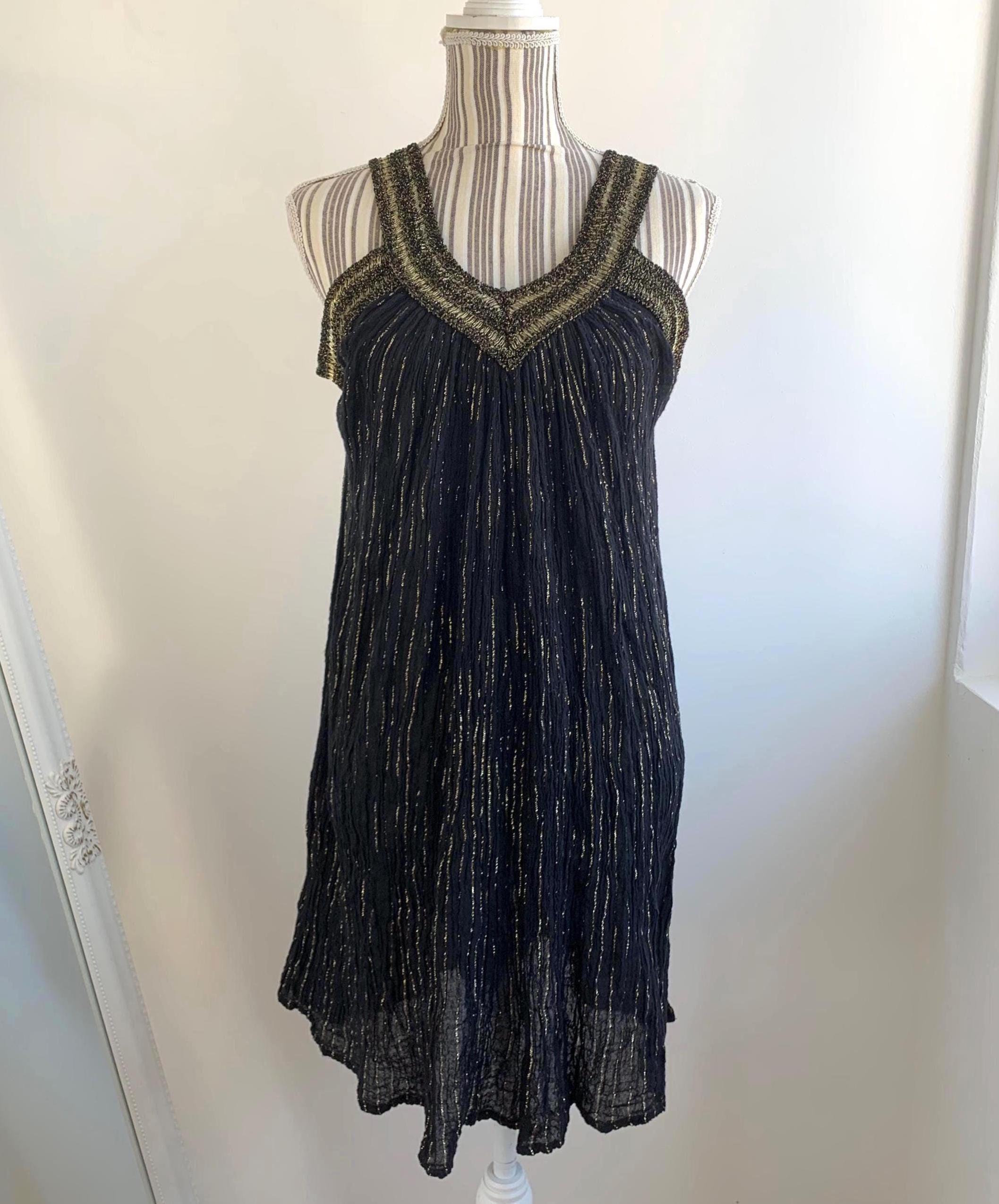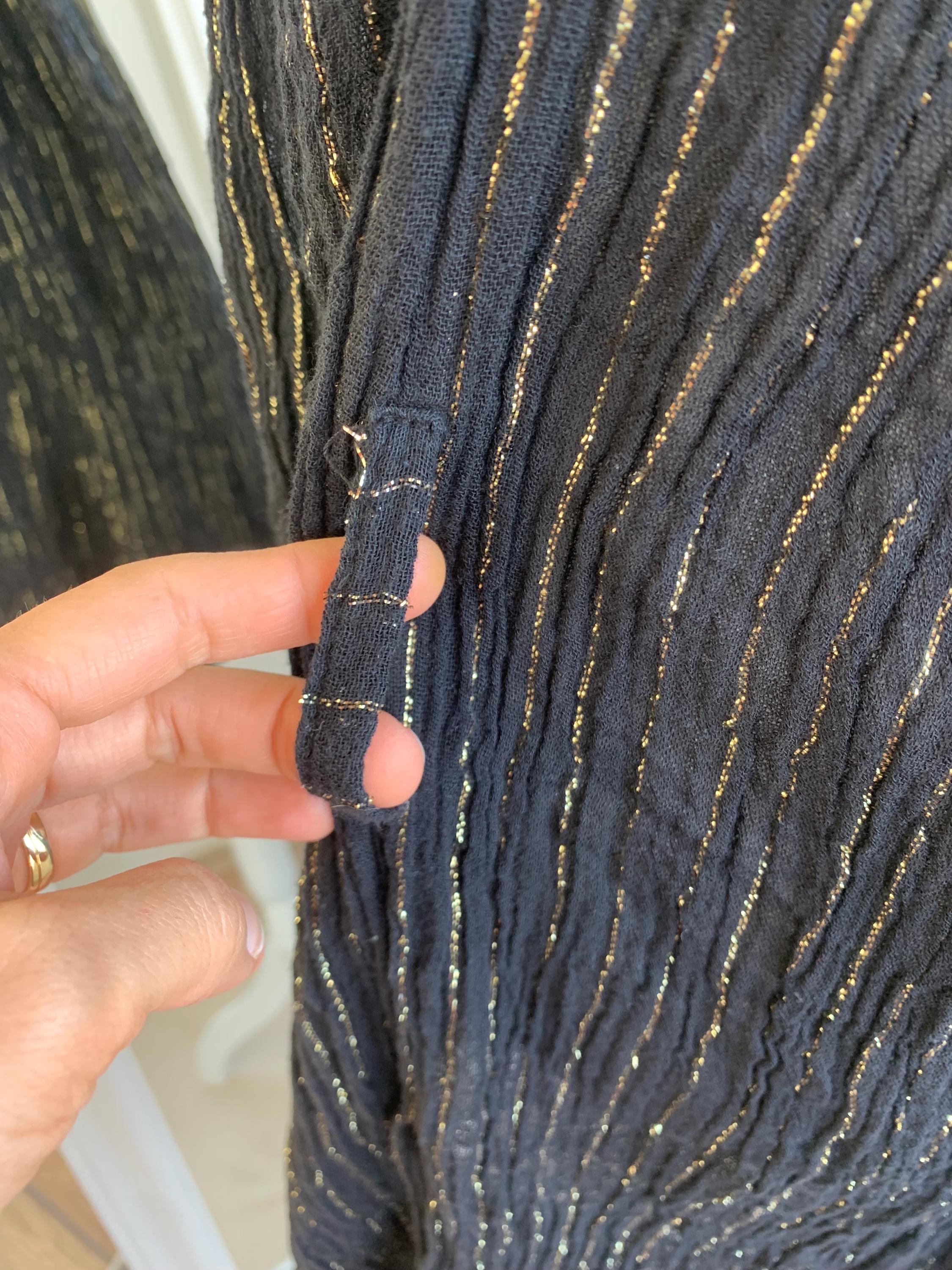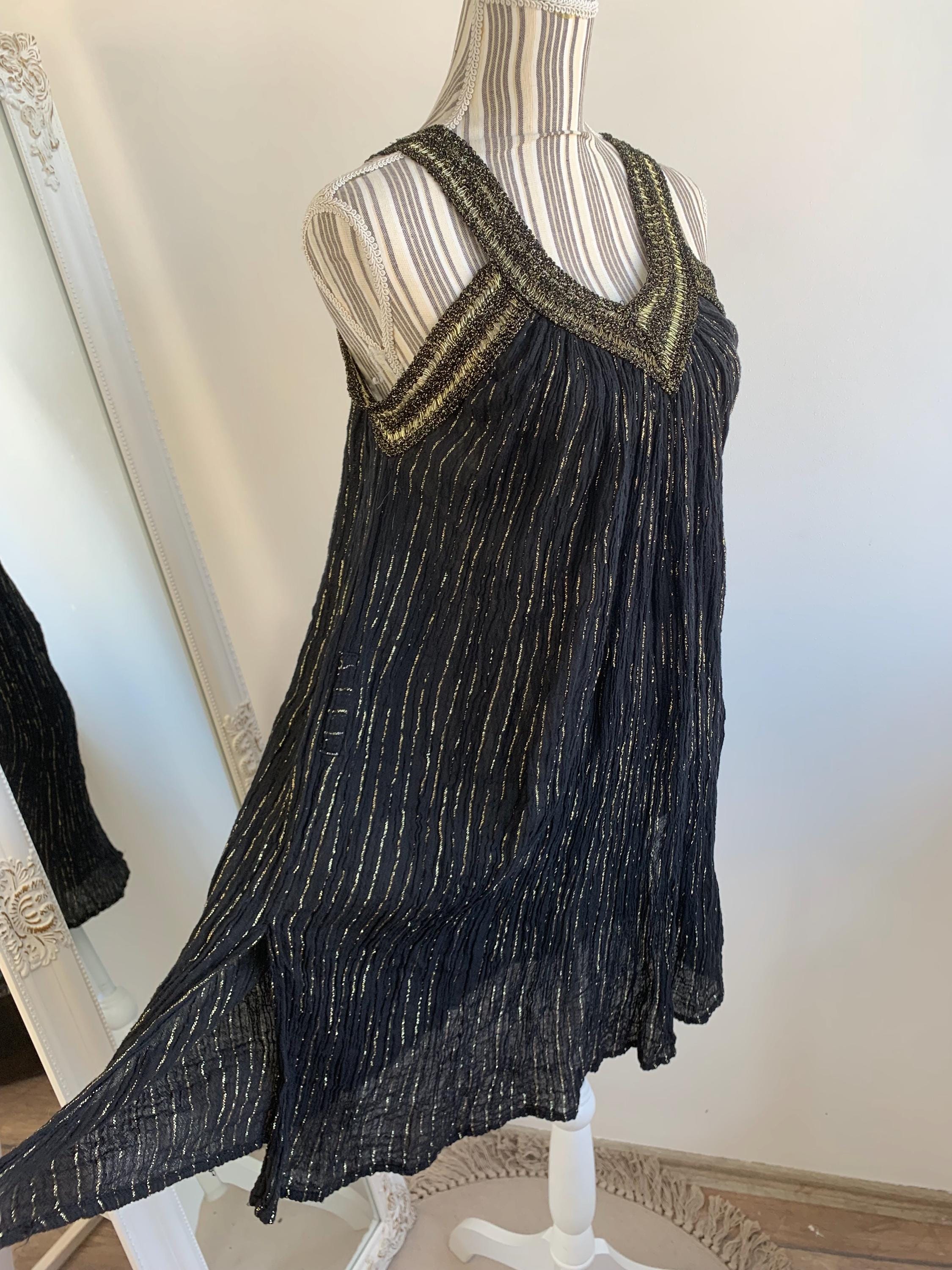 This is a beautiful black and gold cotton gauze dress with V neckline and lurex gold tone lame accents. This sleeves gauze dress dates back to the 90s. This relaxed summer muslin dress flared A line silhouette which is awesome for the summer. Amazing day to night sheer lightweight gauze dress perfect for the beach or summer cocktail parties. The size marked on the dress is ONE SIZE, please check the measurements below.