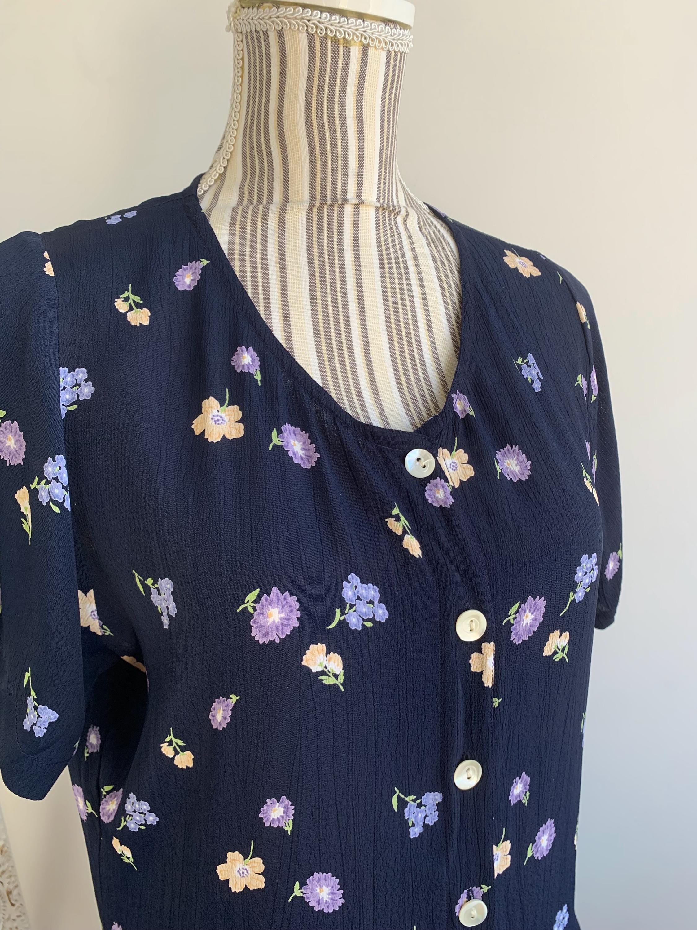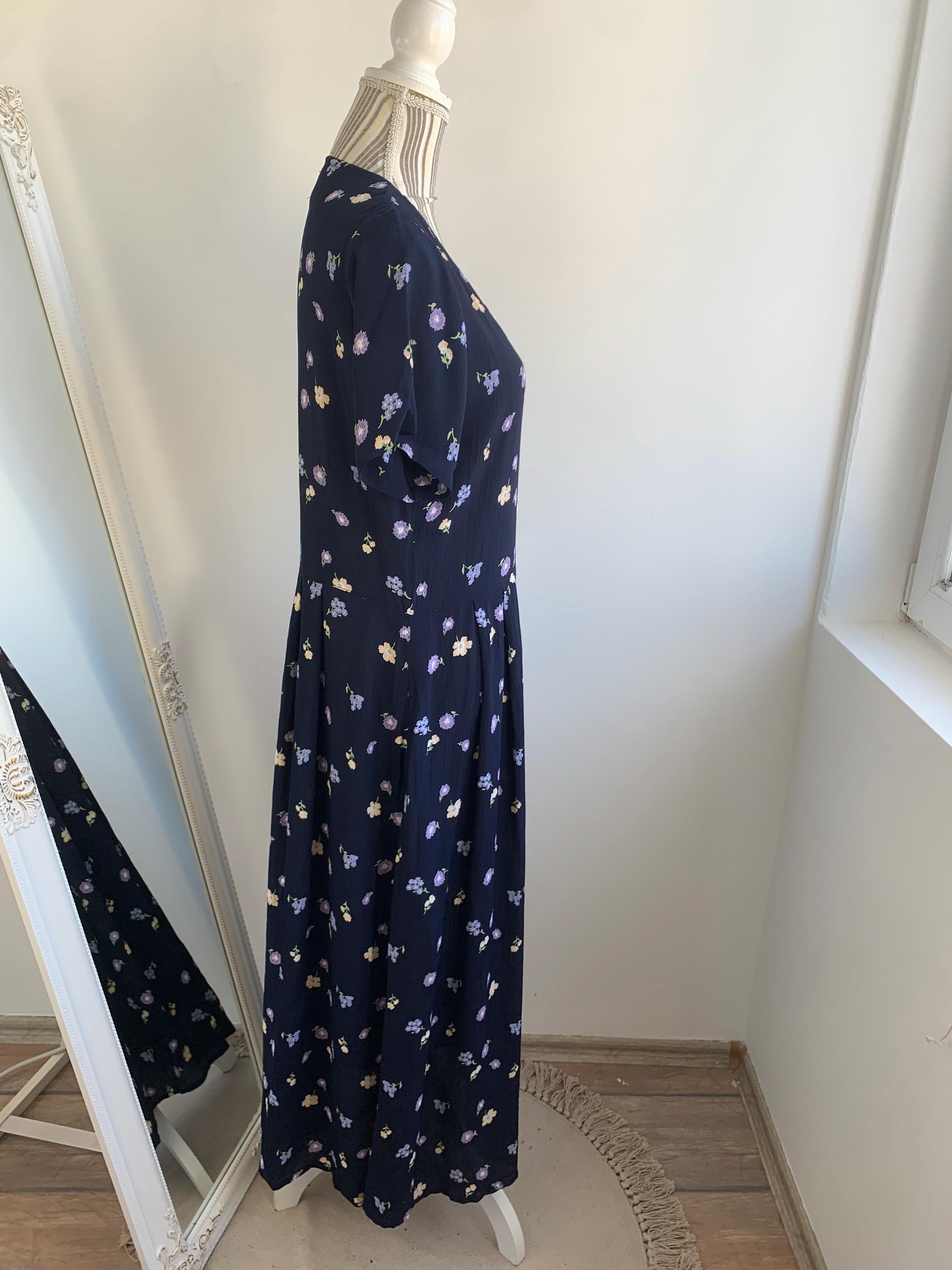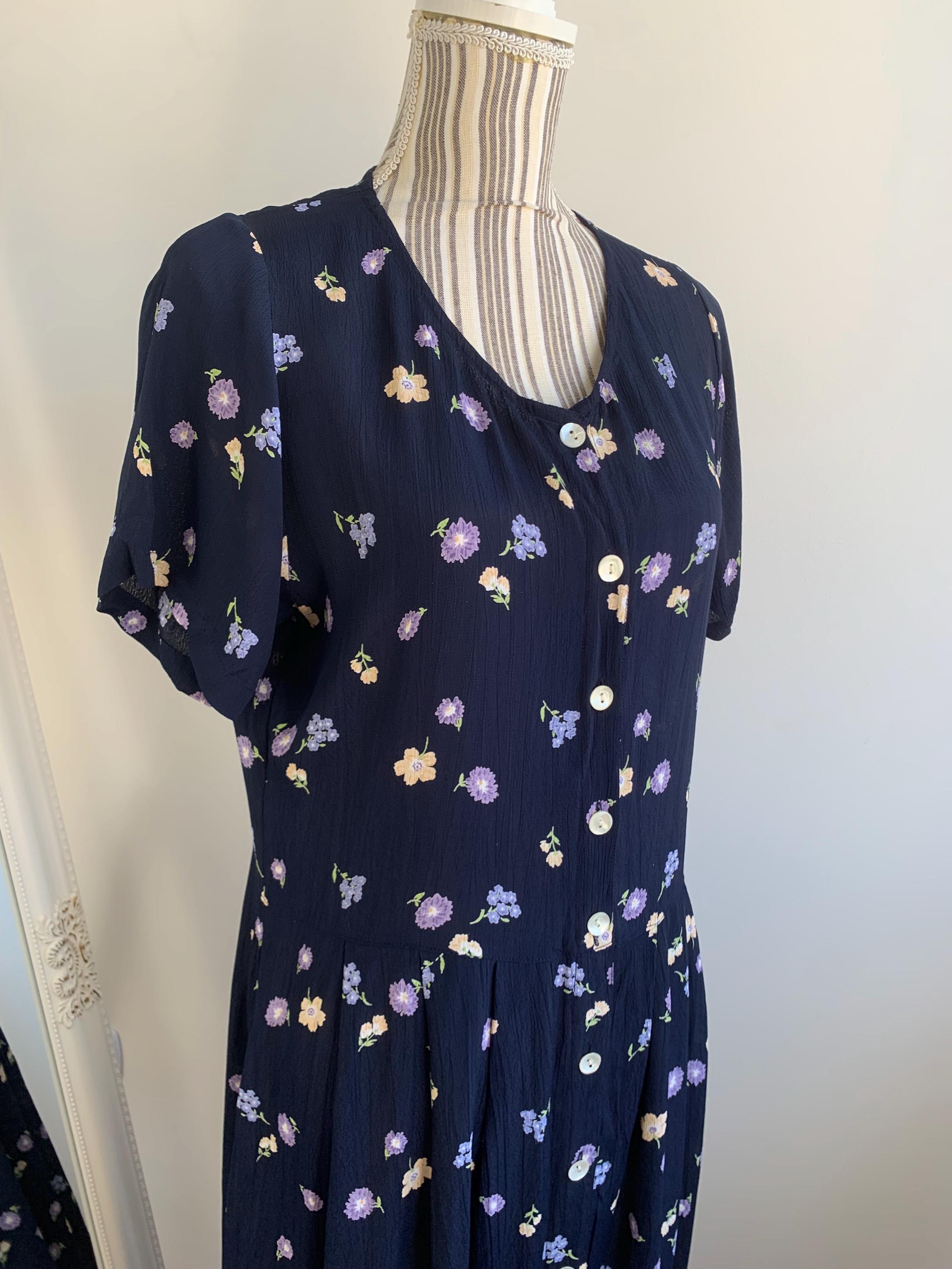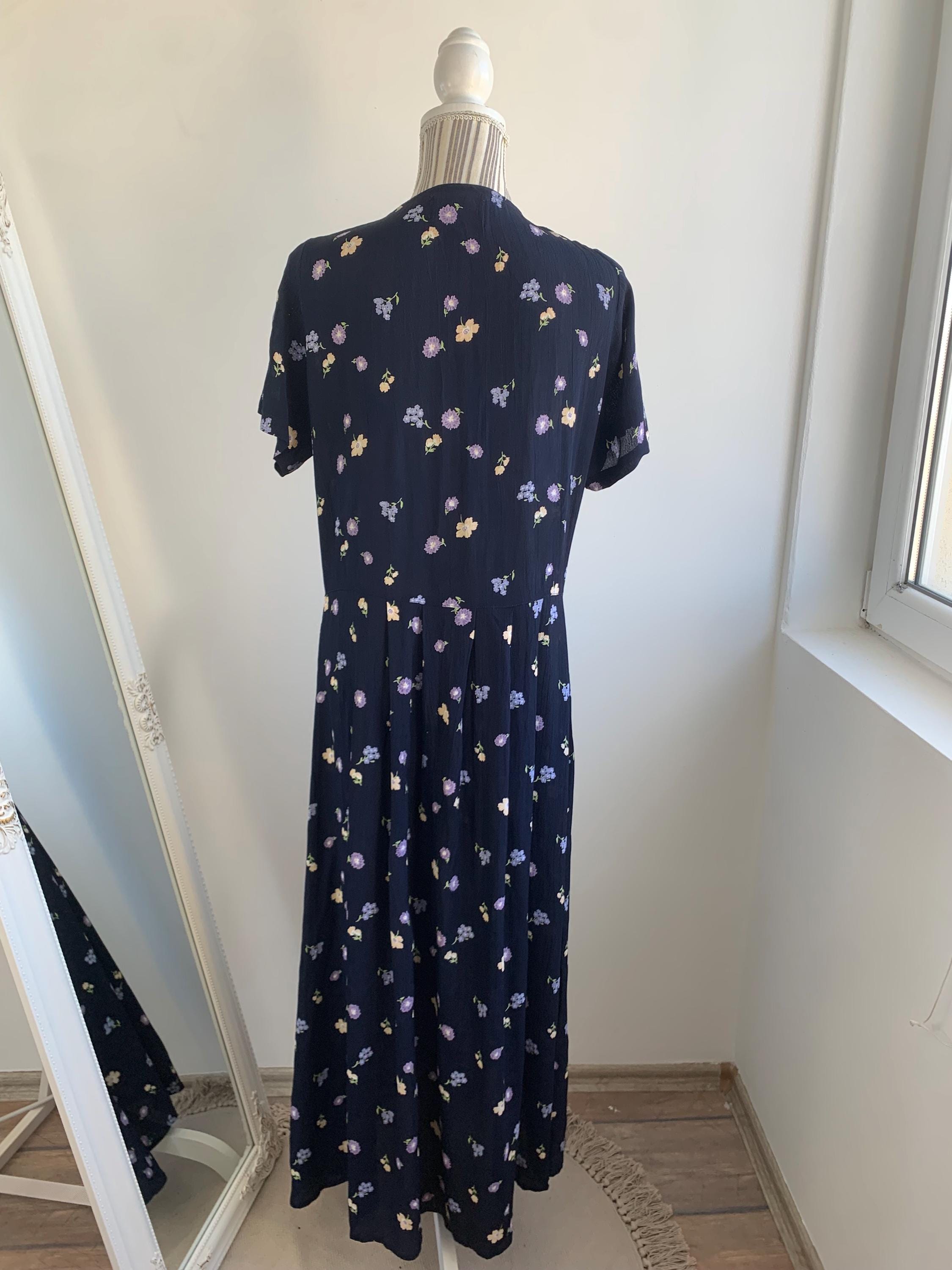 This is a wonderful vintage boho maxi dress which dates back to the 90s. This 90s maxi dress is made of 100% viscose fabric in beautiful navy blue color with lovely floral print with tiny camel yellow, purple and lavender flowers. This sun dress has a loose fit oversized silhouette with button front closure and pleats at the skirt. This 90s grunge dress has a scoop neck and short sleeves. This button front dress is by the brand Divino Collection. The size marked on the label is S, it fits like oversized S or M. Please check the measurements below.