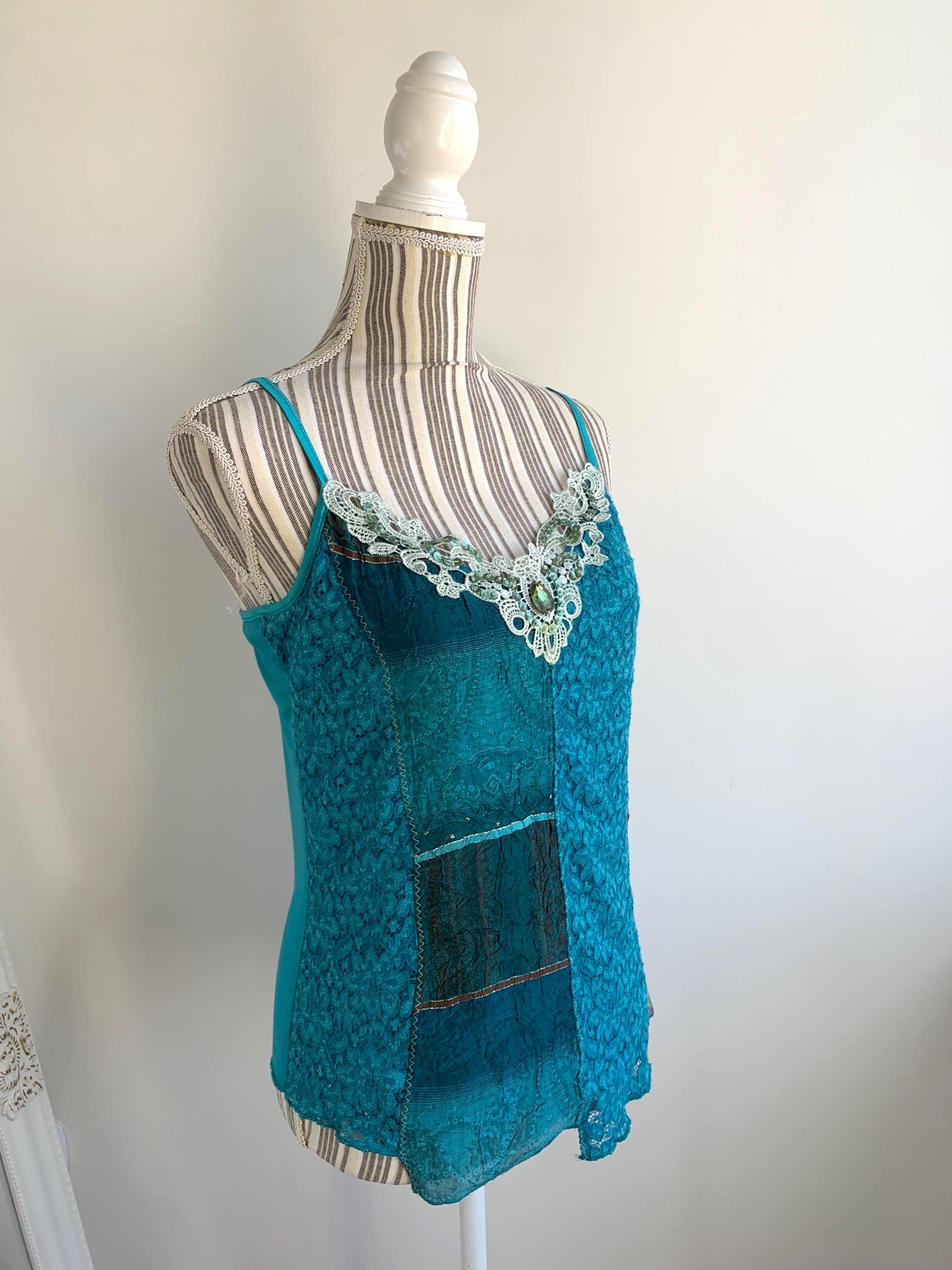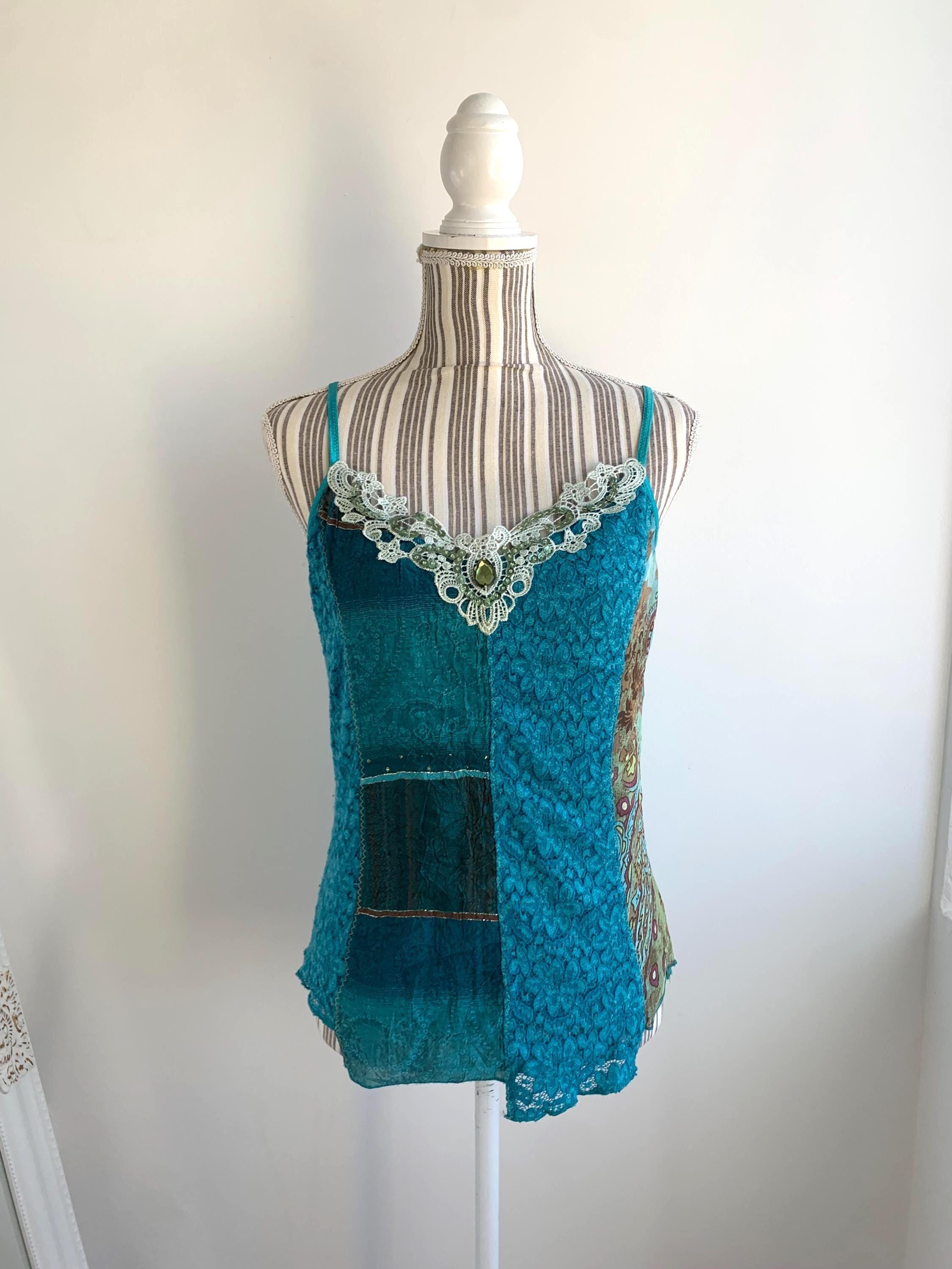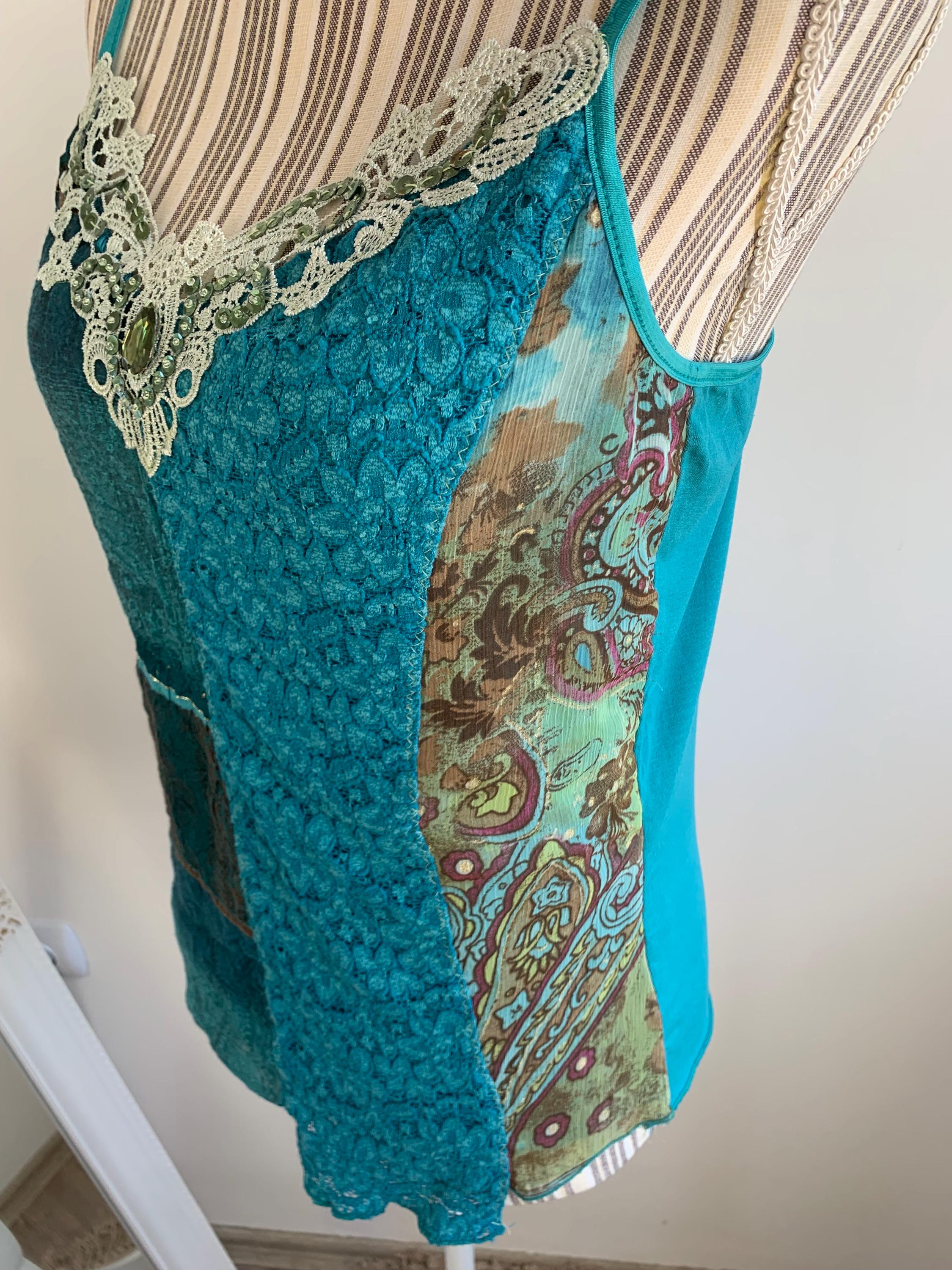 This is a vintage bohemian lace tank top for women size M. This boho grunge top is made of patches of different fabric - lace, satin, jersey and mesh tulle. This paisley lacey floral tank top lovely lace decoration at the front, jewelled and sequin embellished. This cute Y2K top has solid jersey back. The size marked is M. Please check the measurements below
