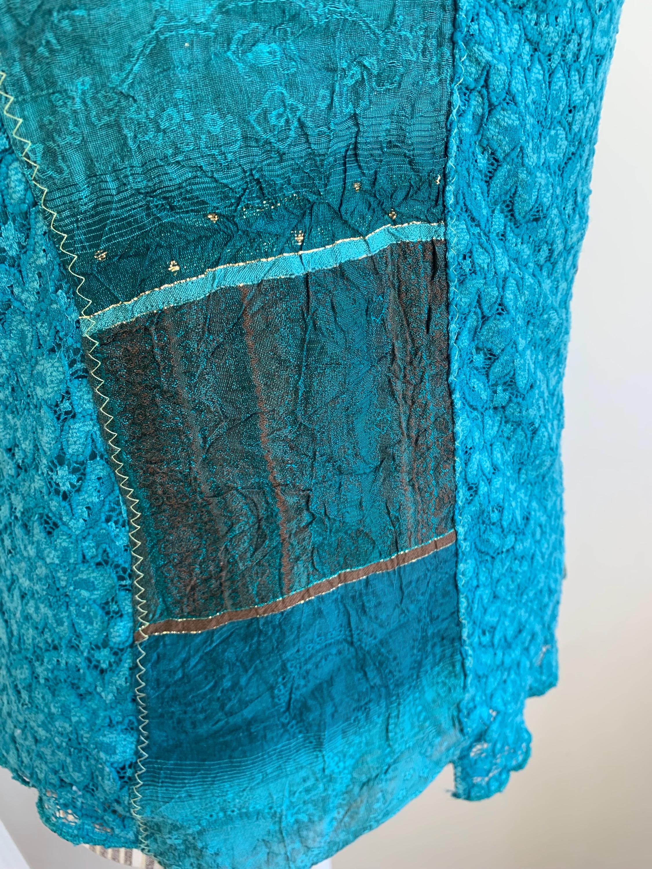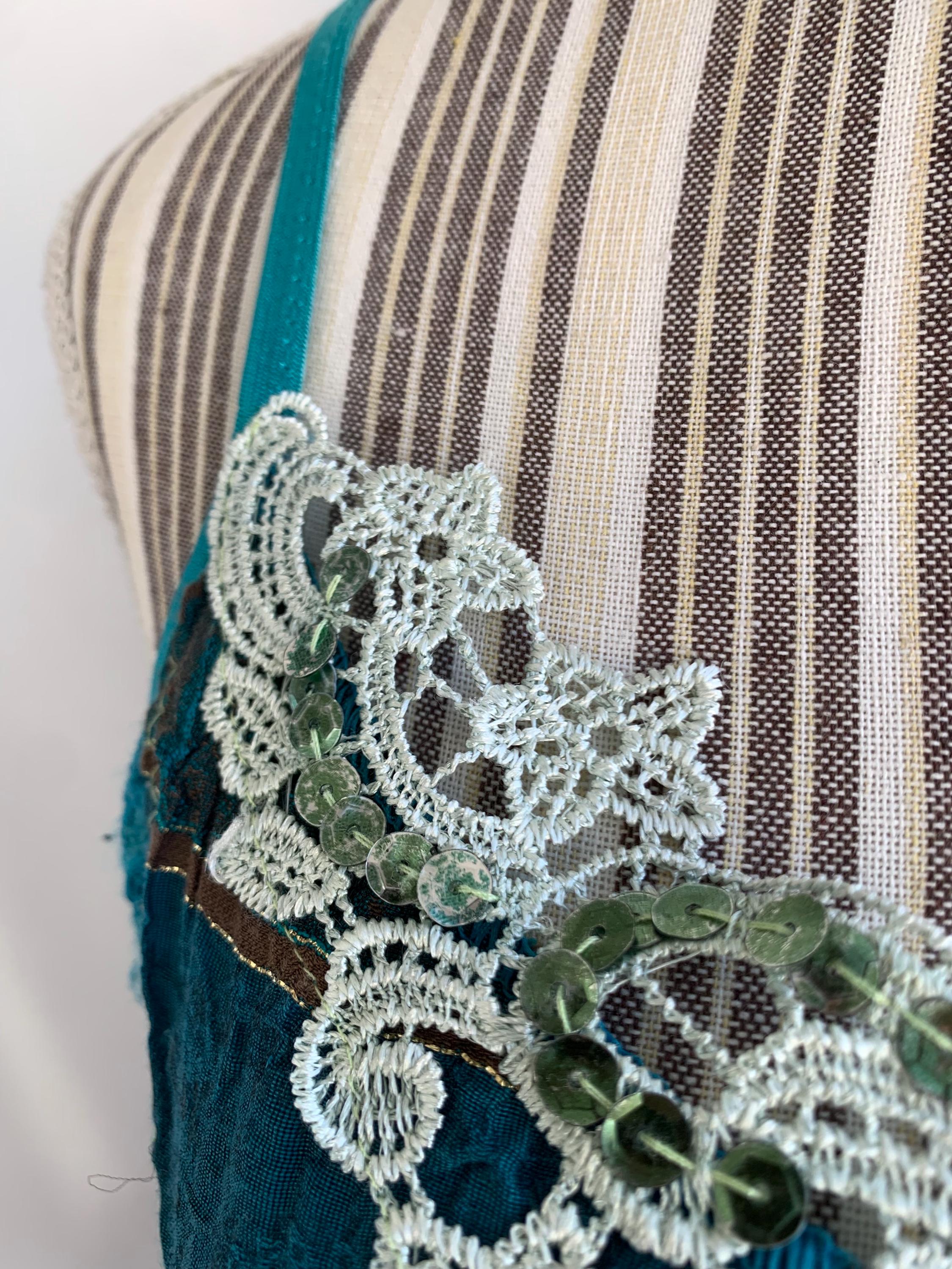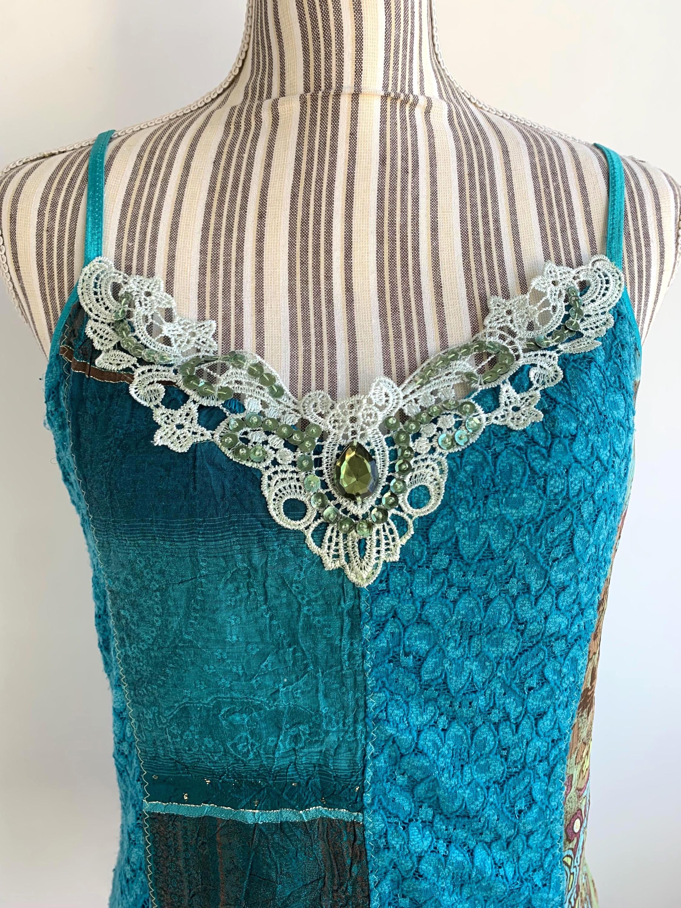 This is a vintage bohemian lace tank top for women size M. This boho grunge top is made of patches of different fabric - lace, satin, jersey and mesh tulle. This paisley lacey floral tank top lovely lace decoration at the front, jewelled and sequin embellished. This cute Y2K top has solid jersey back. The size marked is M. Please check the measurements below