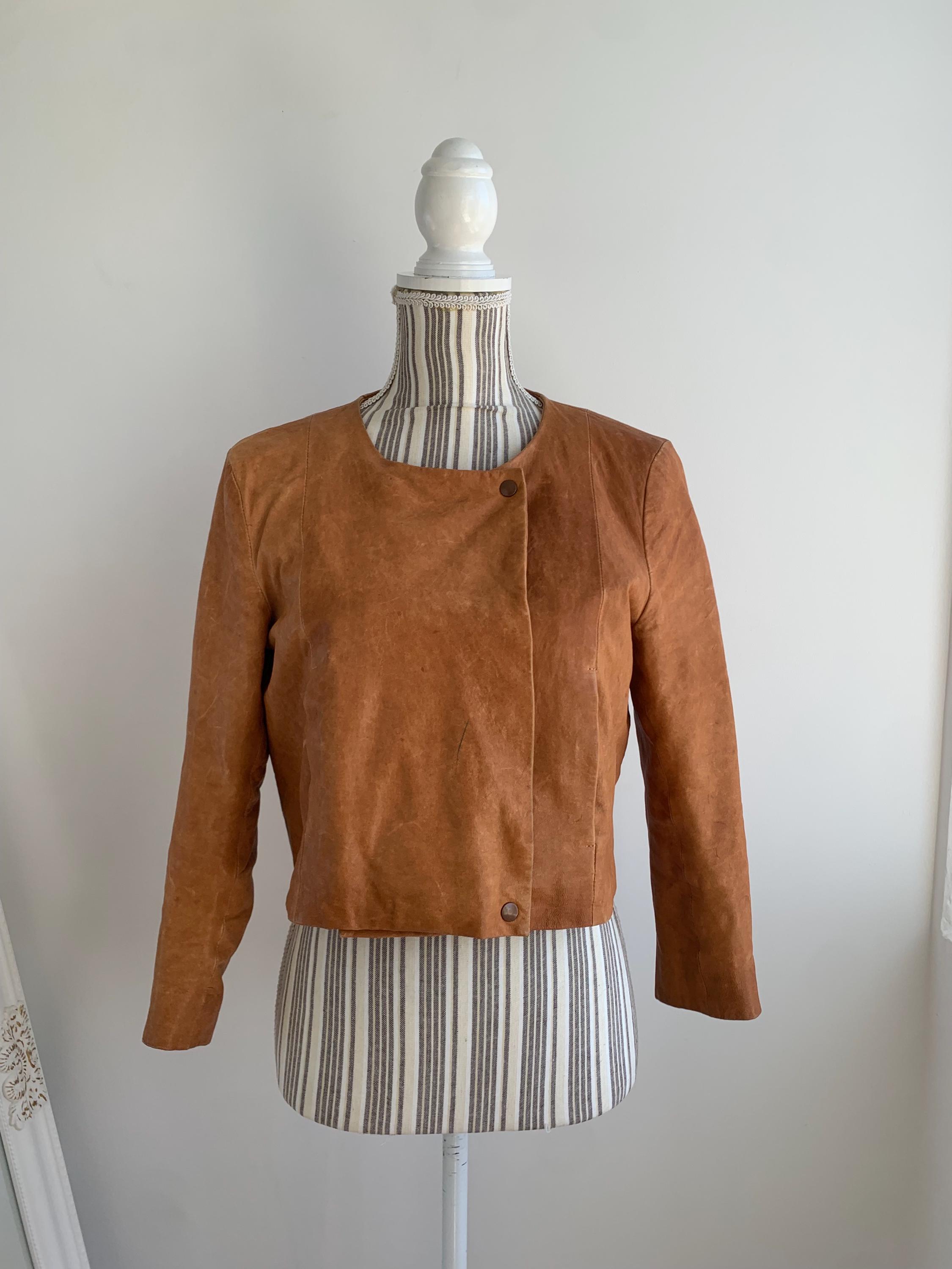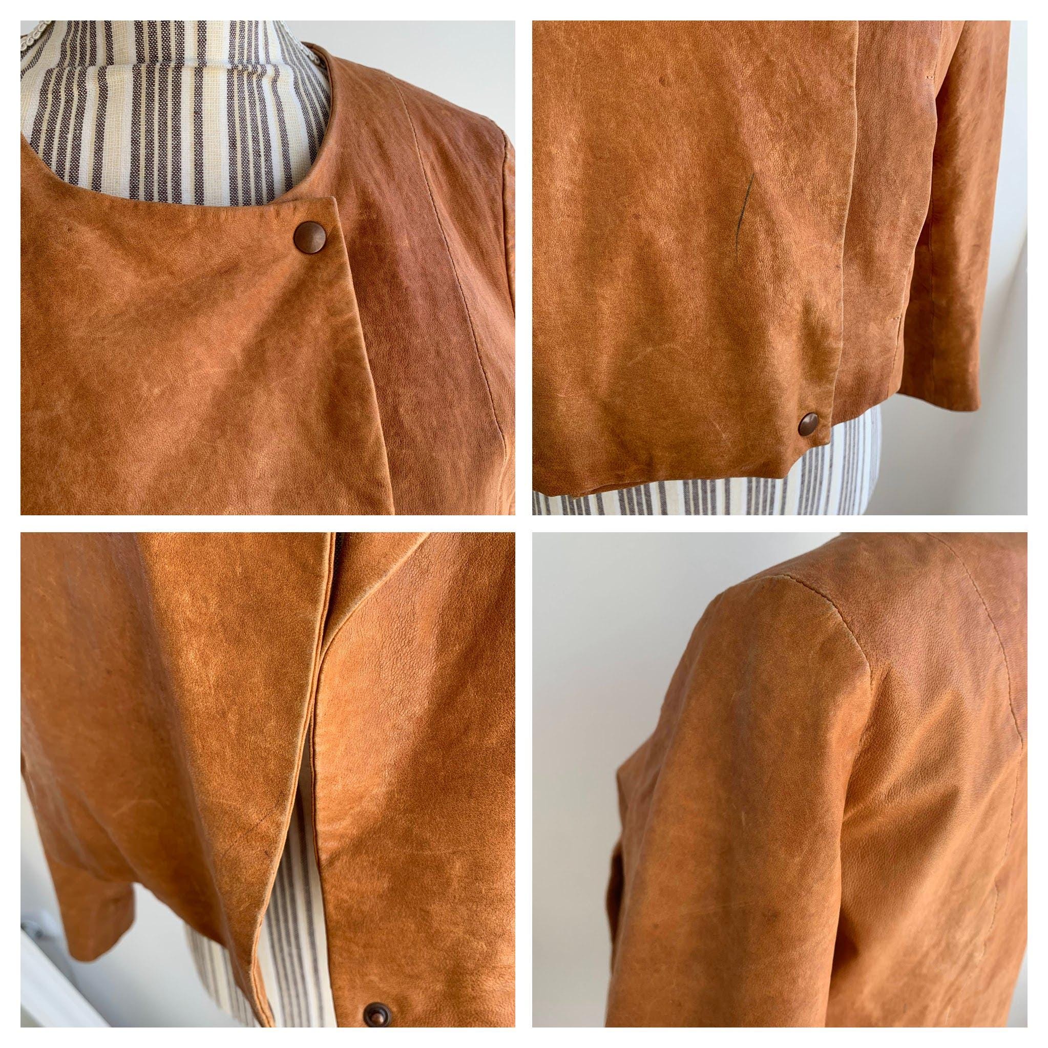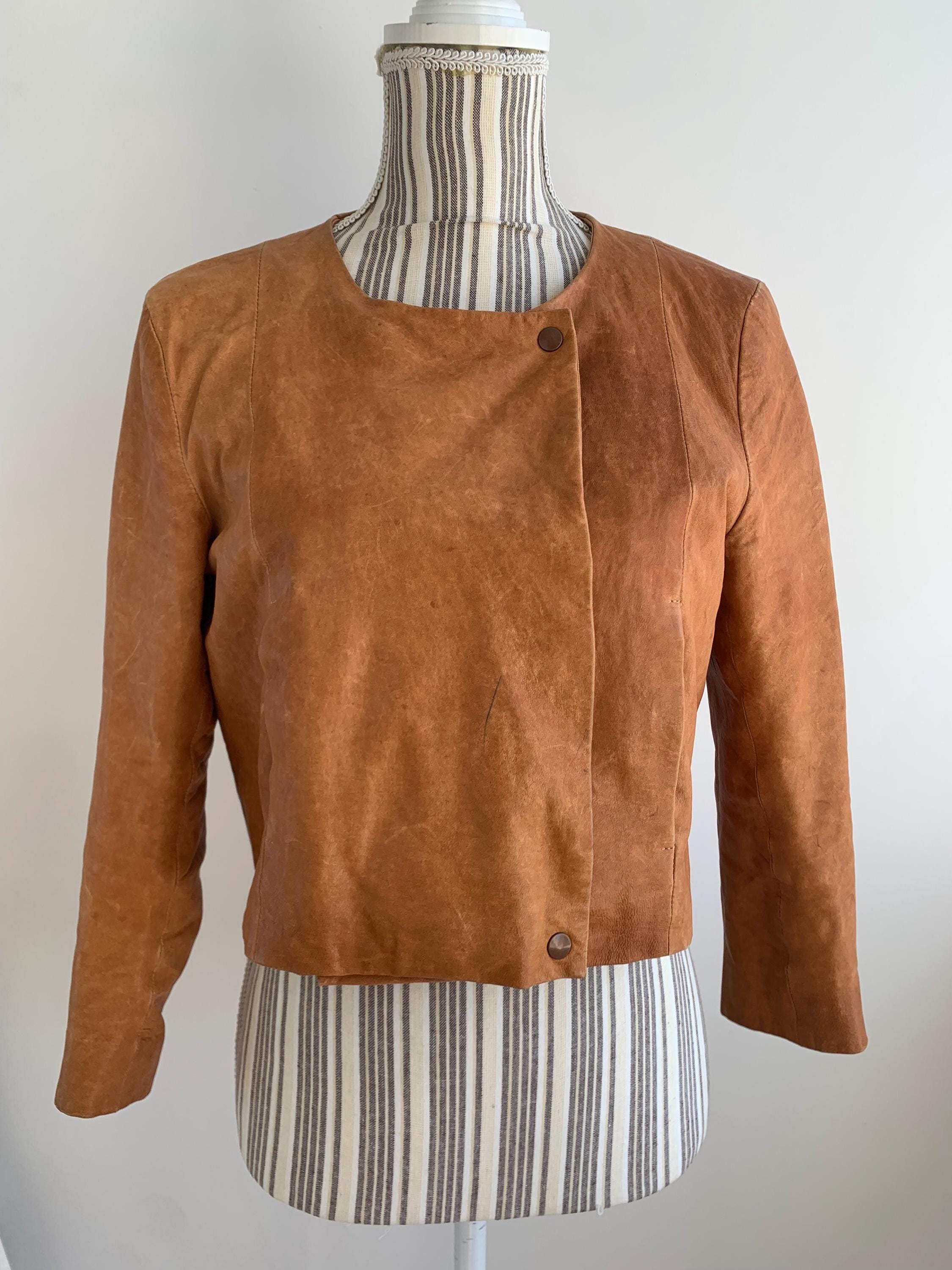 This is a vintage Y2K COS boho heavily distressed cropped camel leather jacket with 3.4 sleeves and button front closure. This real leather jacket has two side pockets and cotton lining underneath. The size marked is 38, which fits like S. Please check the measurements below.