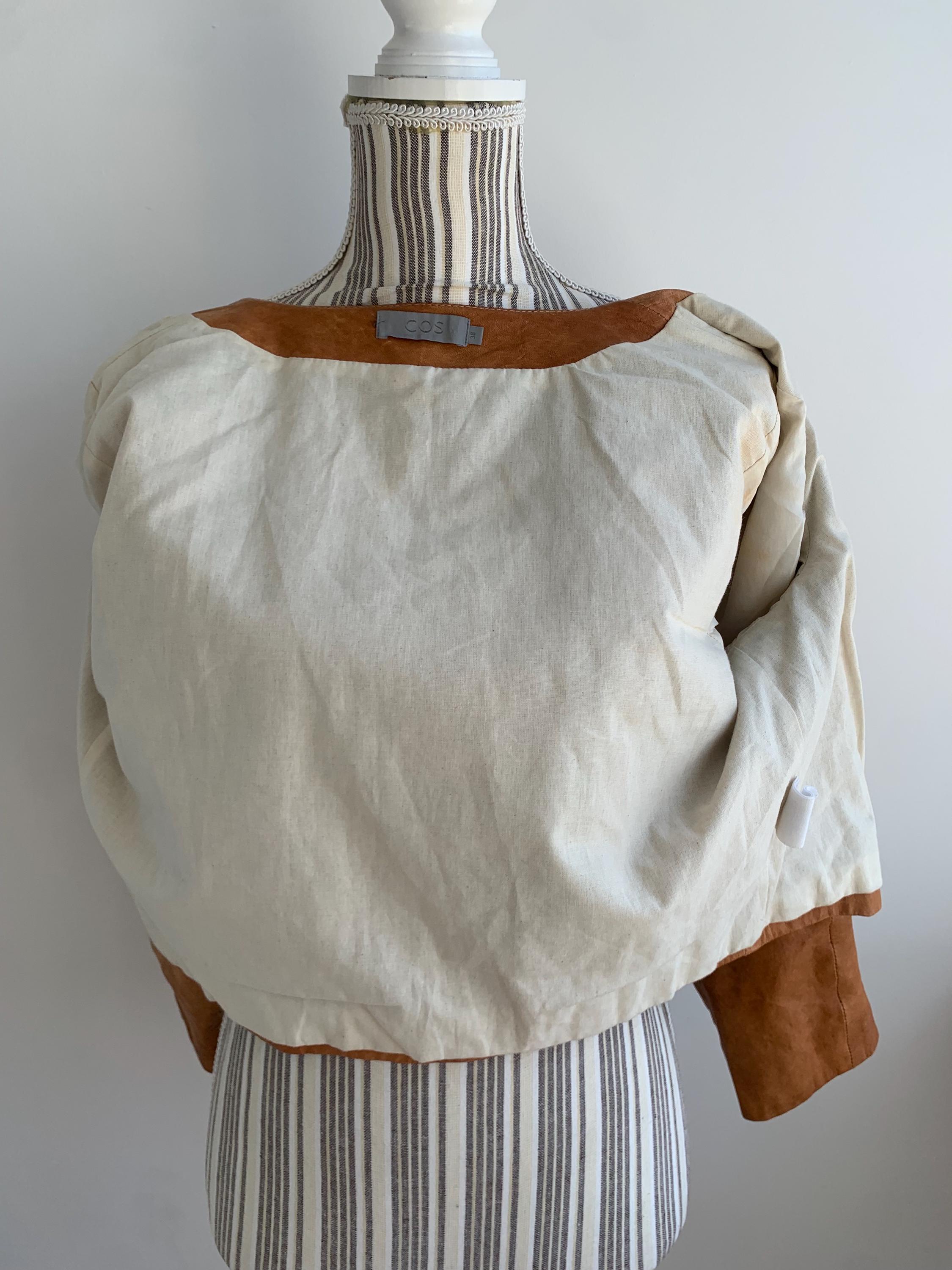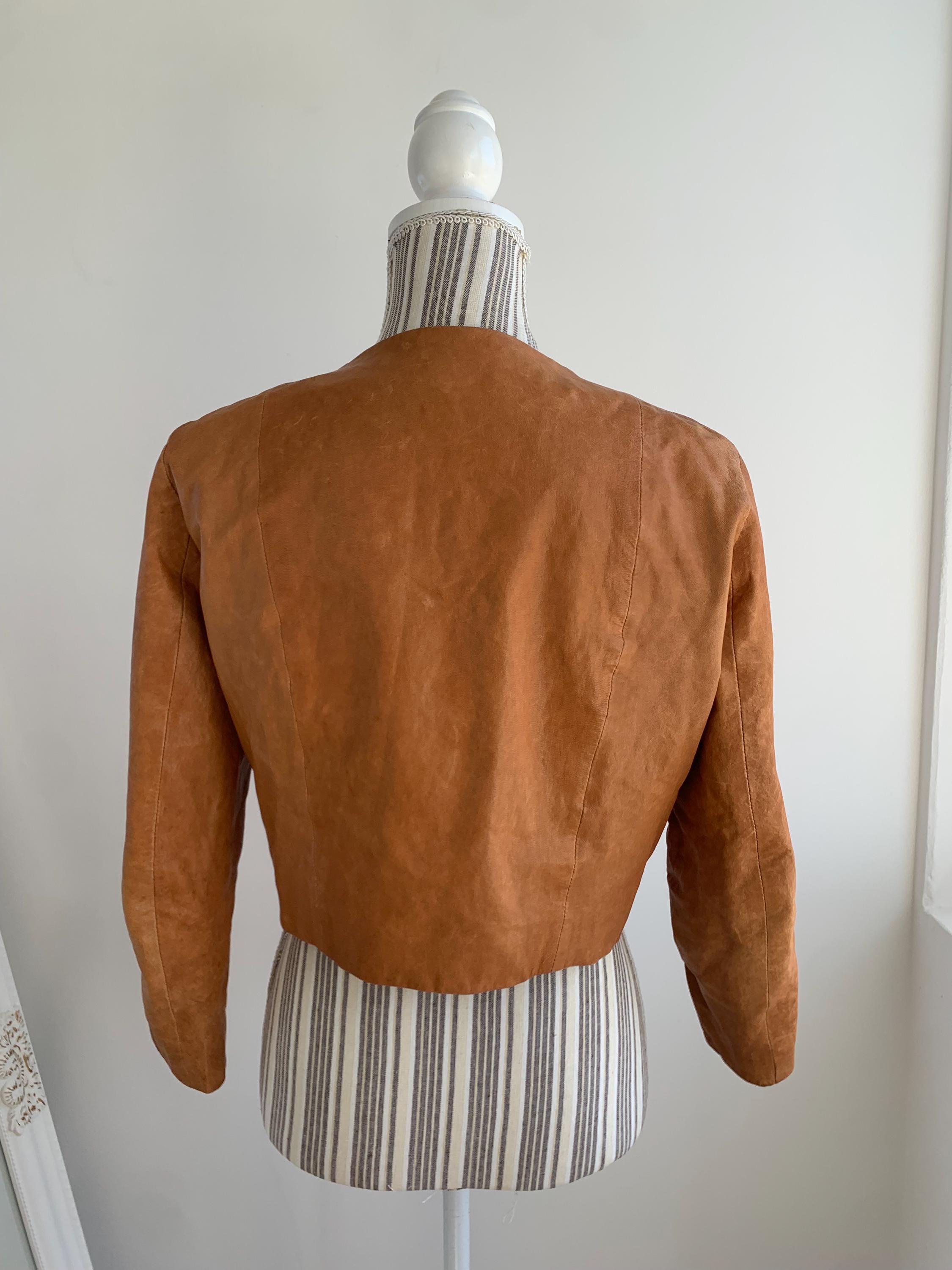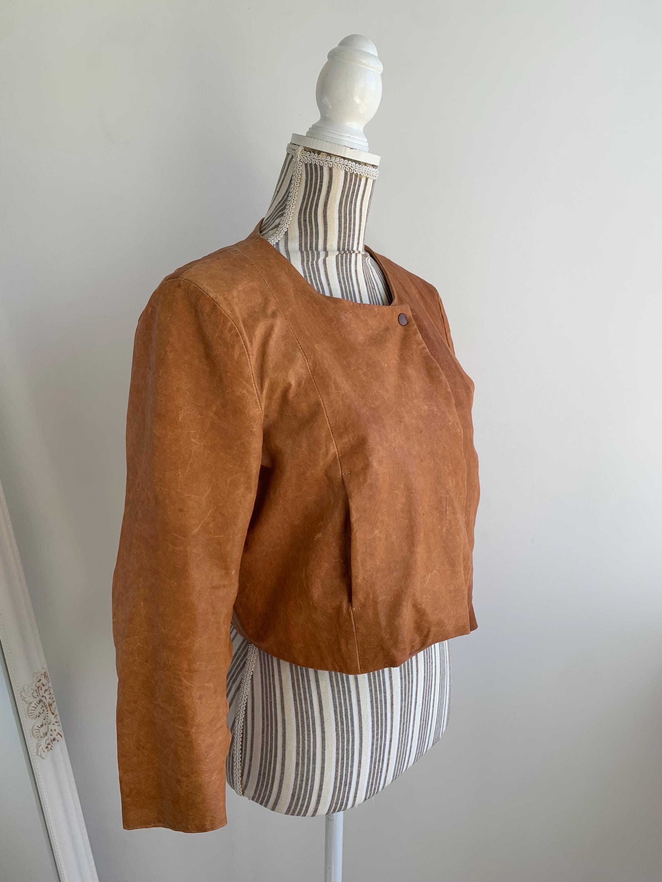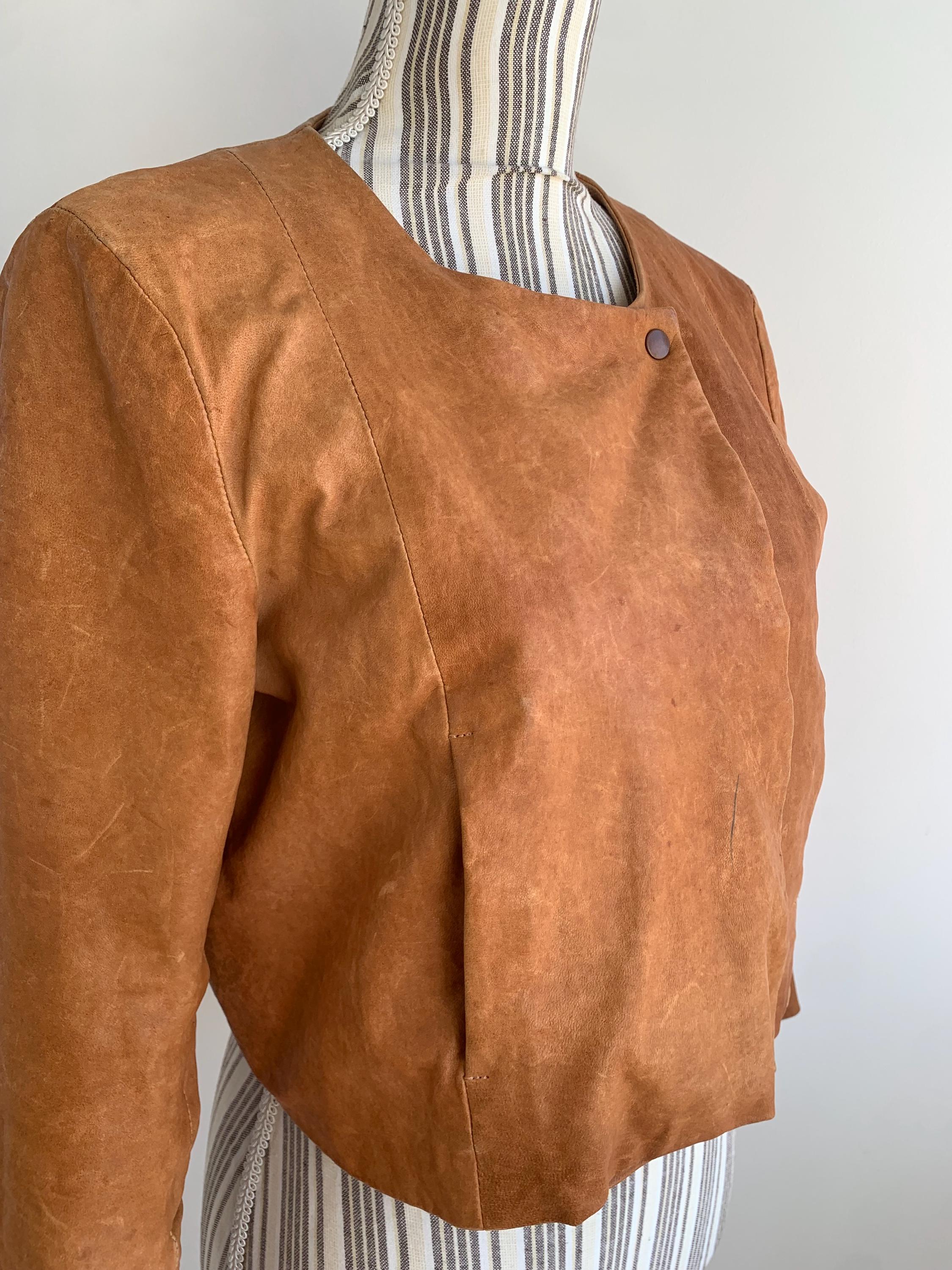 This is a vintage Y2K COS boho heavily distressed cropped camel leather jacket with 3.4 sleeves and button front closure. This real leather jacket has two side pockets and cotton lining underneath. The size marked is 38, which fits like S. Please check the measurements below.