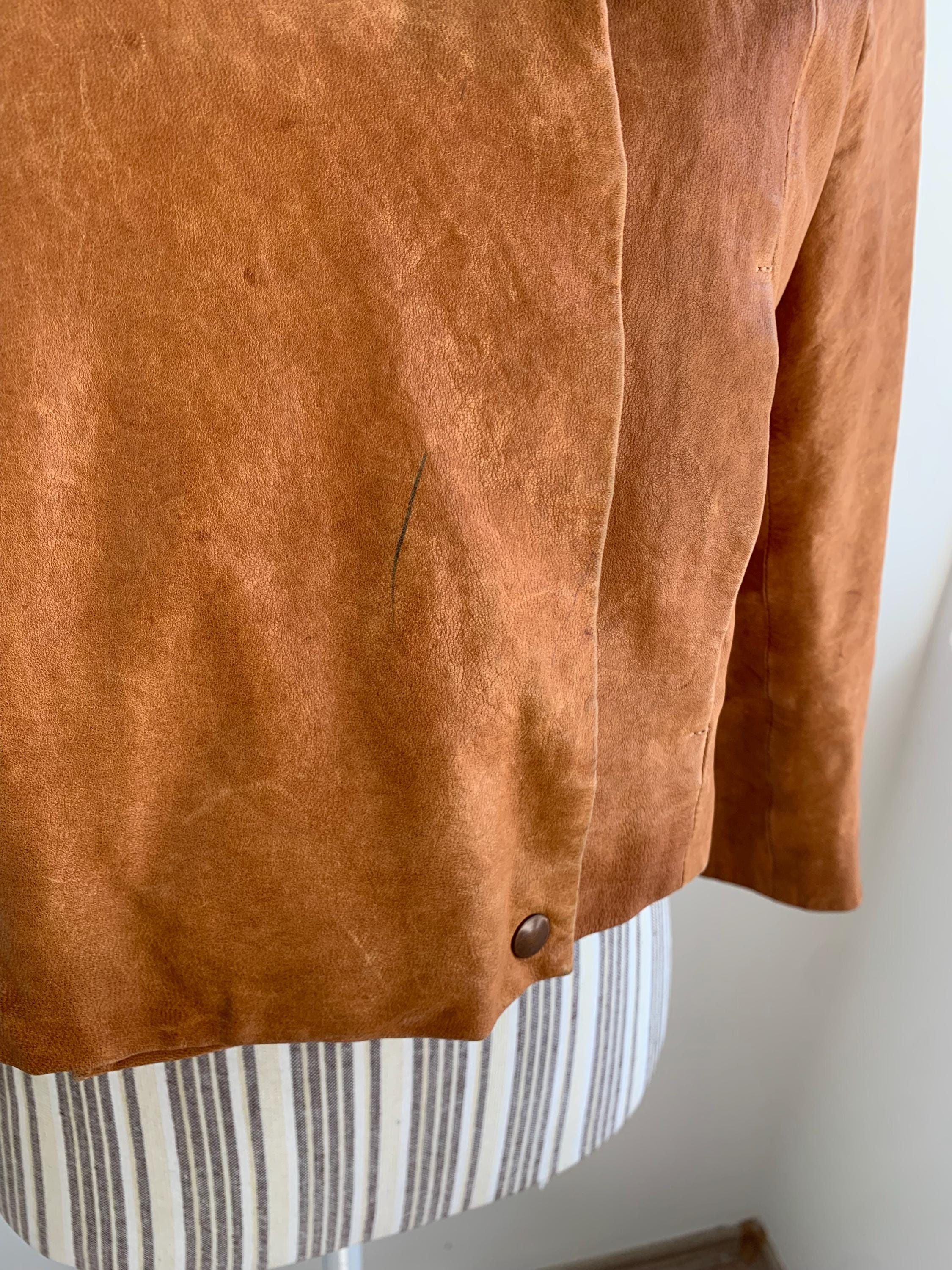 Condition: this brown leather jacket was pre- loved and has a heavily distressed look with numerous scratches and marks on the genuine leather surface and a pen mark at the from.