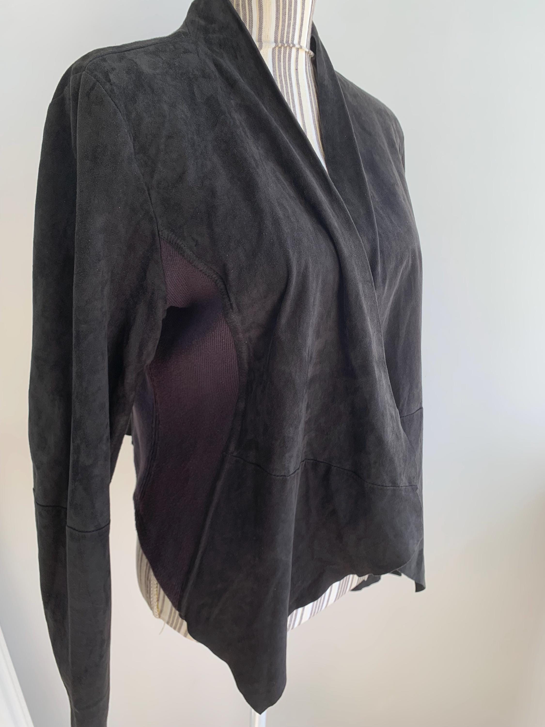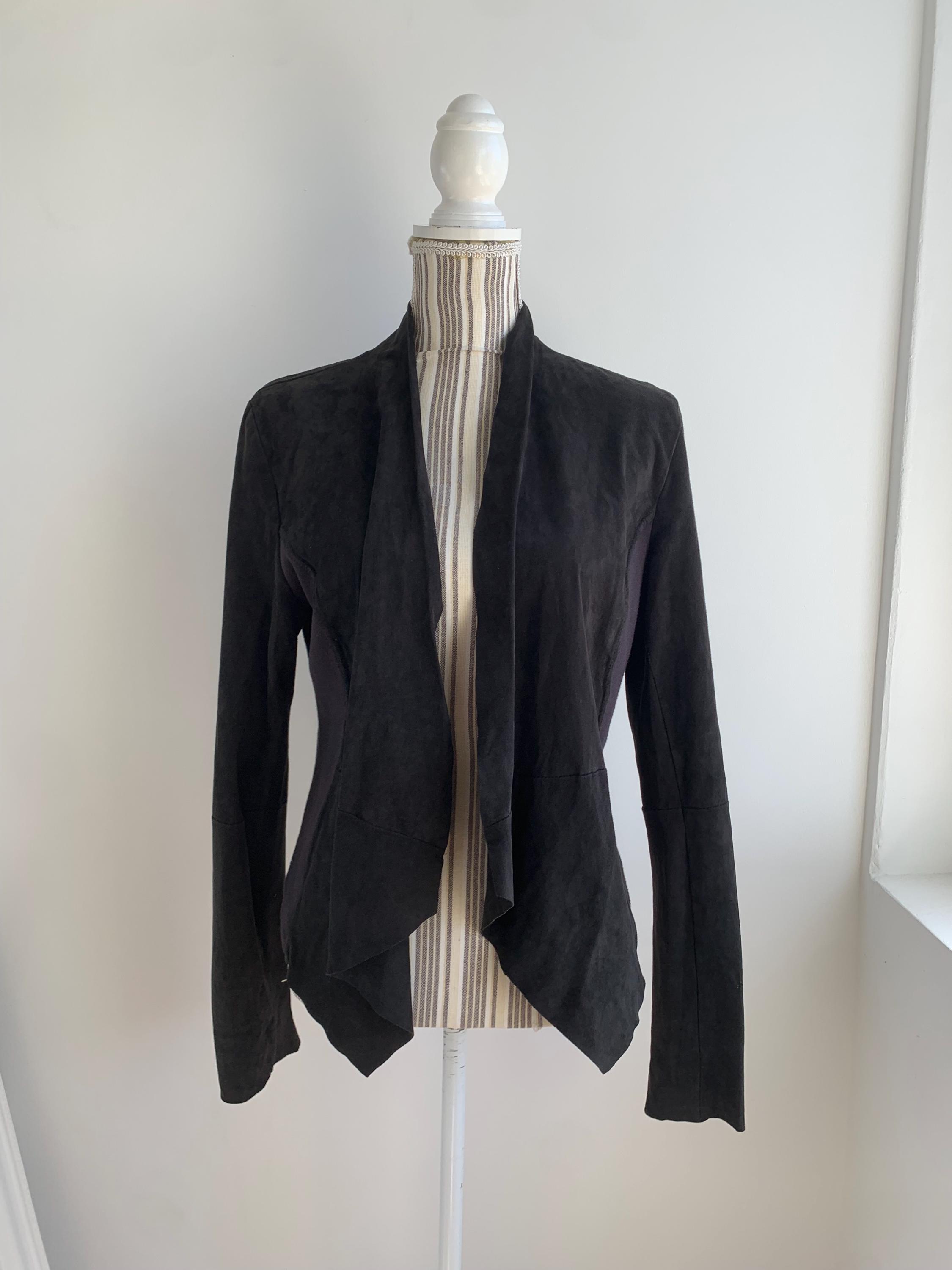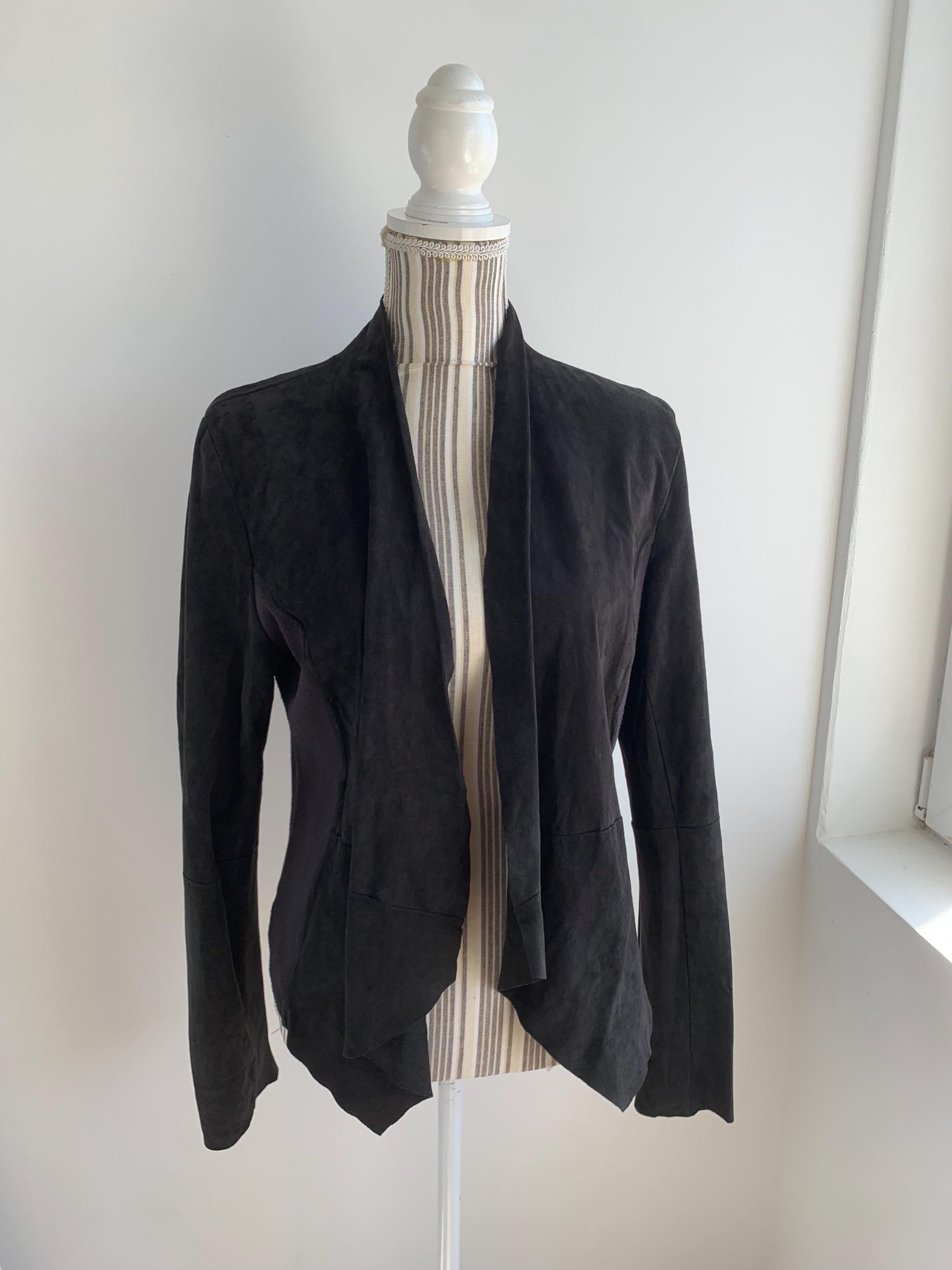 This is a sexy fitted black suede leather blazer with open front and long sleeves by Samsoe Samsoe. This black suede cardigan jacket has knitted sides and soft leather front, back and sleeves. It has no lining underneath. The size marked is L, it fits like size M/L. Please check the measurements below.