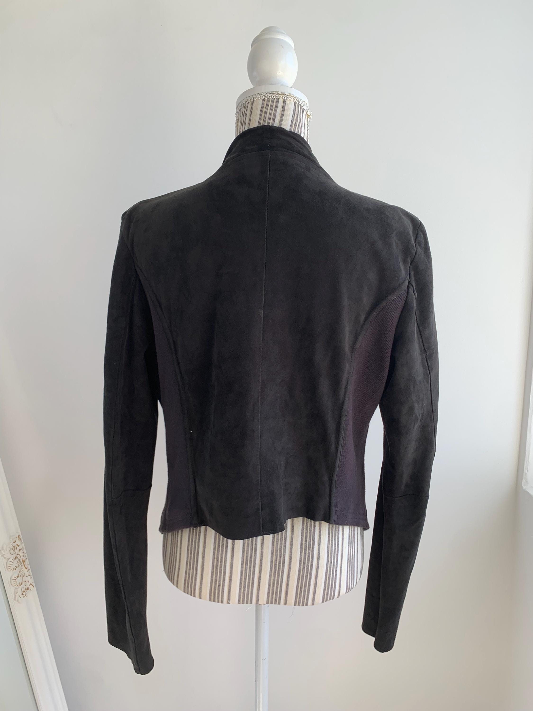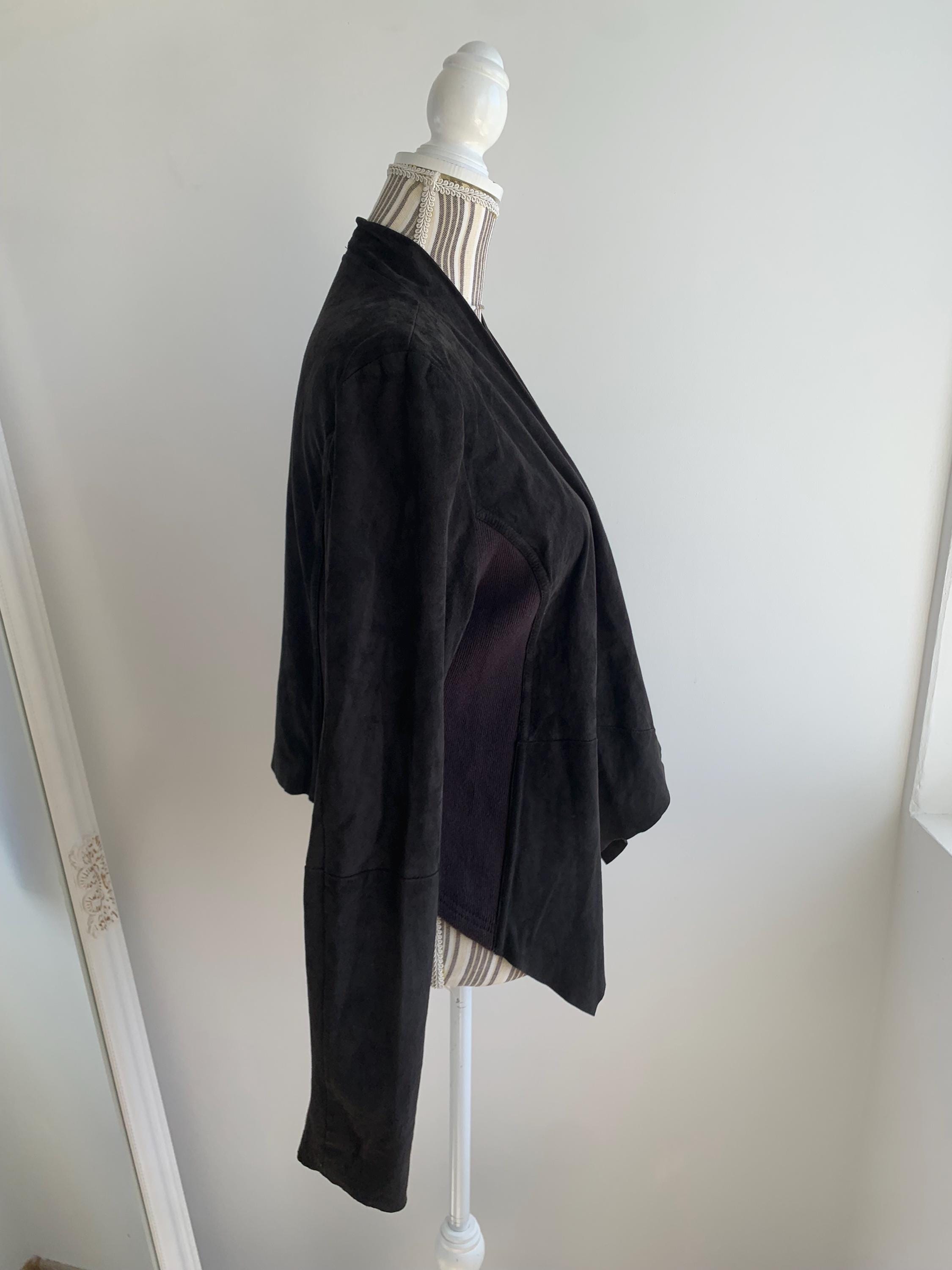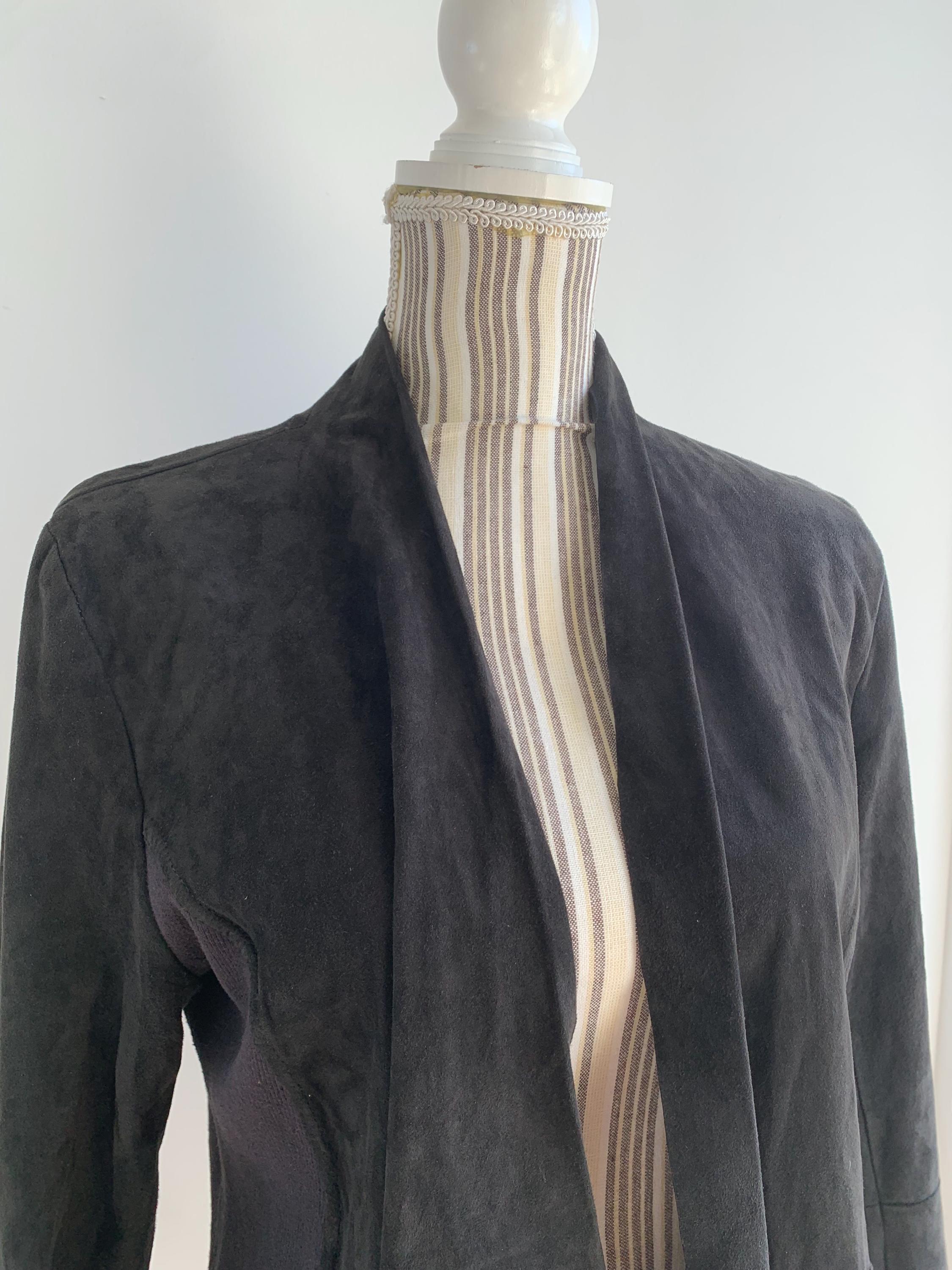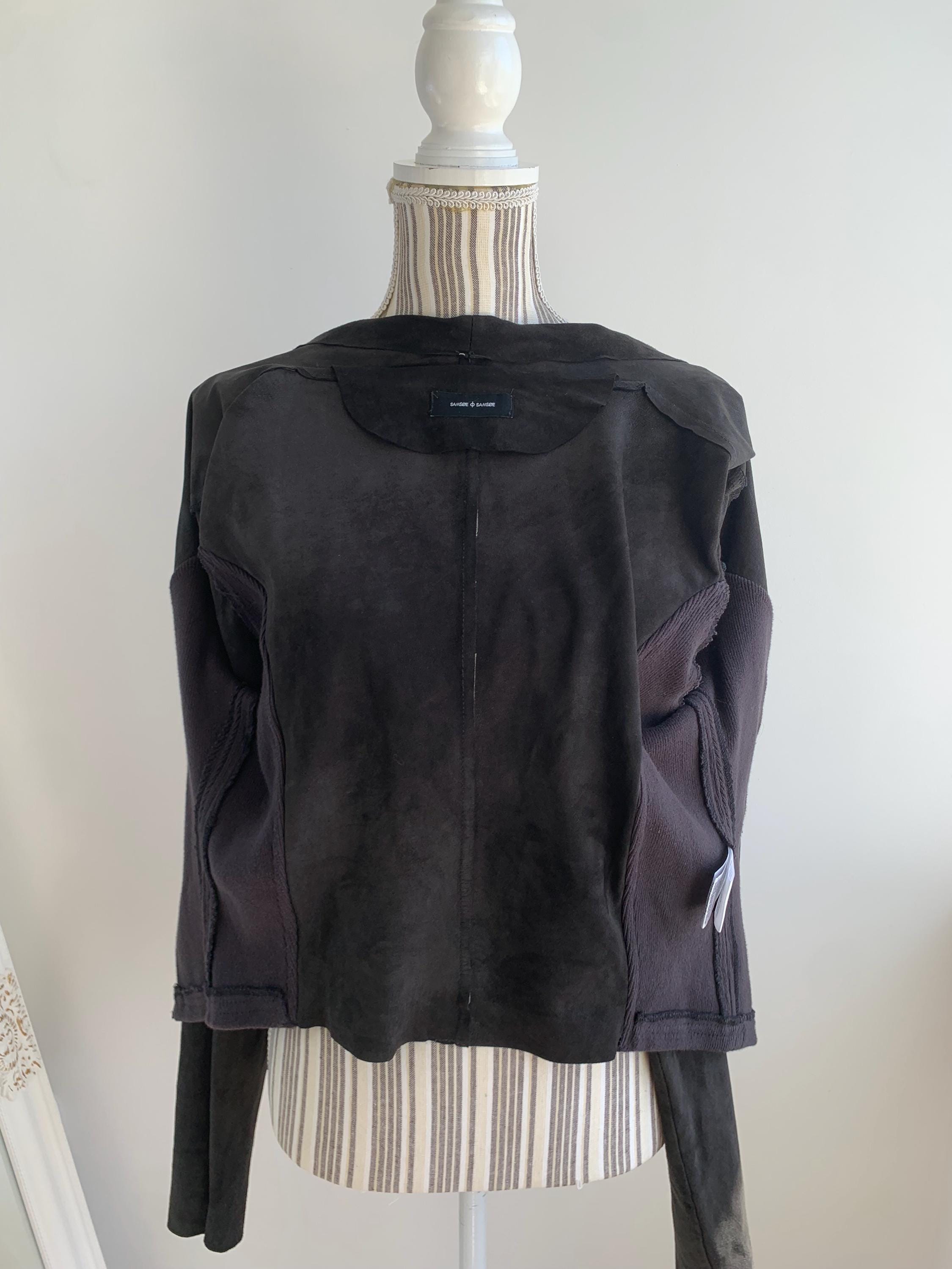 This is a sexy fitted black suede leather blazer with open front and long sleeves by Samsoe Samsoe. This black suede cardigan jacket has knitted sides and soft leather front, back and sleeves. It has no lining underneath. The size marked is L, it fits like size M/L. Please check the measurements below.
