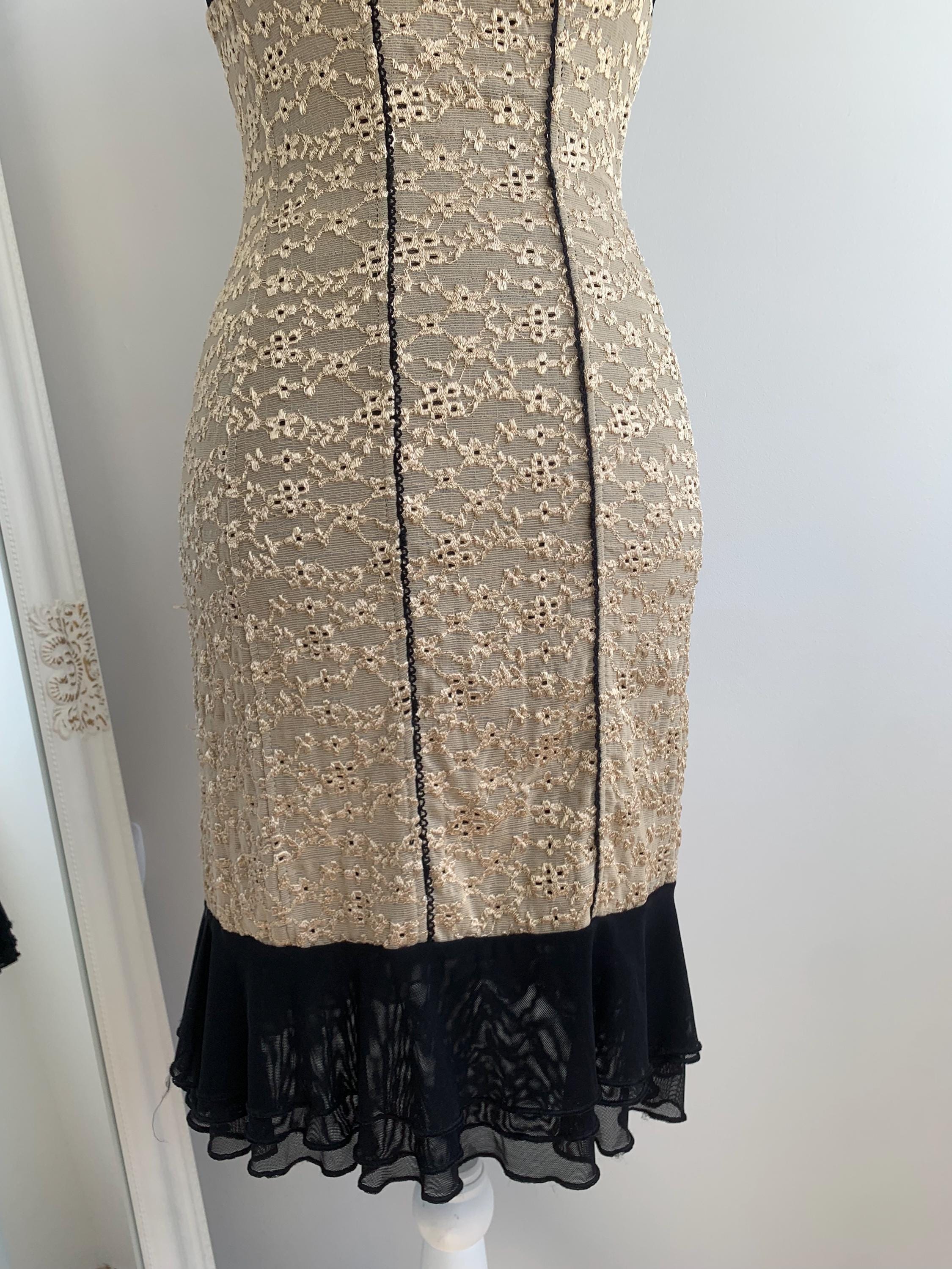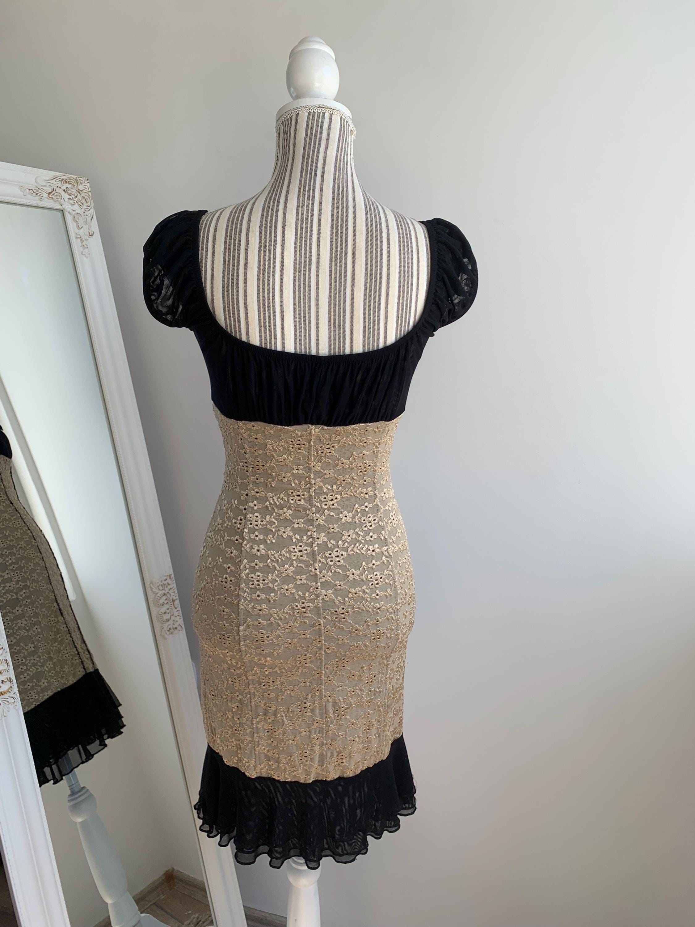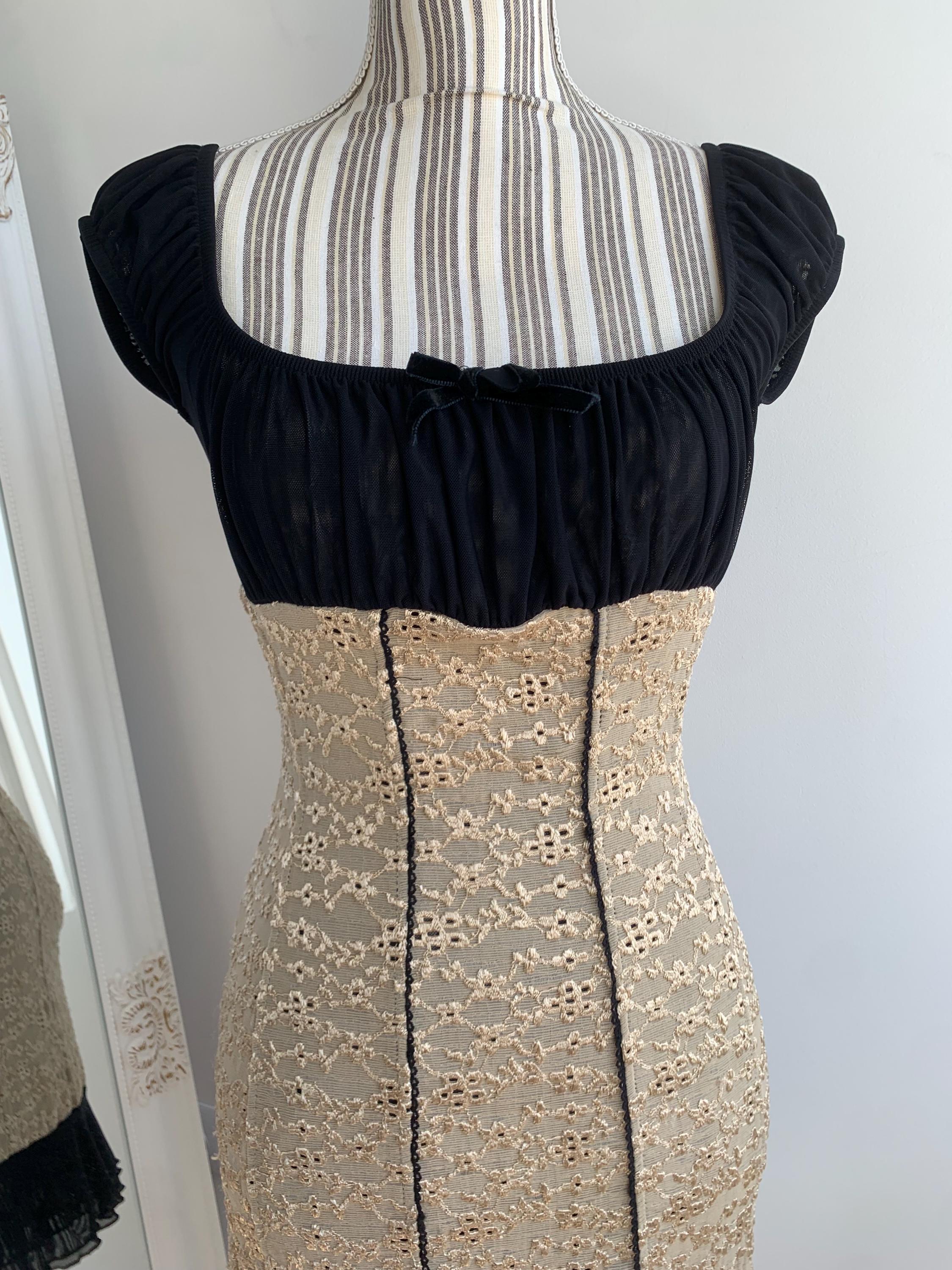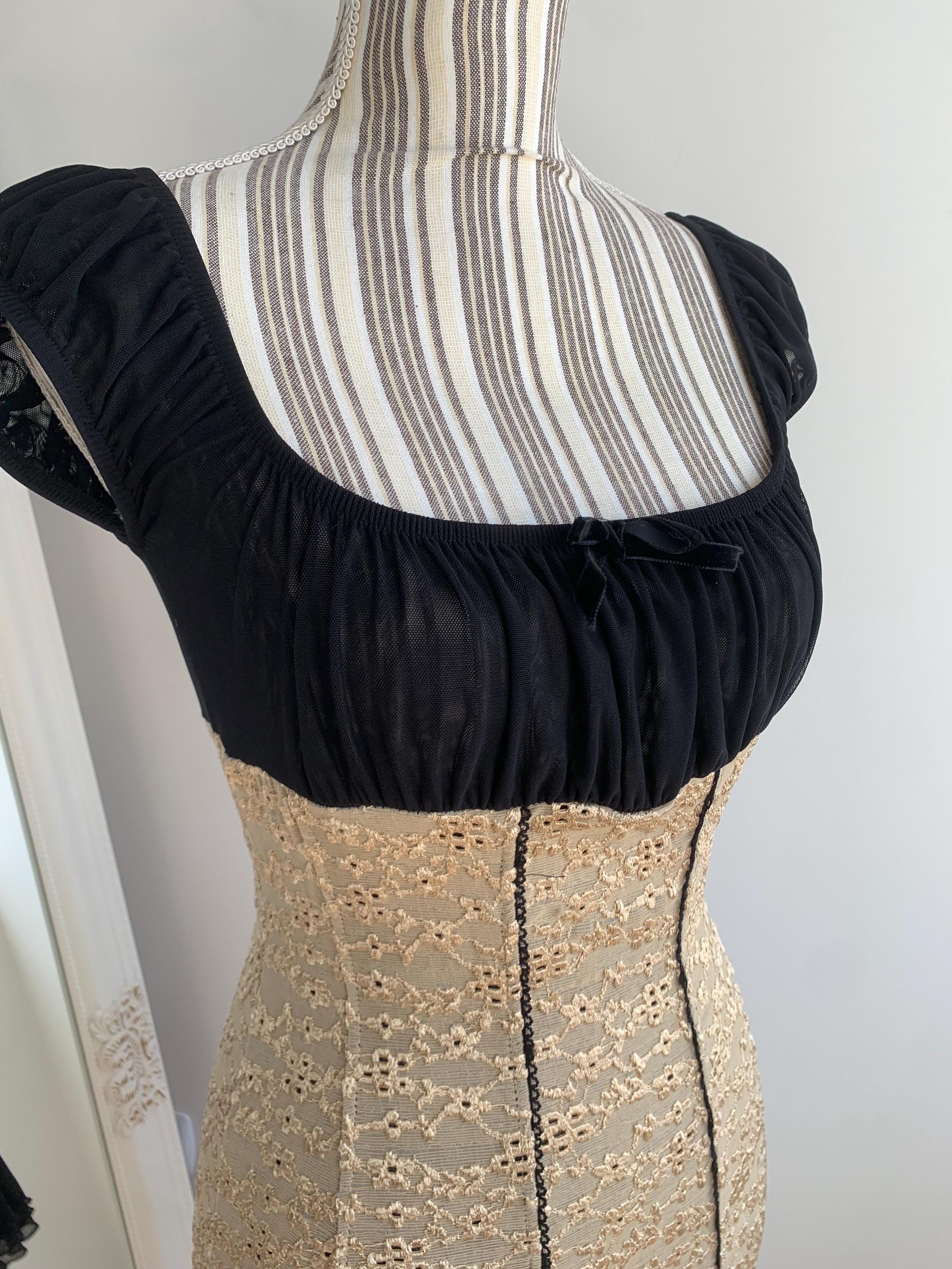 This is a beautiful vintage 90s WHEELS & DOLLBABY Australia sexy bodycon beige lace dress with black flared mermaid bottom and sheer short sleeves. This slim fit romantic core dress has a tight and fritted silhouette with square neckline and mesh cap sleeves. The size marked is 2, it fits like size XS/ S. Please check the measurements below.