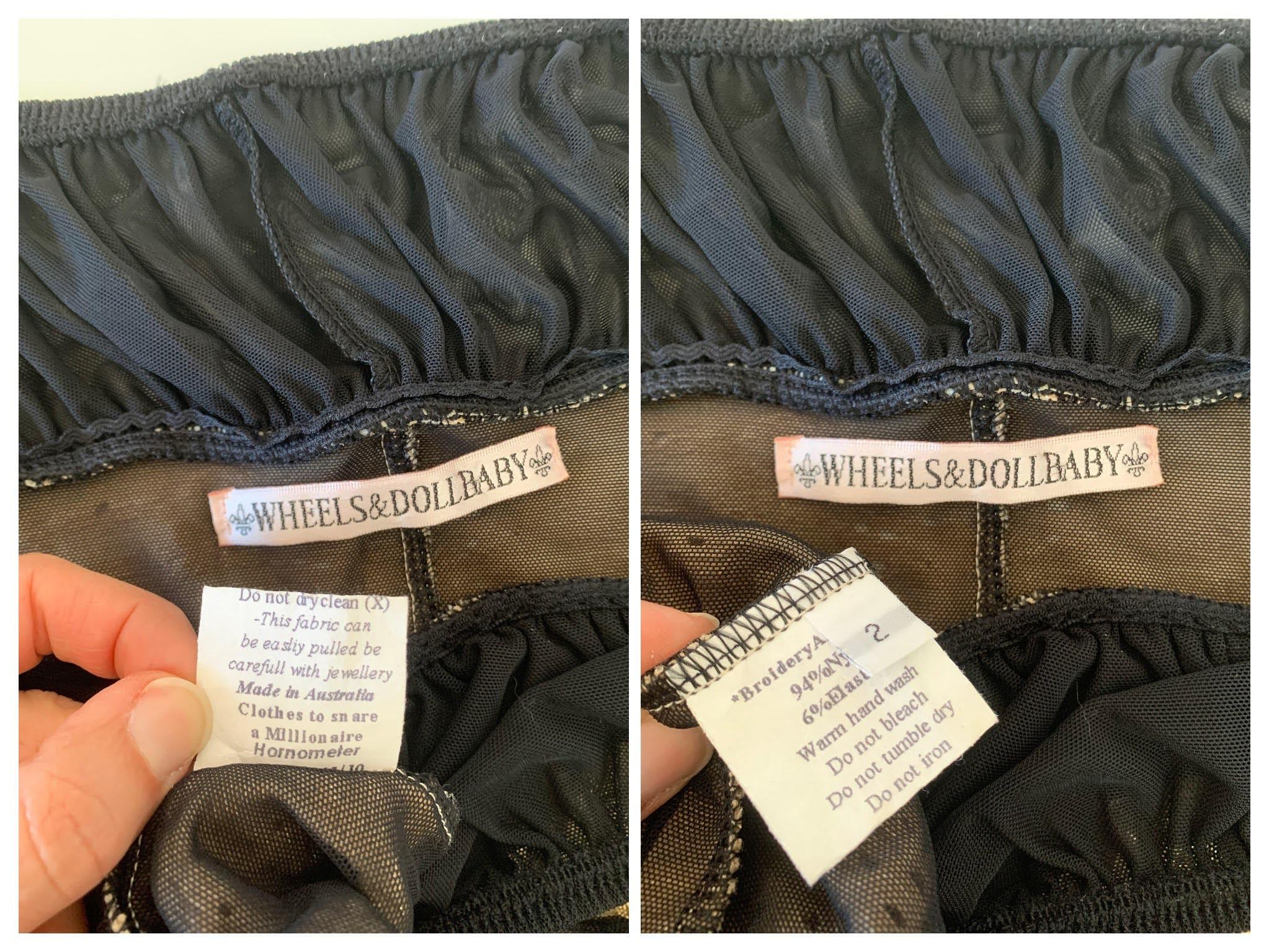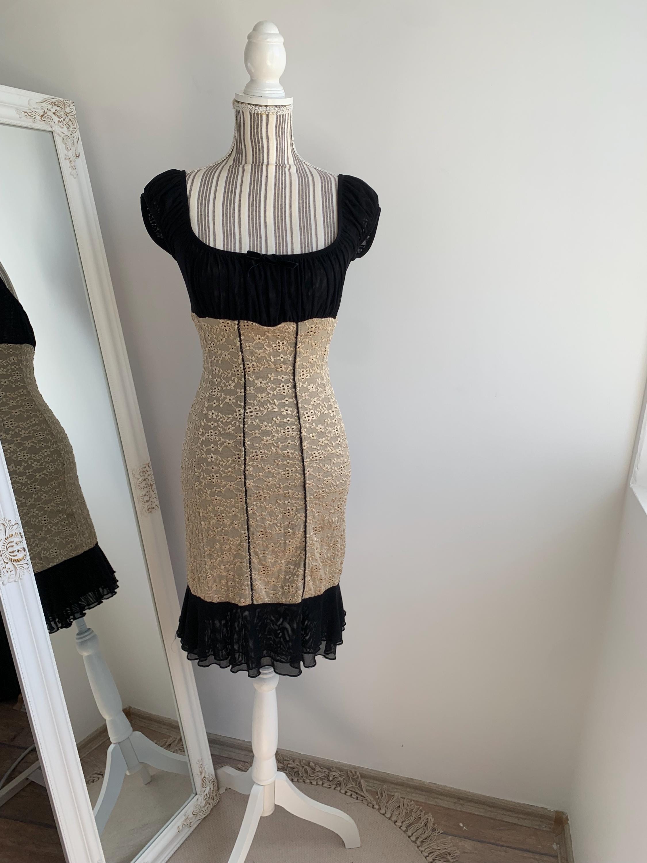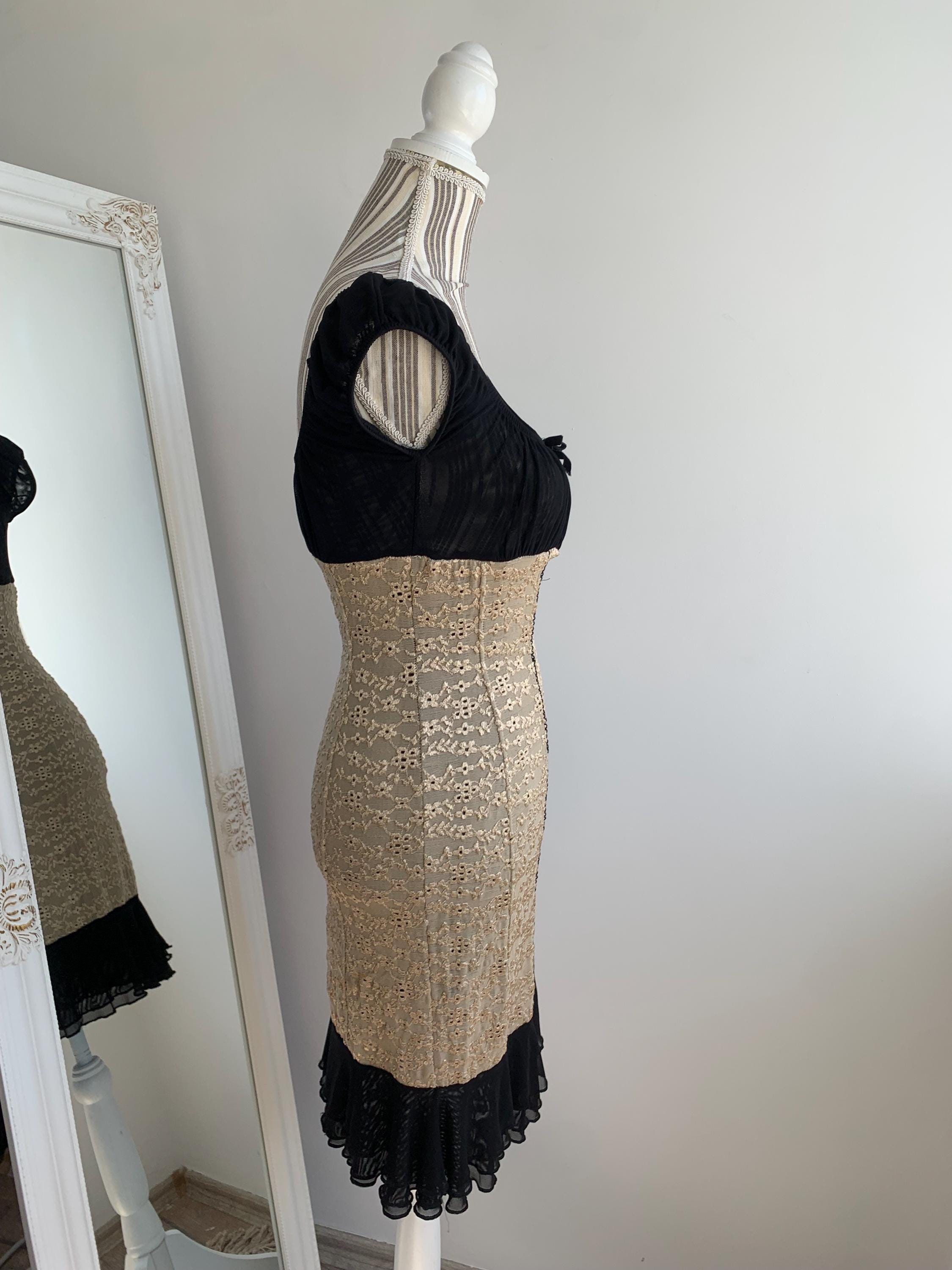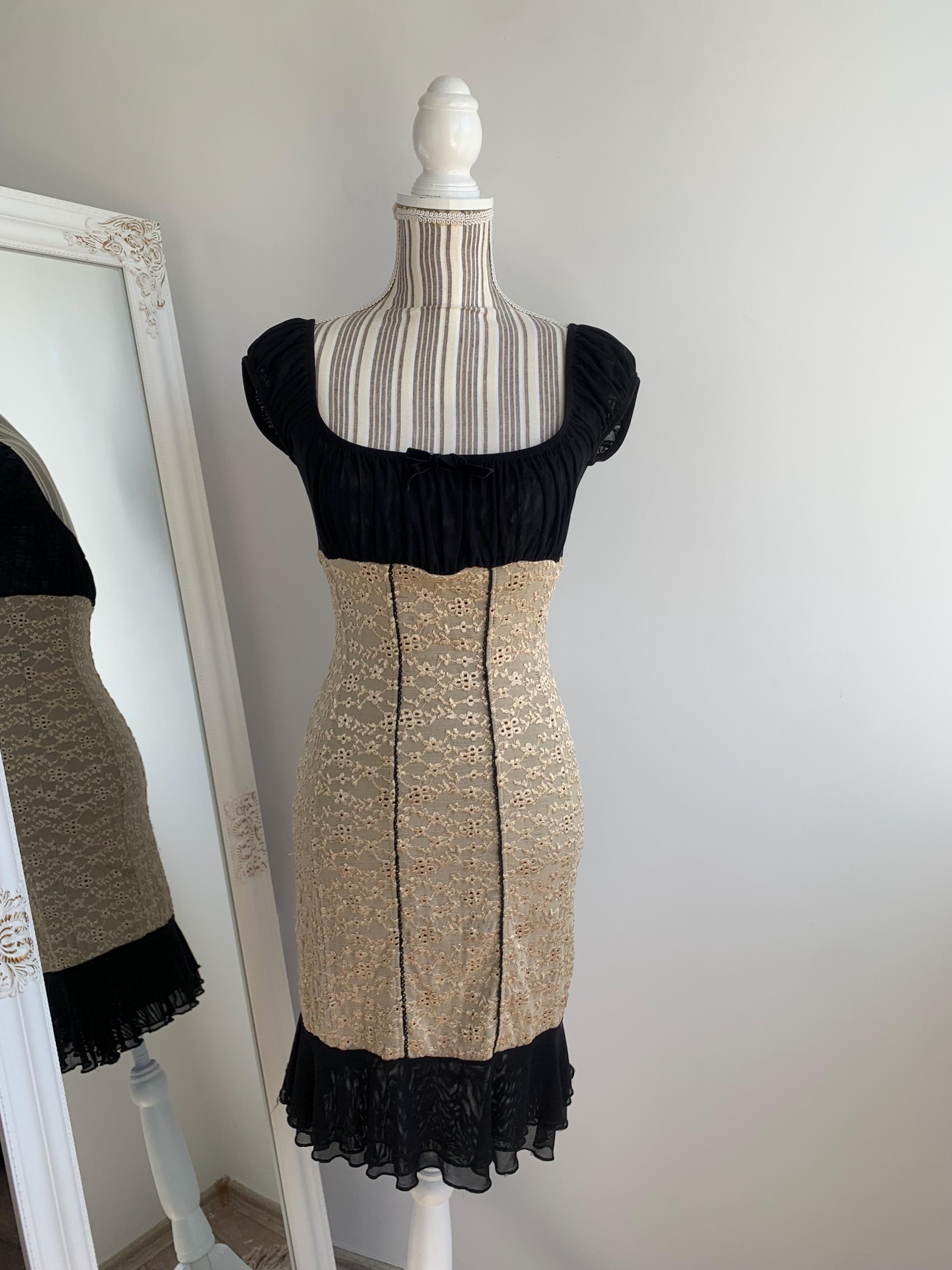 This is a beautiful vintage 90s WHEELS & DOLLBABY Australia sexy bodycon beige lace dress with black flared mermaid bottom and sheer short sleeves. This slim fit romantic core dress has a tight and fritted silhouette with square neckline and mesh cap sleeves. The size marked is 2, it fits like size XS/ S. Please check the measurements below.