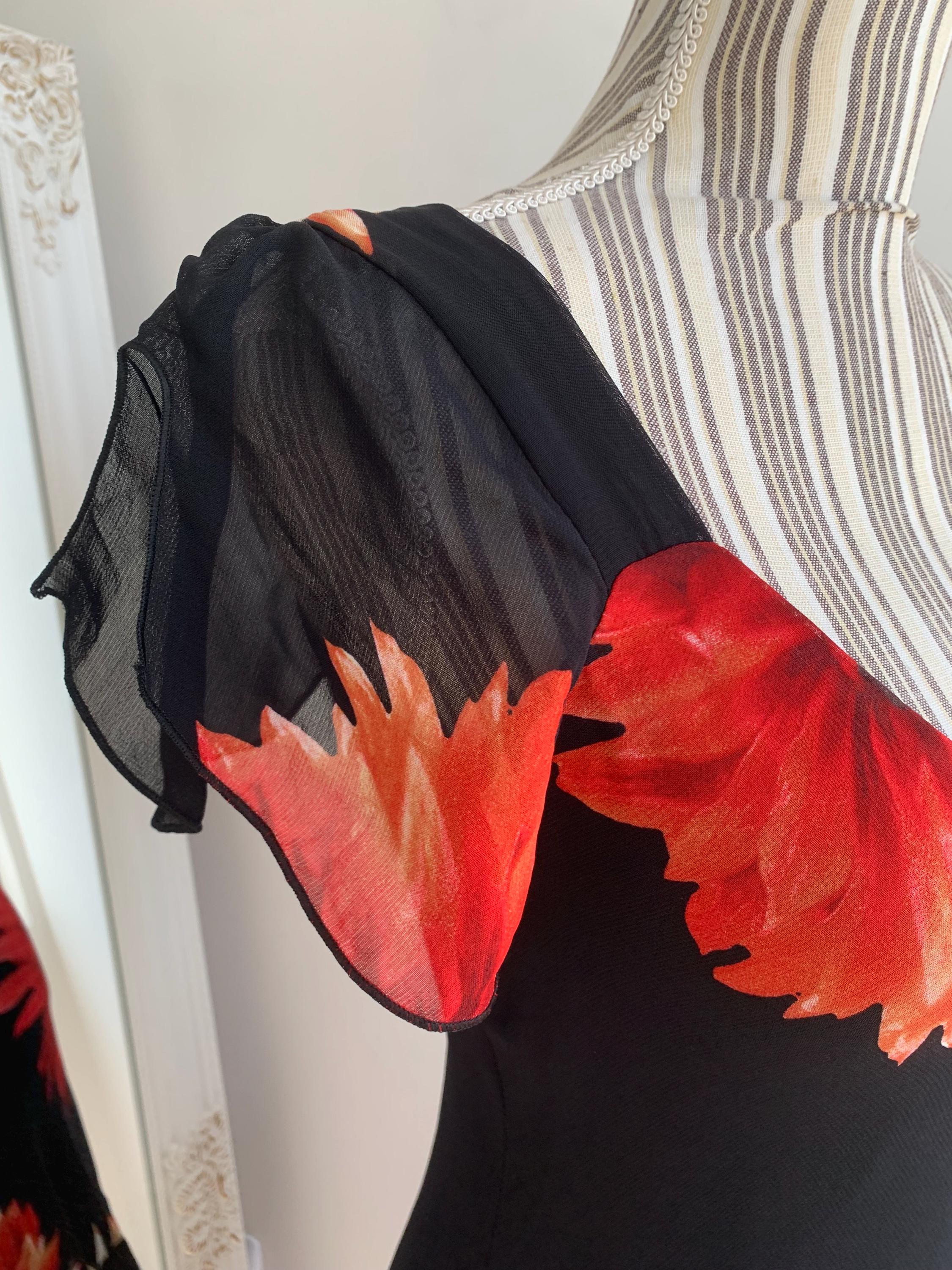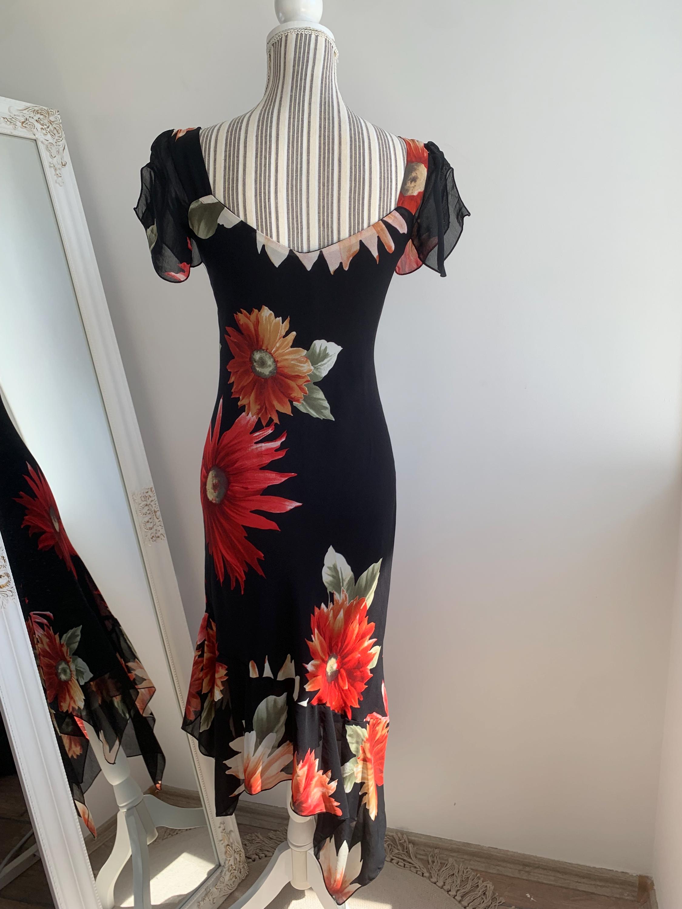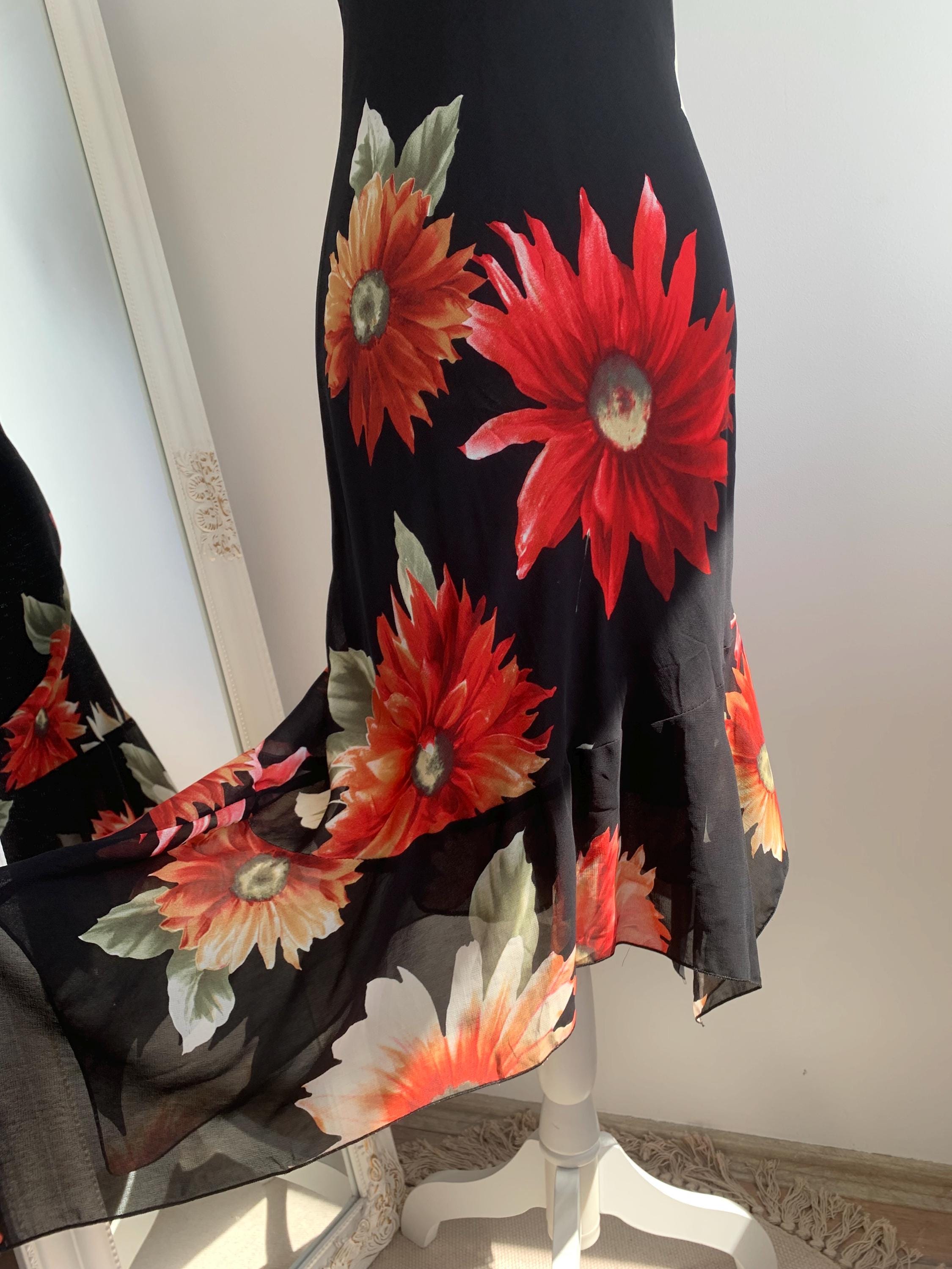 This is a beautiful vintage 90s/ Y2K French floral sun dress made of sheer viscose fabric and solid lining underneath. This gorgeous feminine grunge dress has v neckline, fitted silhouette and short flared sleeves. This vintage midi dress has asymmetrical hemline. This formal dress fits like size S. Please check the measurements below.