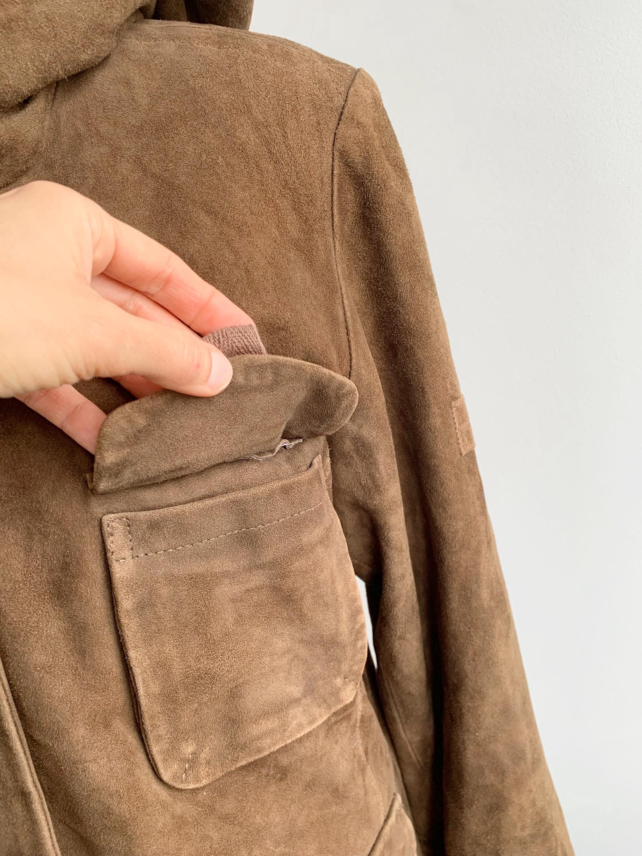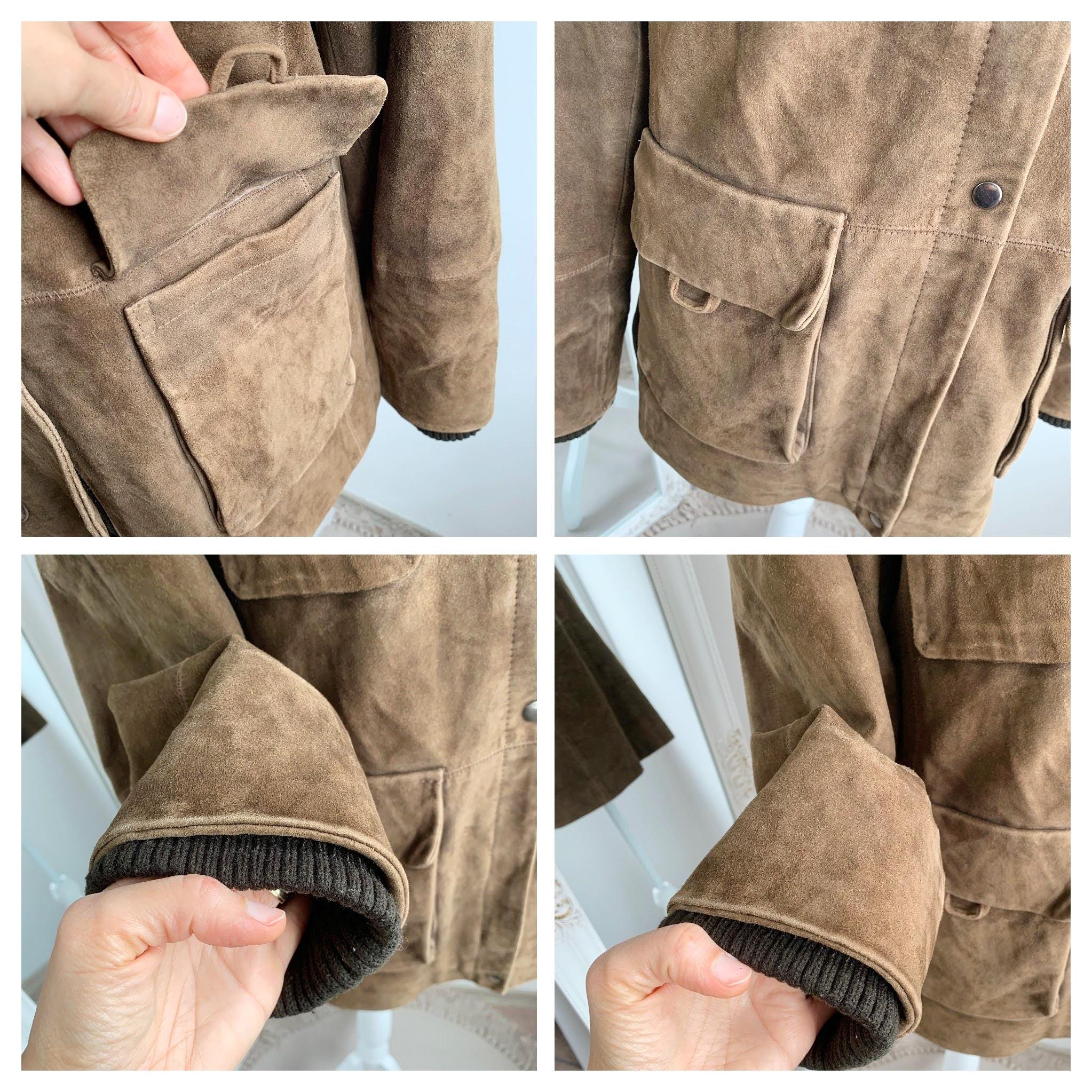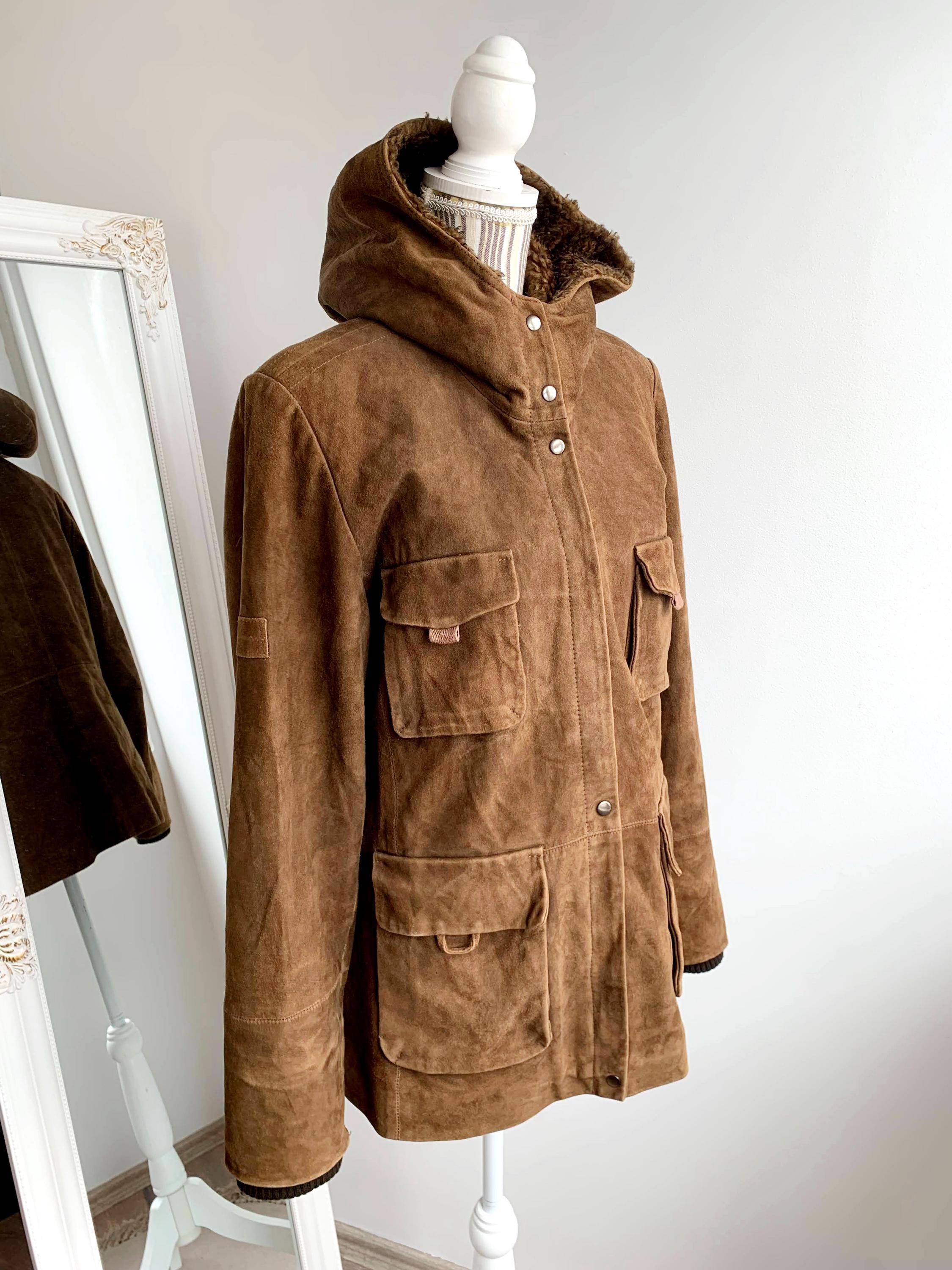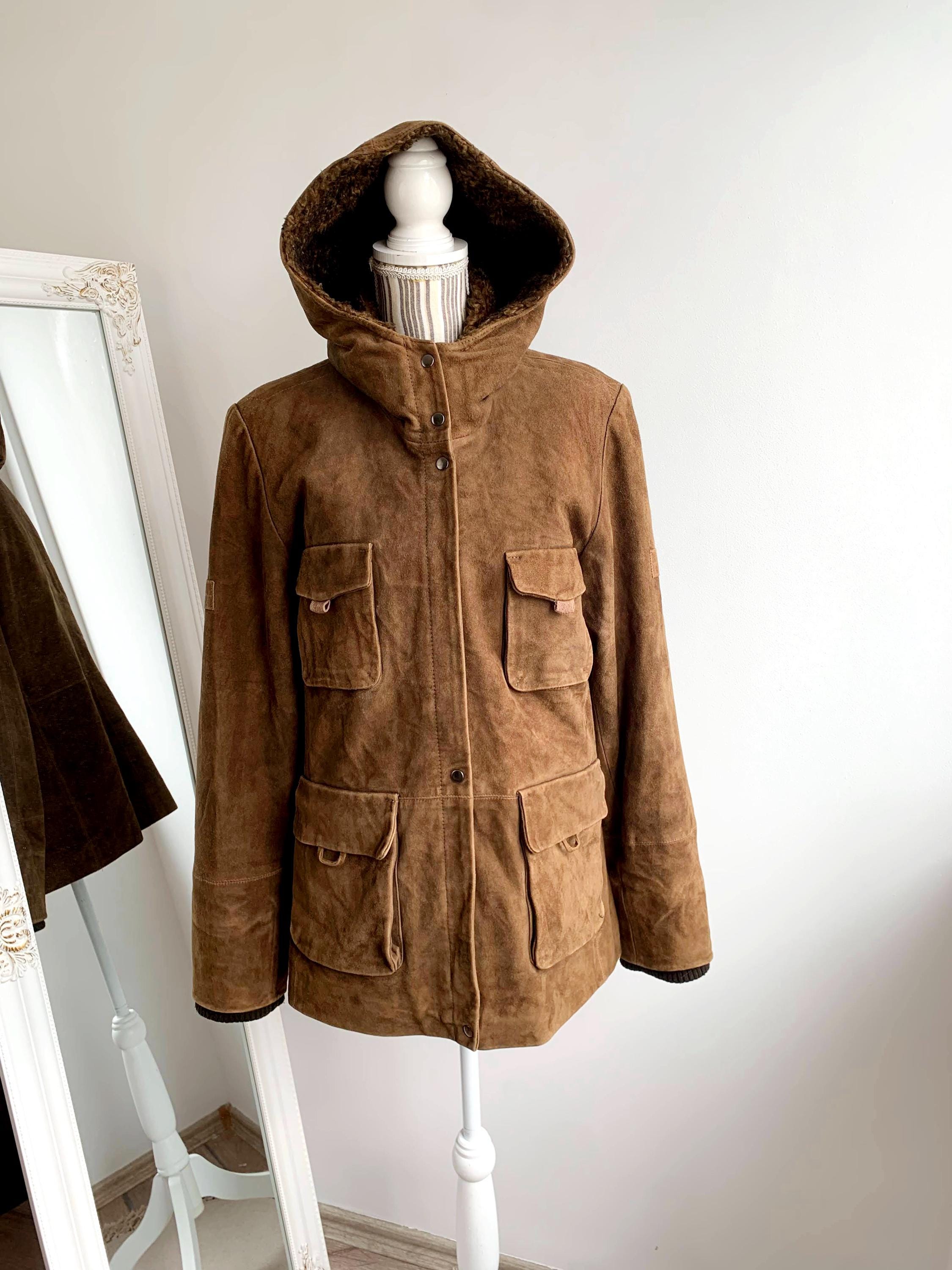 This is s beautiful vintage 90s suede leather park jacket for women by the brand ROCK'N BLUE size 44, which fits like L or XL. This vintage soft suede winter parka jacket has side and chest pockets, high neck and a hood. This hooded suede jacket is perfect for the colder weather to keep you warm and cozy.