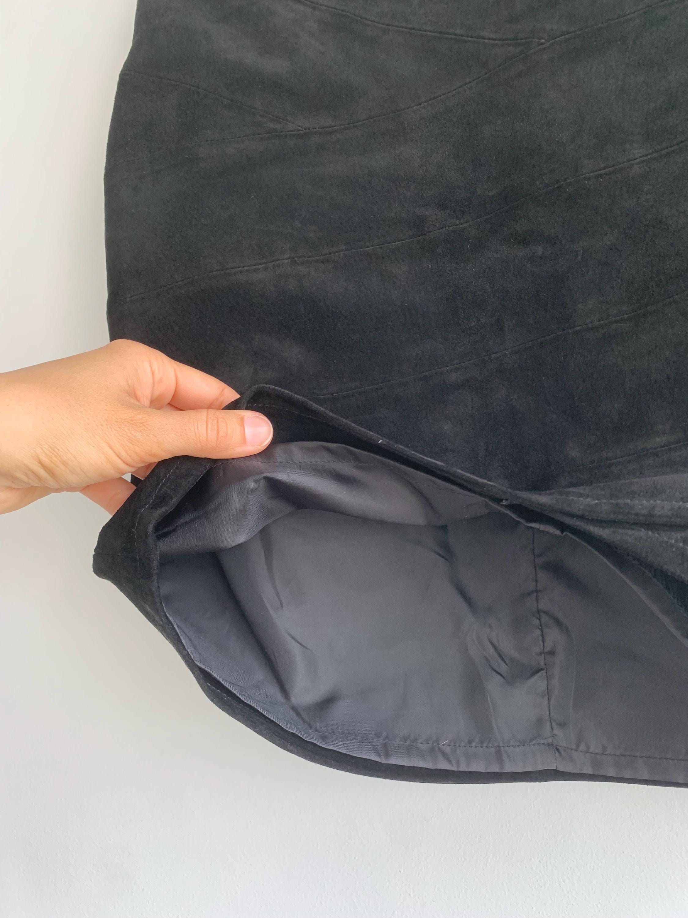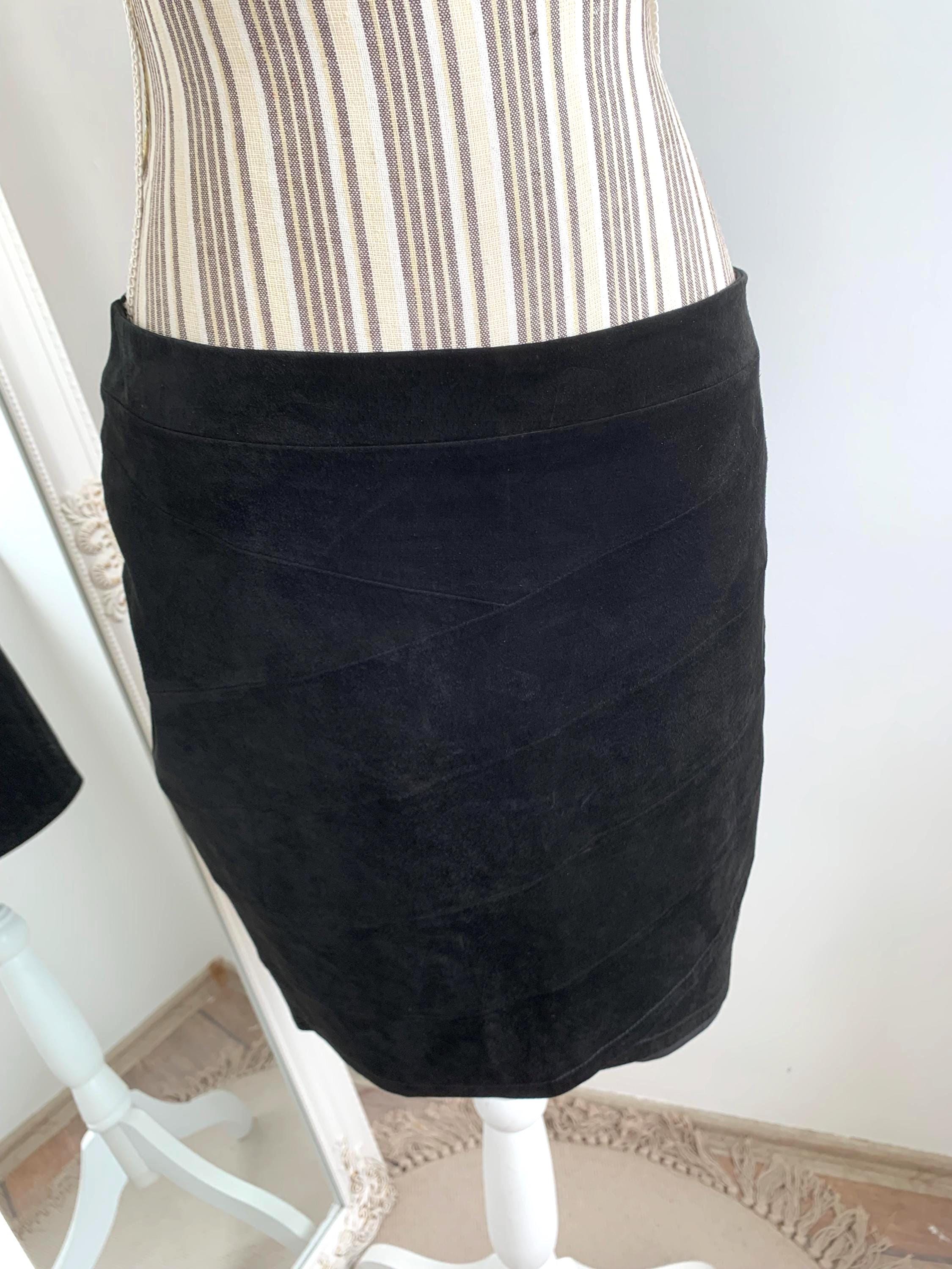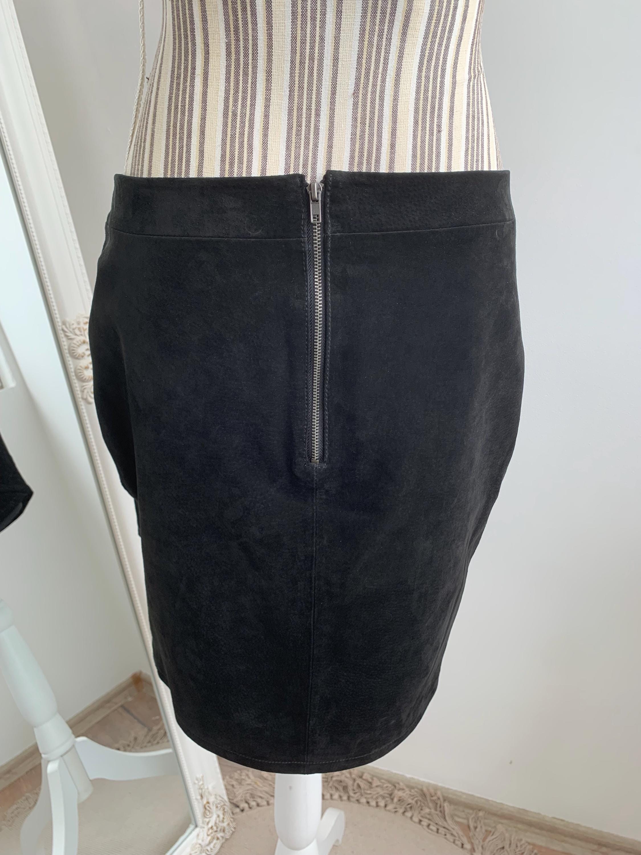 This is a vintage 90s black suede leather skirt with tulip silhouette and above the knee length. This short suede leather skirt is made of super soft genuine suede leather. This boho suede leather skirt has polyester lining underneath. This black leather skirt is by the brand Saint Tropez. The size marked M. Please check the measurements below.
