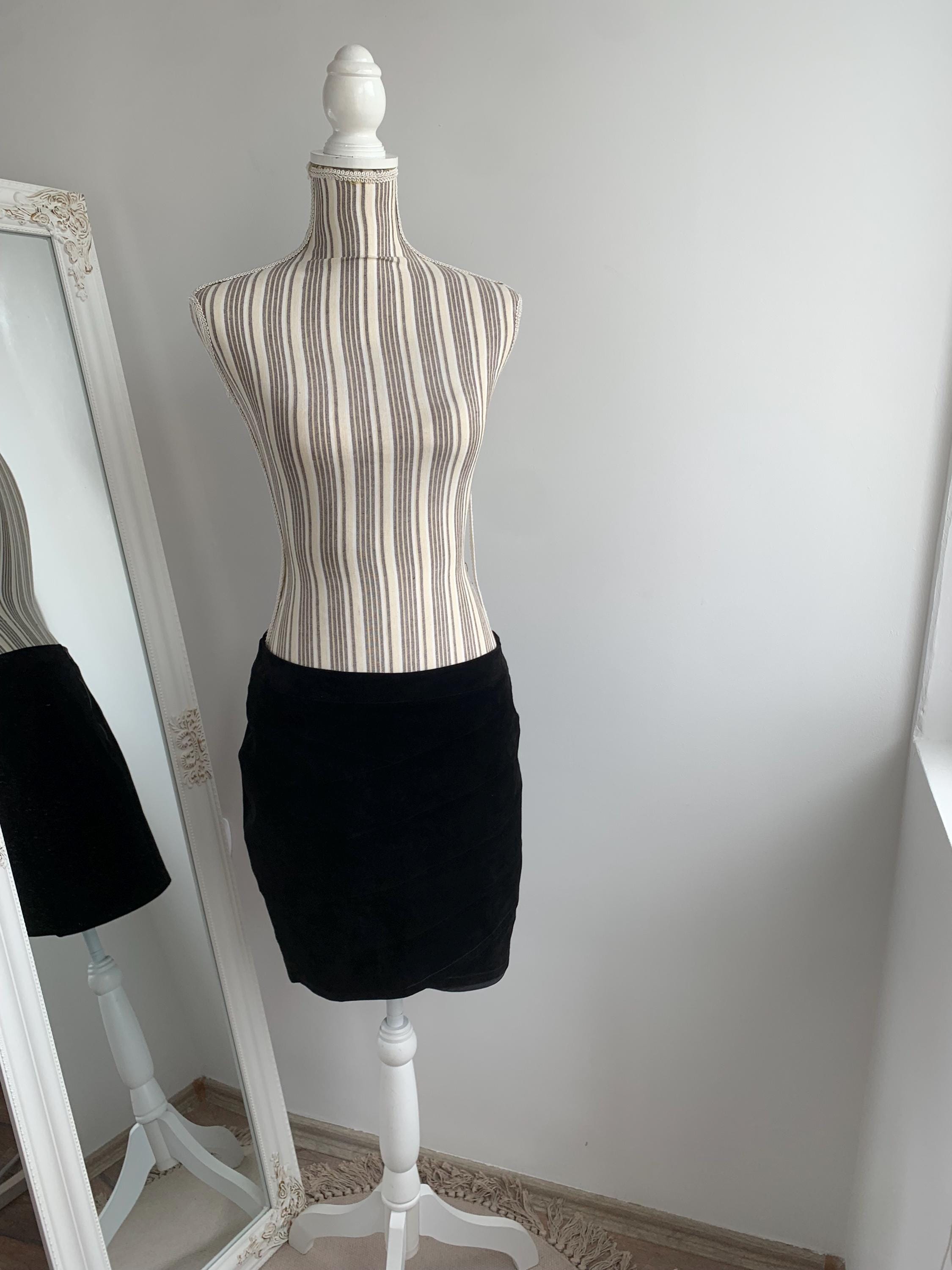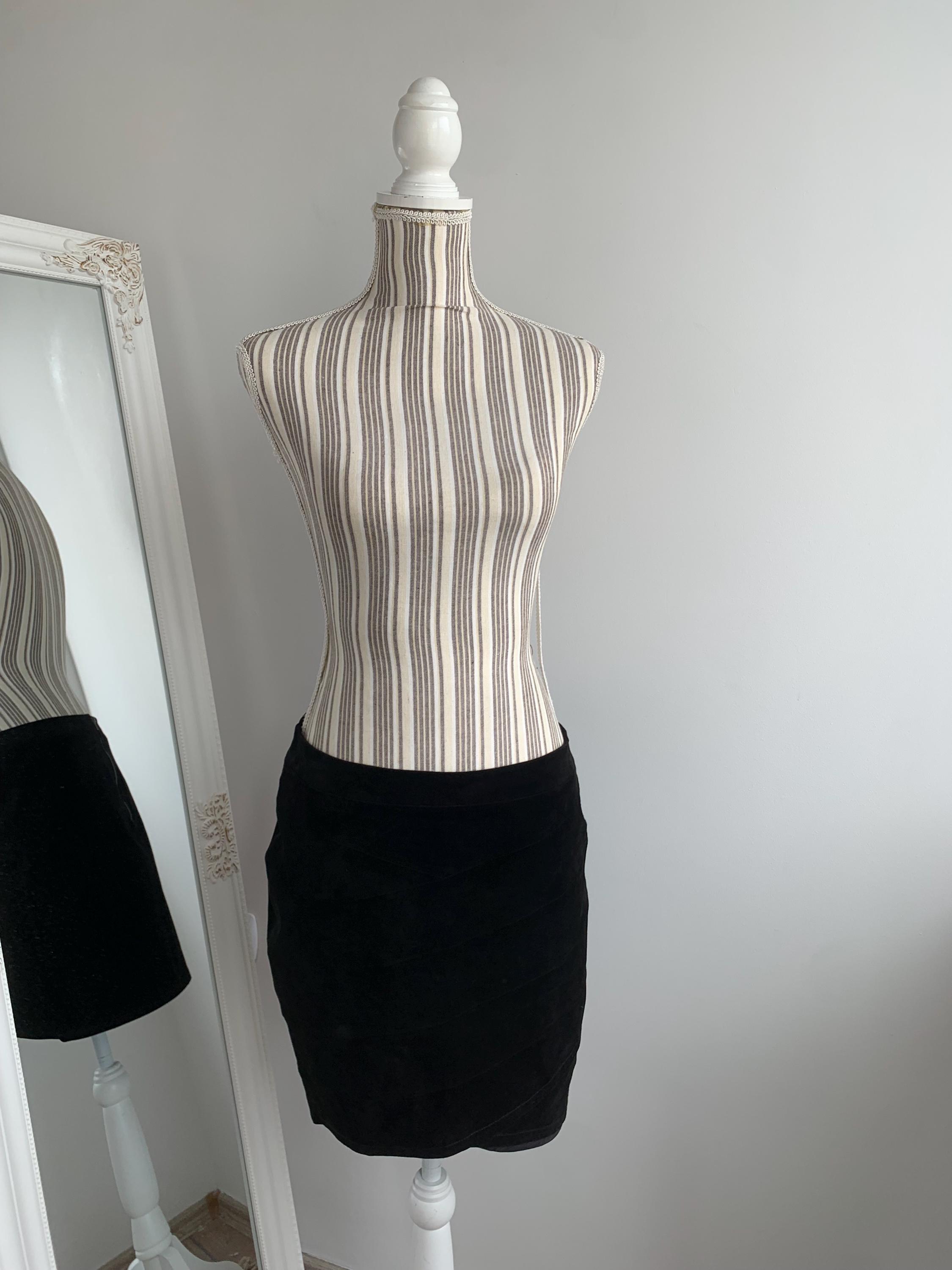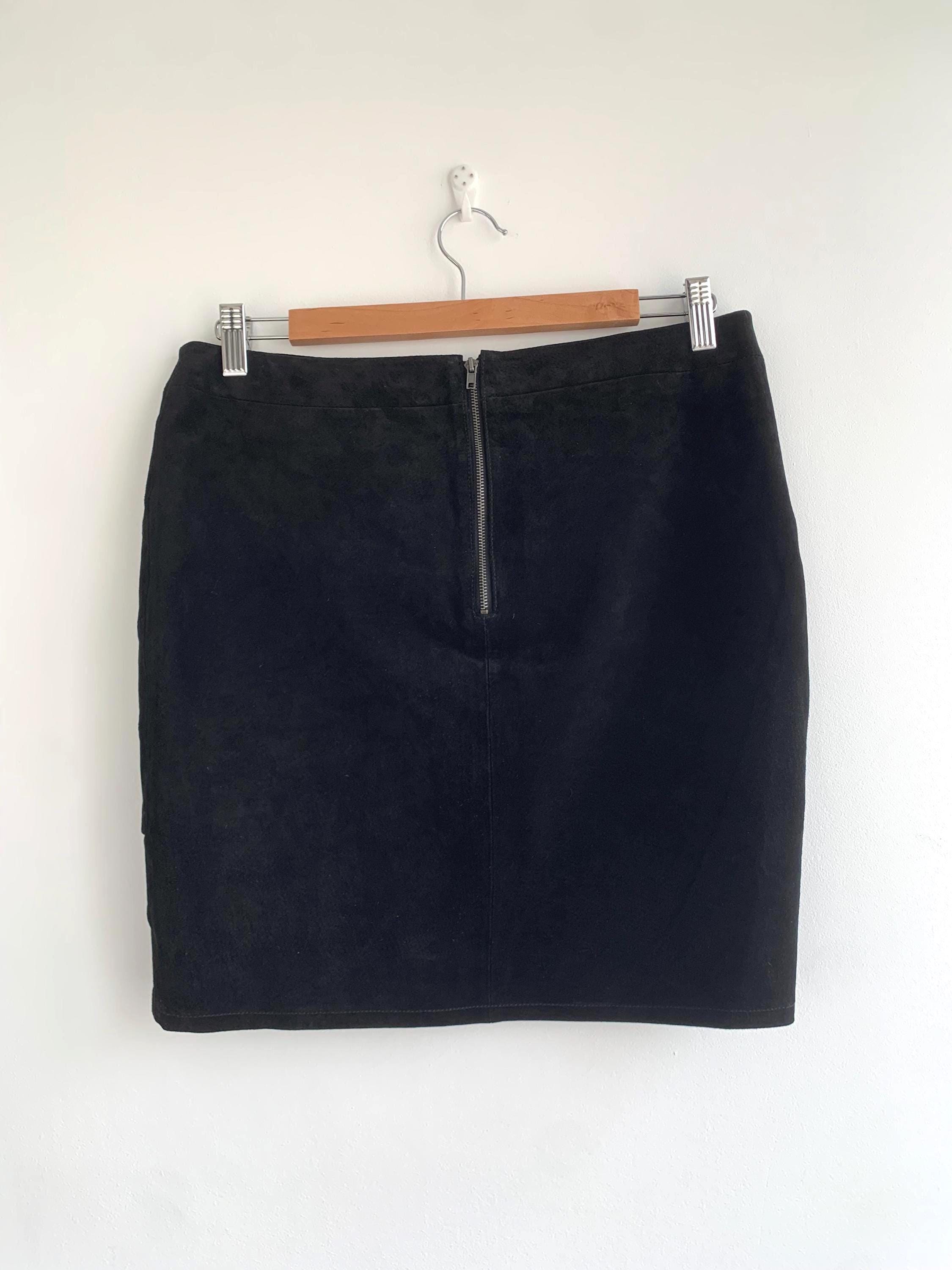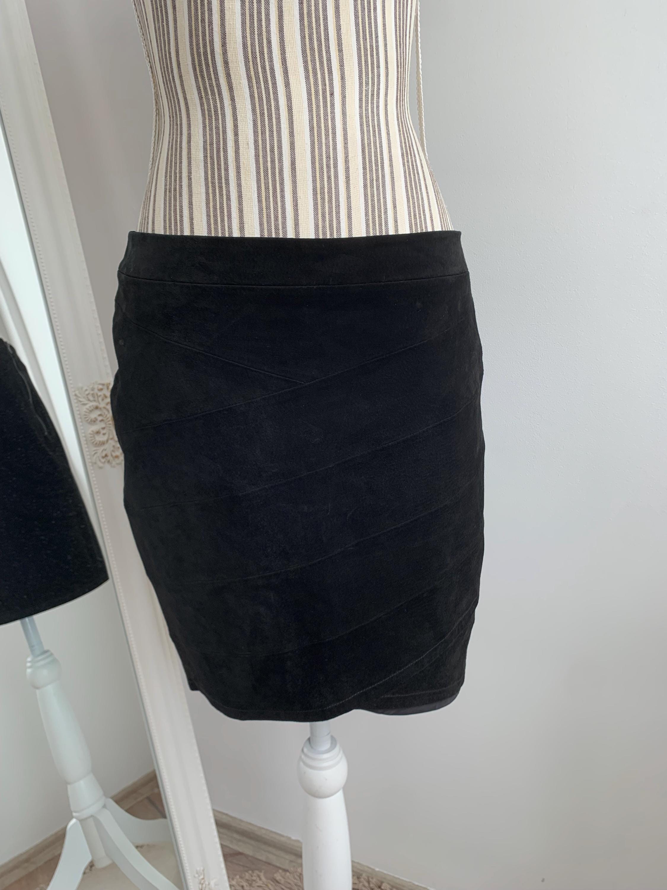 This is a vintage 90s black suede leather skirt with tulip silhouette and above the knee length. This short suede leather skirt is made of super soft genuine suede leather. This boho suede leather skirt has polyester lining underneath. This black leather skirt is by the brand Saint Tropez. The size marked M. Please check the measurements below.