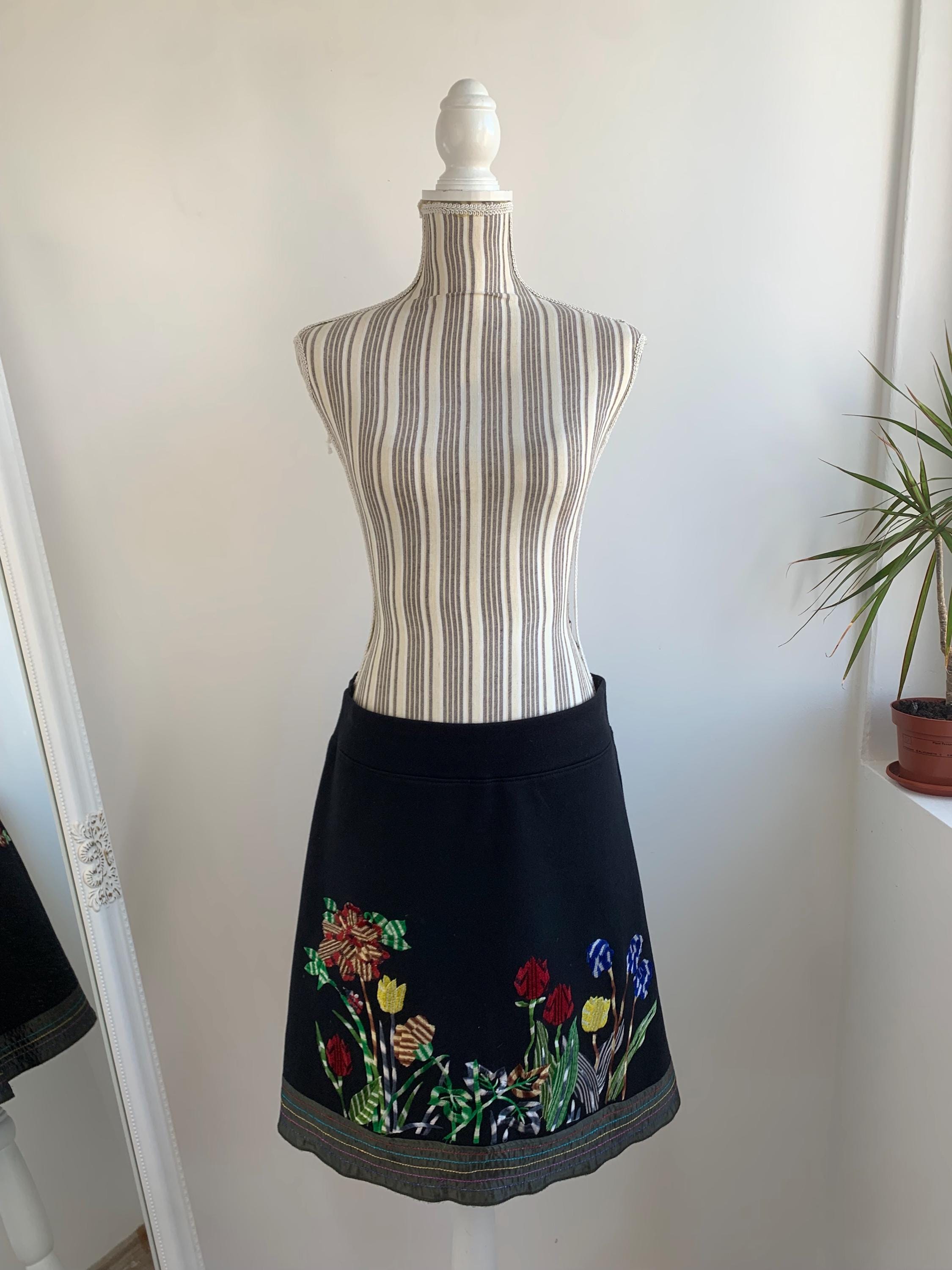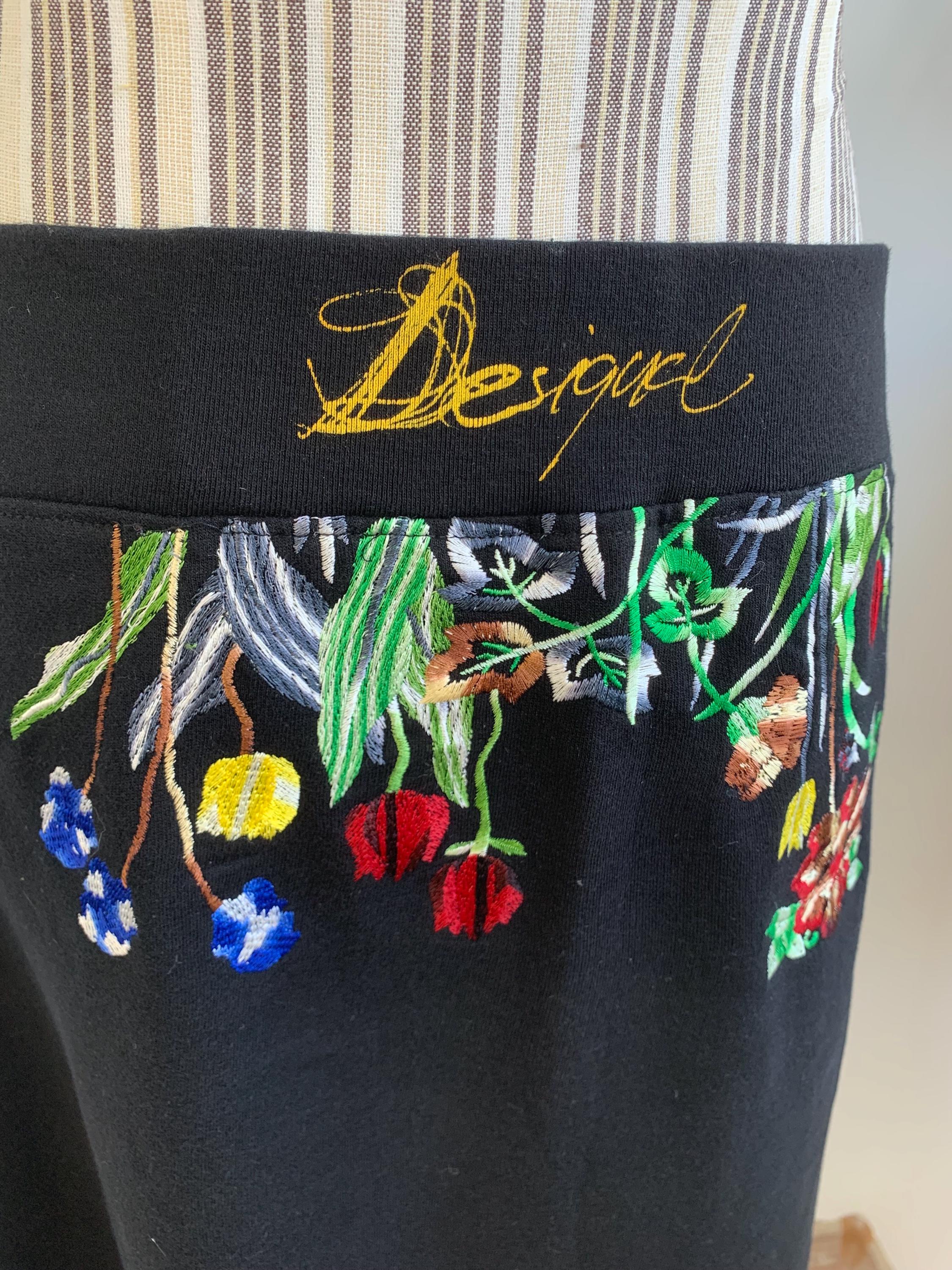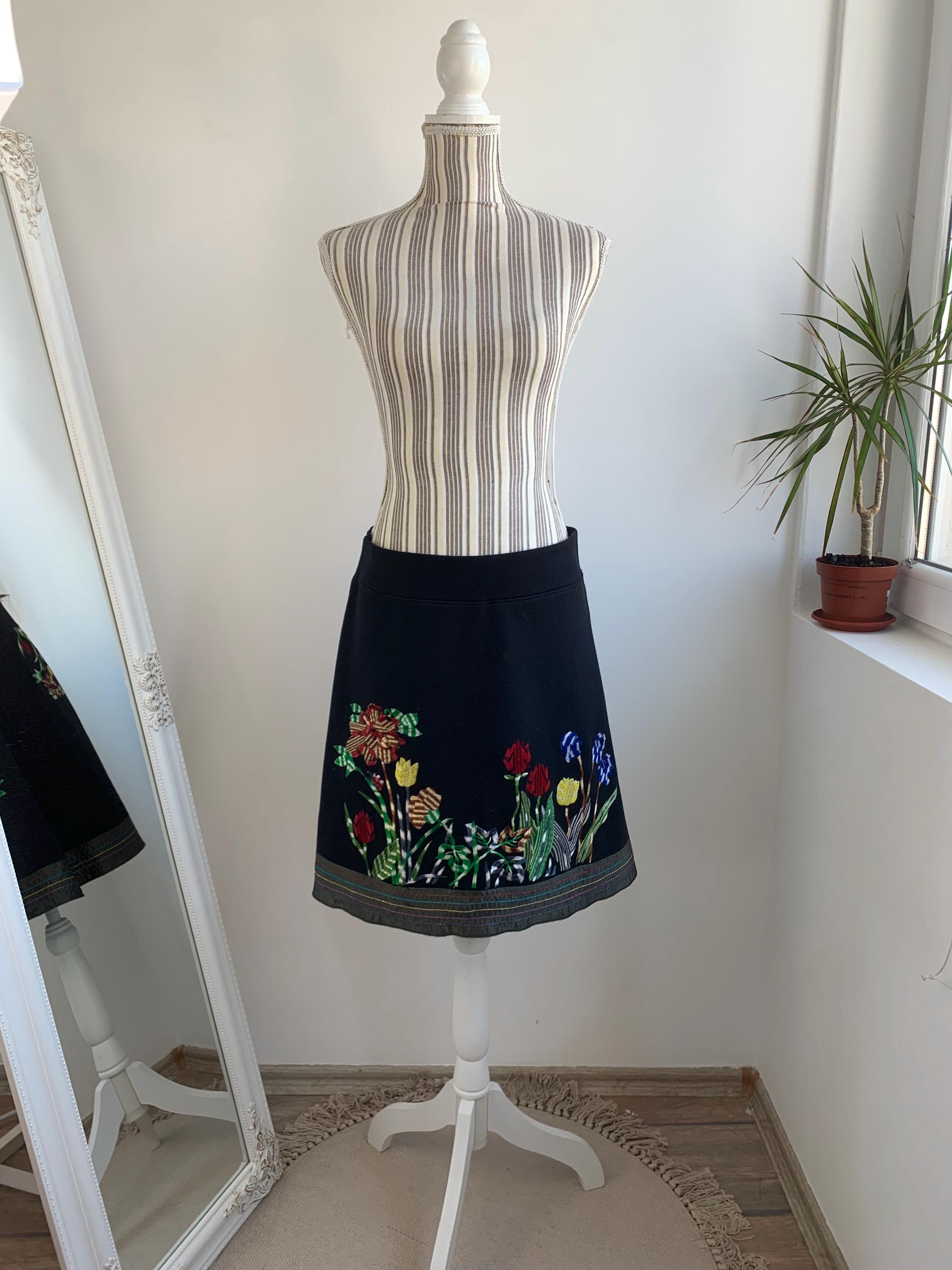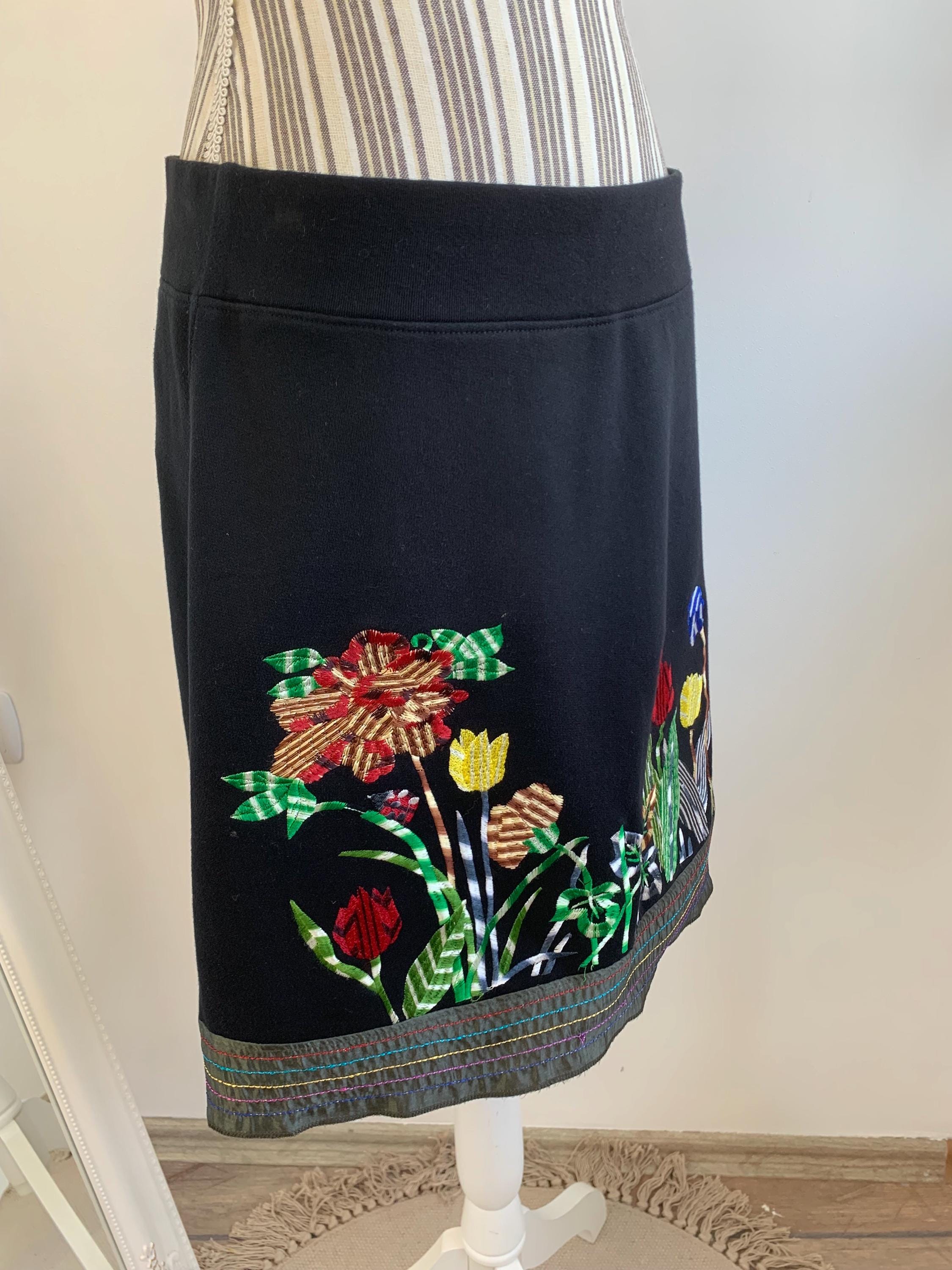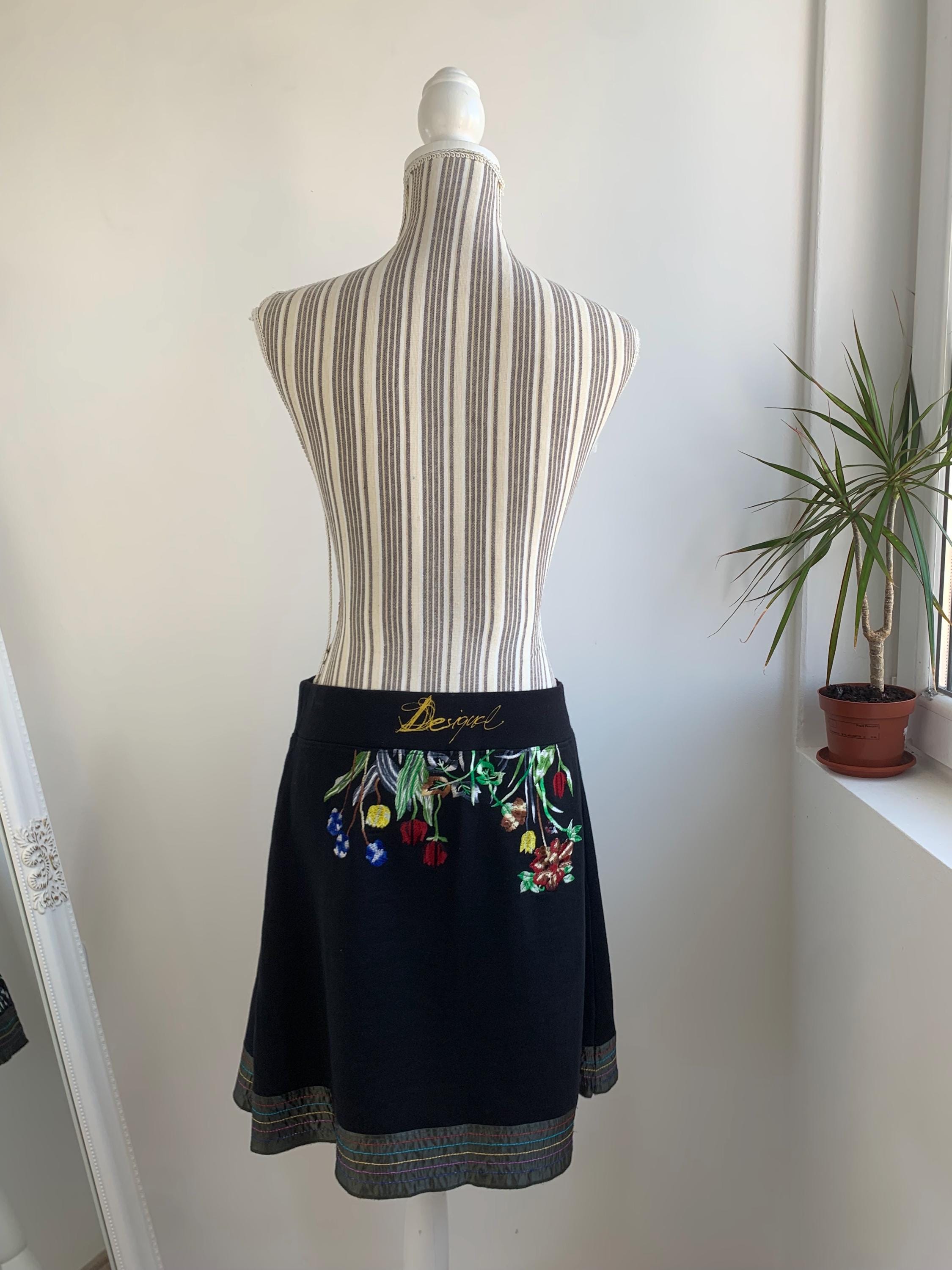 This is a vintage Y2K pre-loved cotton A line skirt with elastic waistline by DESIGUAL. This boho embroidery skirt has adorable floral embroidery in vibrant shades of red, yellow, blue and green. This embellished skirt has satin hemline. The size marked is M.
