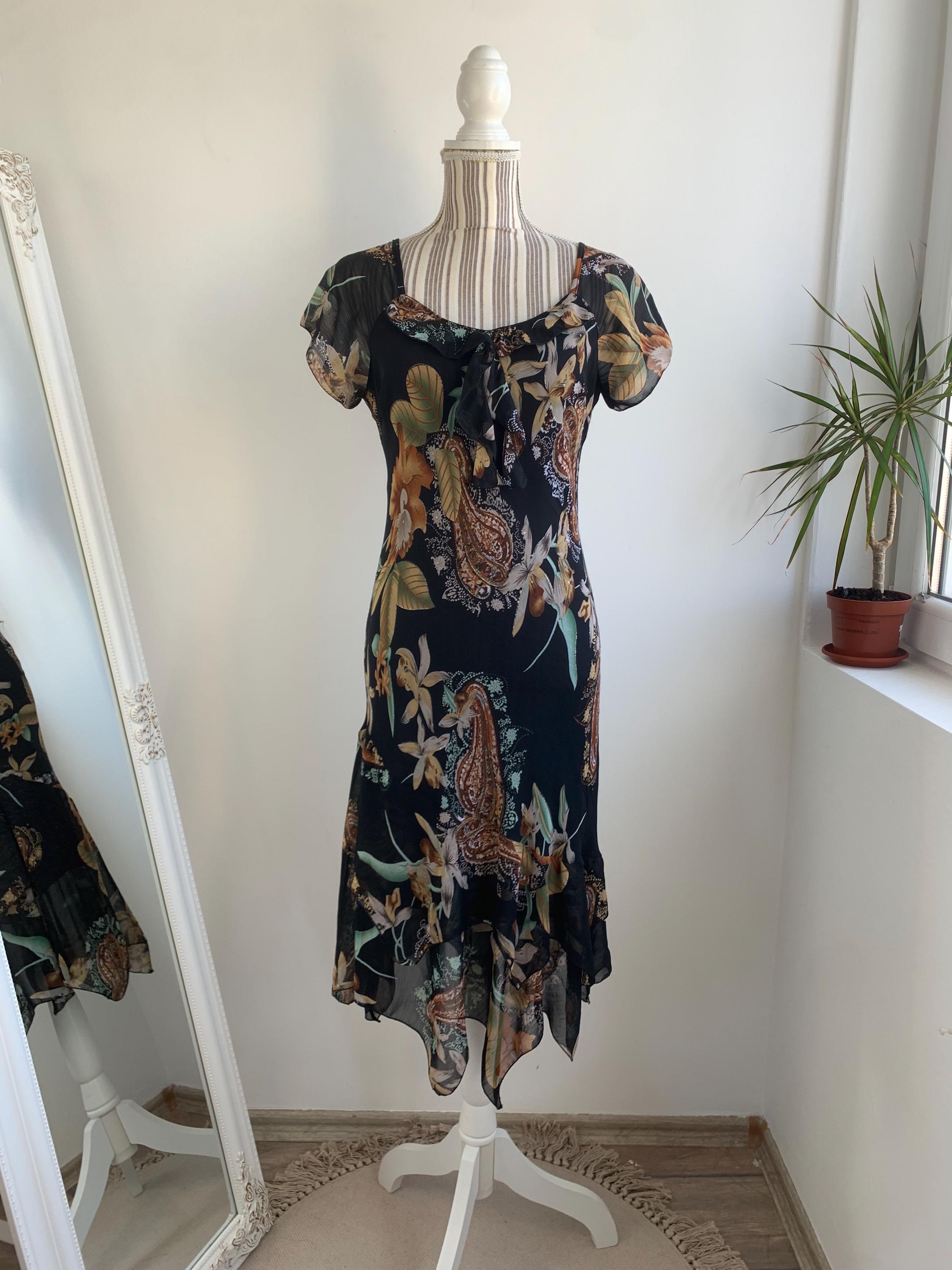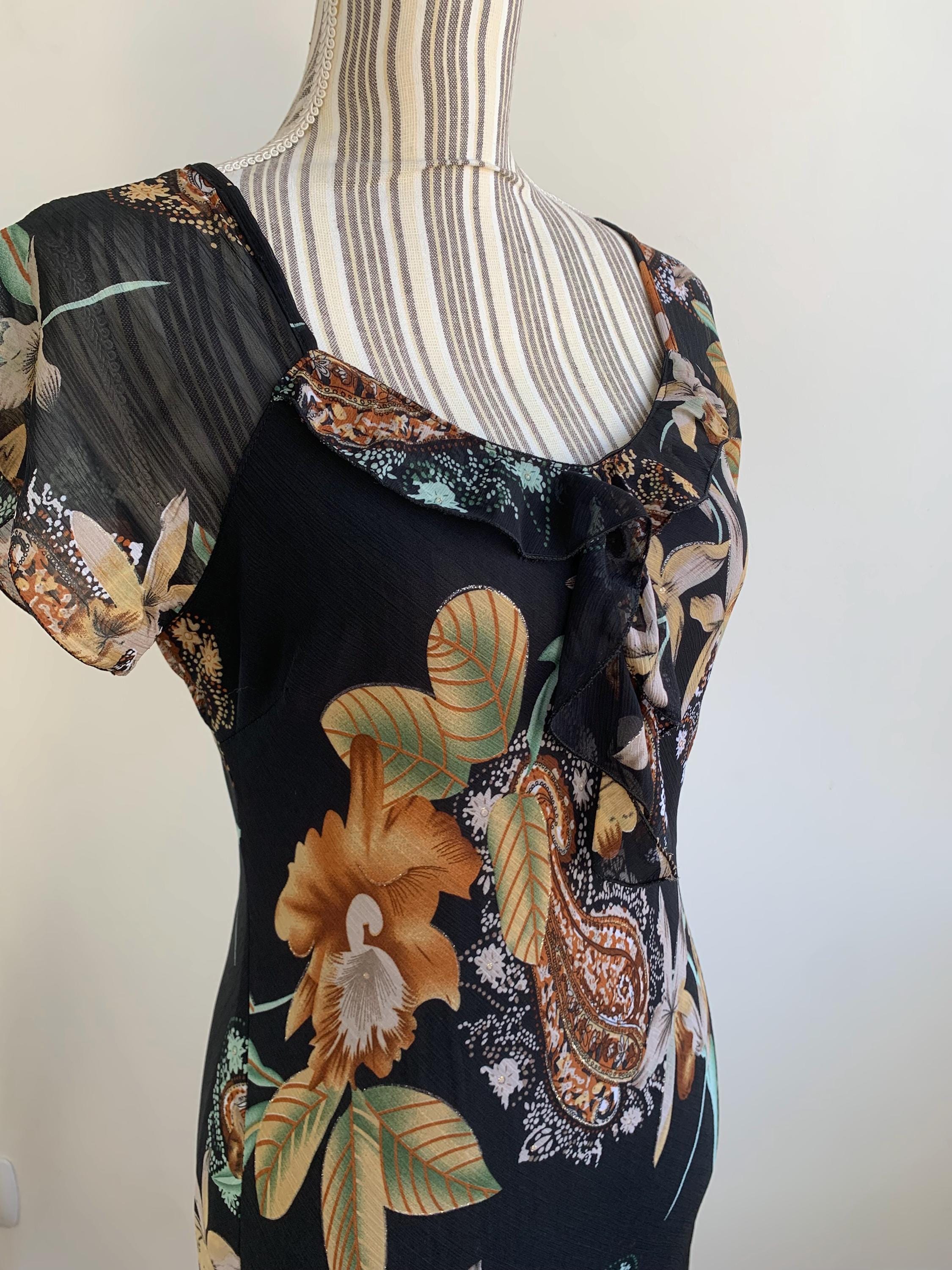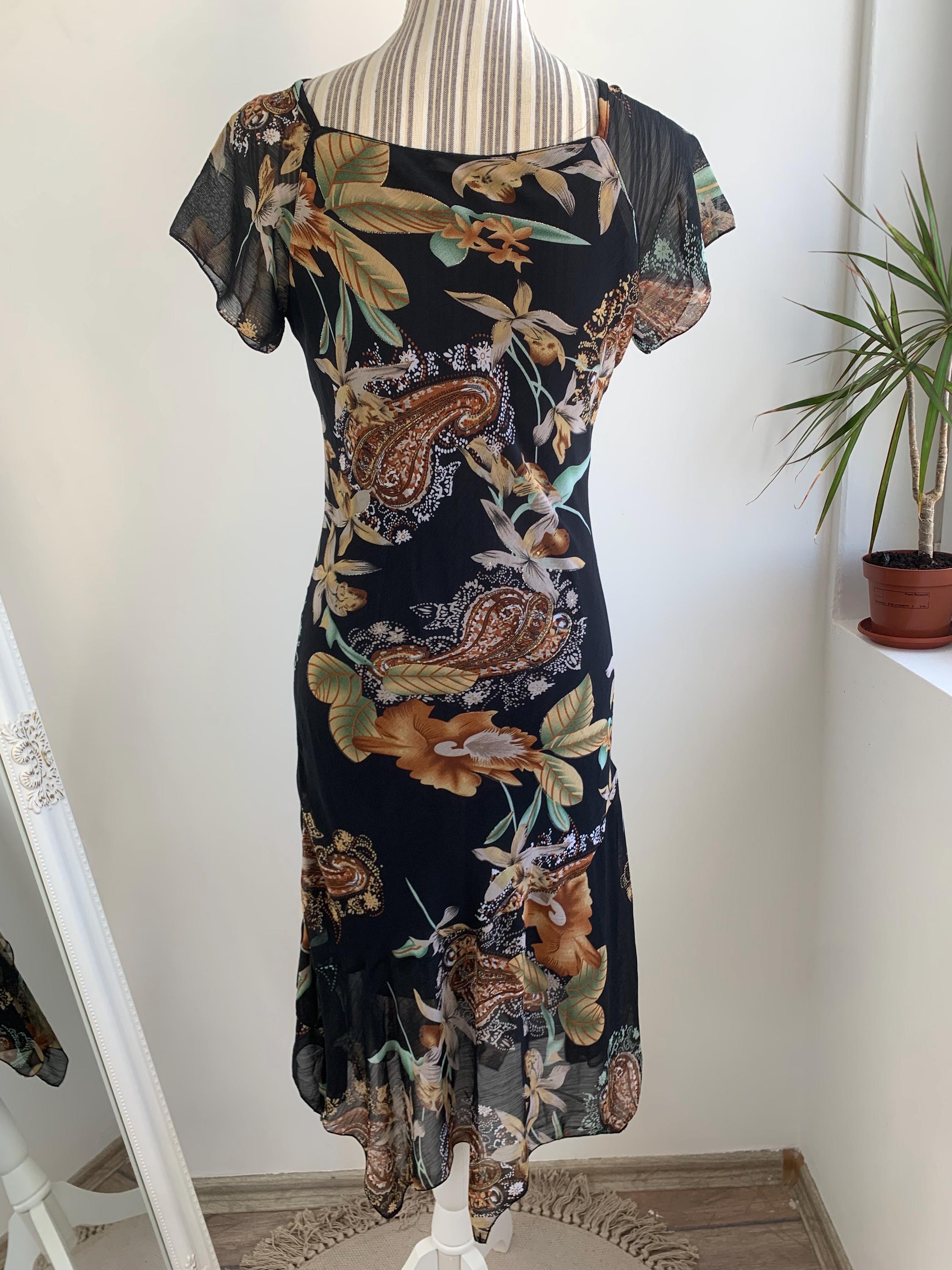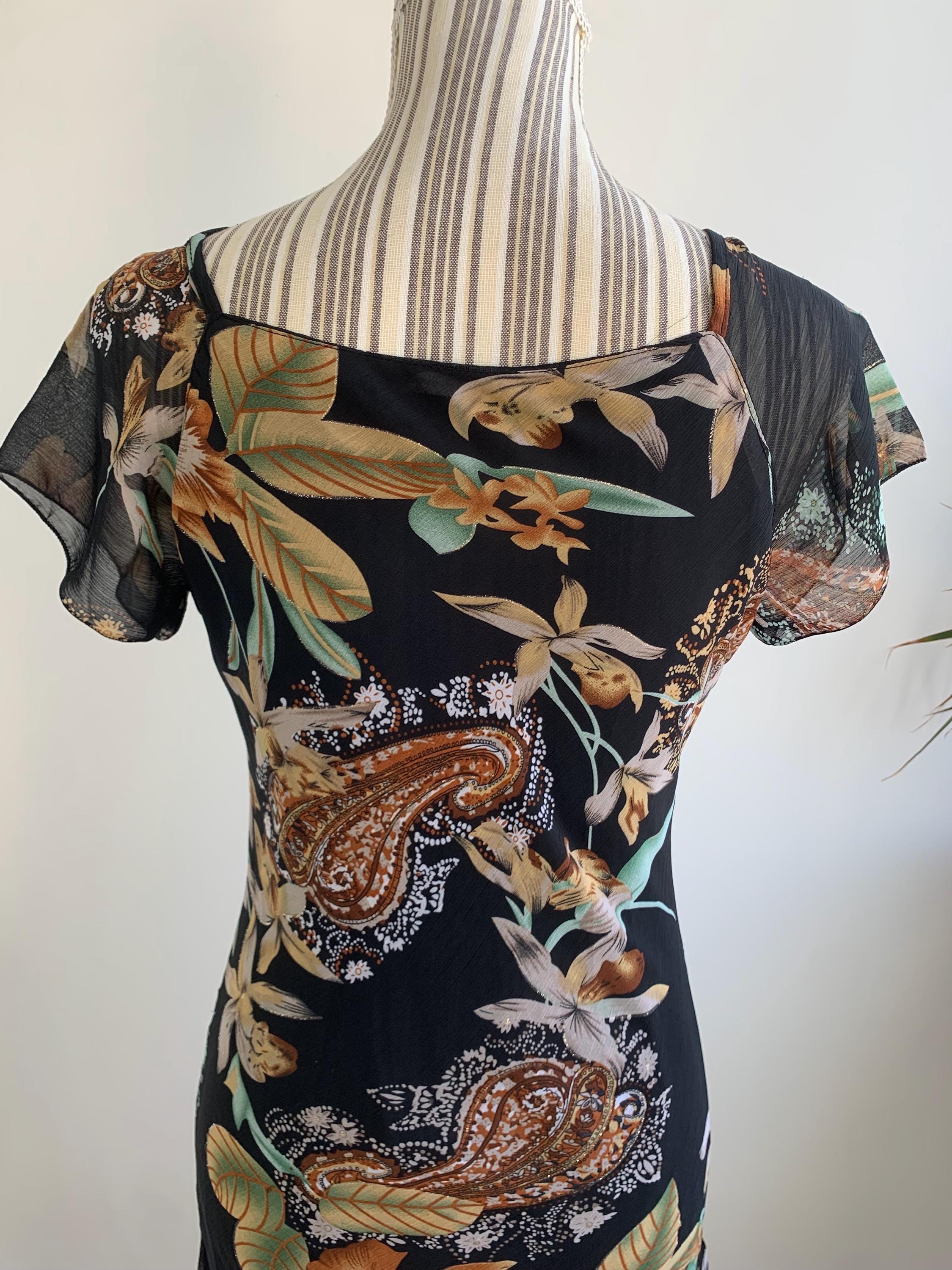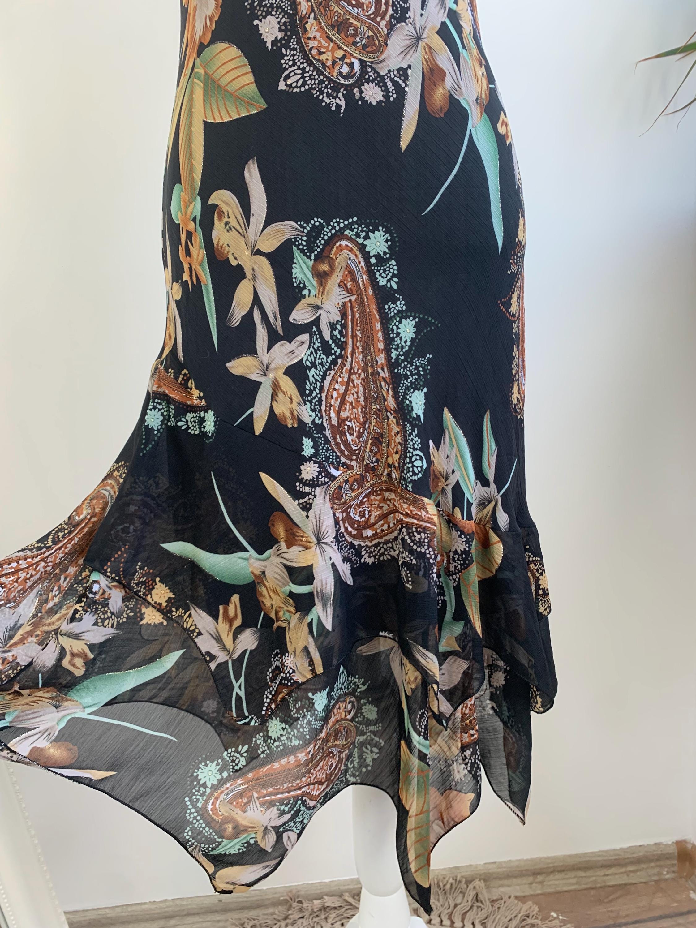 This is a beautiful vintage 90s/ Y2K paisley floral sun dress made of sheer fabric with lining underneath. This gorgeous feminine grunge dress has ruffled v neckline, fitted silhouette, short sleeves and asymmetrical hemline. This vintage midi dress has gorgeous floral paisley print in shades of black, beige, brown, gold and teal with gold tone glitter. The size marked on this elegant dress is L, however it would best fit sizes S or M. Please check the measurements below.