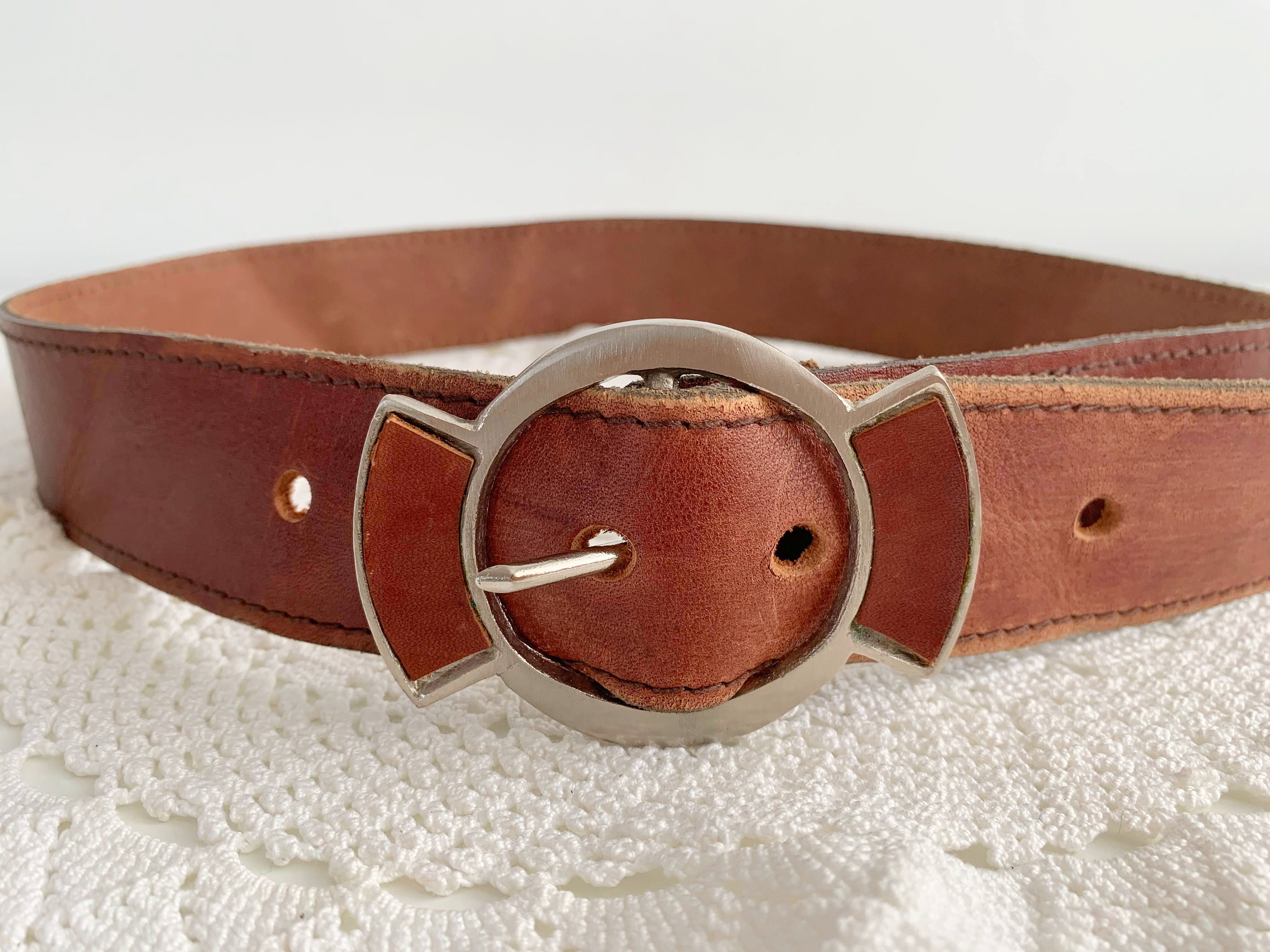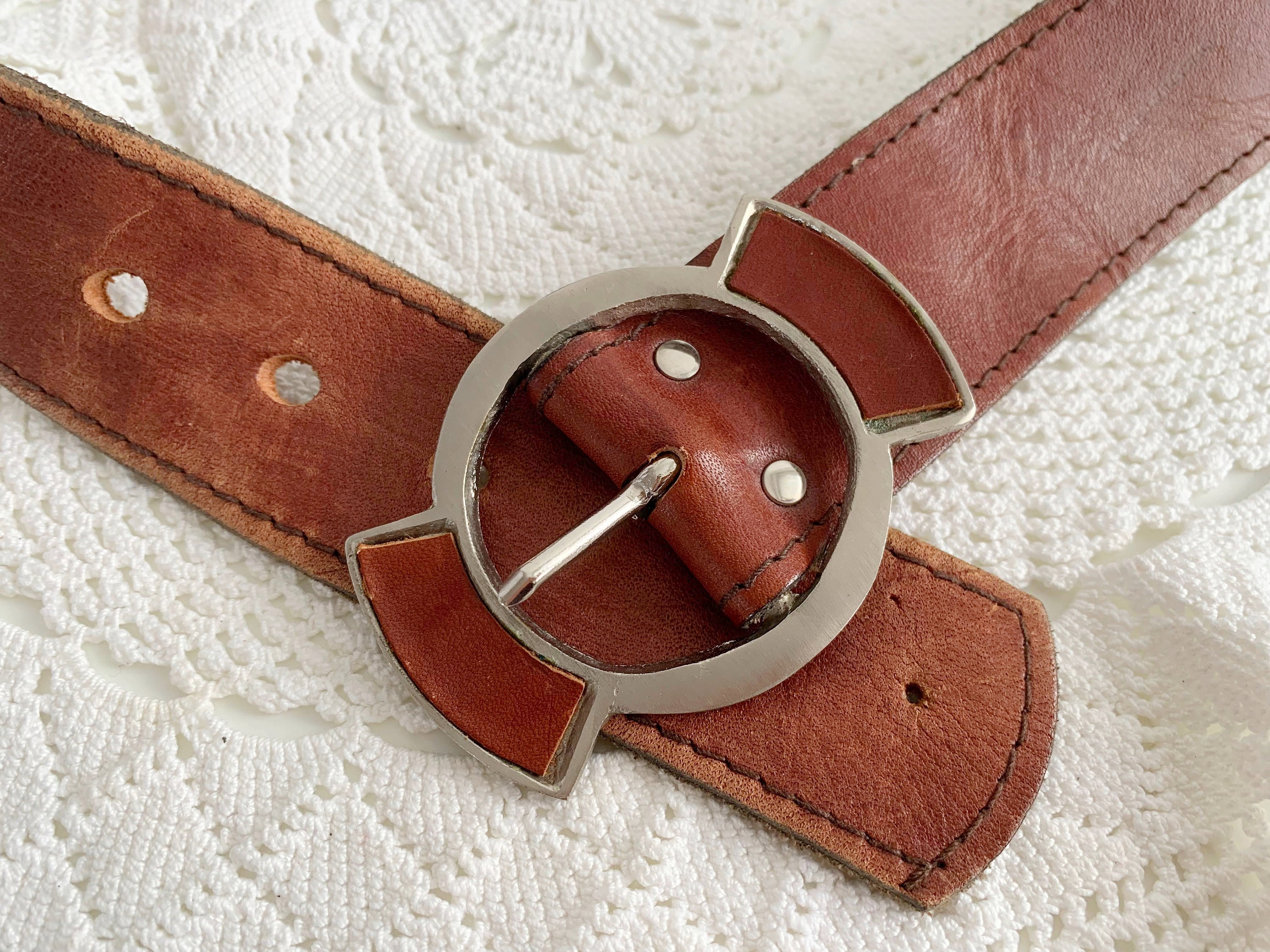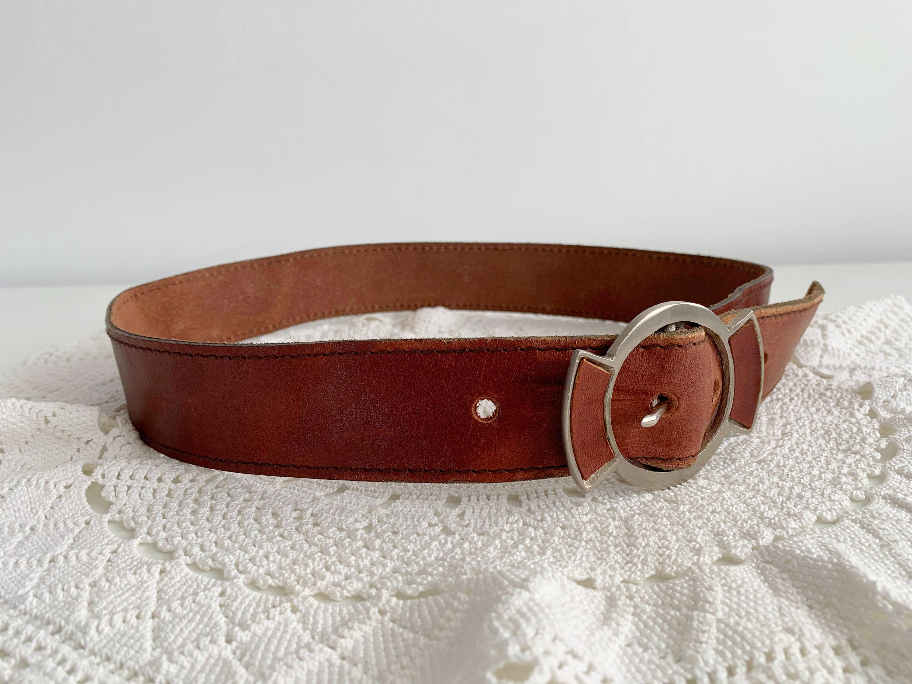 This is a vintage brown leather belt with unique silver tone leather buckle with candy like shape. This women's leather waist belt is perfect to wear with jeans, skirts or dresses. This distressed leather belt is made of genuine leather in cognac brown color with silver tone metal buckle. There is no size marked on the belt. It can adjust from 29.5" / 75 cm to 34.6" / 88 cm. This aged leather jeans belt is 1.6" / 4 cm wide.