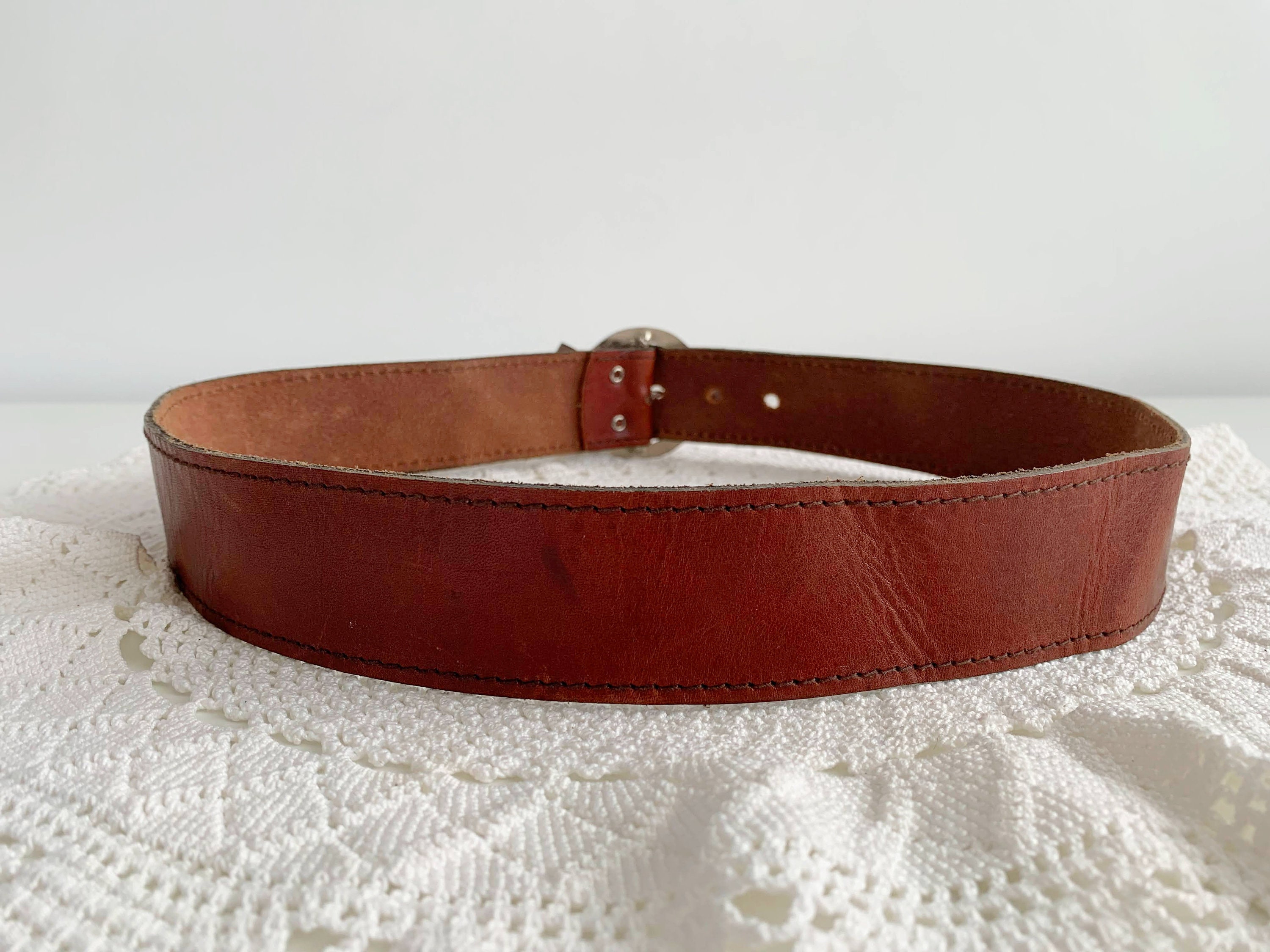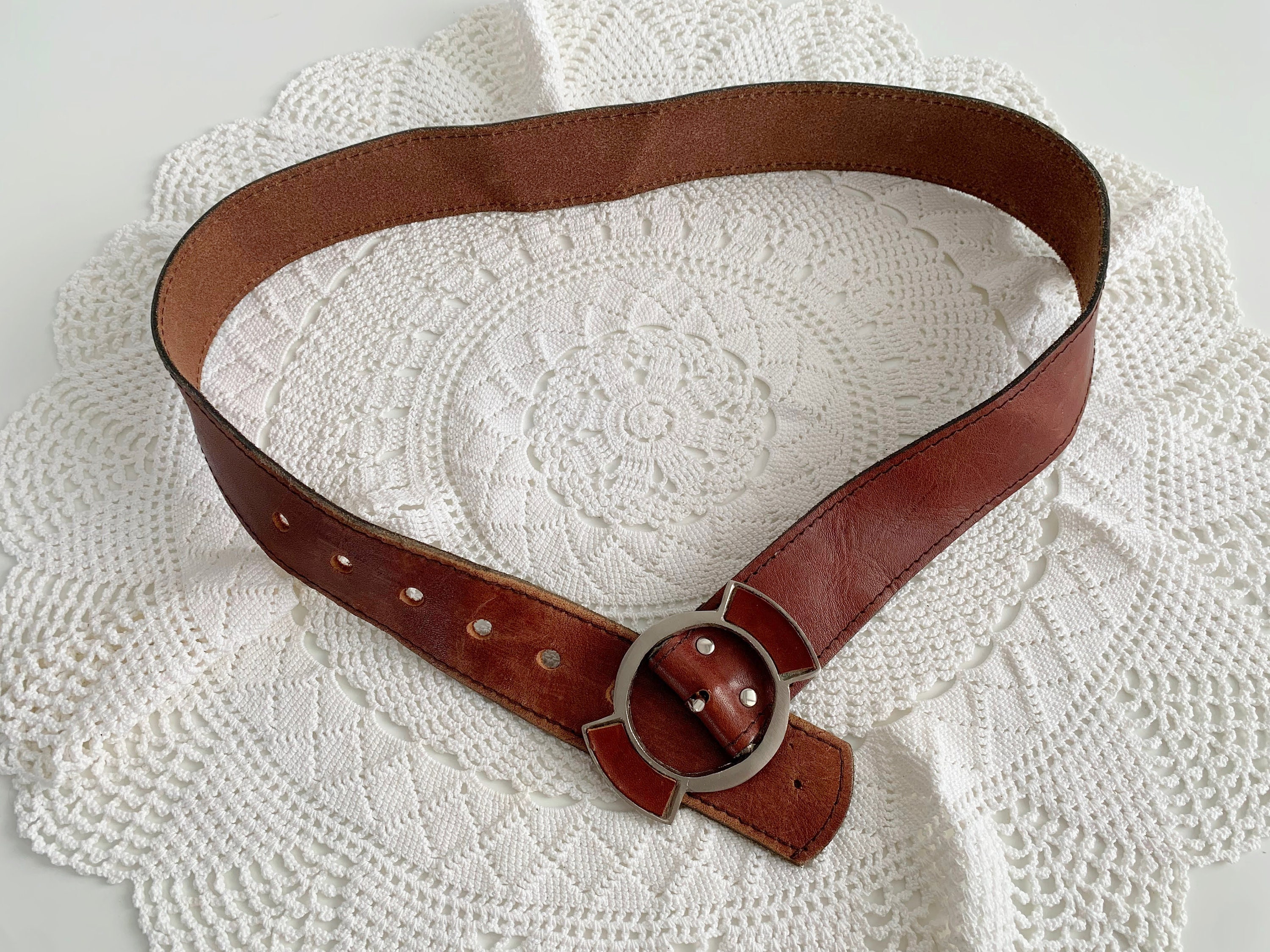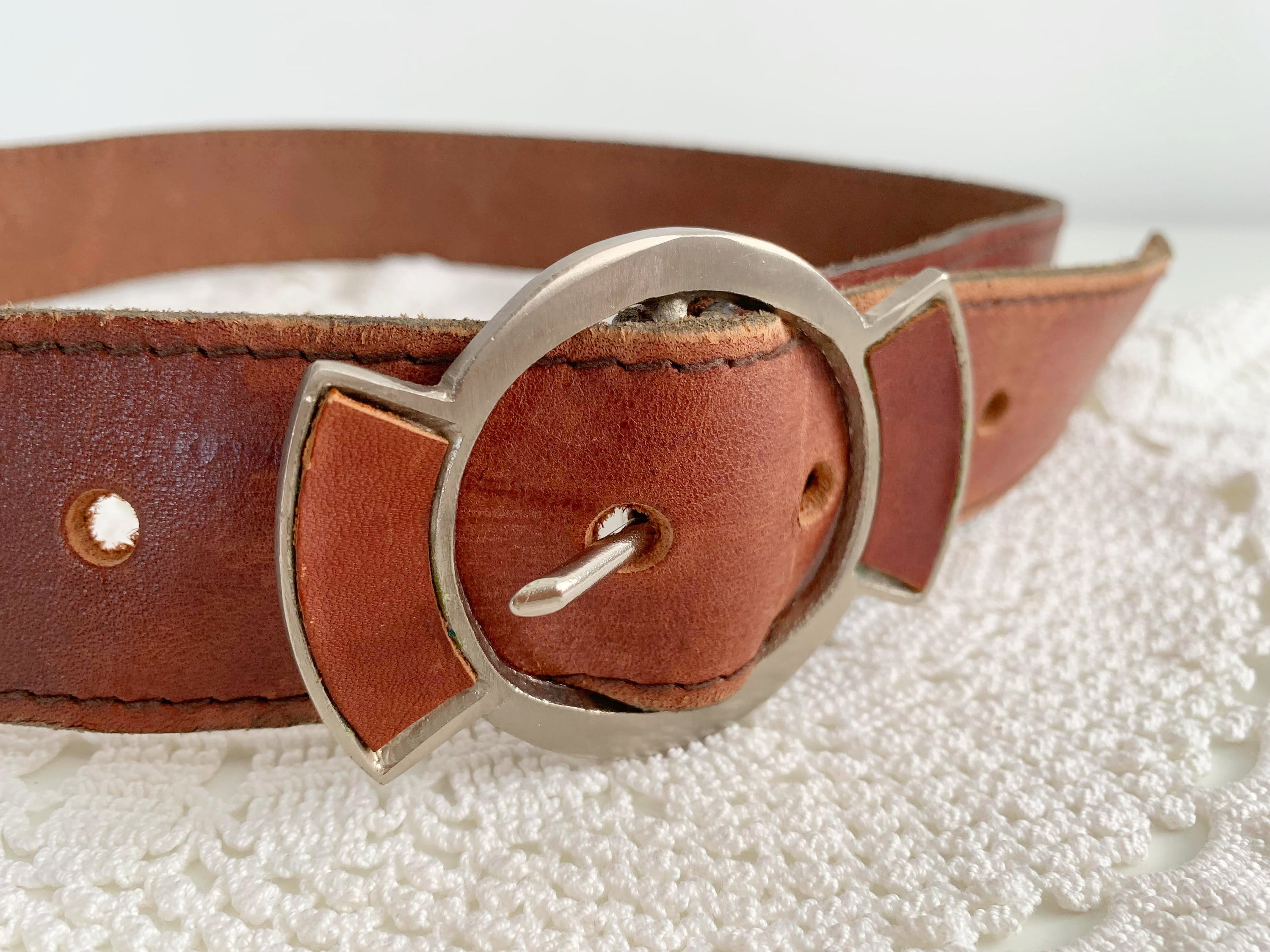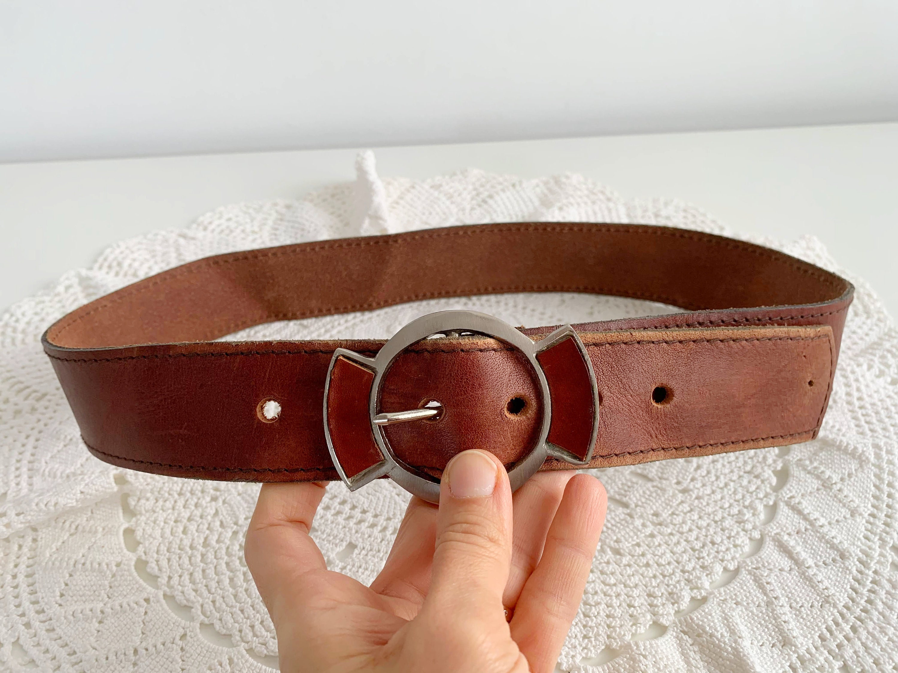 This is a vintage brown leather belt with unique silver tone leather buckle with candy like shape. This women's leather waist belt is perfect to wear with jeans, skirts or dresses. This distressed leather belt is made of genuine leather in cognac brown color with silver tone metal buckle. There is no size marked on the belt. It can adjust from 29.5" / 75 cm to 34.6" / 88 cm. This aged leather jeans belt is 1.6" / 4 cm wide.