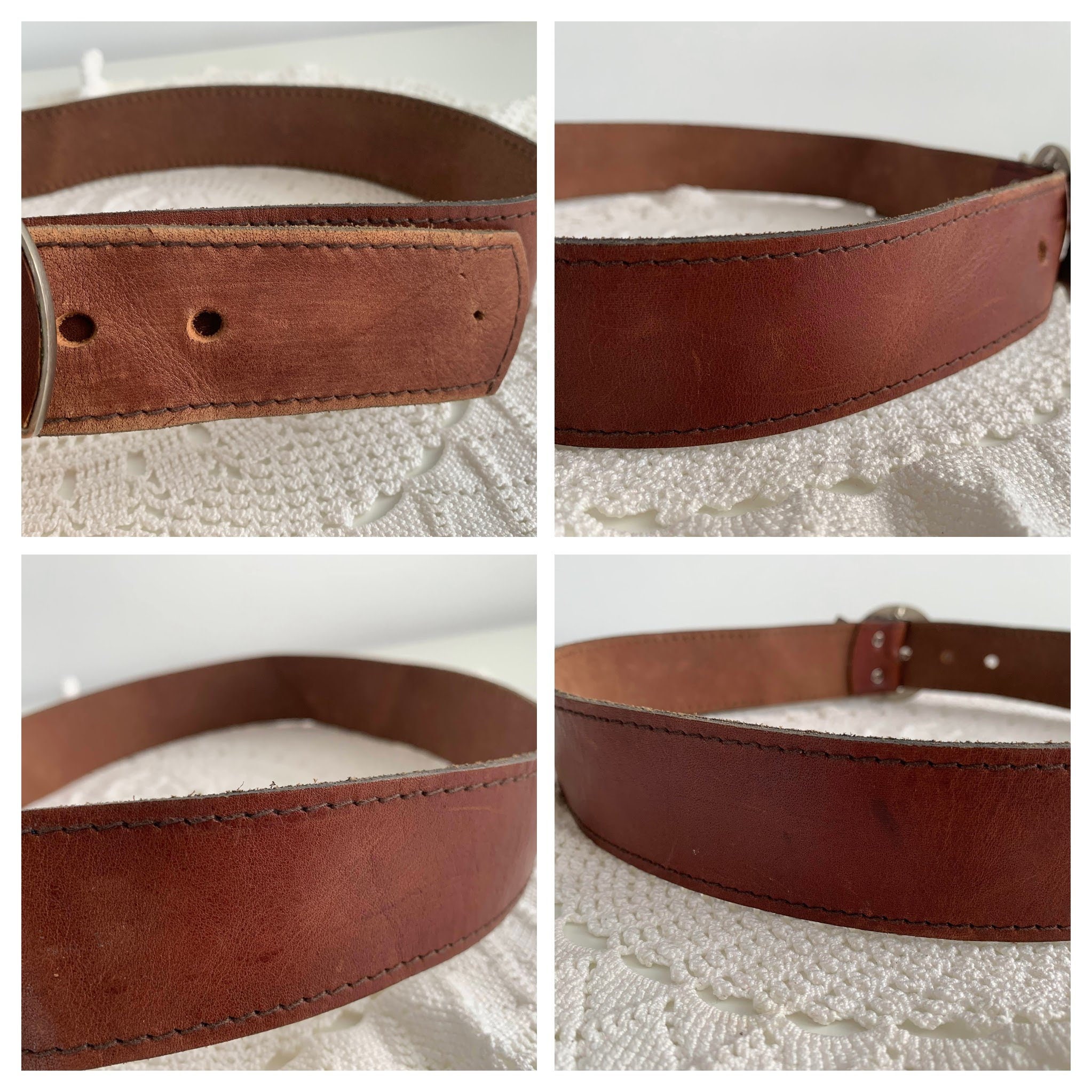Condition: The leather has a beautifully distressed look with some scratches on the leather surface and some fading around the edges. These signs of wear add to the character of this belt. The silver tone belt buckle is beautifully worn as well with scratches on the metal surface.