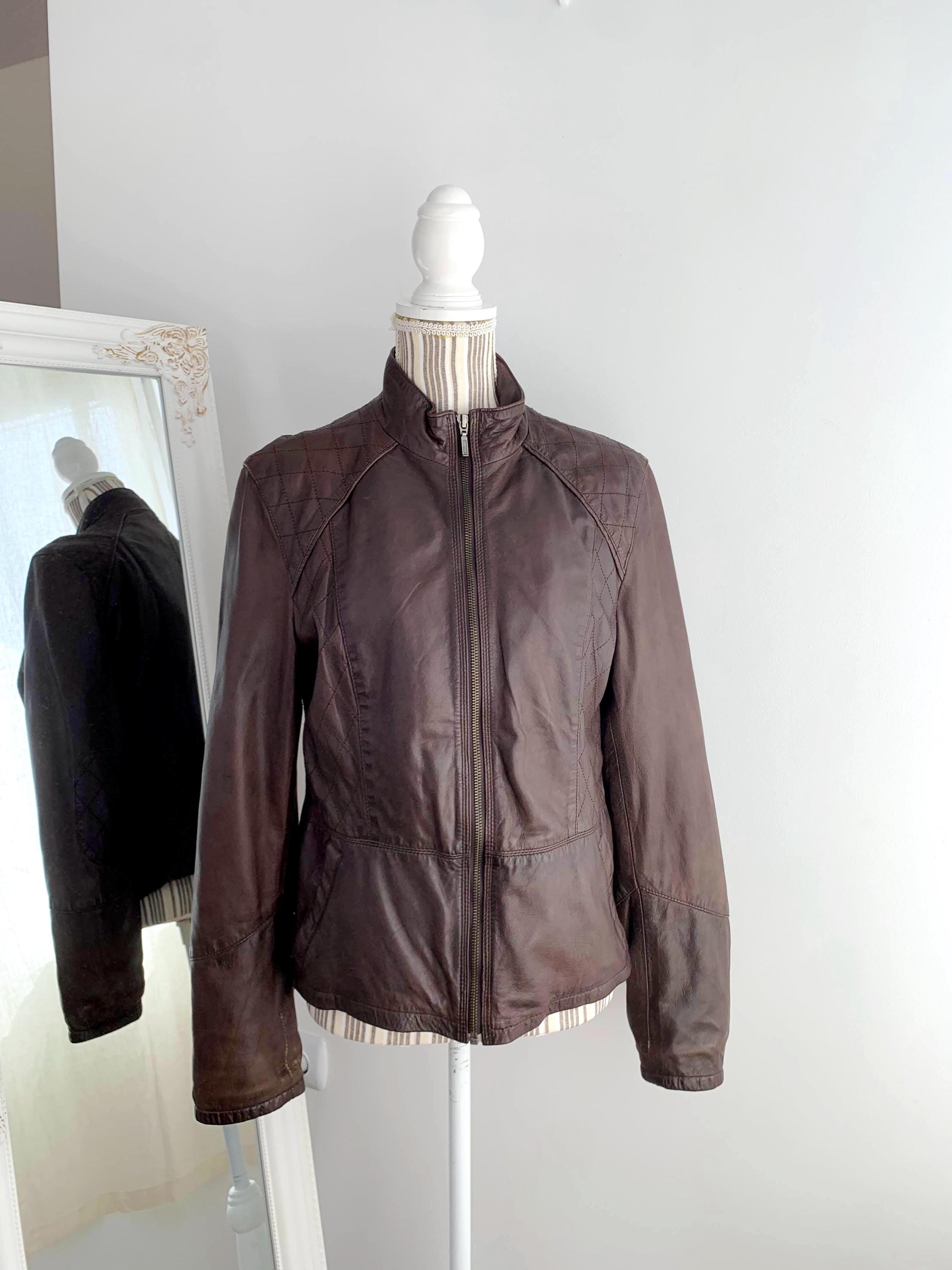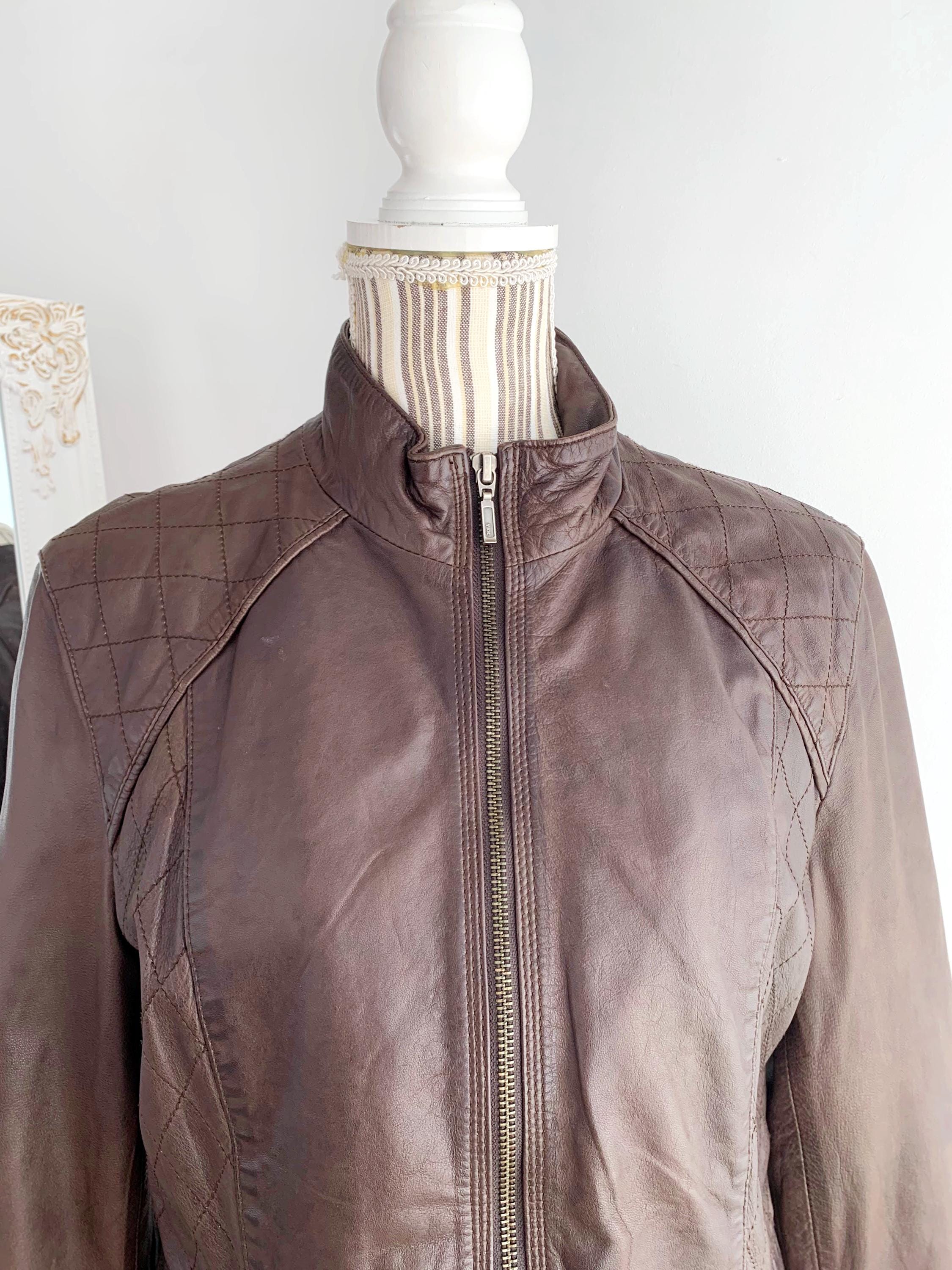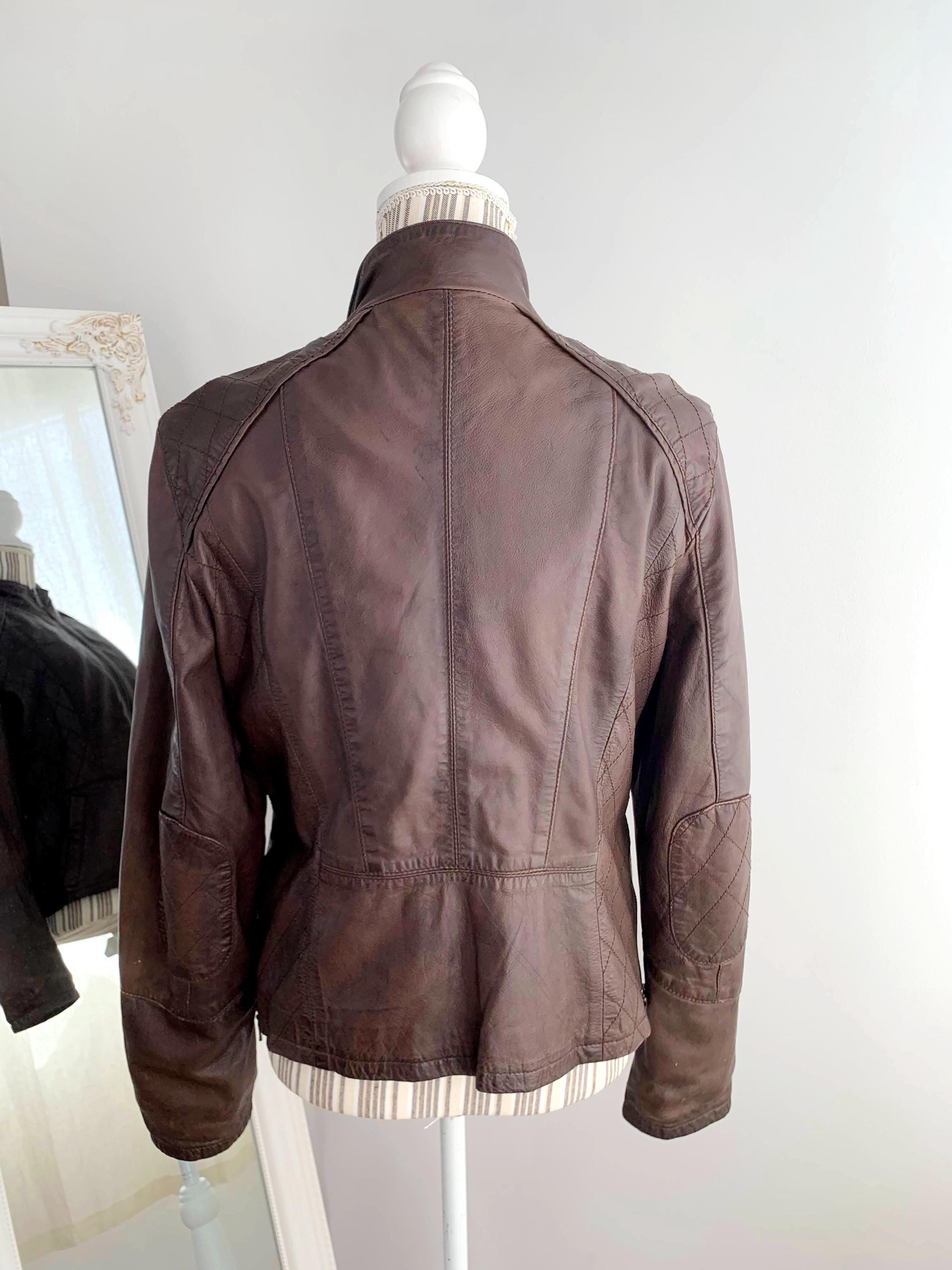 This is a vintage Y2K brown leather jacket for women with pockets and size zippers by the brand Carla F. This brown leather jacket is made of soft genuine leather in brown color with satin polyester lining underneath. This biker jacket is size 40 which fits like M/L. Please check the measurements below.