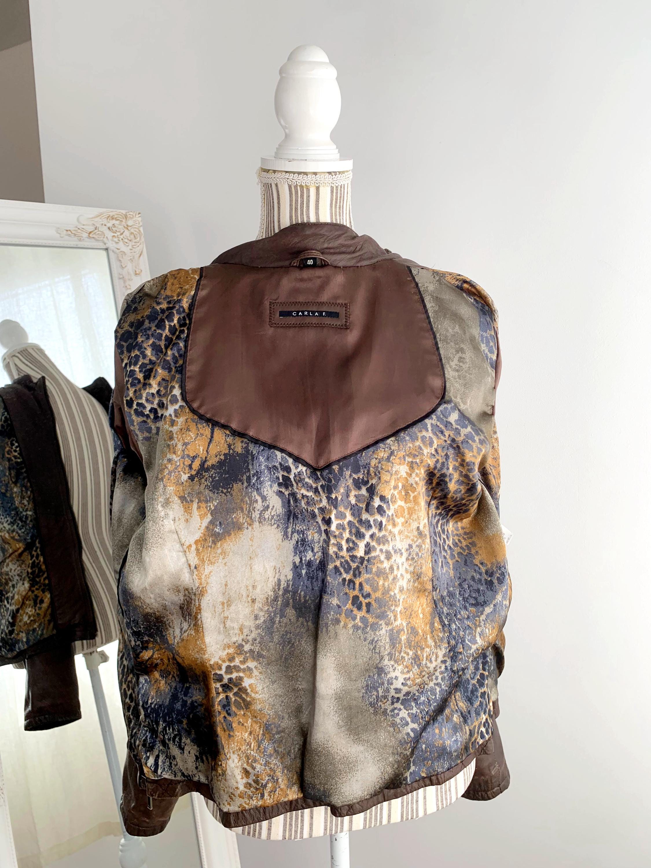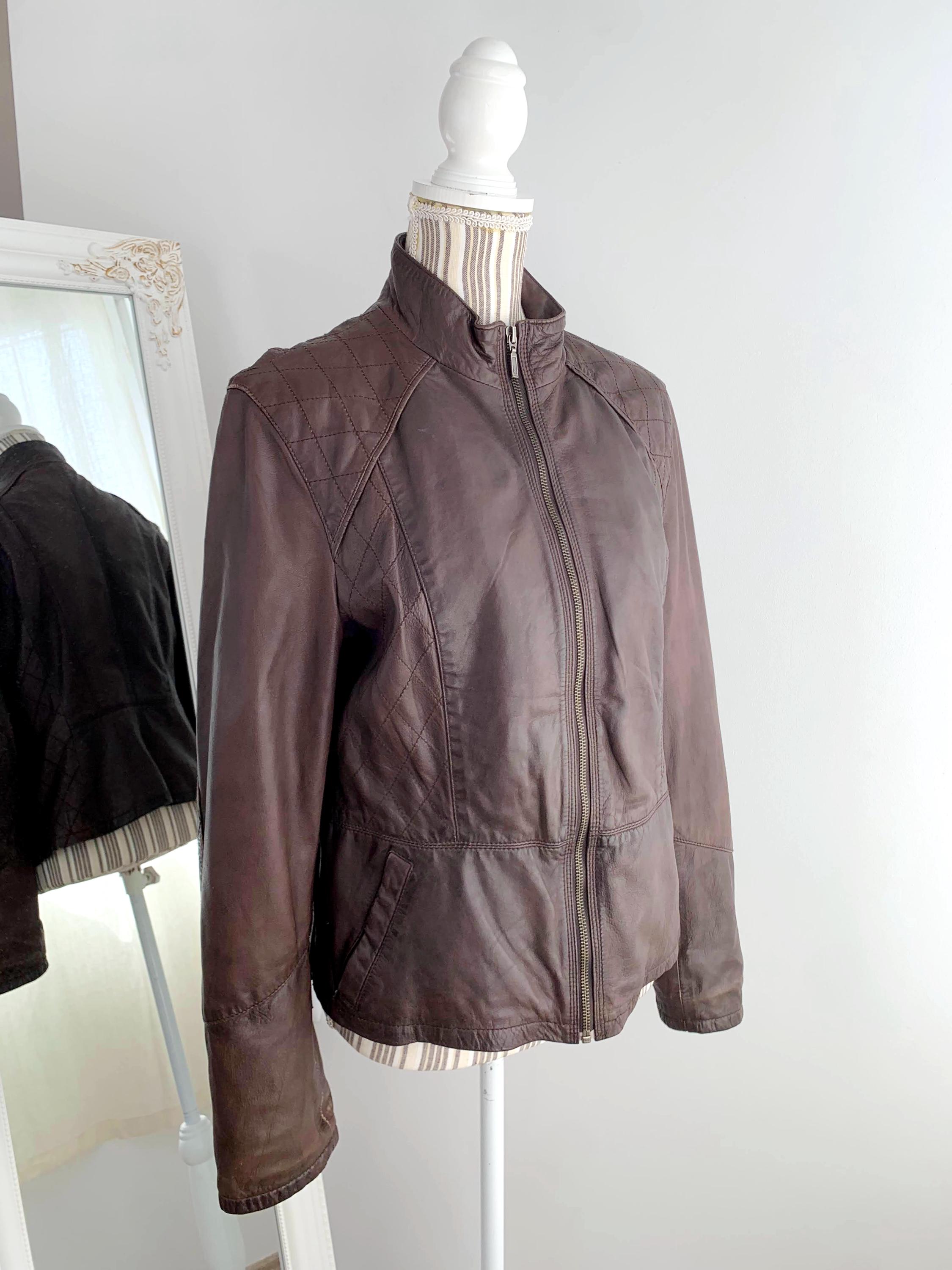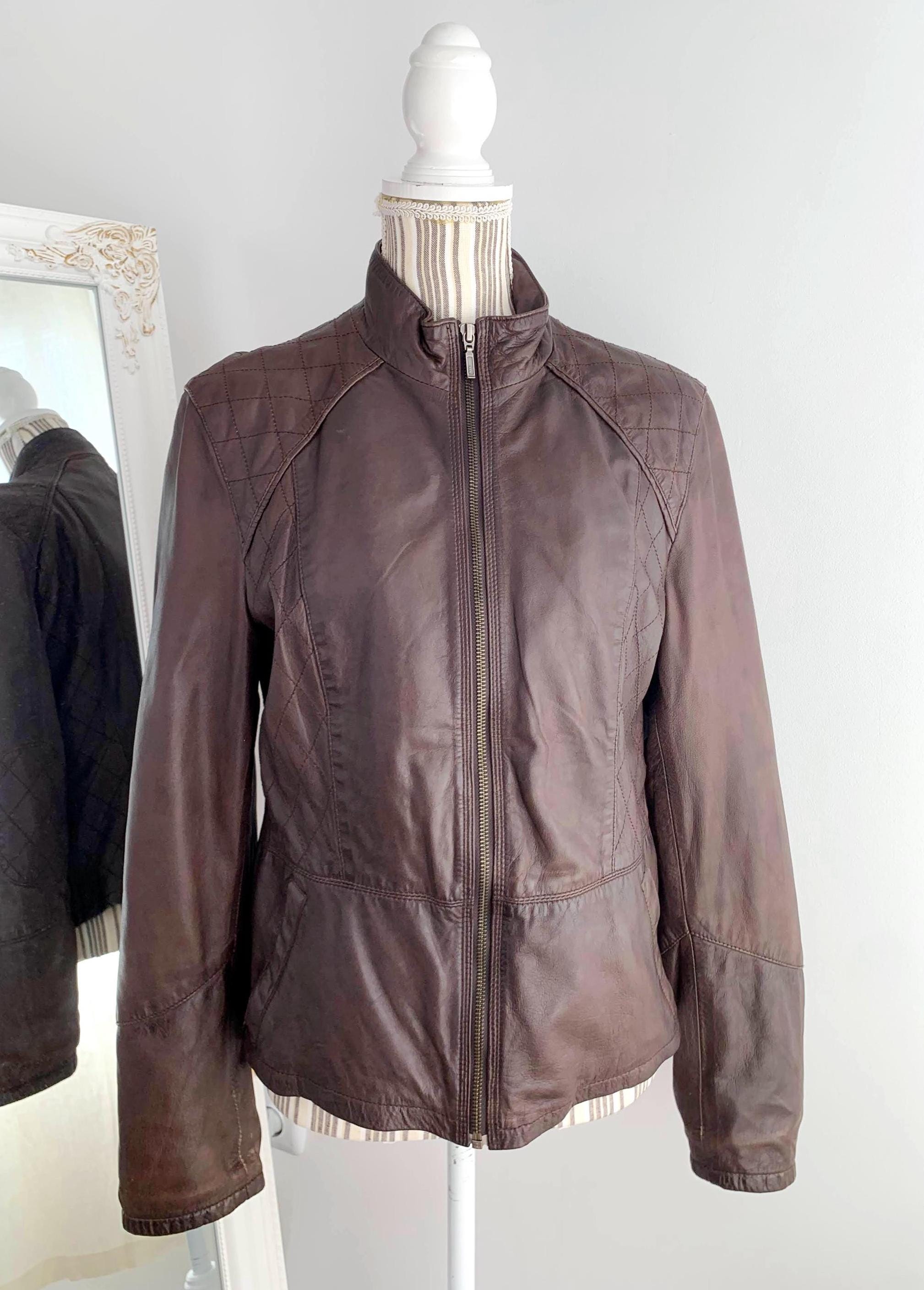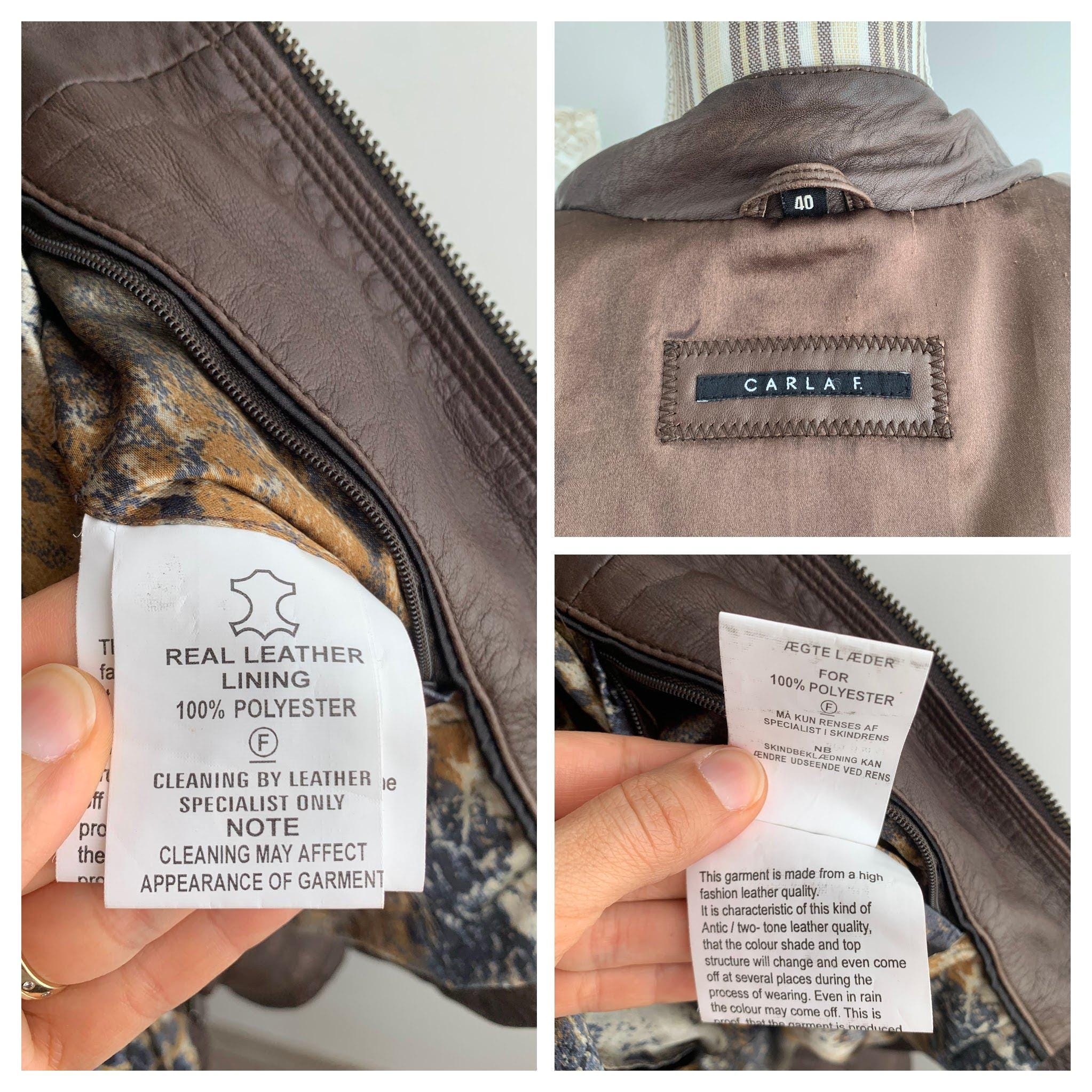This is a vintage Y2K brown leather jacket for women with pockets and size zippers by the brand Carla F. This brown leather jacket is made of soft genuine leather in brown color with satin polyester lining underneath. This biker jacket is size 40 which fits like M/L. Please check the measurements below.