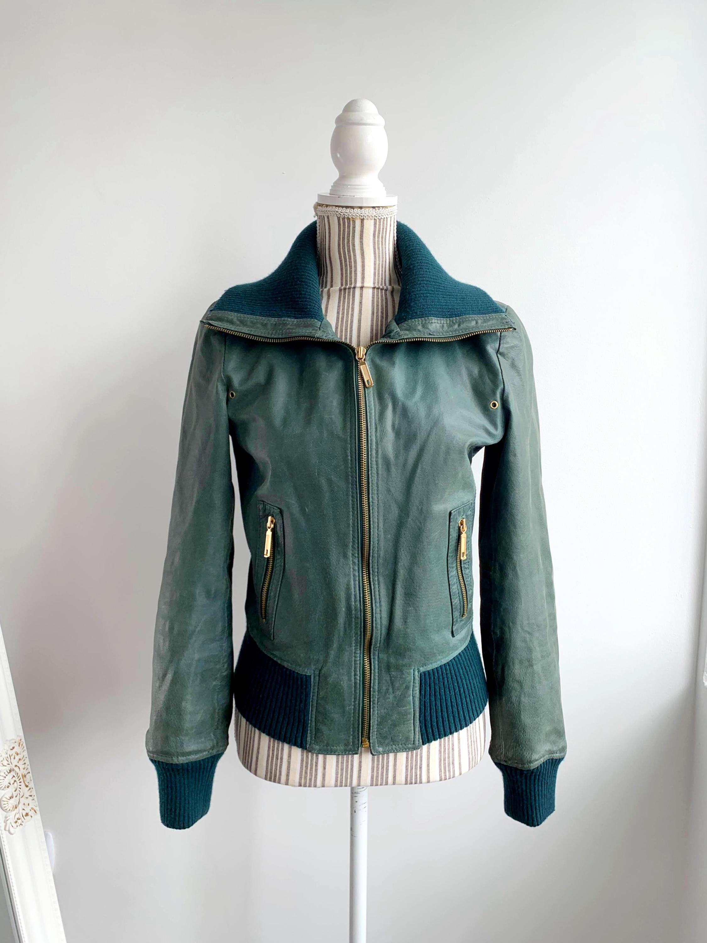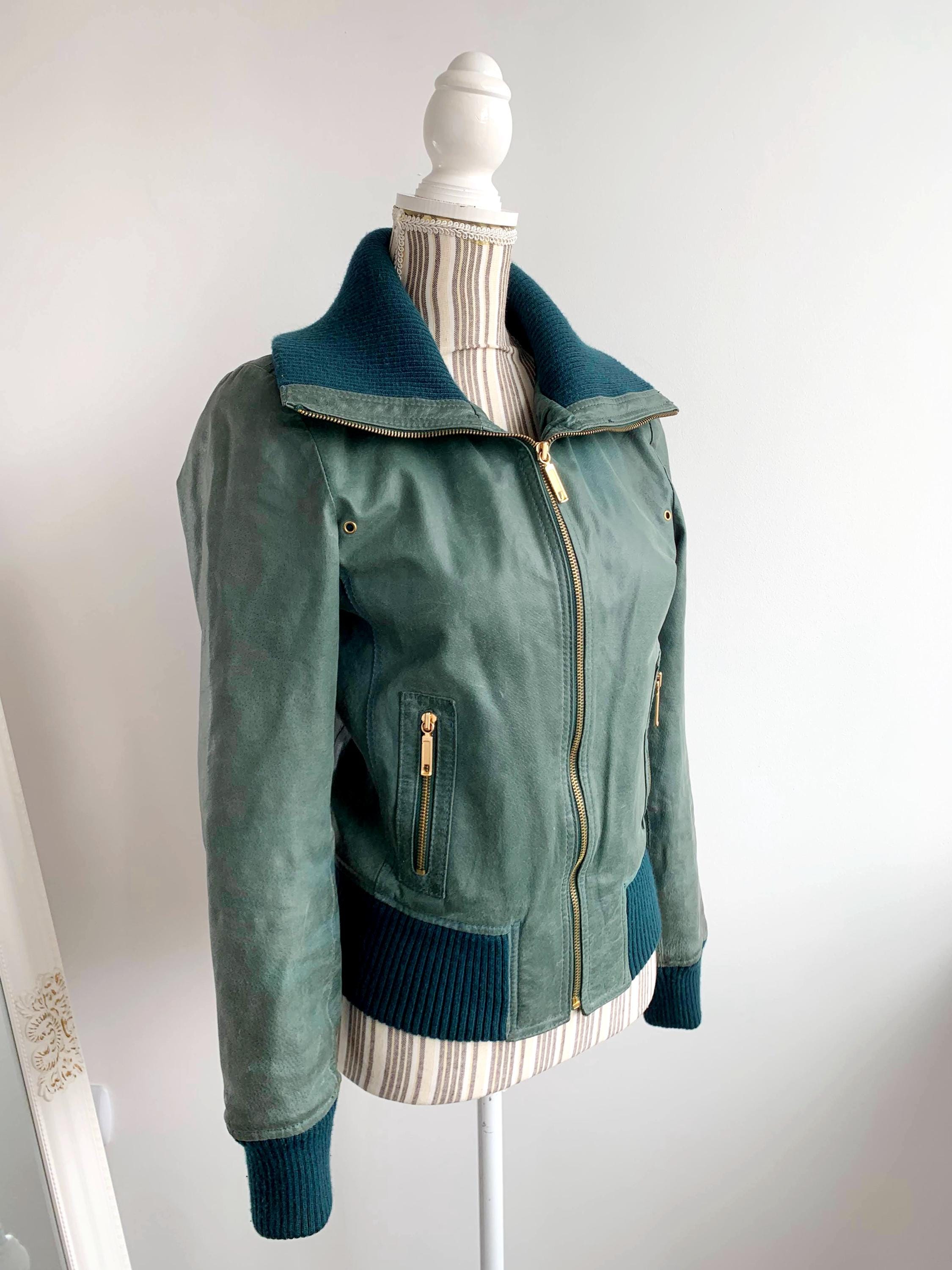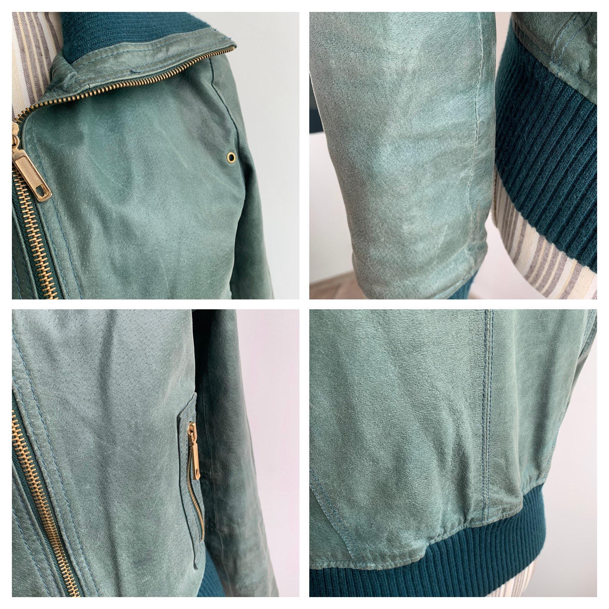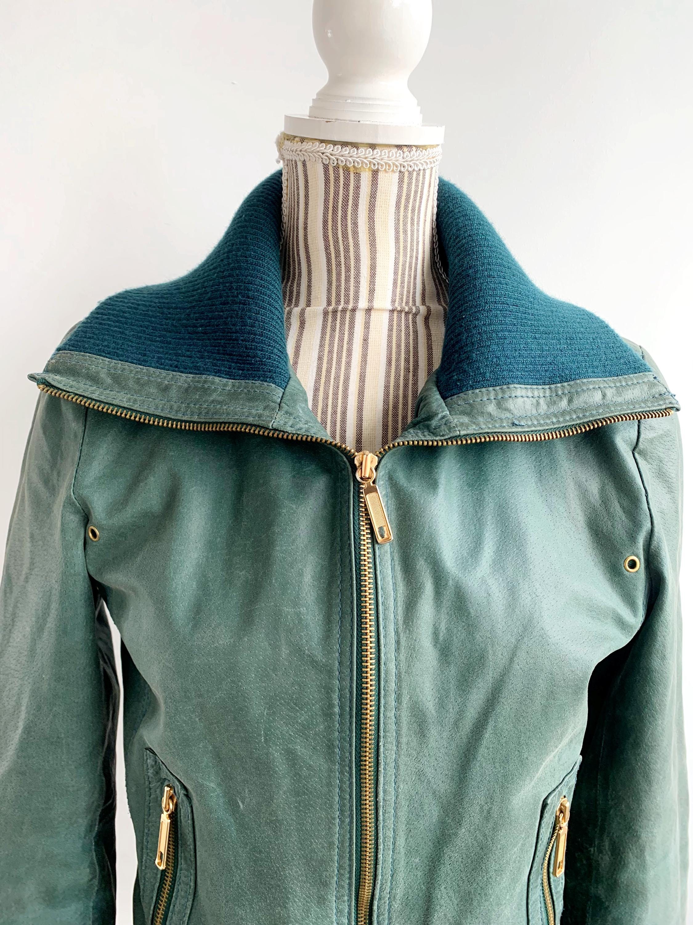 This is a vintage 90s green leather jacket for women by the brand Voice of Europe size S. This genuine leather jacket has zip up closure, size pockets, knitted collar and cuffs. This boho chic 70s style leather jacket is made of genuine leather which has a heavily distressed look. This leather zip up jacket has a relaxed casual look, perfect for every day. This distressed leather biker jacket is size S. Please check the measurements below.