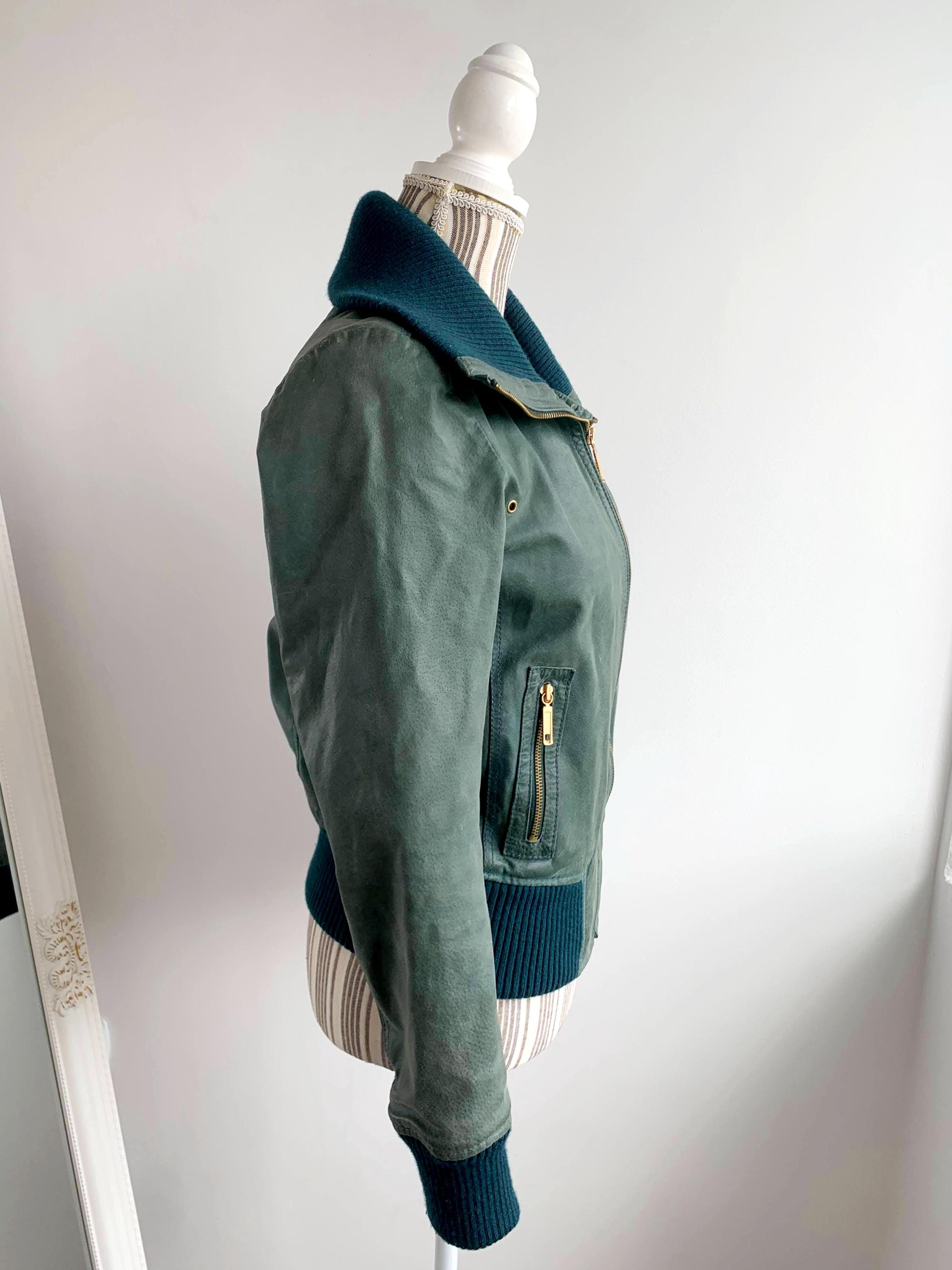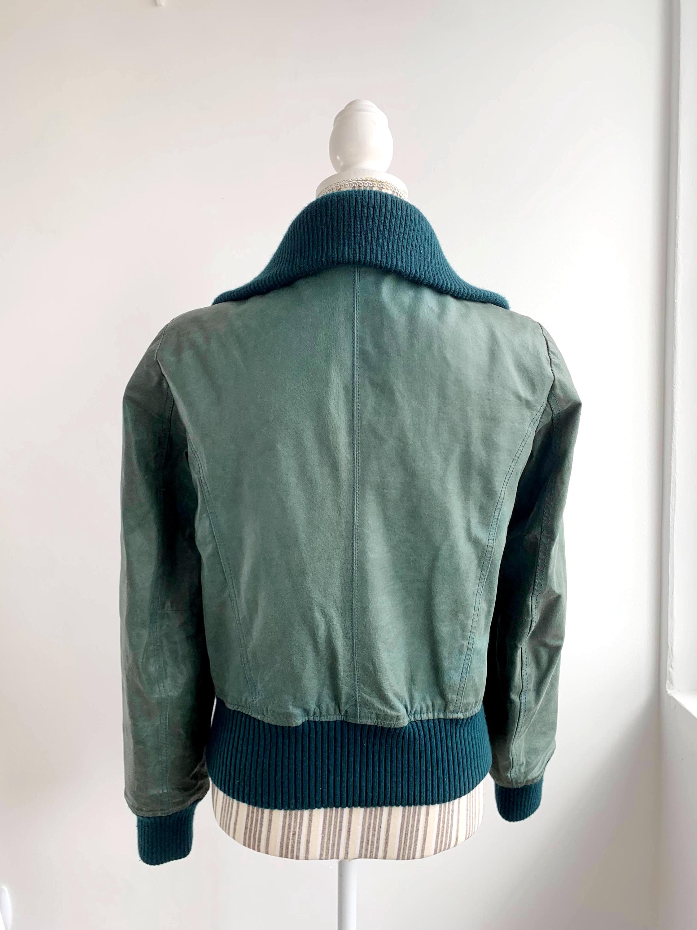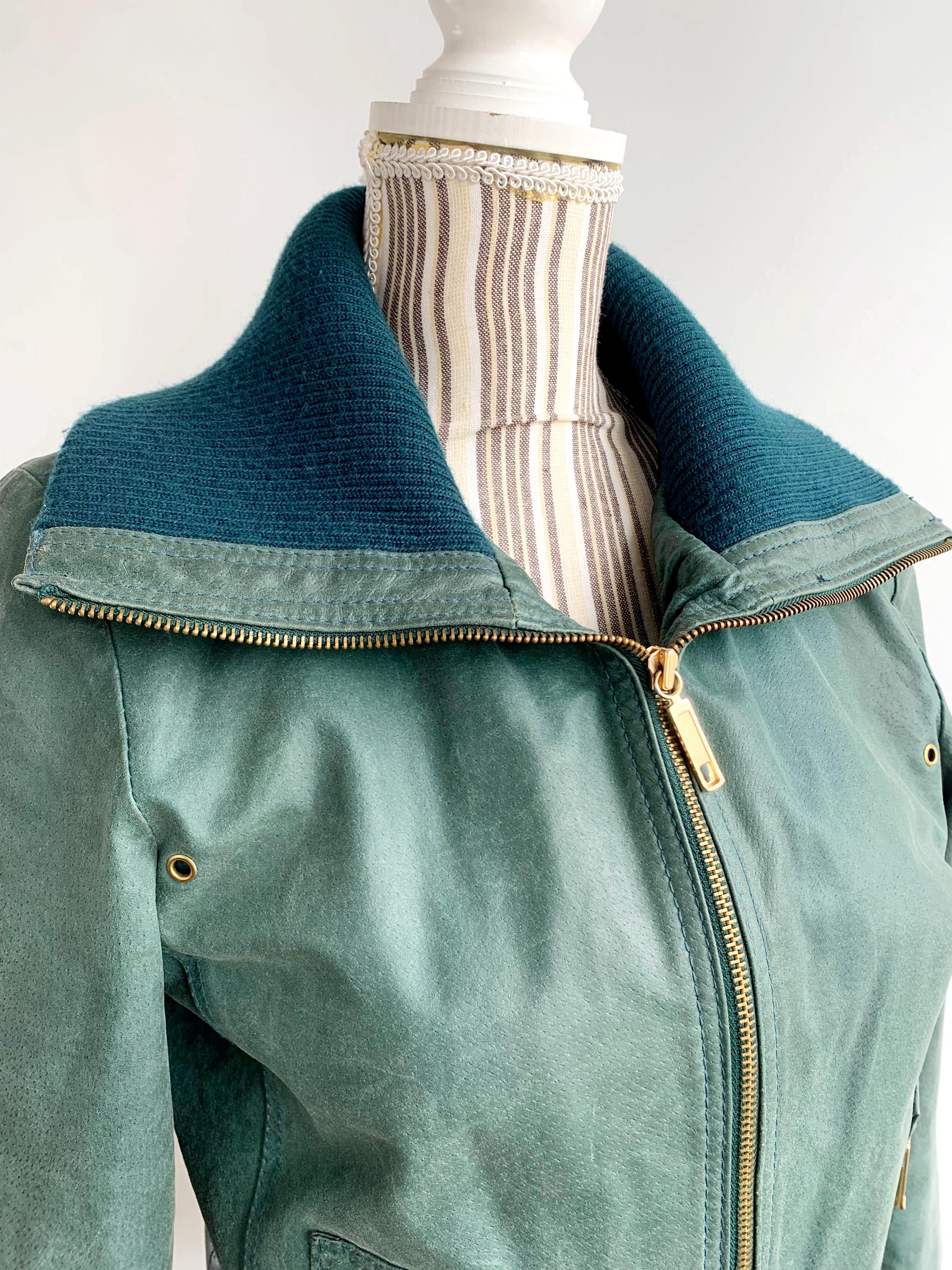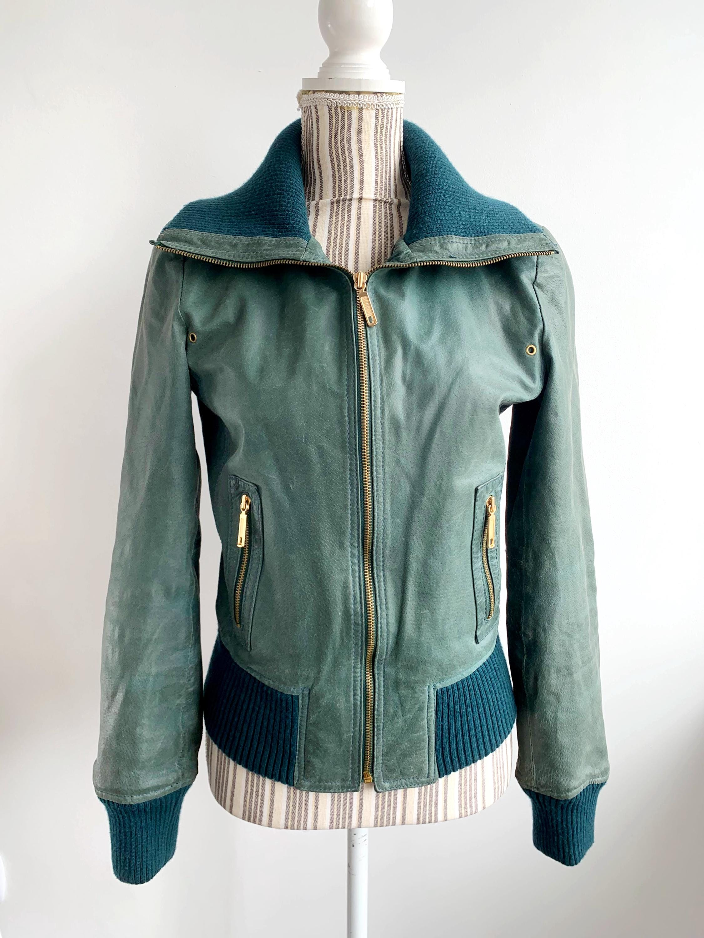 This is a vintage 90s green leather jacket for women by the brand Voice of Europe size S. This genuine leather jacket has zip up closure, size pockets, knitted collar and cuffs. This boho chic 70s style leather jacket is made of genuine leather which has a heavily distressed look. This leather zip up jacket has a relaxed casual look, perfect for every day. This distressed leather biker jacket is size S. Please check the measurements below.
