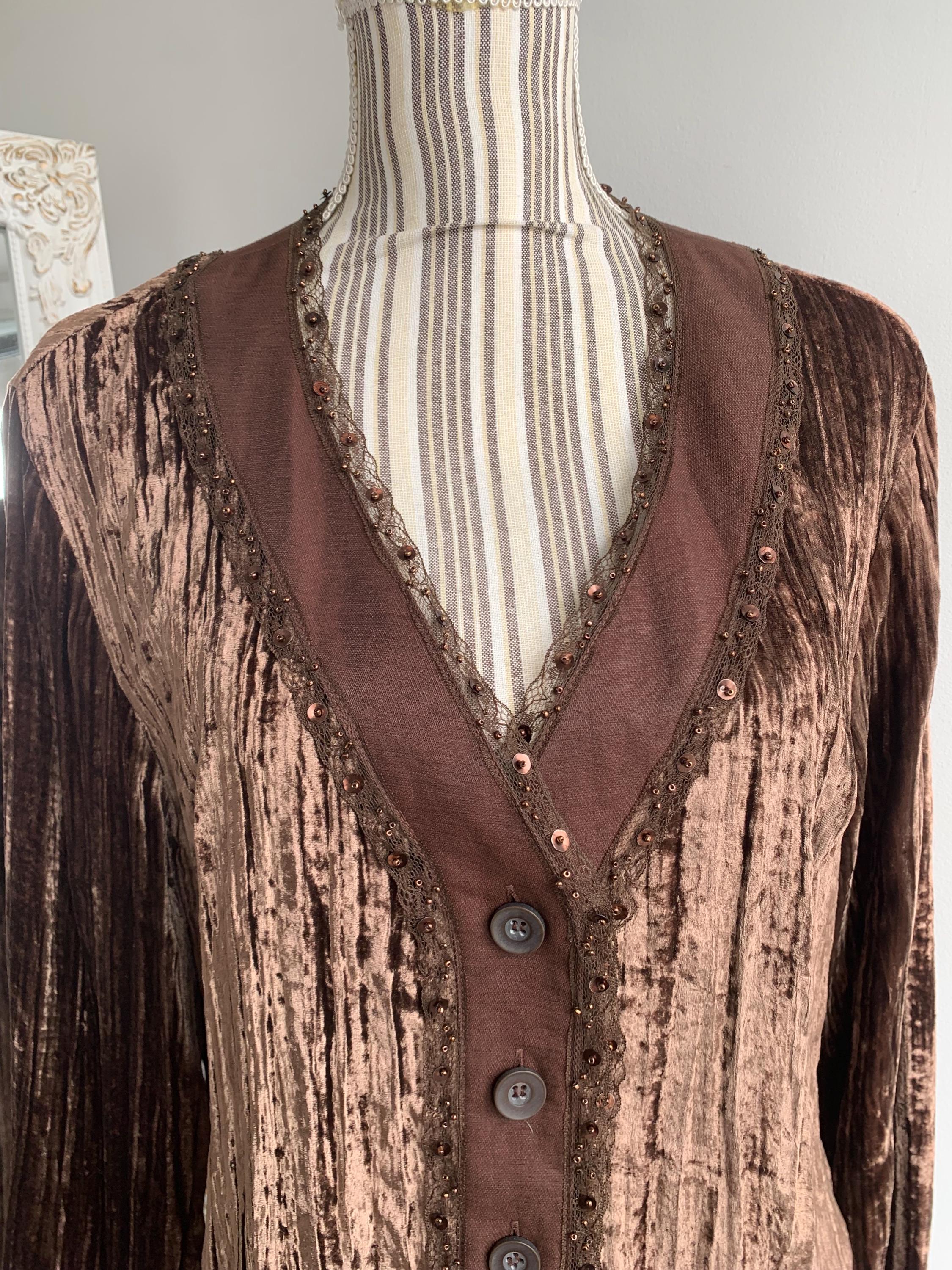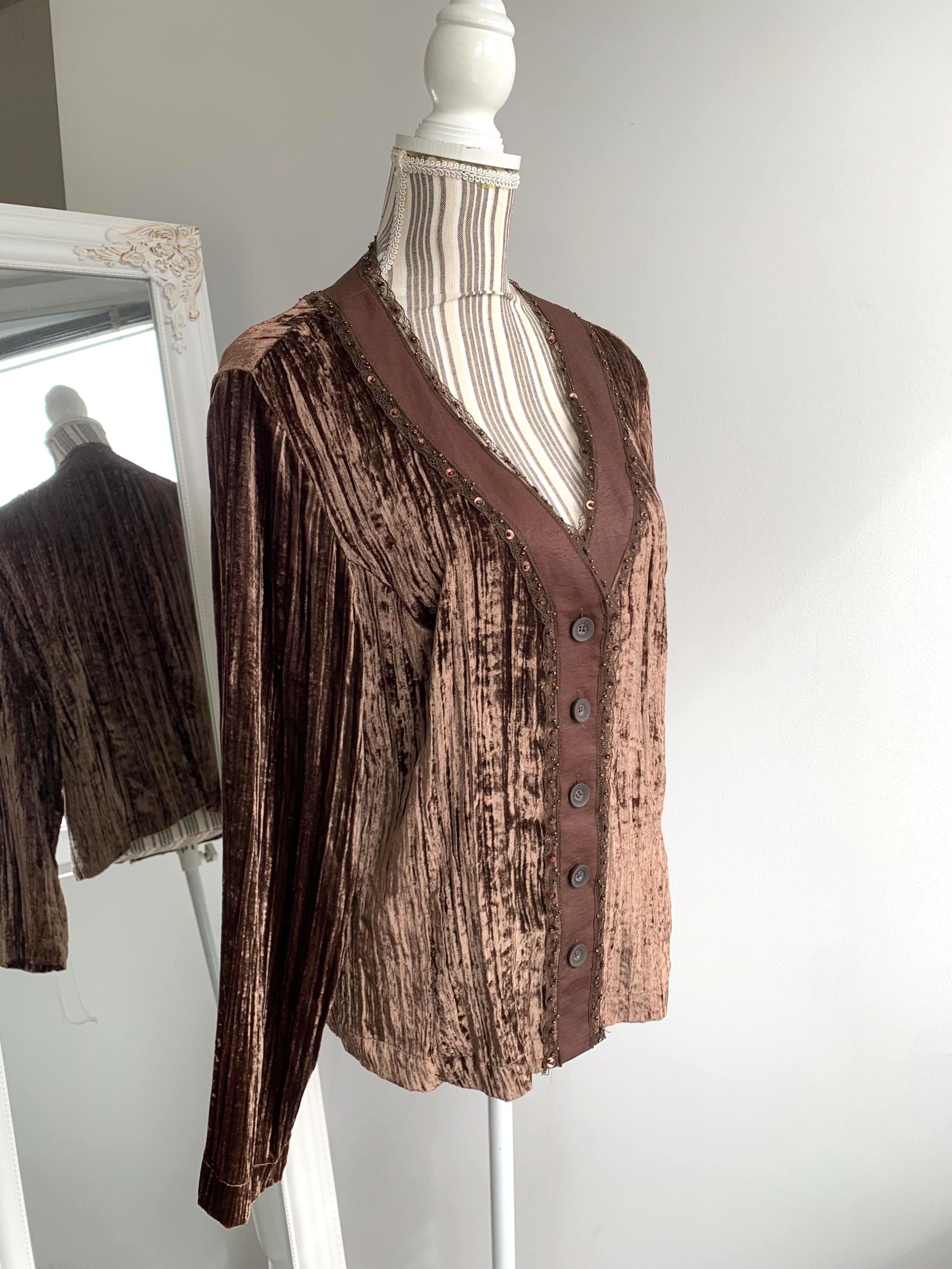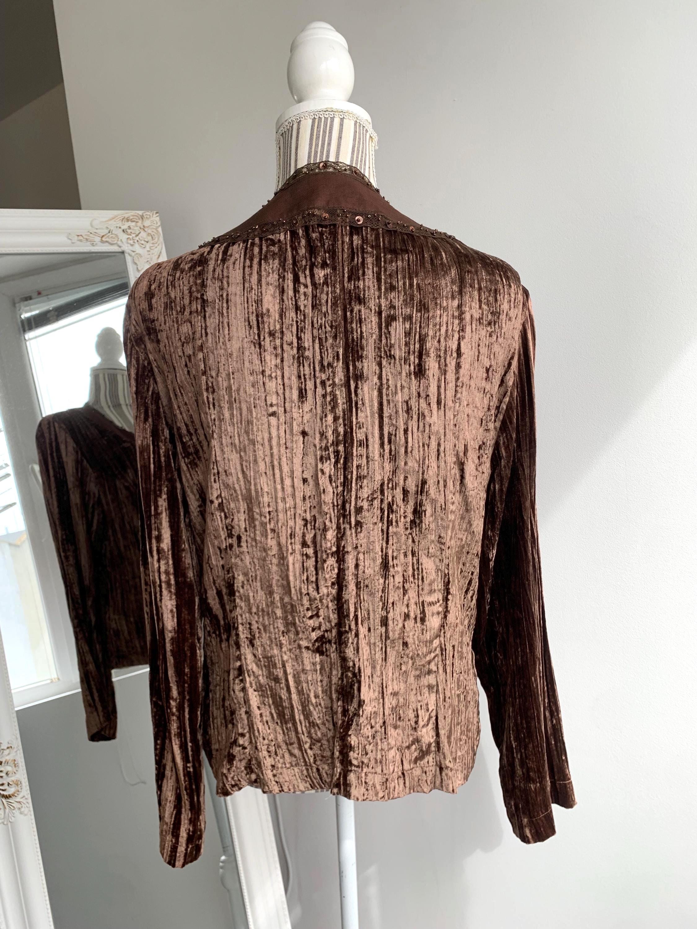 Beautiful shiny silky rayon nylon velvet blazer in brown color with beaded lace detailing and crinkled effect. This elegant velvet jacket has no lining which makes it perfect for the spring season. It is by the brand Andrea. The size marked is 40 which fits like L. Please check the measurements below.