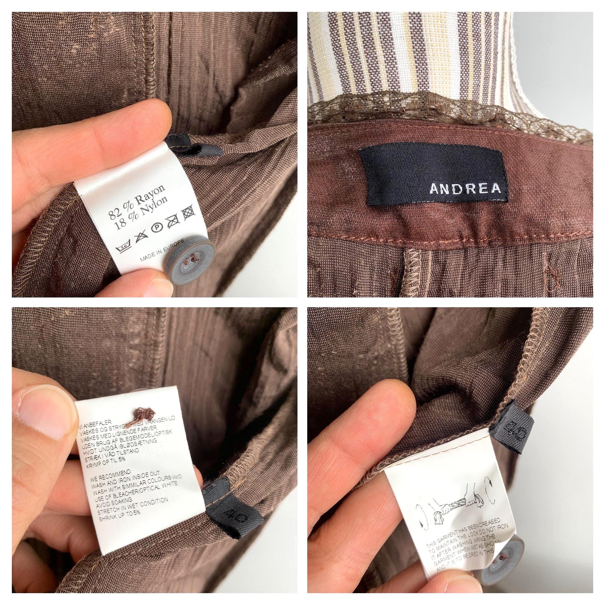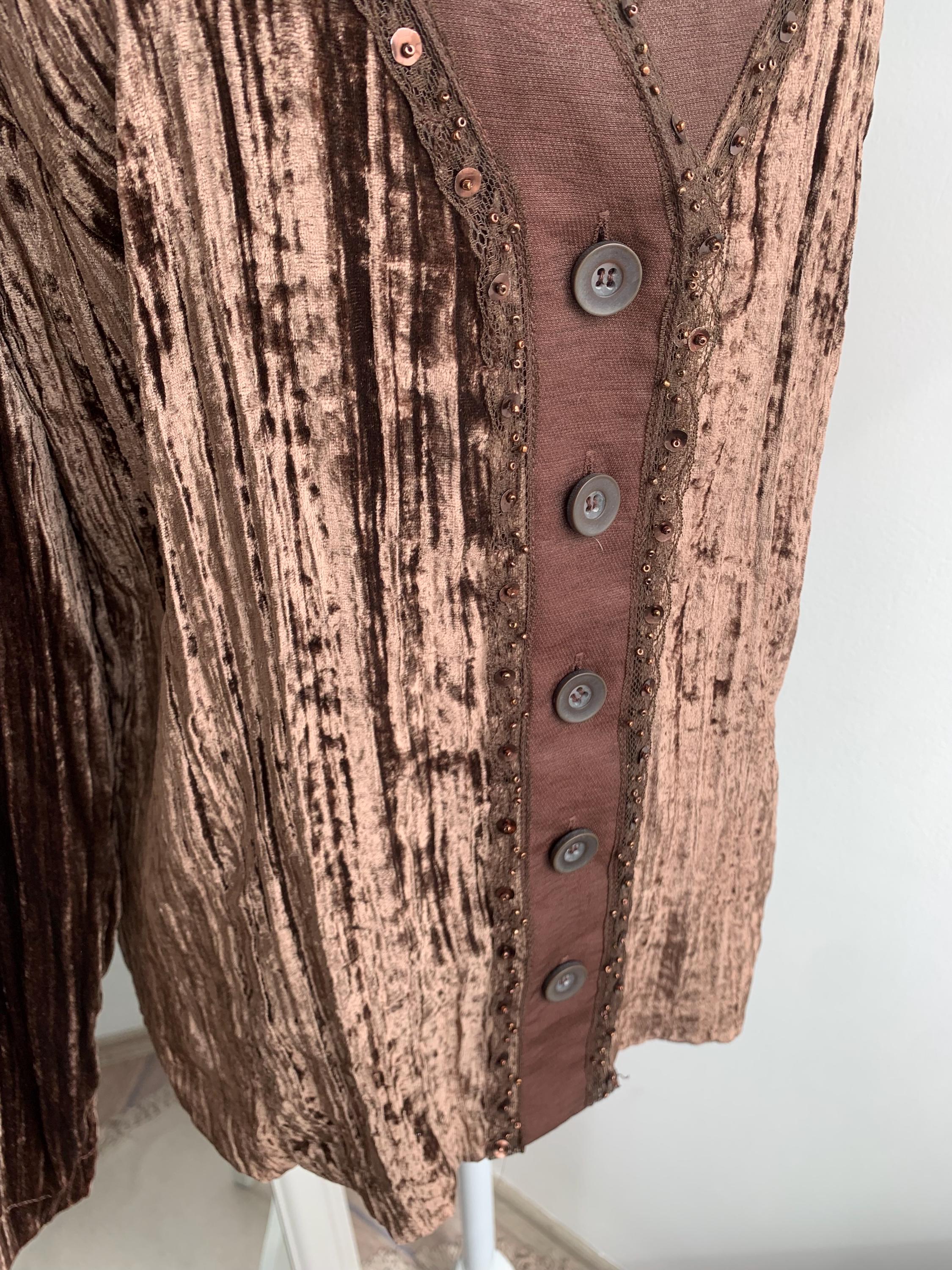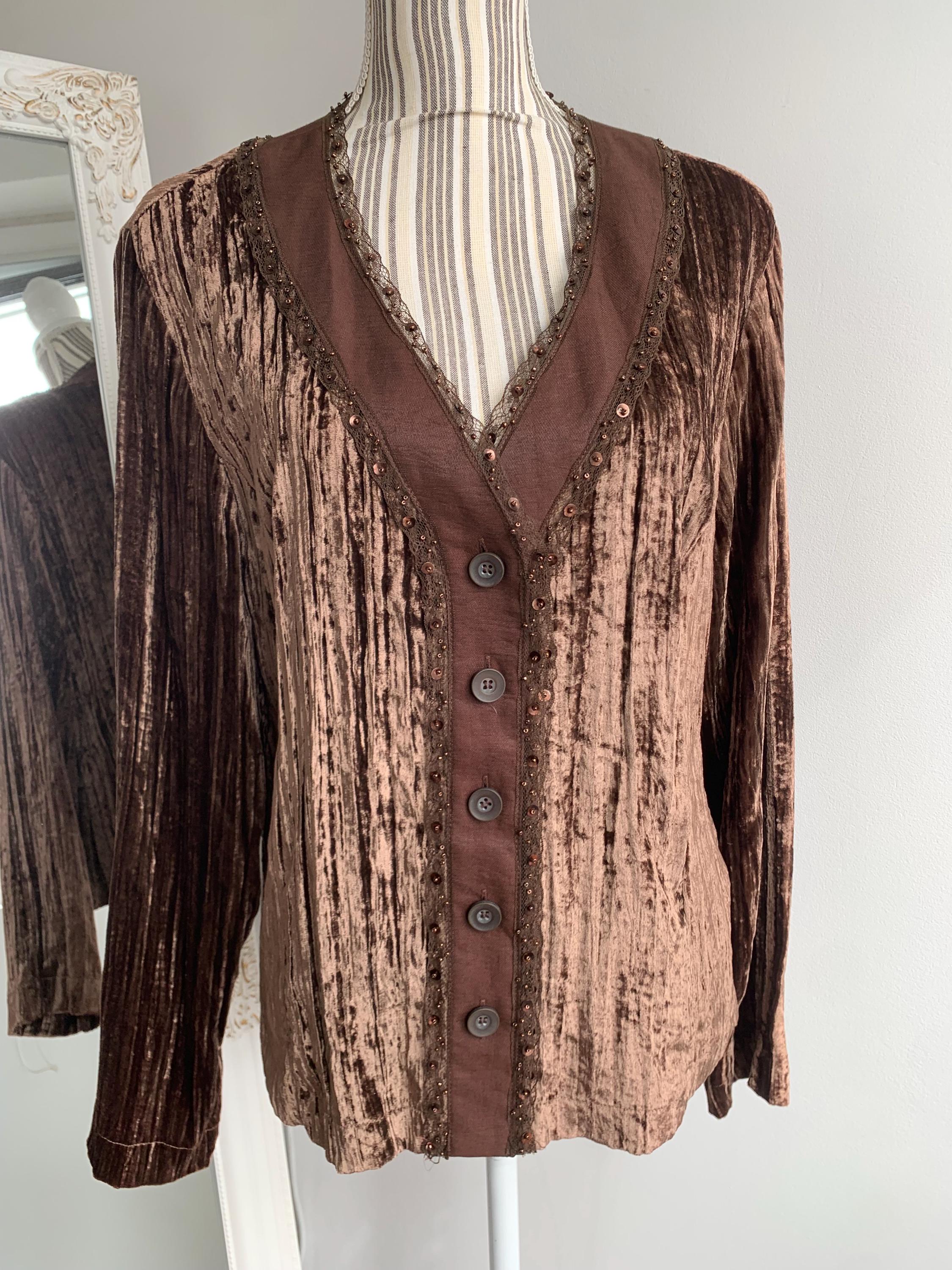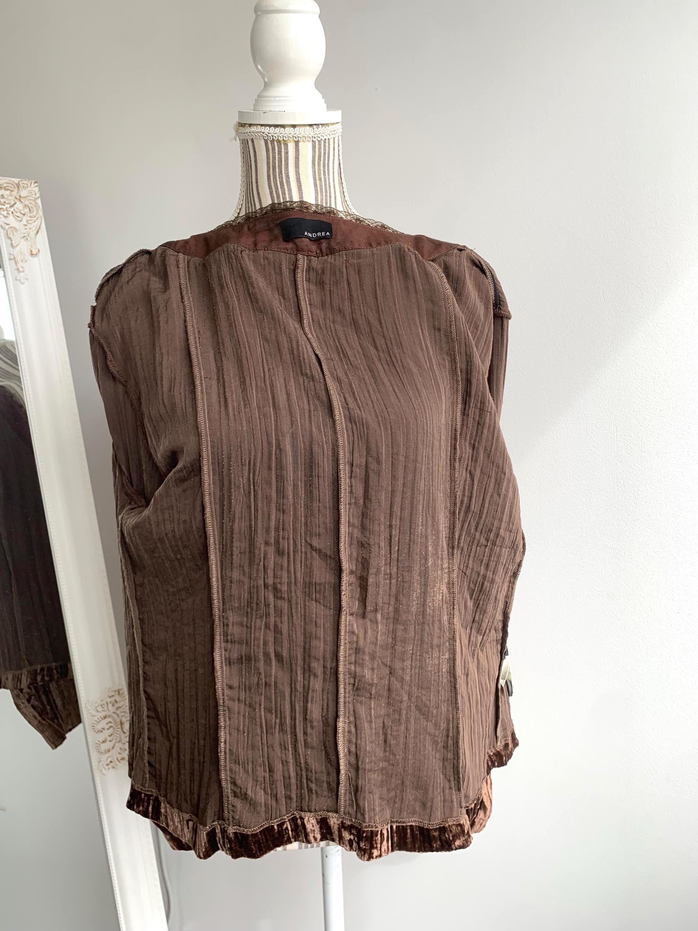 Beautiful shiny silky rayon nylon velvet blazer in brown color with beaded lace detailing and crinkled effect. This elegant velvet jacket has no lining which makes it perfect for the spring season. It is by the brand Andrea. The size marked is 40 which fits like L. Please check the measurements below.