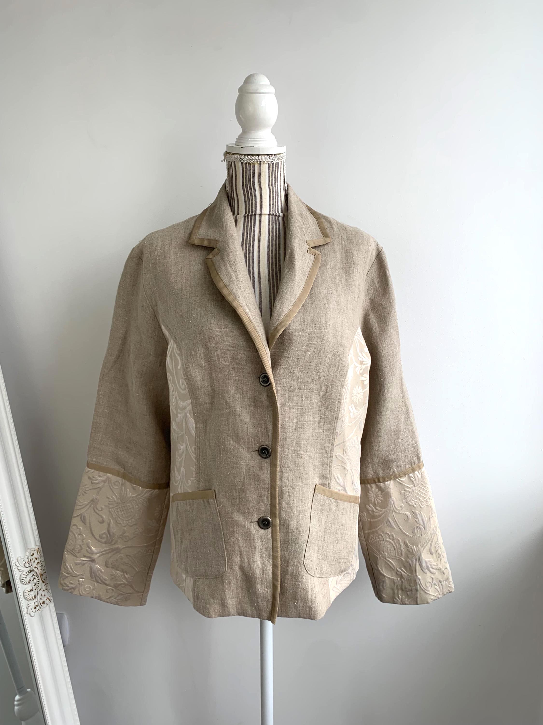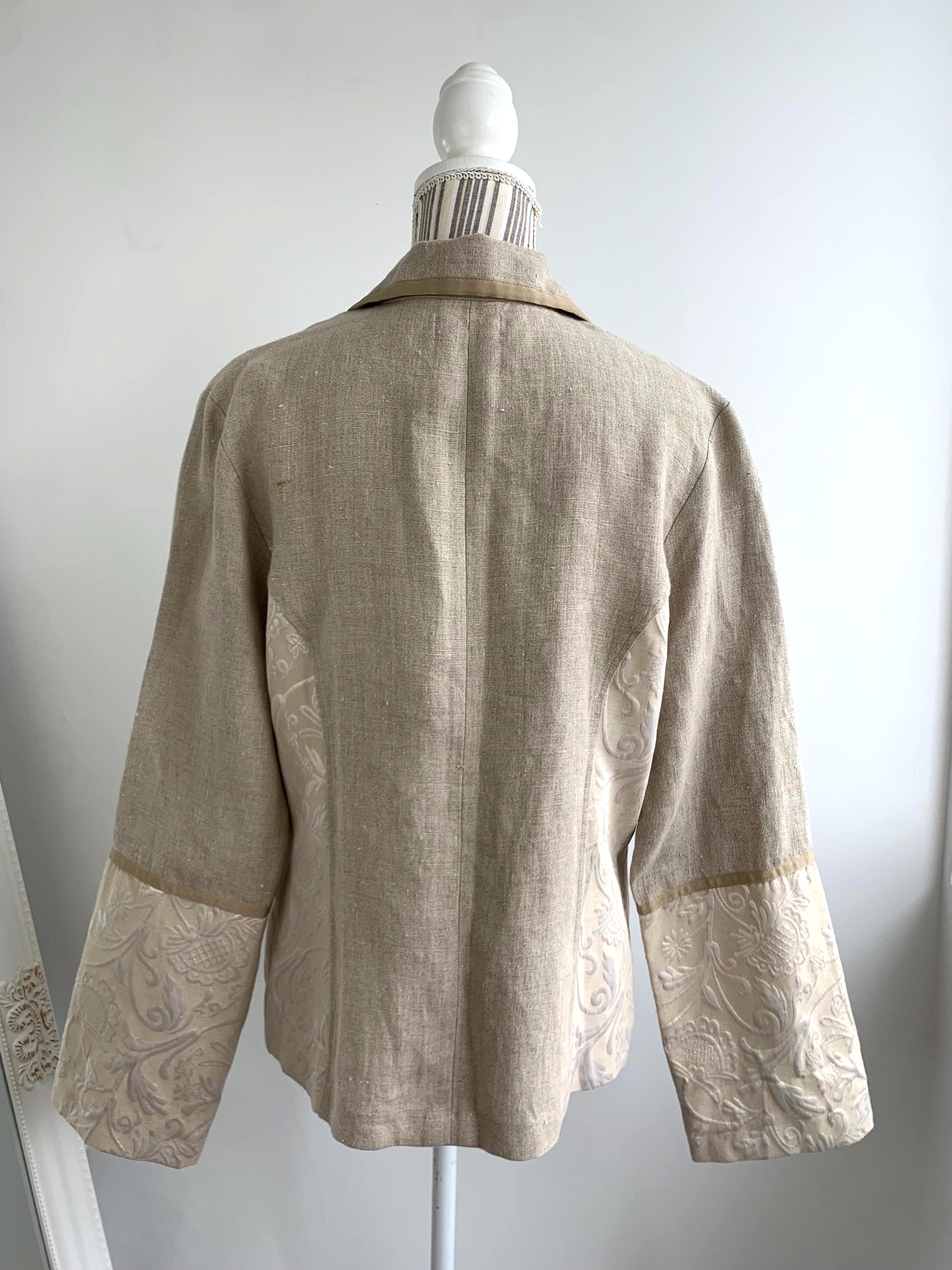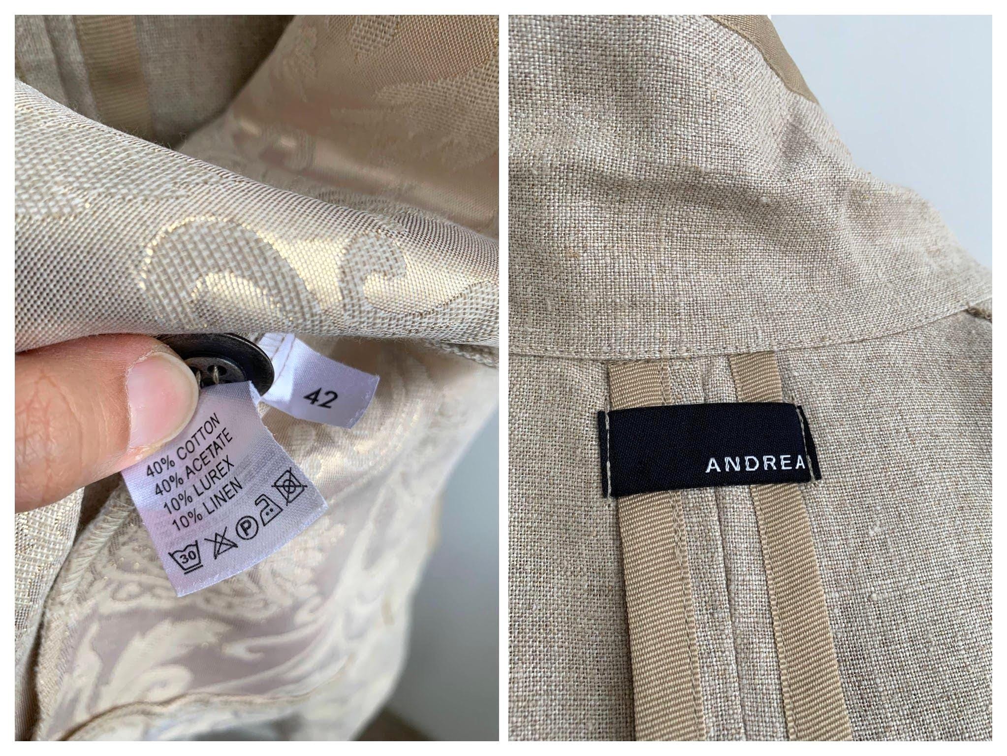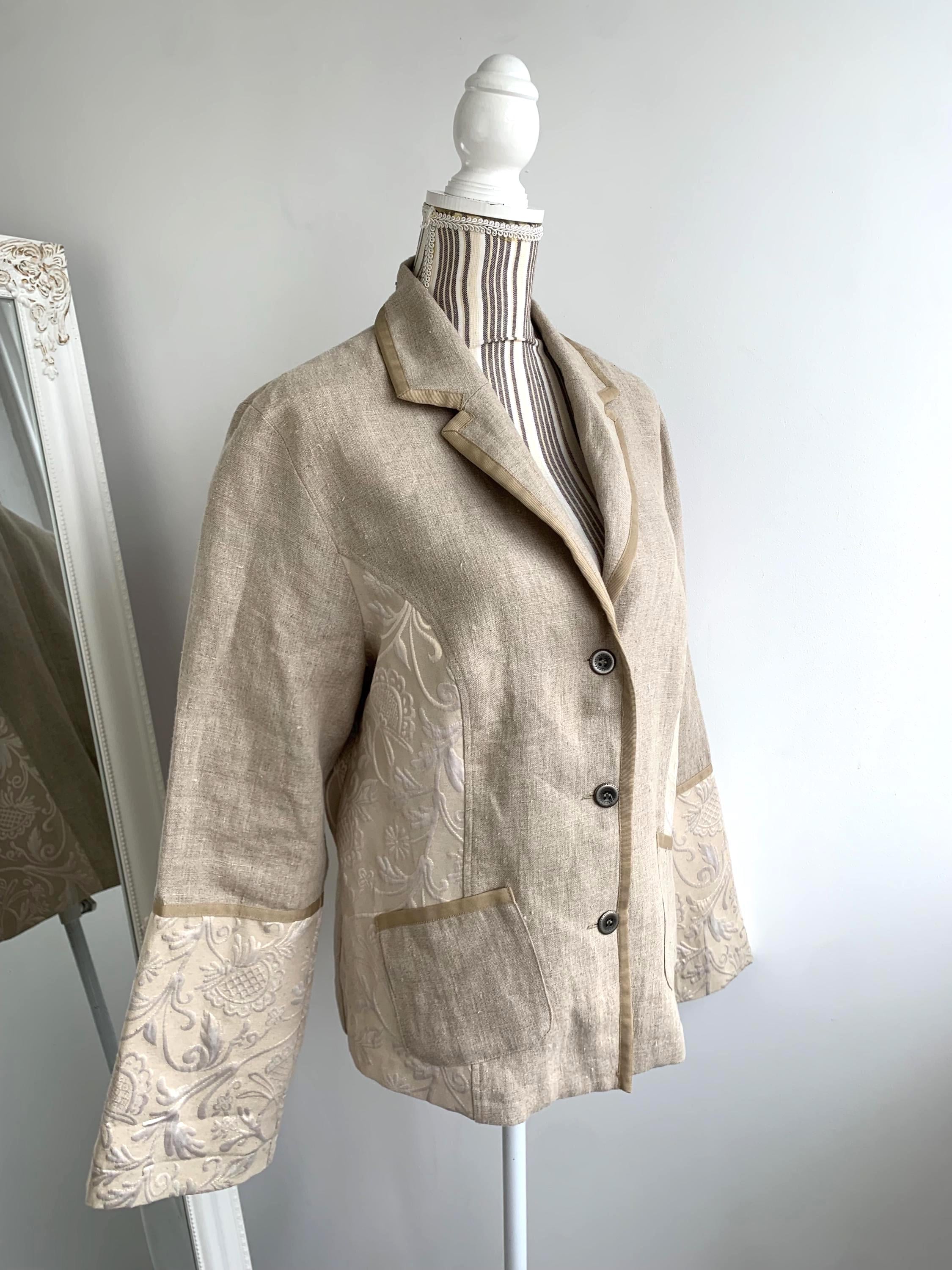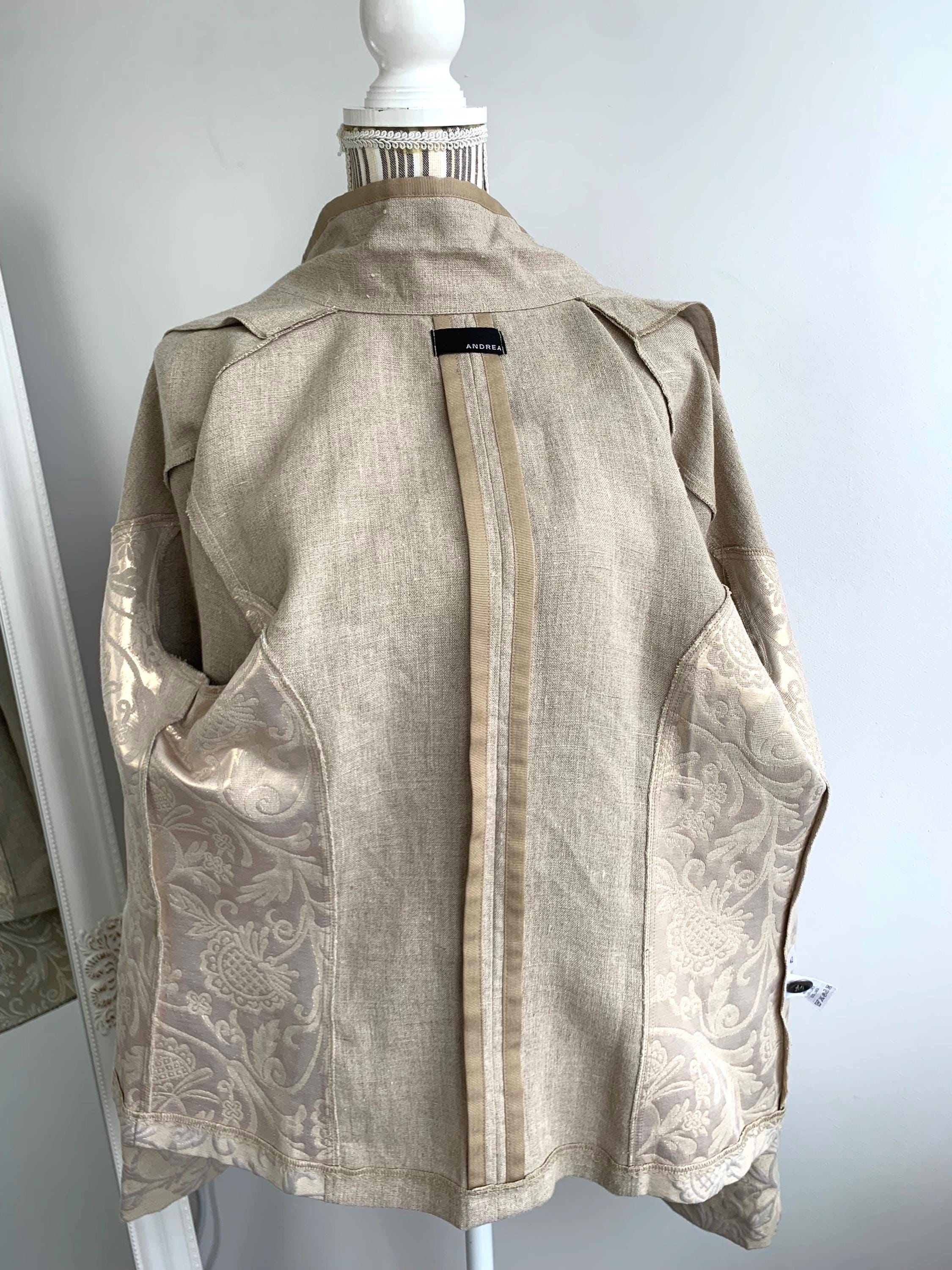 Beautiful vintage Y2K cotton linen blend blazer jacket with lurex and acetate accents by the brand Andrea. This summer blazer has stylish lapel collar and pockets. This elegant outerwear piece is made of rough cotton linen blend fabric which has natural texture and acetate floral paisley print lurex jacquard accents at the sides and sleeves. This spring linen jacket has two side pockets. It has no lining which makes is perfect for warmer weather. The size marked is 42, which fits like XL.