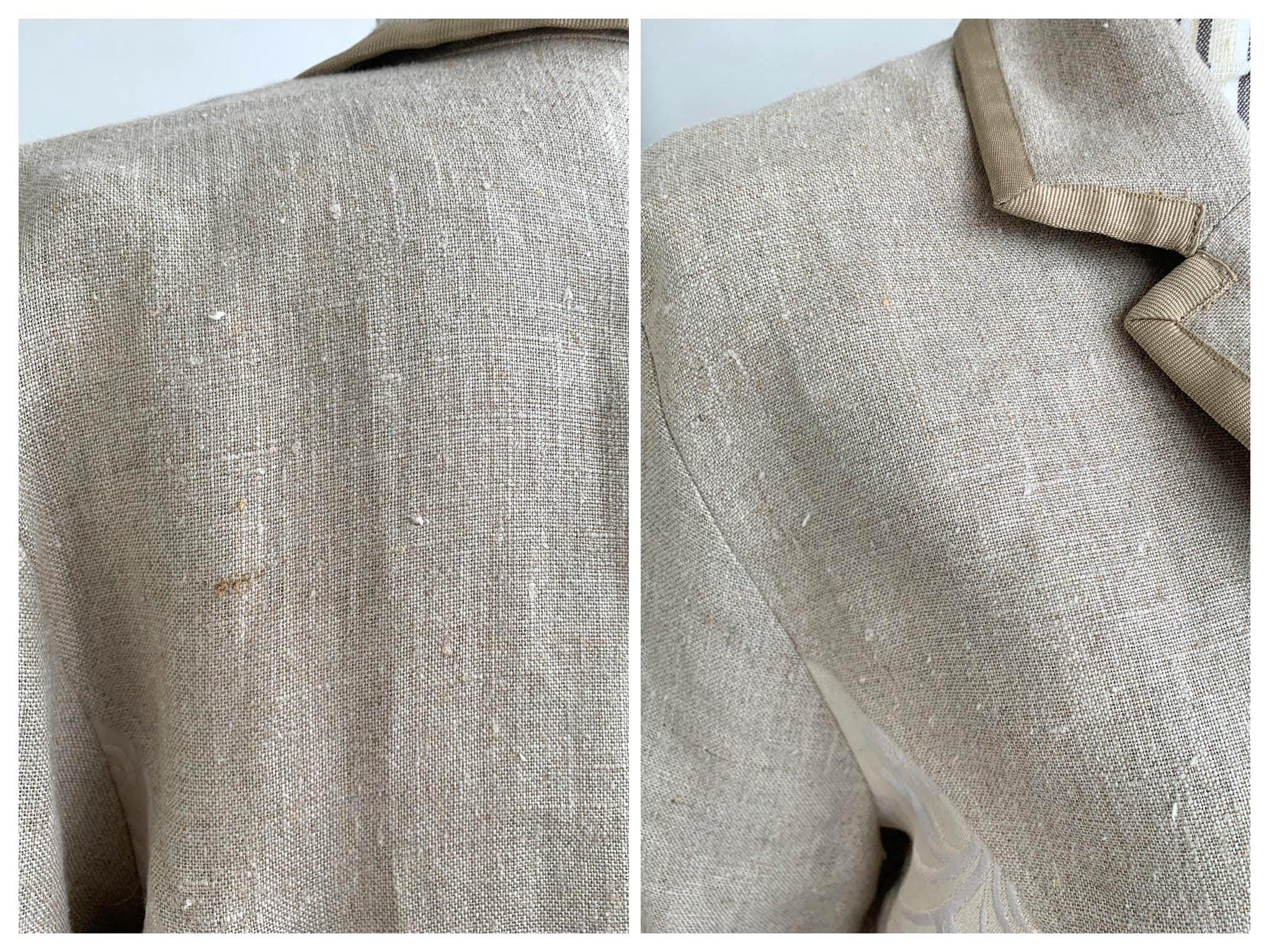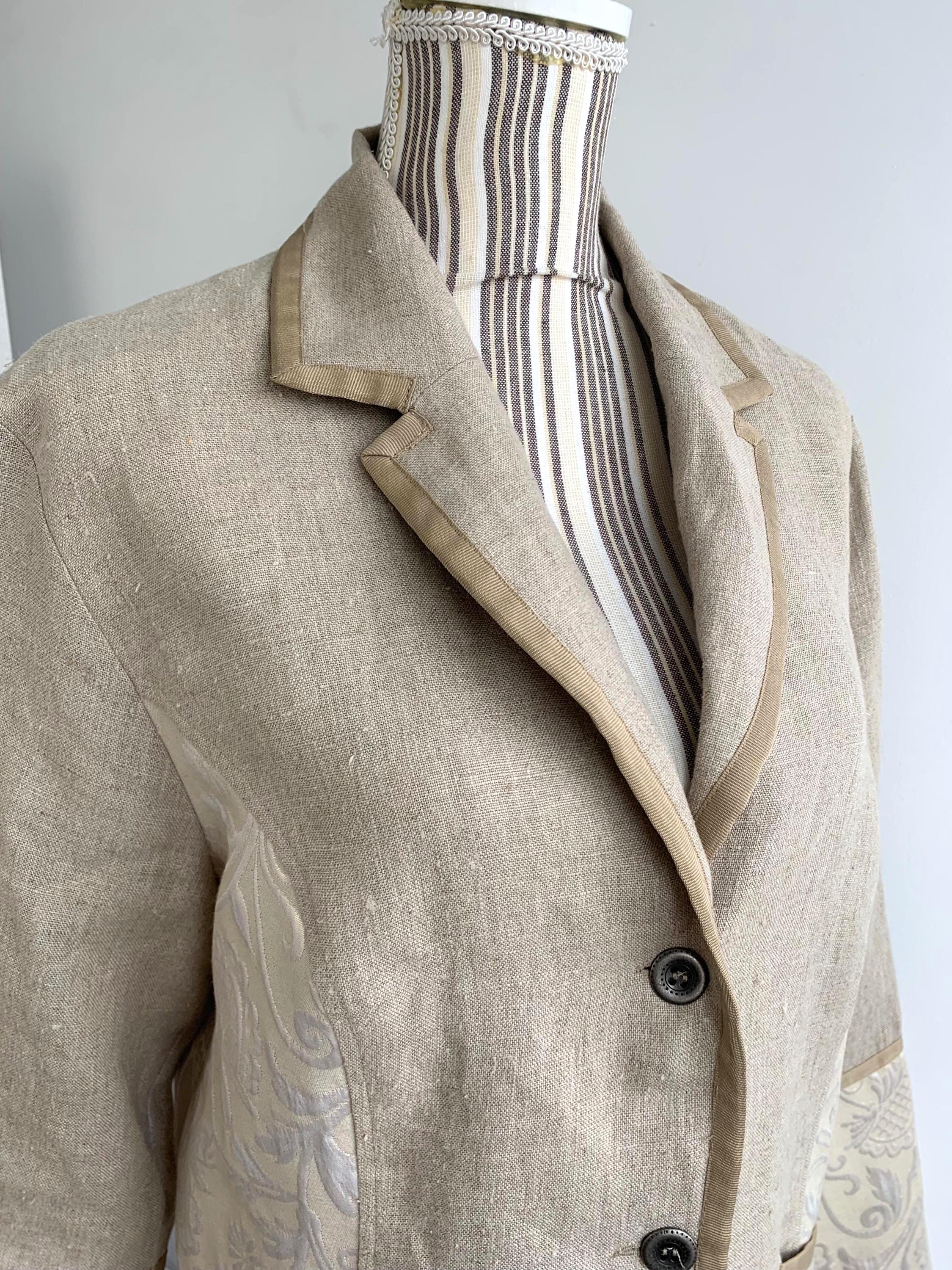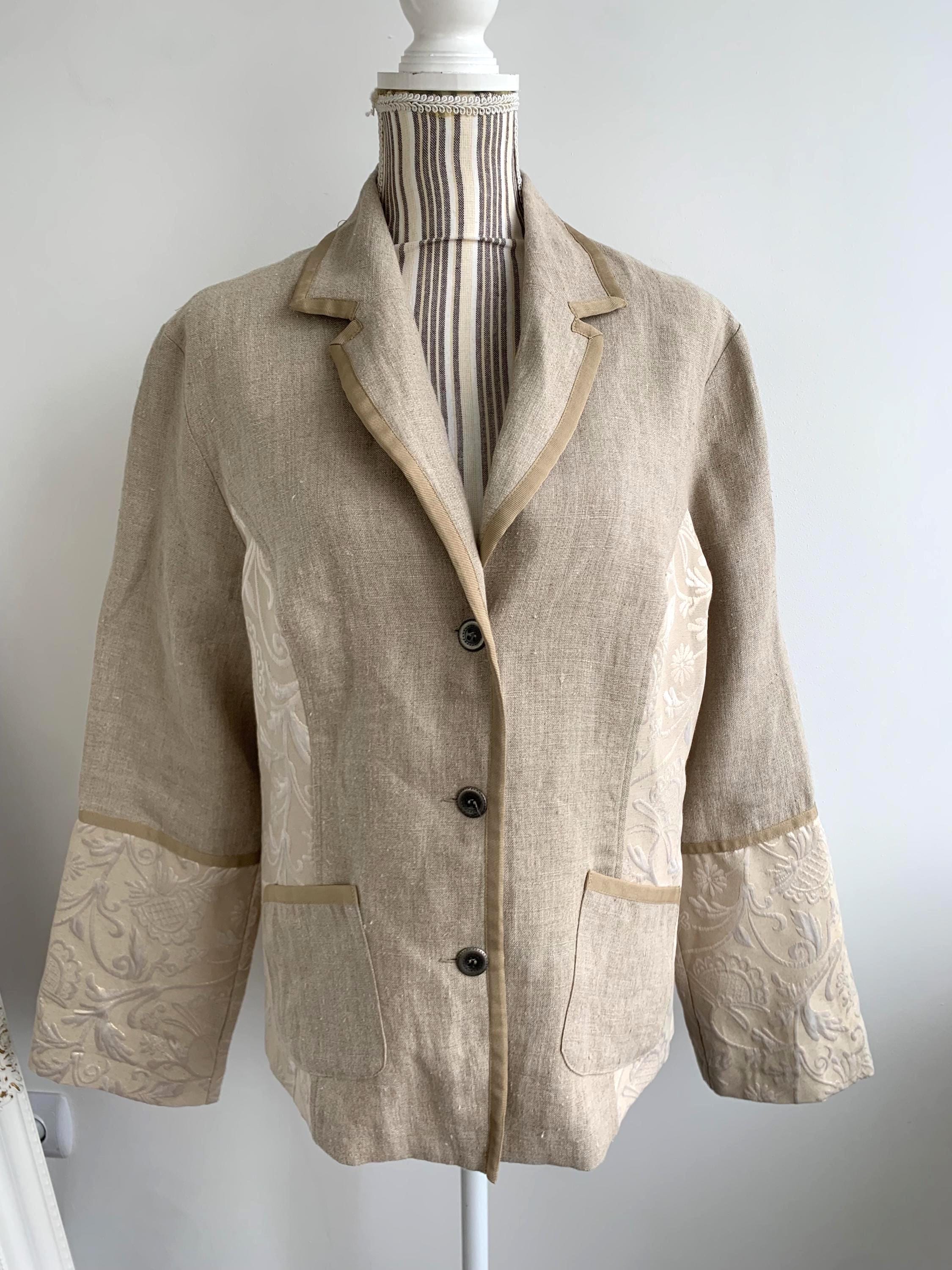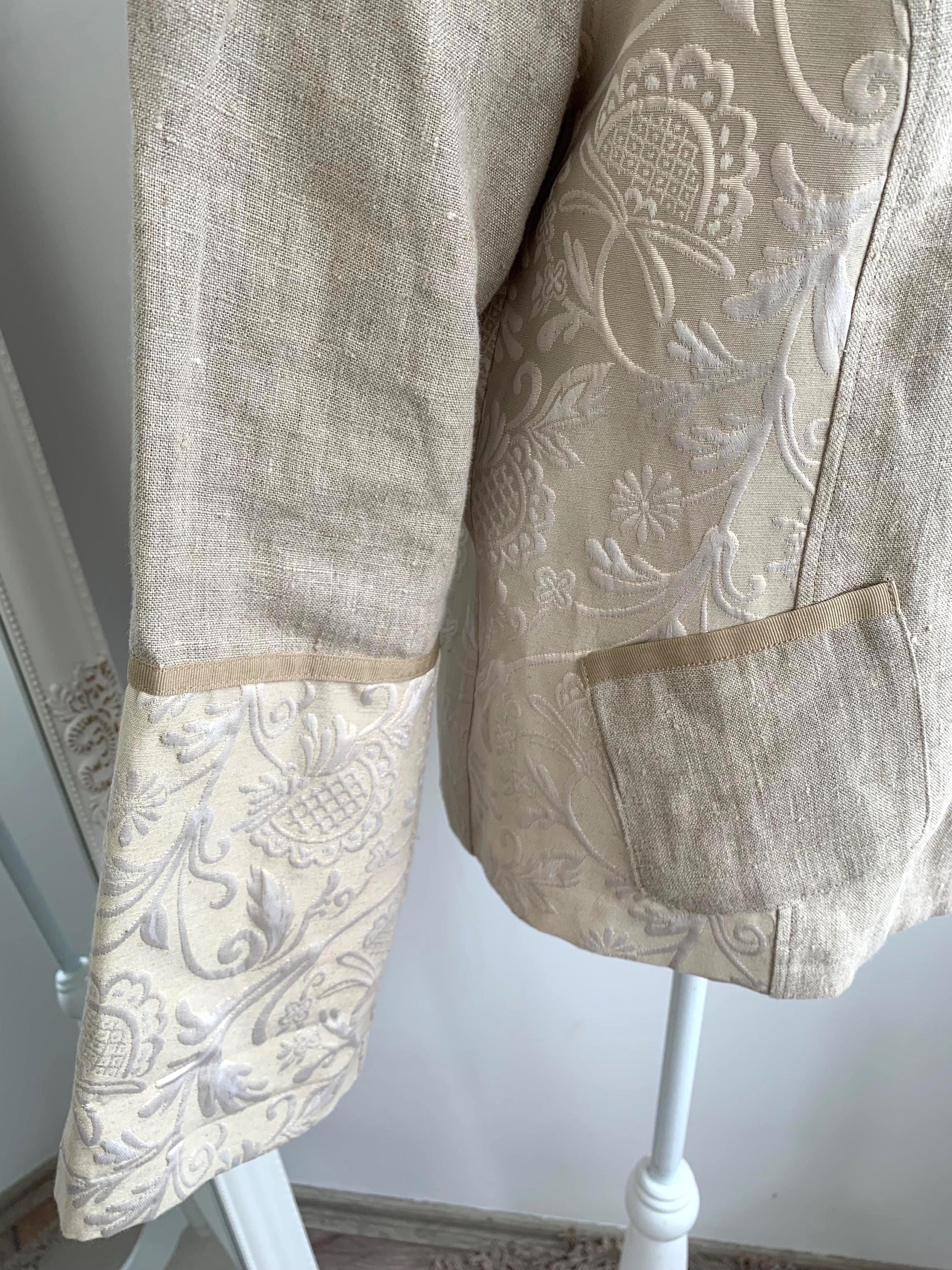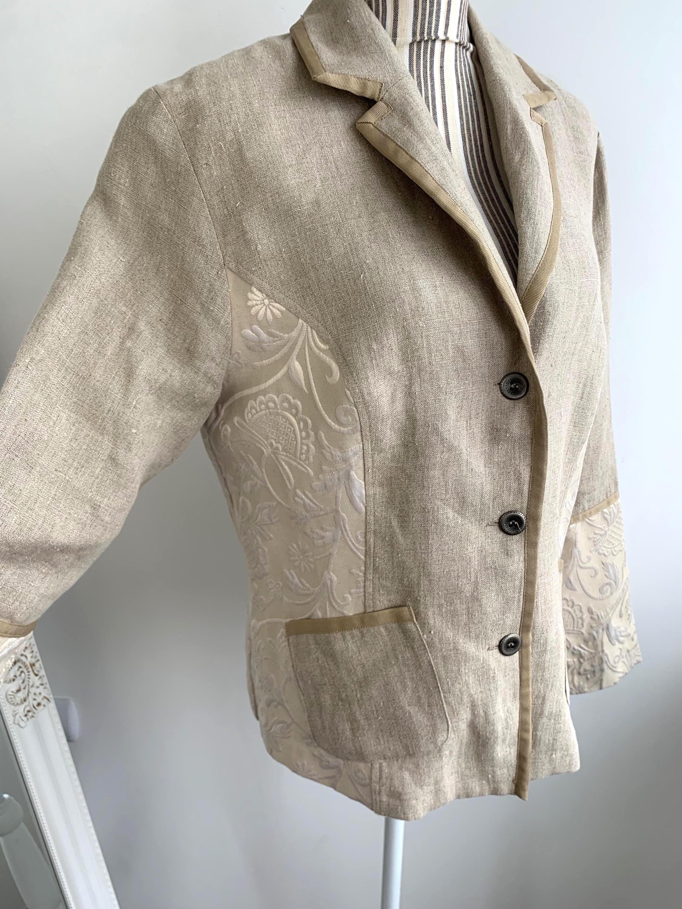 Beautiful vintage Y2K cotton linen blend blazer jacket with lurex and acetate accents by the brand Andrea. This summer blazer has stylish lapel collar and pockets. This elegant outerwear piece is made of rough cotton linen blend fabric which has natural texture and acetate floral paisley print lurex jacquard accents at the sides and sleeves. This spring linen jacket has two side pockets. It has no lining which makes is perfect for warmer weather. The size marked is 42, which fits like XL.