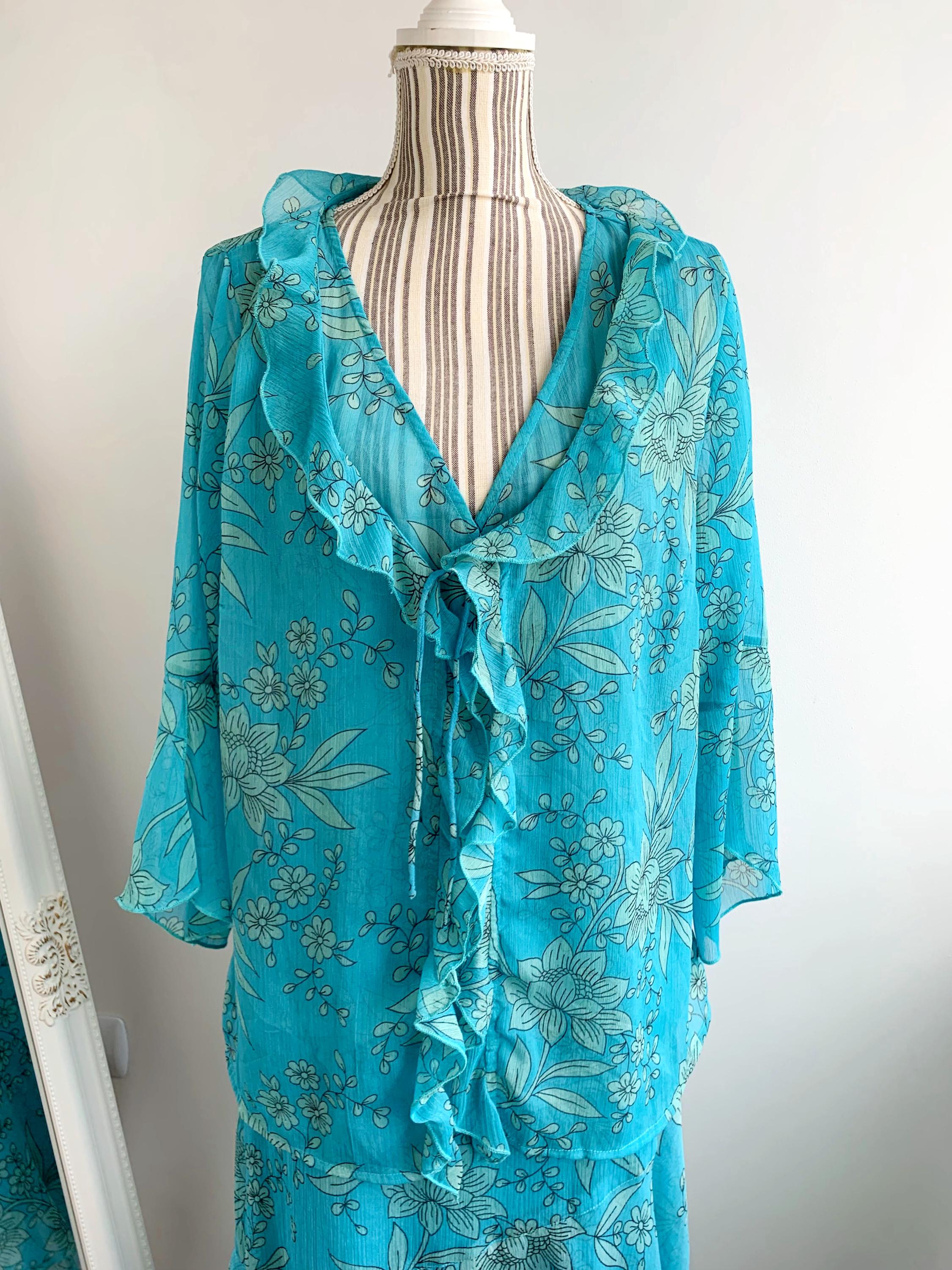 This is a vintage 3 piece suit set with flared asymmetrical midi skirt, sheer tank top and ruffled neckline tie front bolero jacket by Lindex. The size marked on the tank top and the skirt is 44, the size marked on the bolero is 46, however it fits smaller. This suit set fits like L, please check the measurements below.