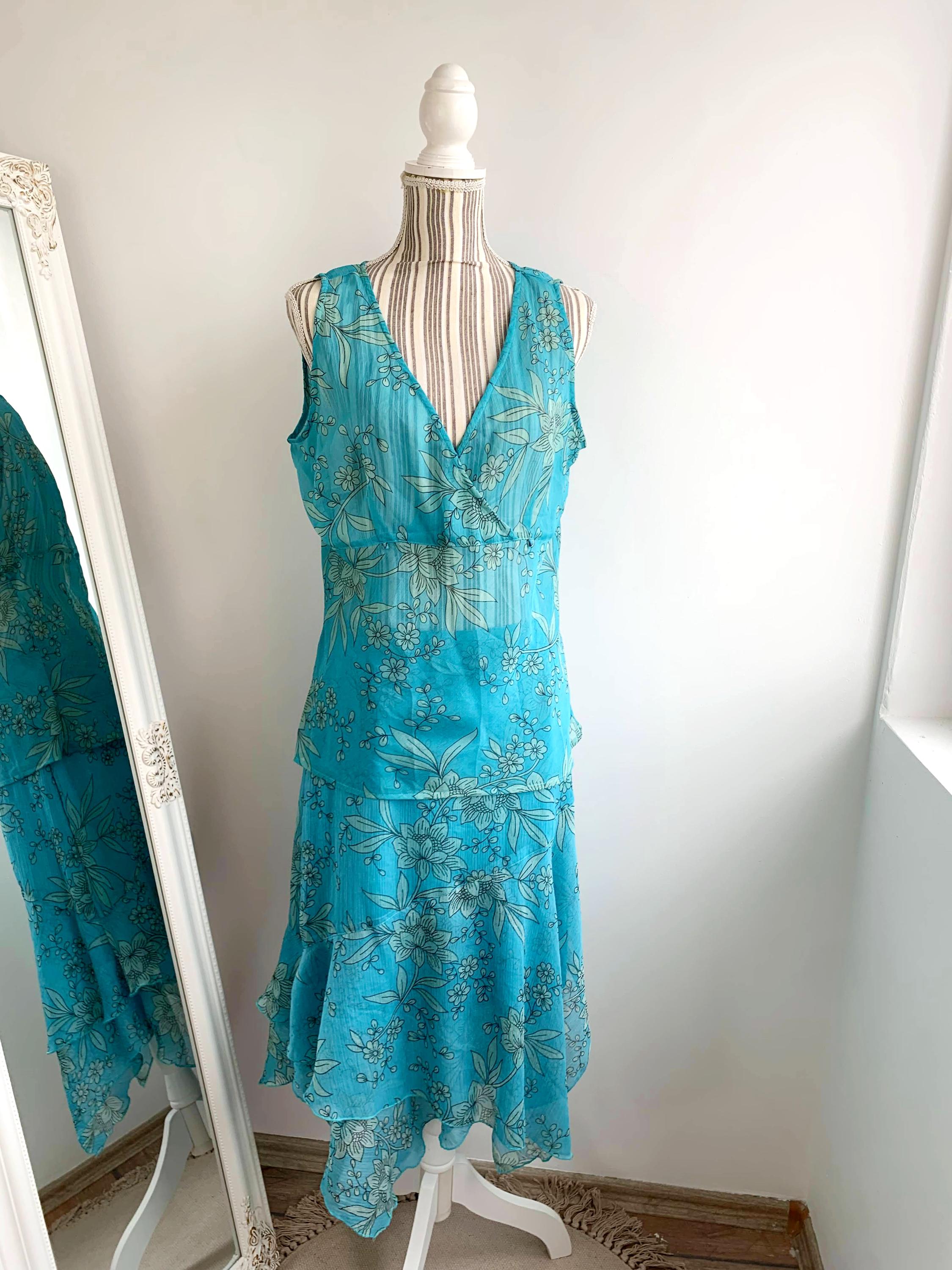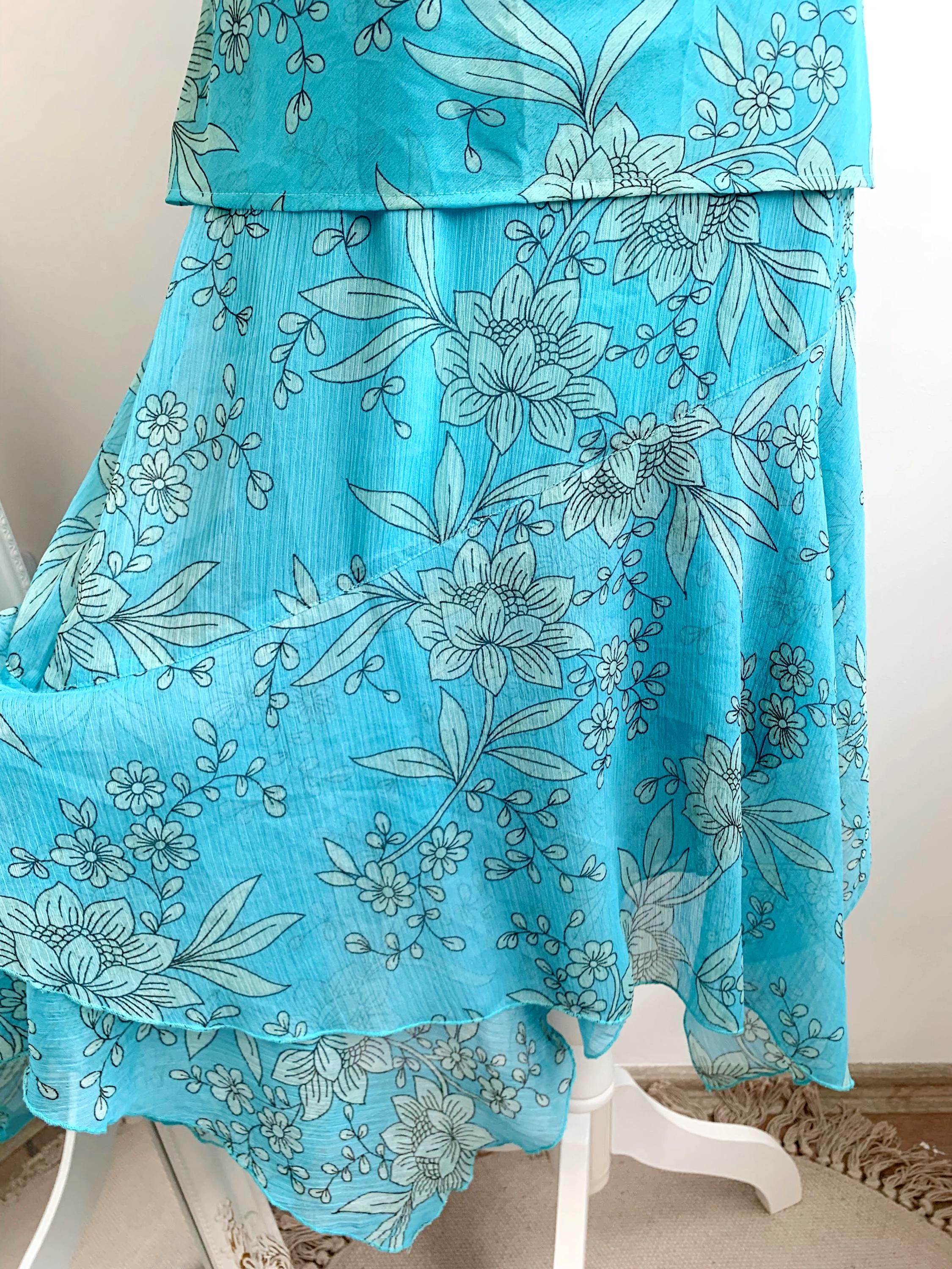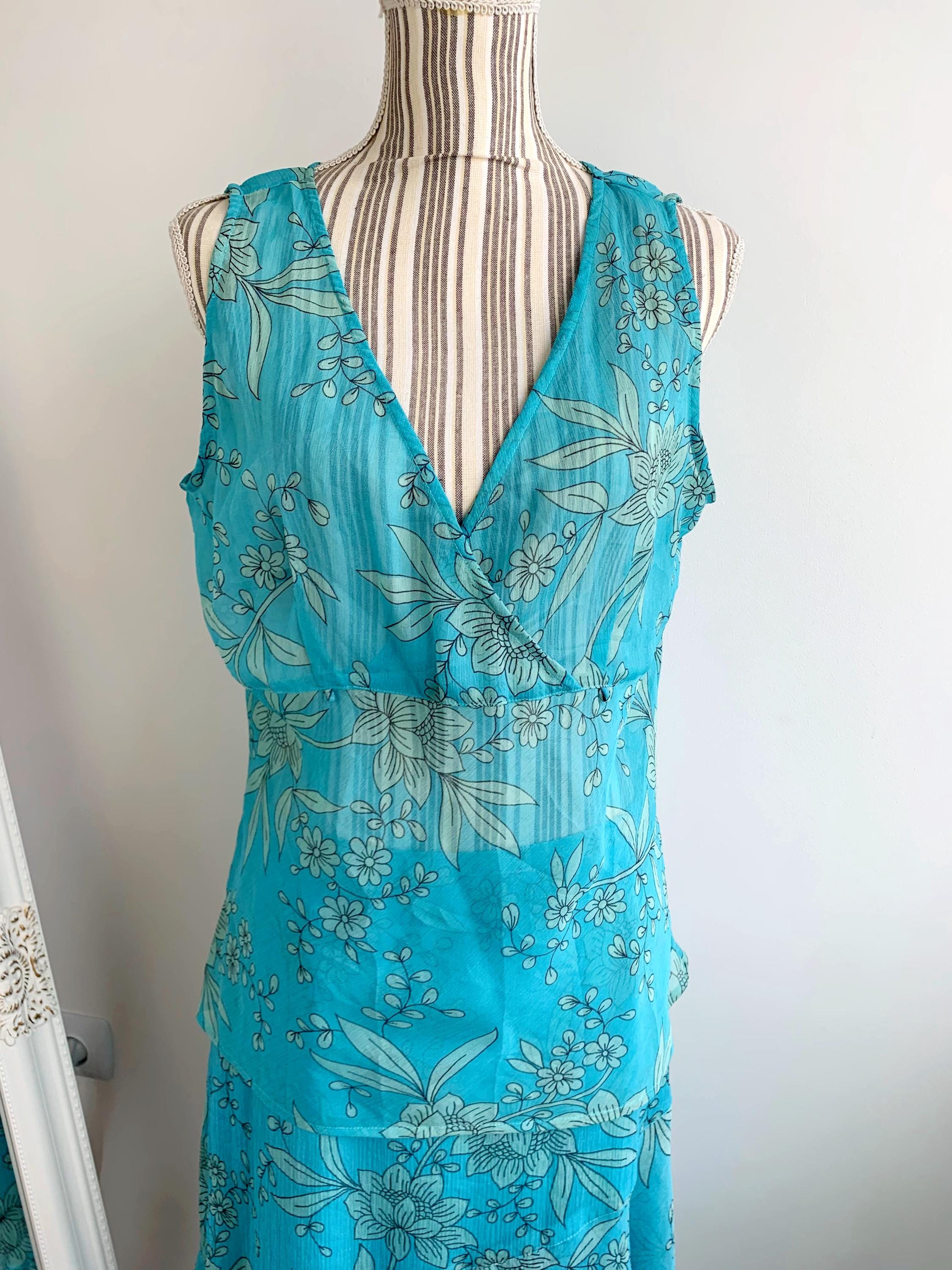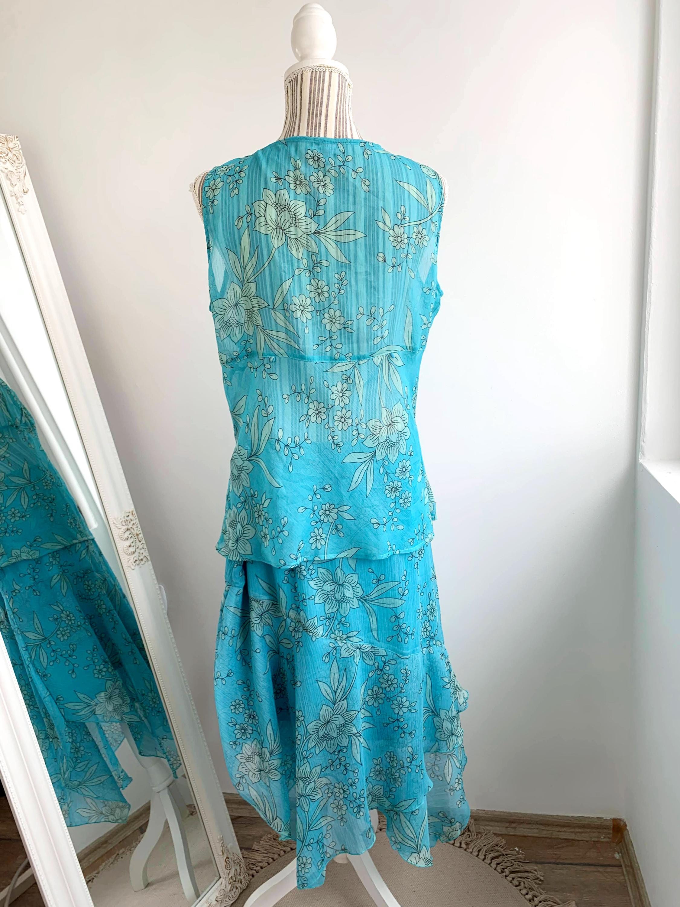 Size: 44 marked on the tank top and skirt, 46 marked on the bolero. Fits like L