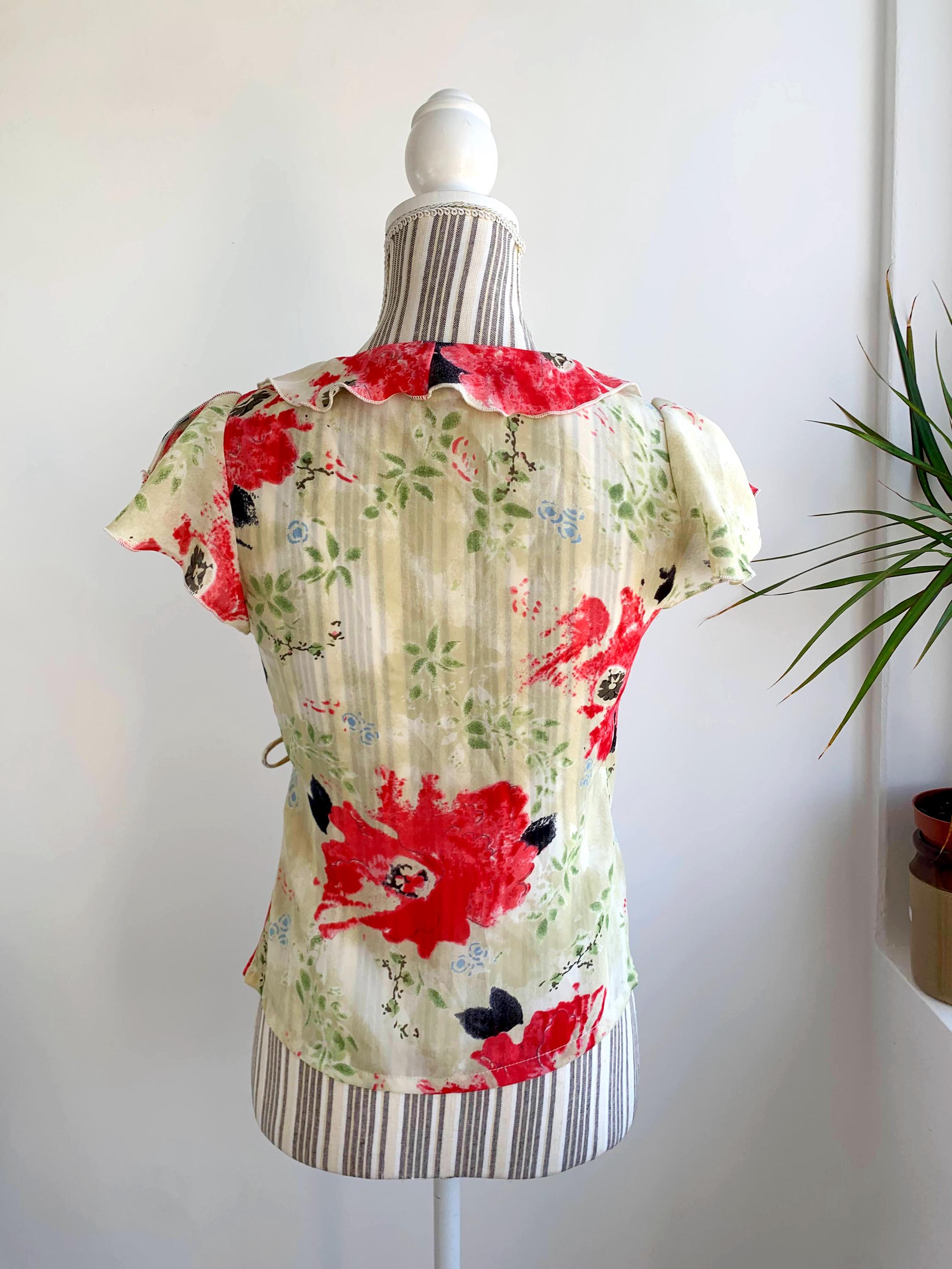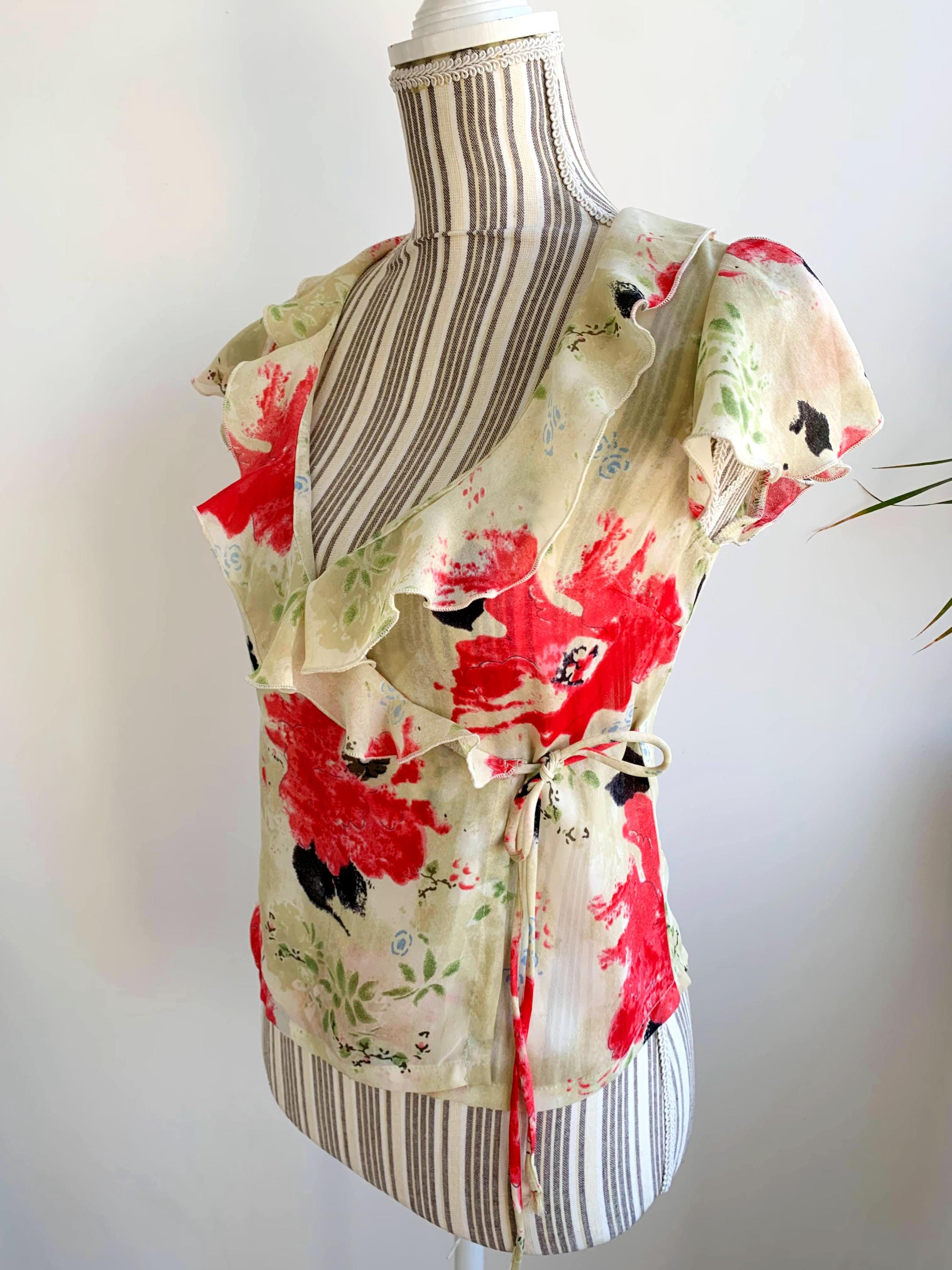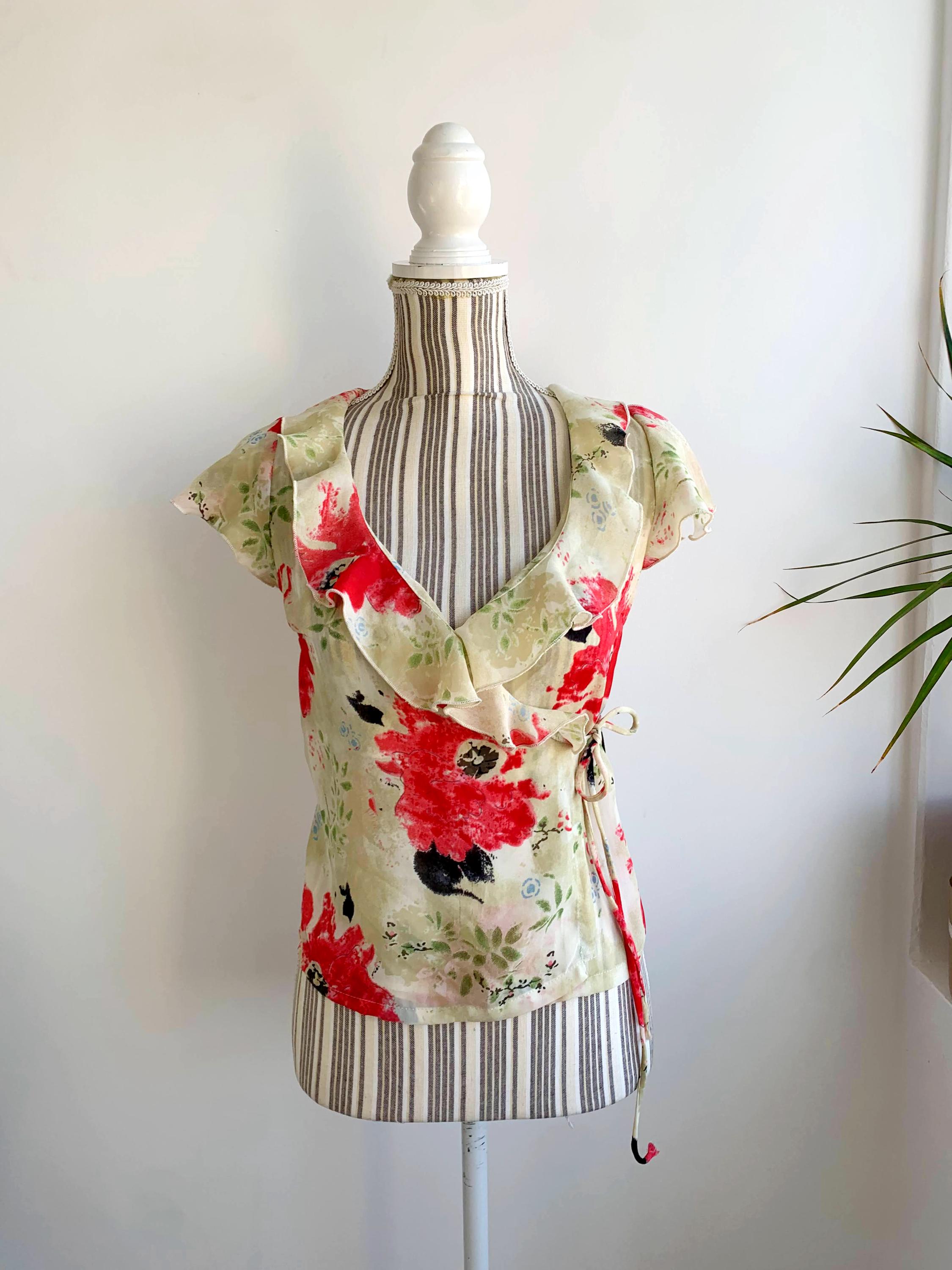 This is a vintage 90s cross over summer top for women with floral botanical print by the brand La Belle. This floral wrap top is made of light polyester fabric. It is perfect for the summer season. This cap sleeve cropped top is size 1, which fits like size XS. Please check the measurements below. Beautiful wrap blouse for women that you can wear at the office in the summer days.