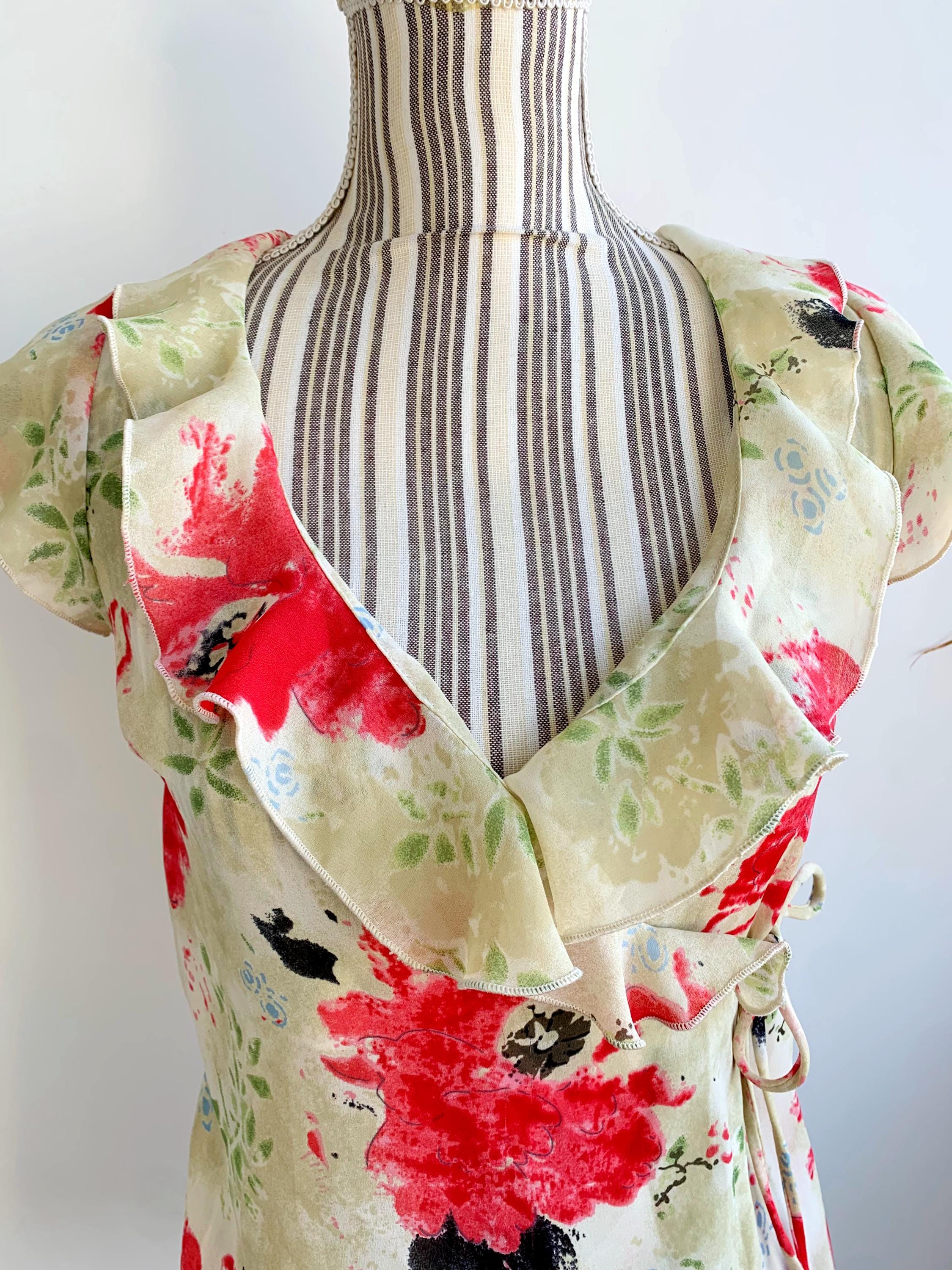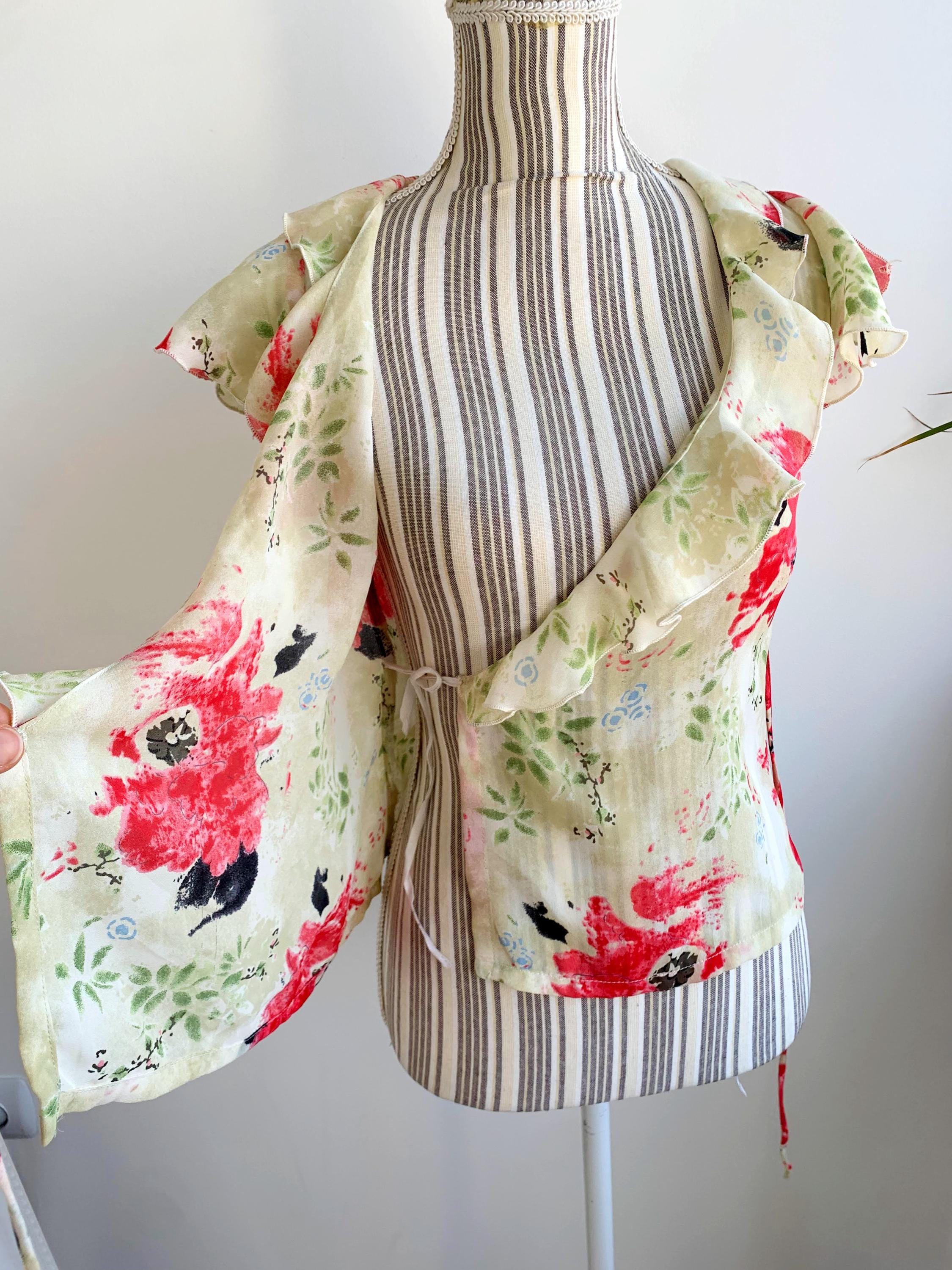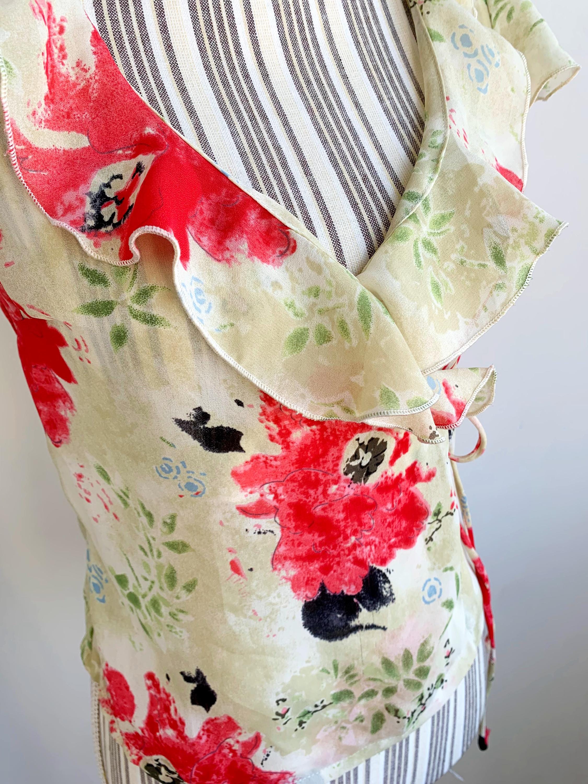 This is a vintage 90s cross over summer top for women with floral botanical print by the brand La Belle. This floral wrap top is made of light polyester fabric. It is perfect for the summer season. This cap sleeve cropped top is size 1, which fits like size XS. Please check the measurements below. Beautiful wrap blouse for women that you can wear at the office in the summer days.