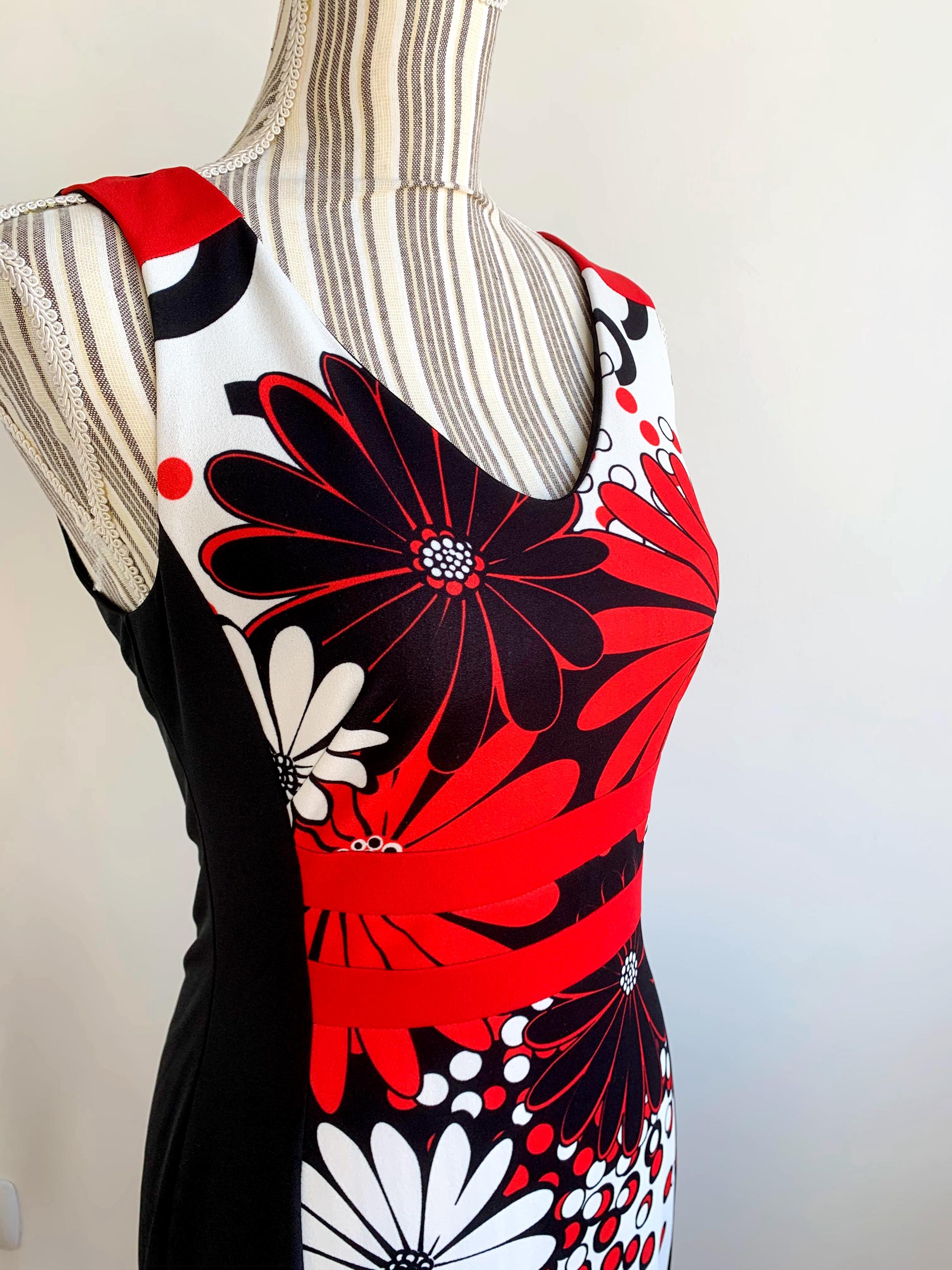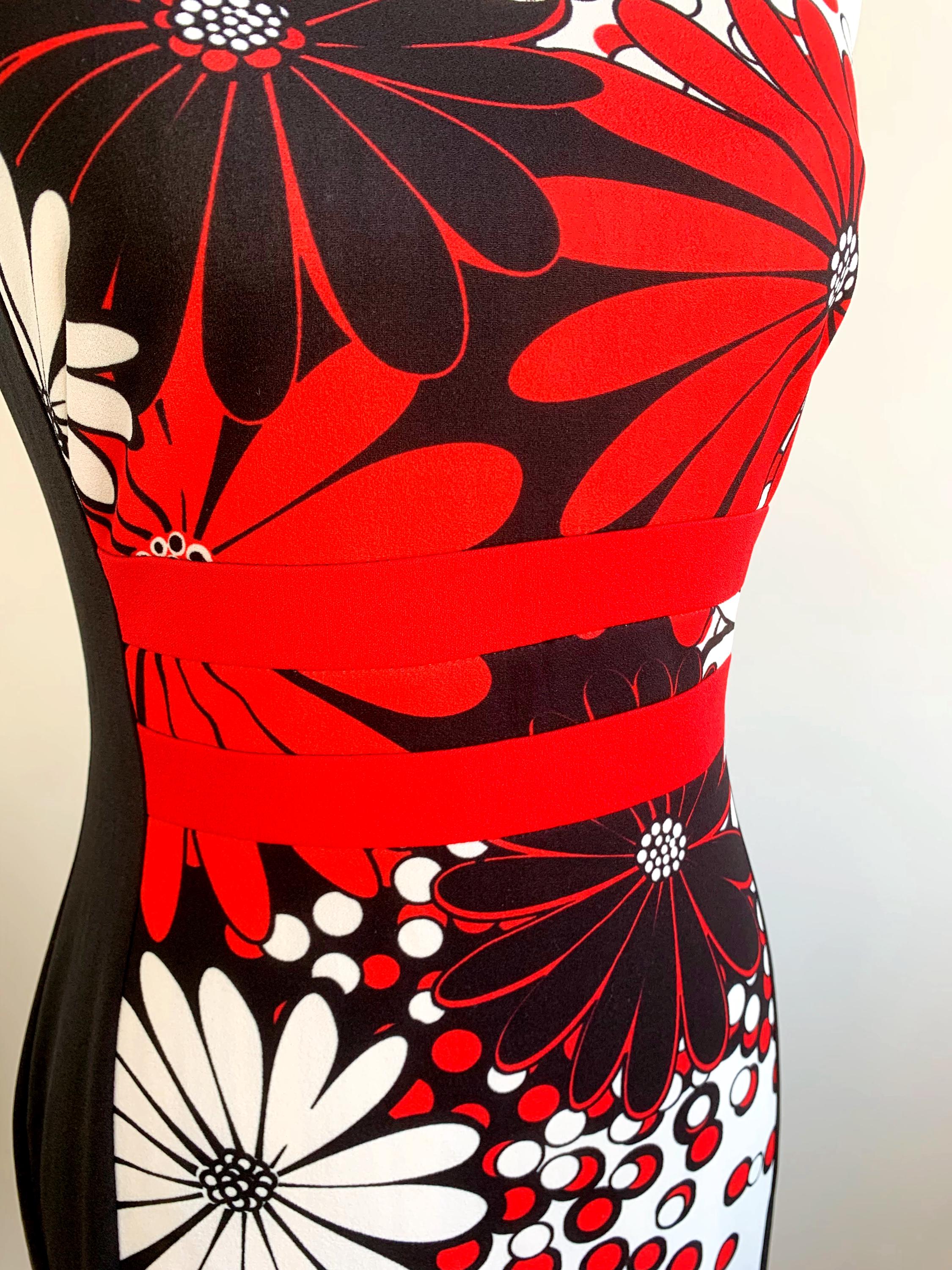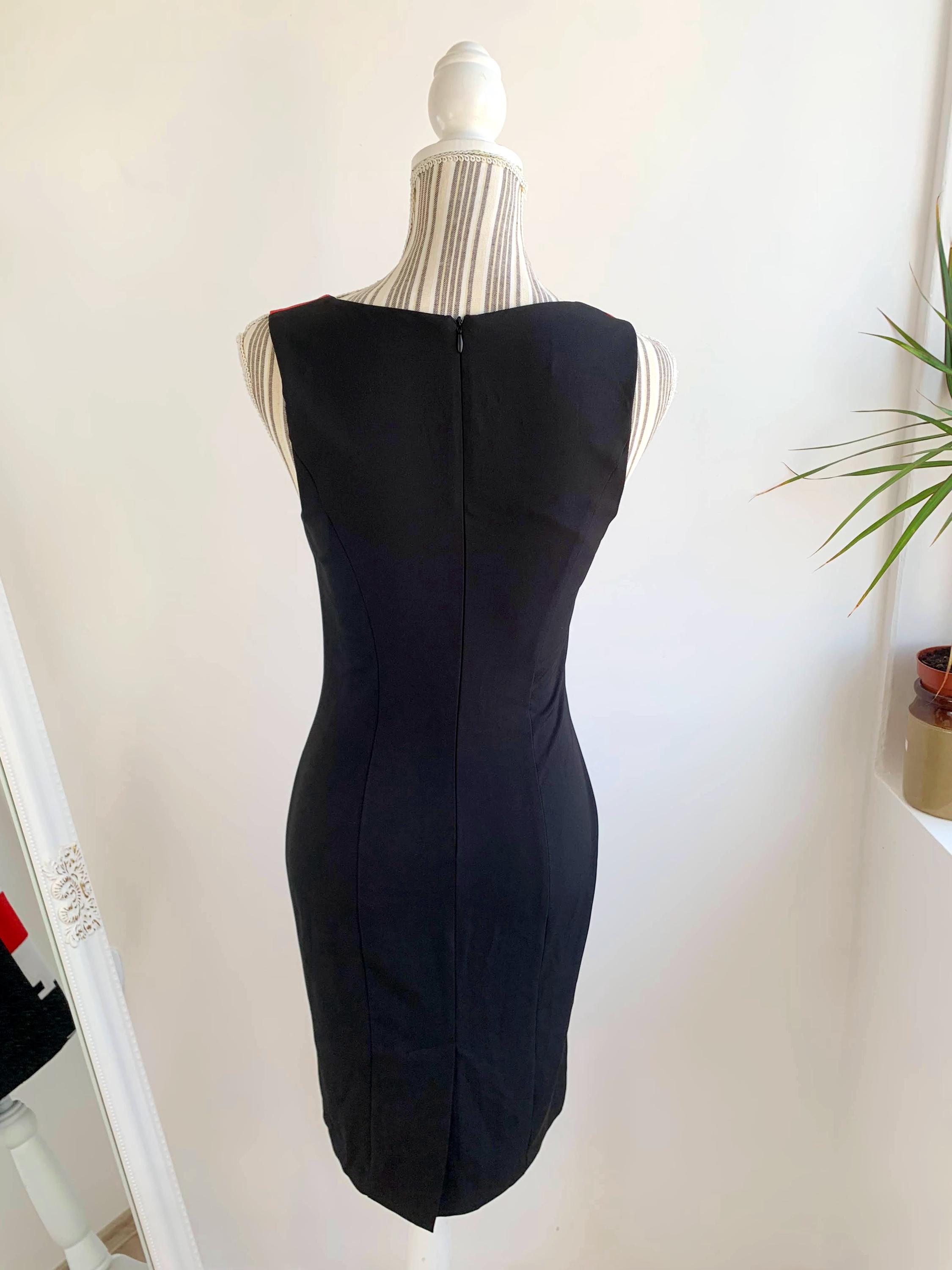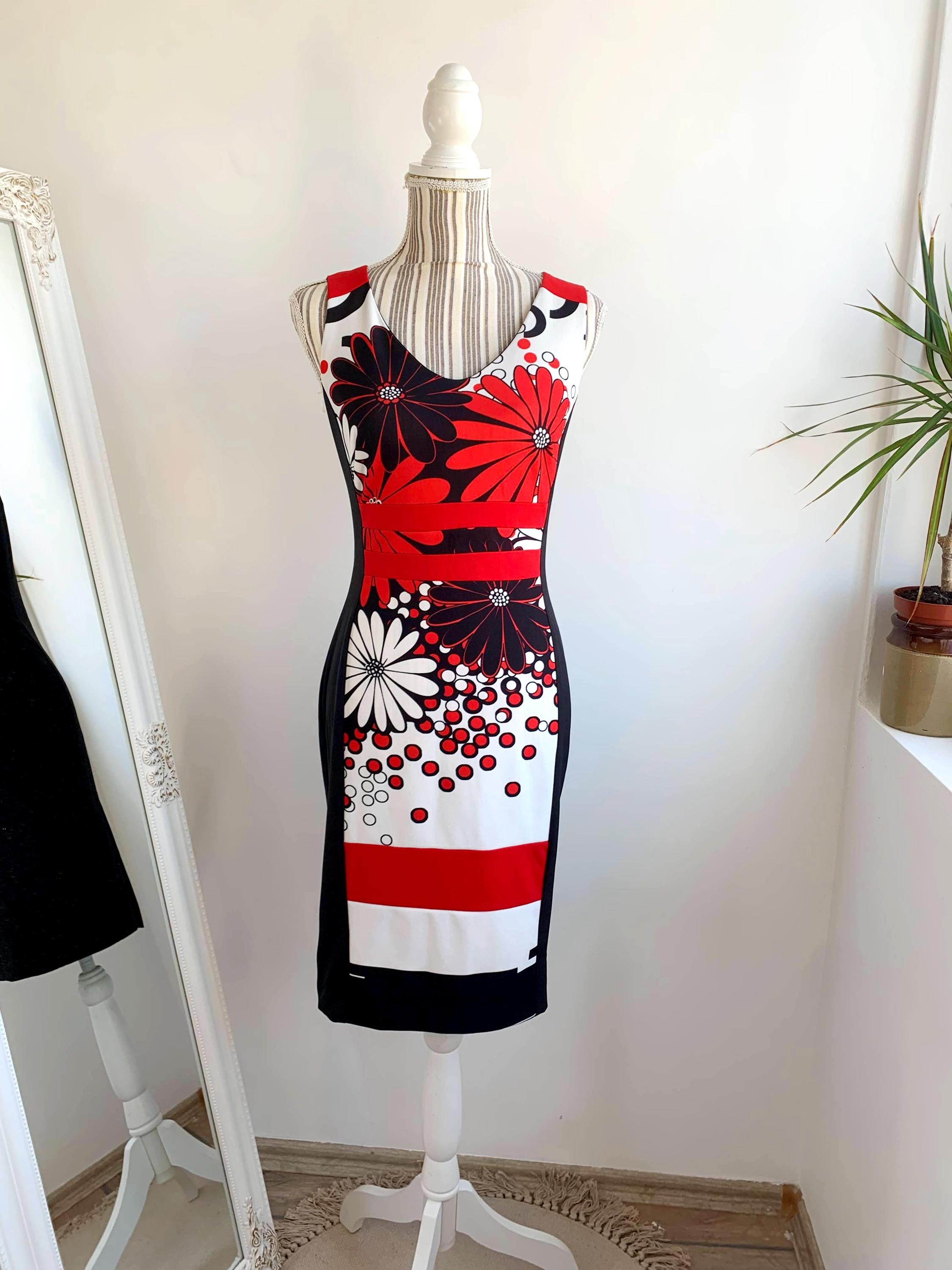 This is a beautiful vintage Y2K stretchy slim fit bodycon dress by the Italina brand Chopin Roma. This floral sheath dress has a fitted silhouette with back slit and back zip closure. This spring dress has gorgeous floral print in black white and red. The size marked is 42 Italy, which fits like S>