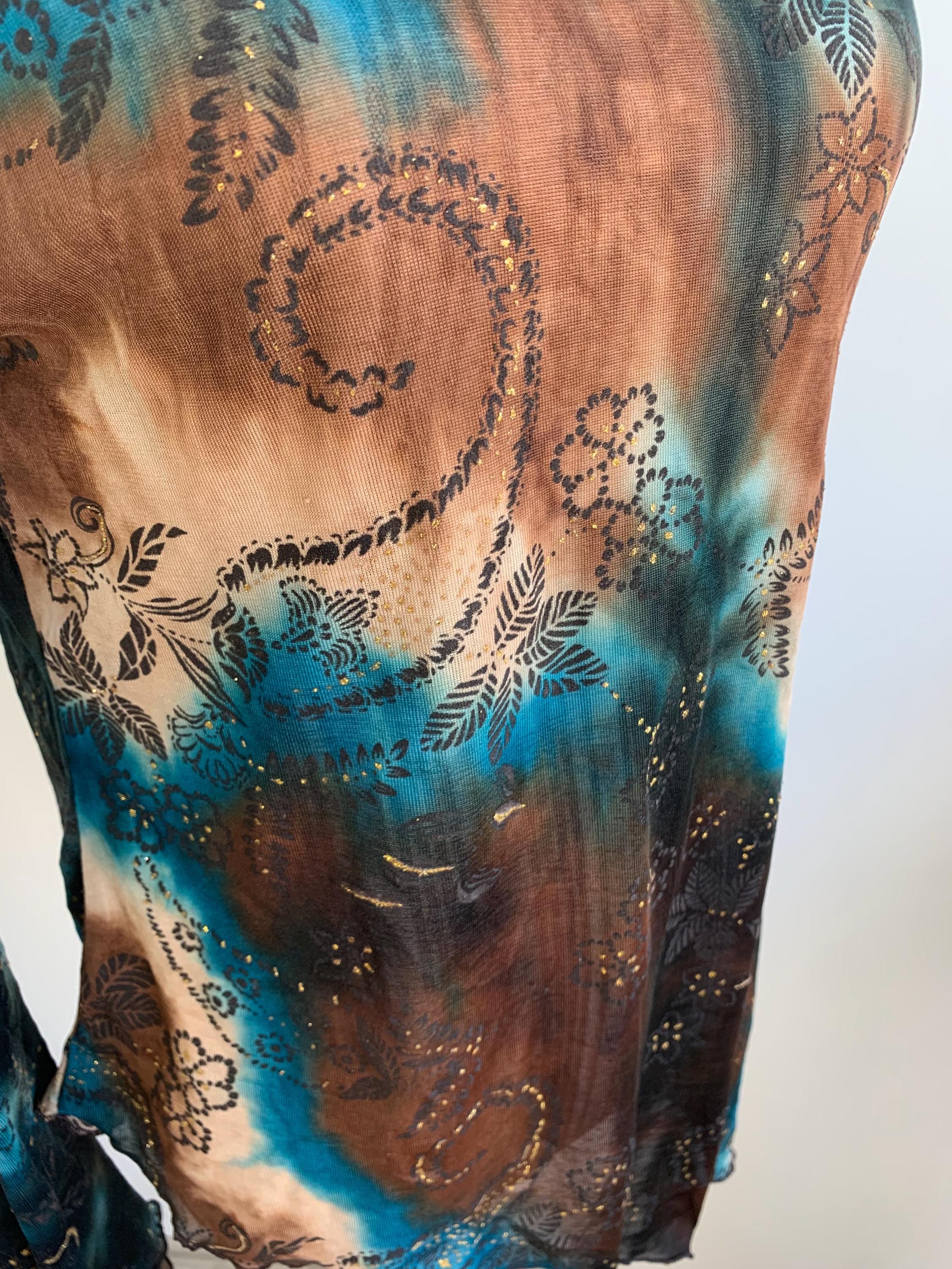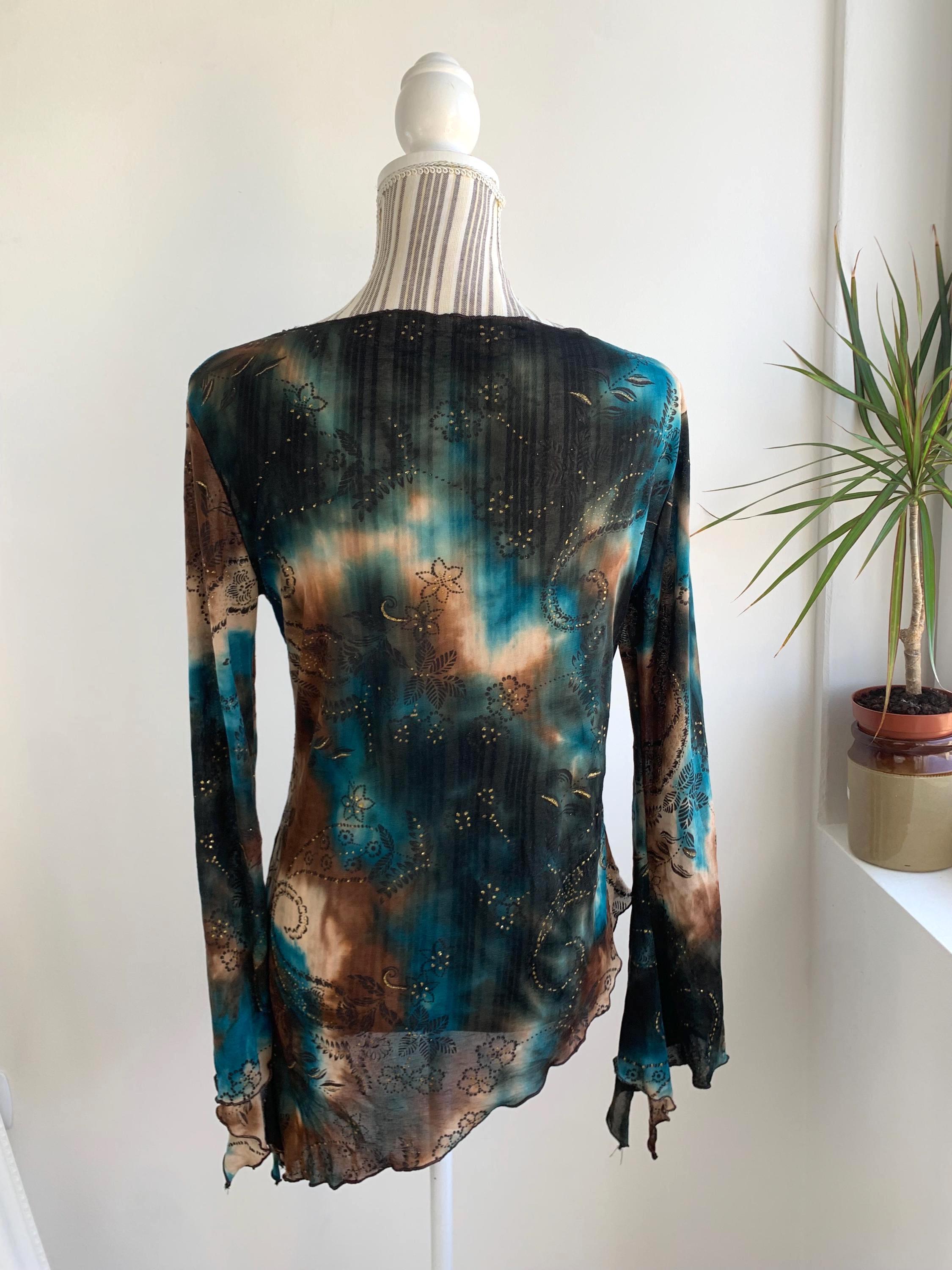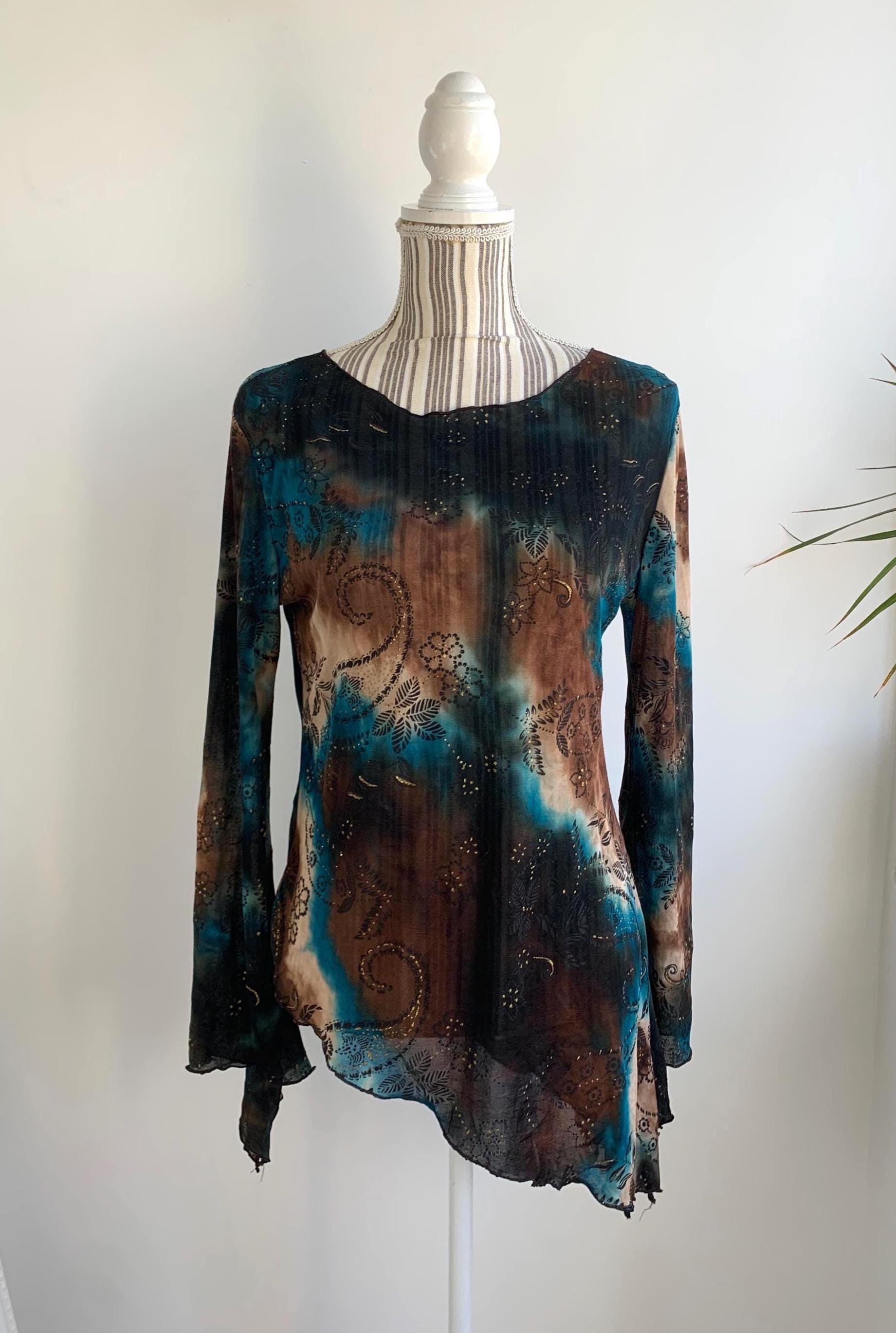 Lovely vintage sheer mesh overlay top with asymmetrical hemline and flare sleeves, made of comfortable stretchy fabric with paisley floral print in brown, turquoise blue and gold. There are no tags or labels. This grunge blouse fits like size L/ XL, the fabric feels like stretchy polyamide nylon.