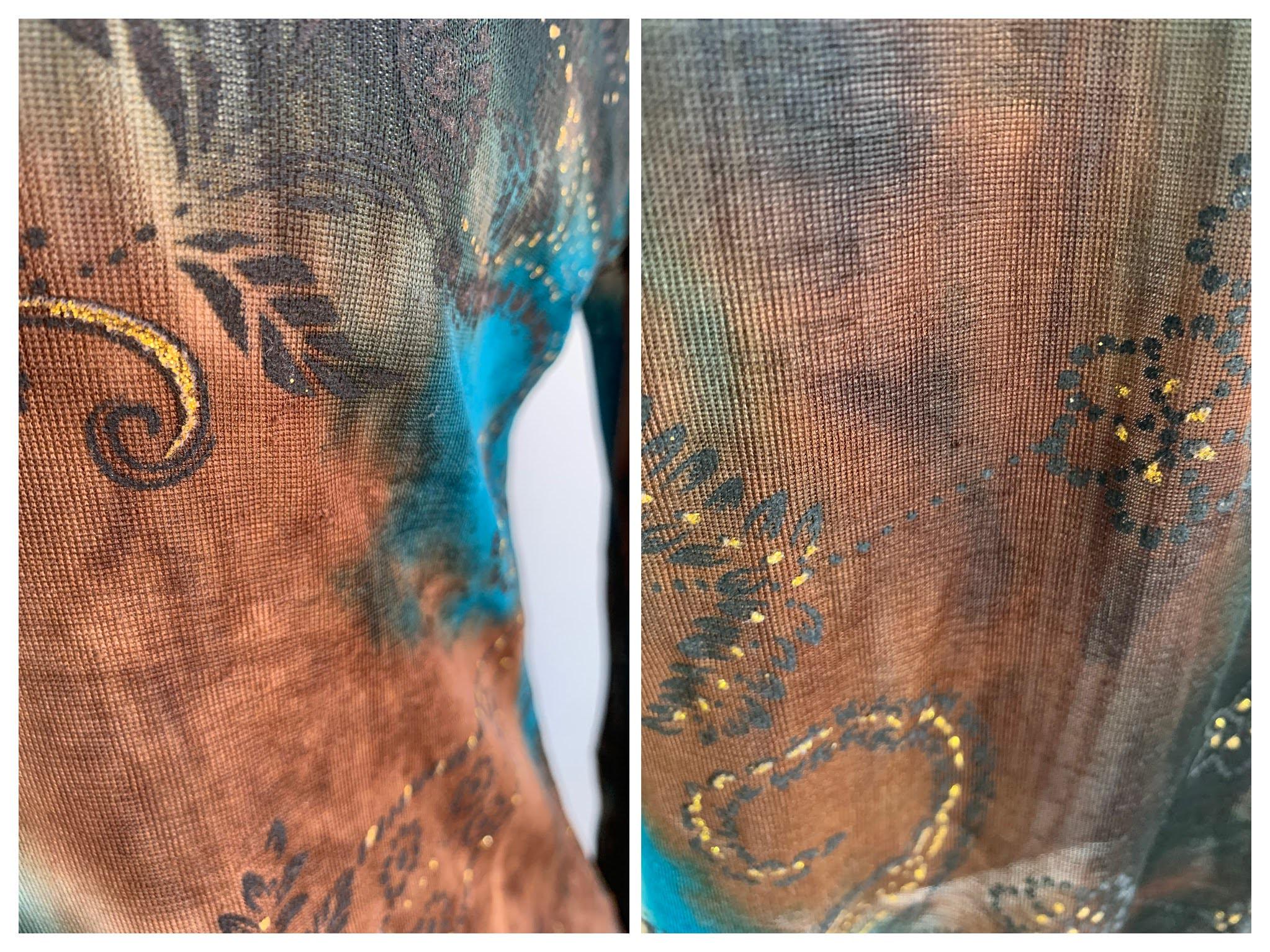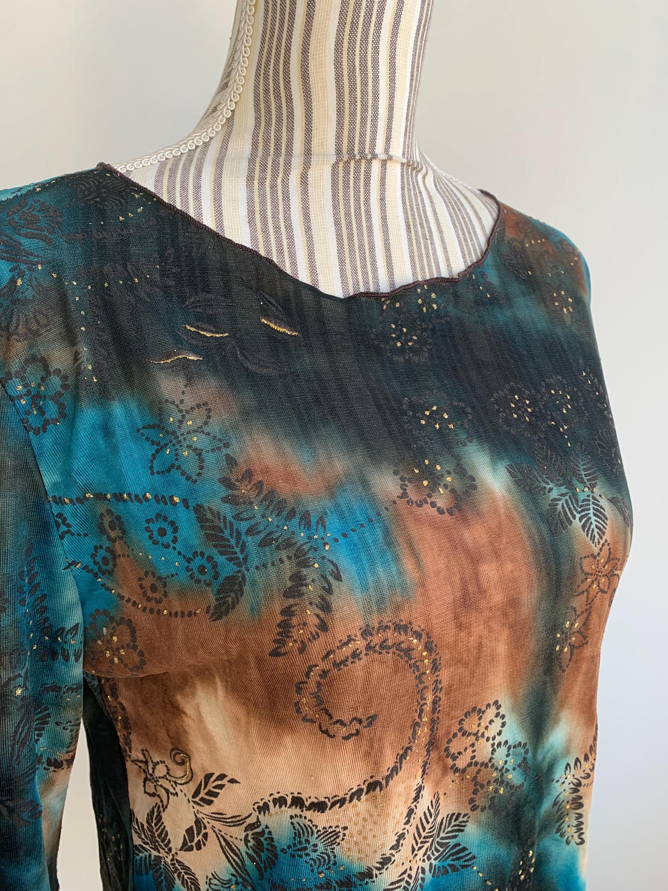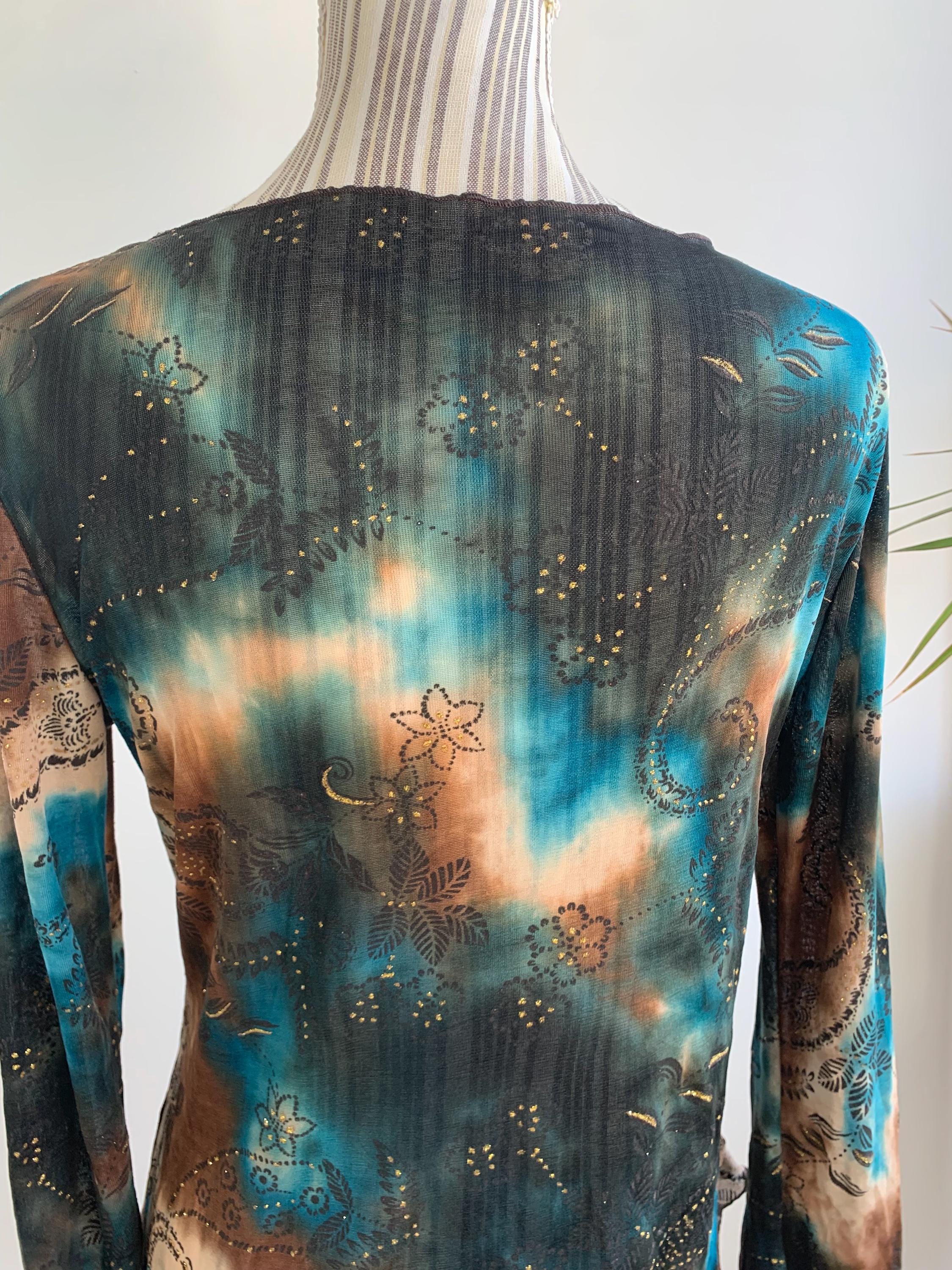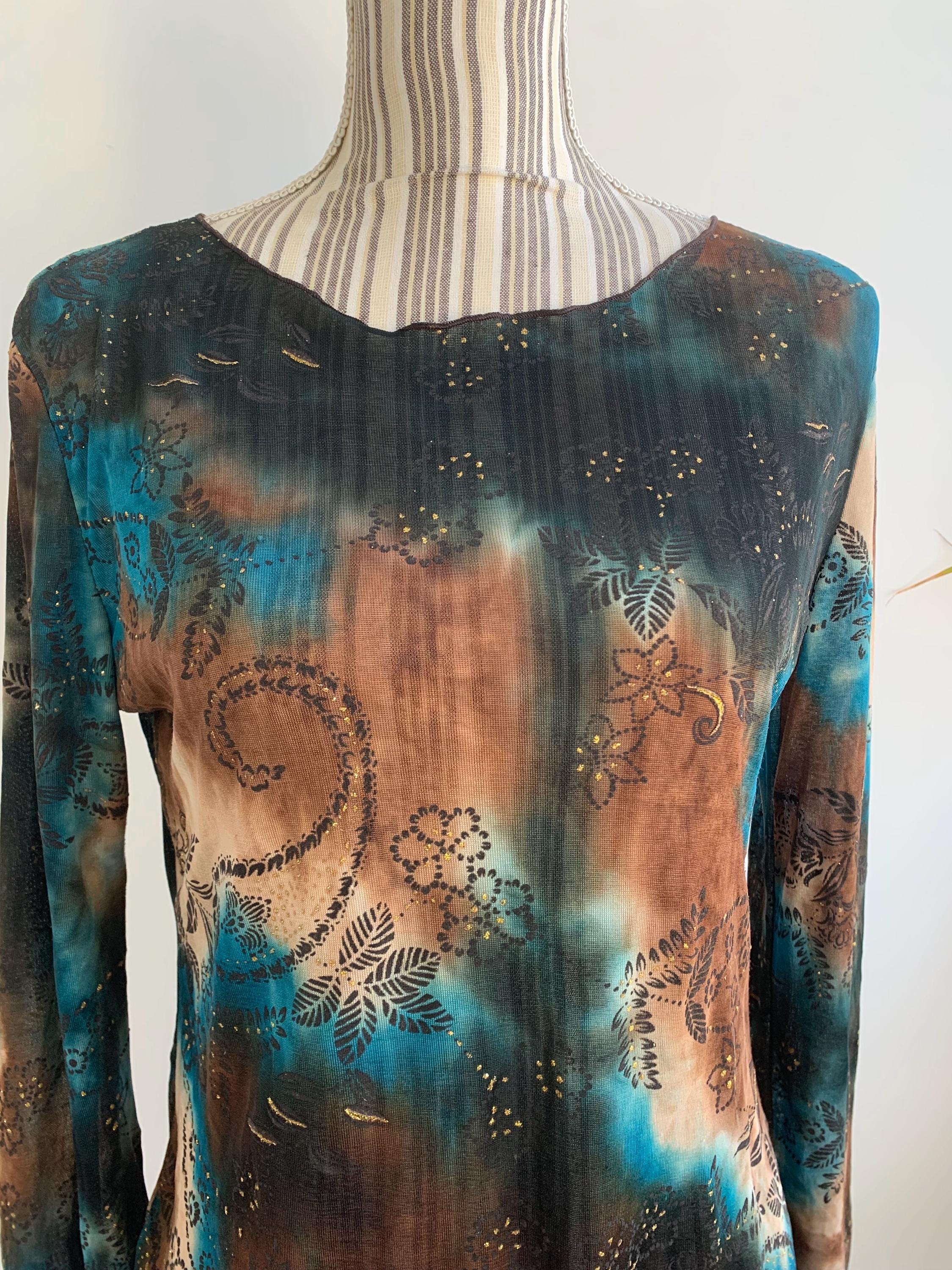 Lovely vintage sheer mesh overlay top with asymmetrical hemline and flare sleeves, made of comfortable stretchy fabric with paisley floral print in brown, turquoise blue and gold. There are no tags or labels. This grunge blouse fits like size L/ XL, the fabric feels like stretchy polyamide nylon.